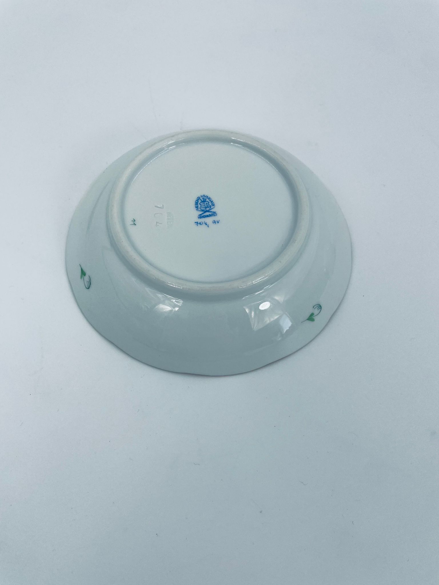 Piękny jak i rzadki przedmiot, filiżanka kolekcjonerska w zestawie trio wytwórni Herend Hungary Haindpainted, wykonana z wysokiej jakości białej porcelany. Zestaw charakteryzuje się ręcznie malowanymi wzorami kwiatowymi w odcieniu zieleni, posiada stylizowane akcenty z 24 karatowego złota, oraz jest wykończony złoceniem na falowanych rantach.