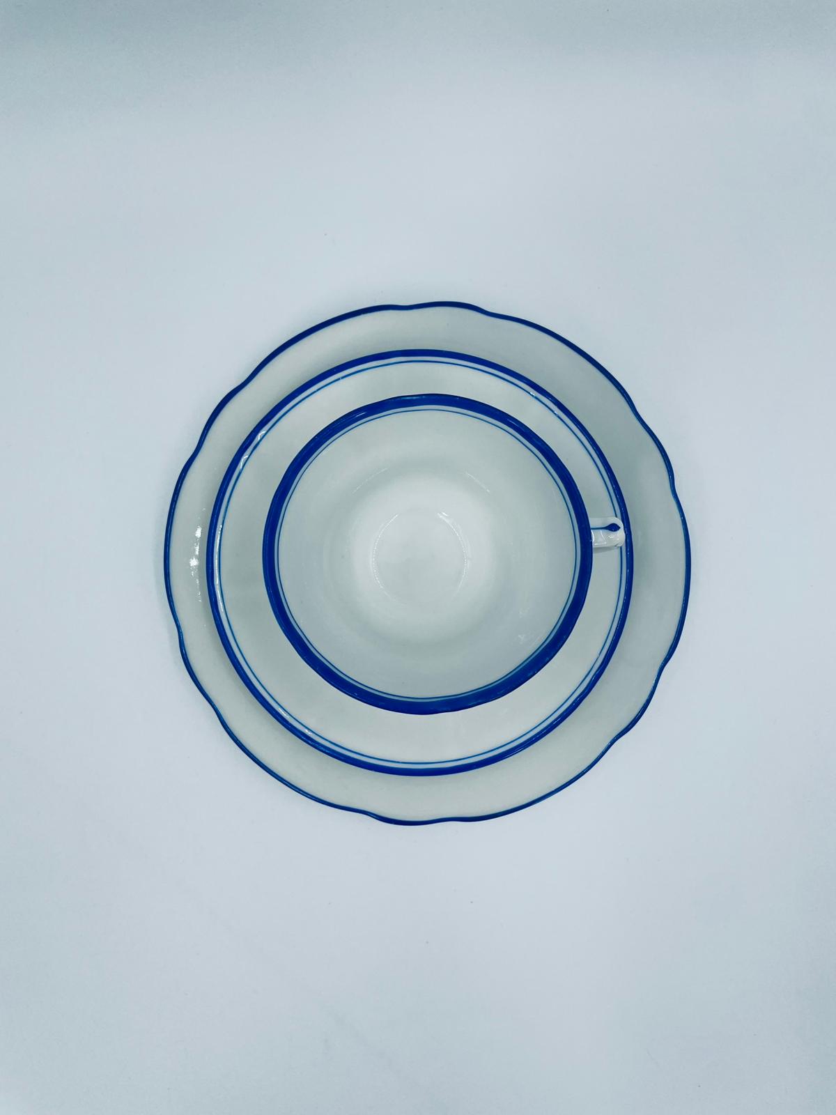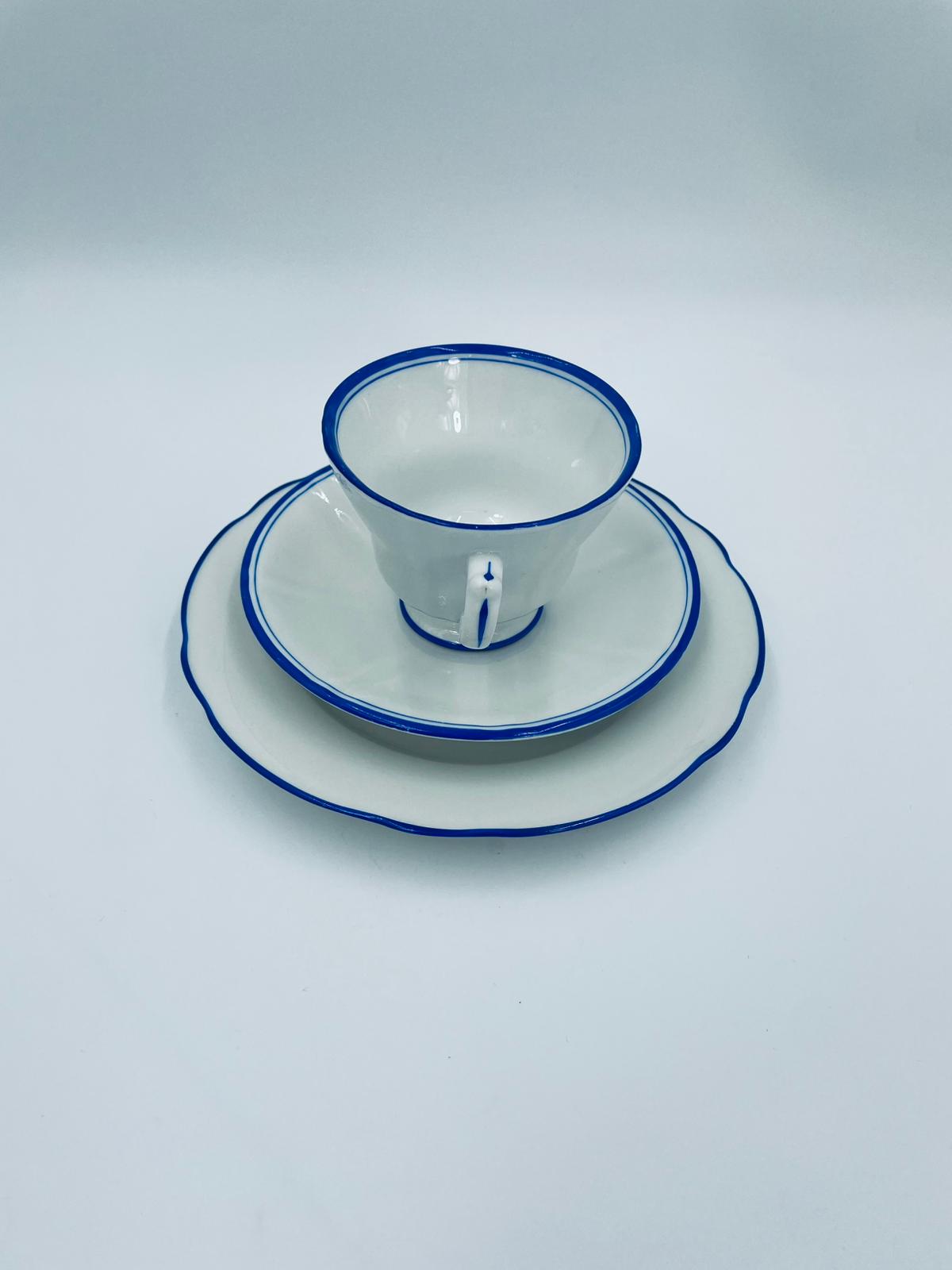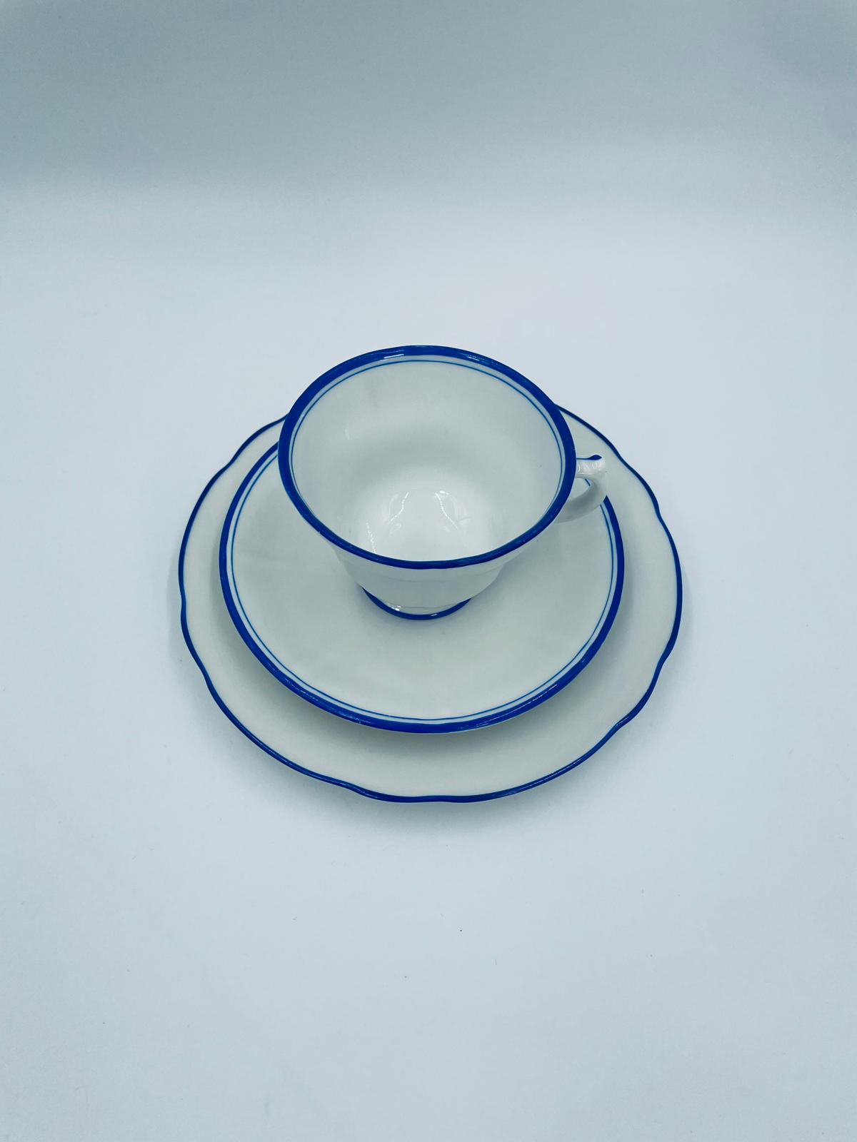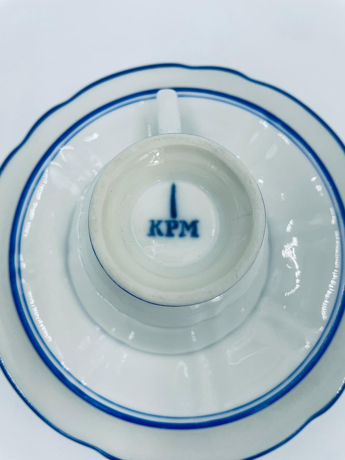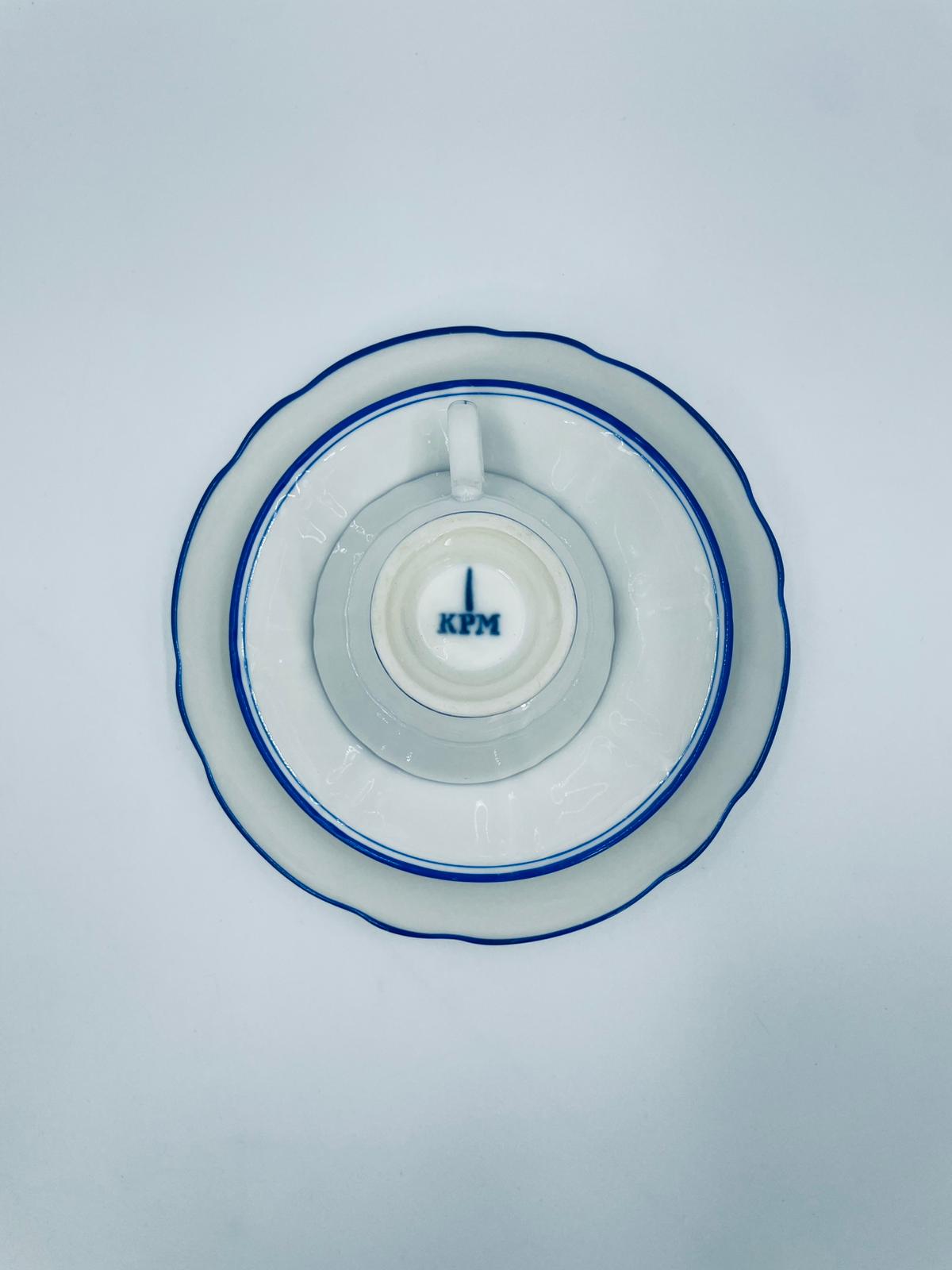 Filiżanka kolekcjonerska w zestawie trio, królewskiej manufaktury KPM Berlin z czasów PRL-u, wykonana z wysokiej jakości białej porcelany. Zestaw elegancki, klasyczny, ozdobiony niebieskim pasem na krawędziach. Zestaw posiada przetarcia oraz małe odpryski.