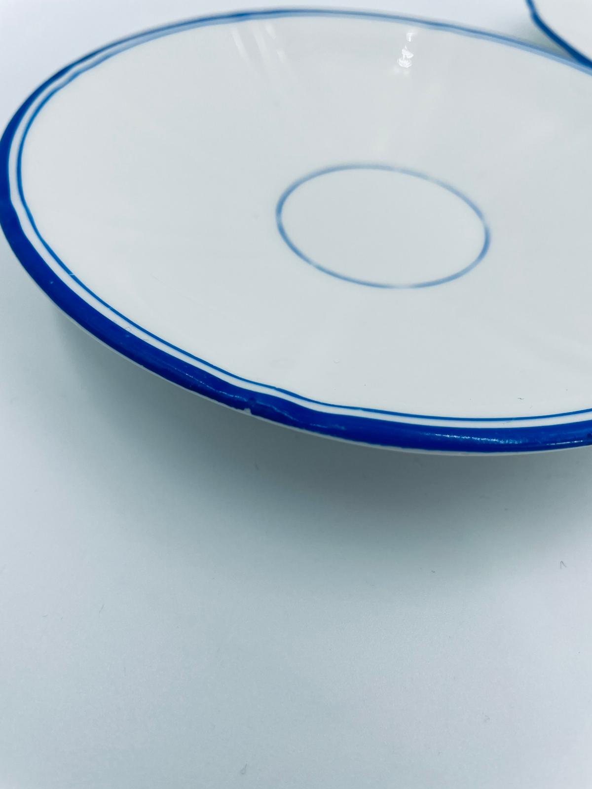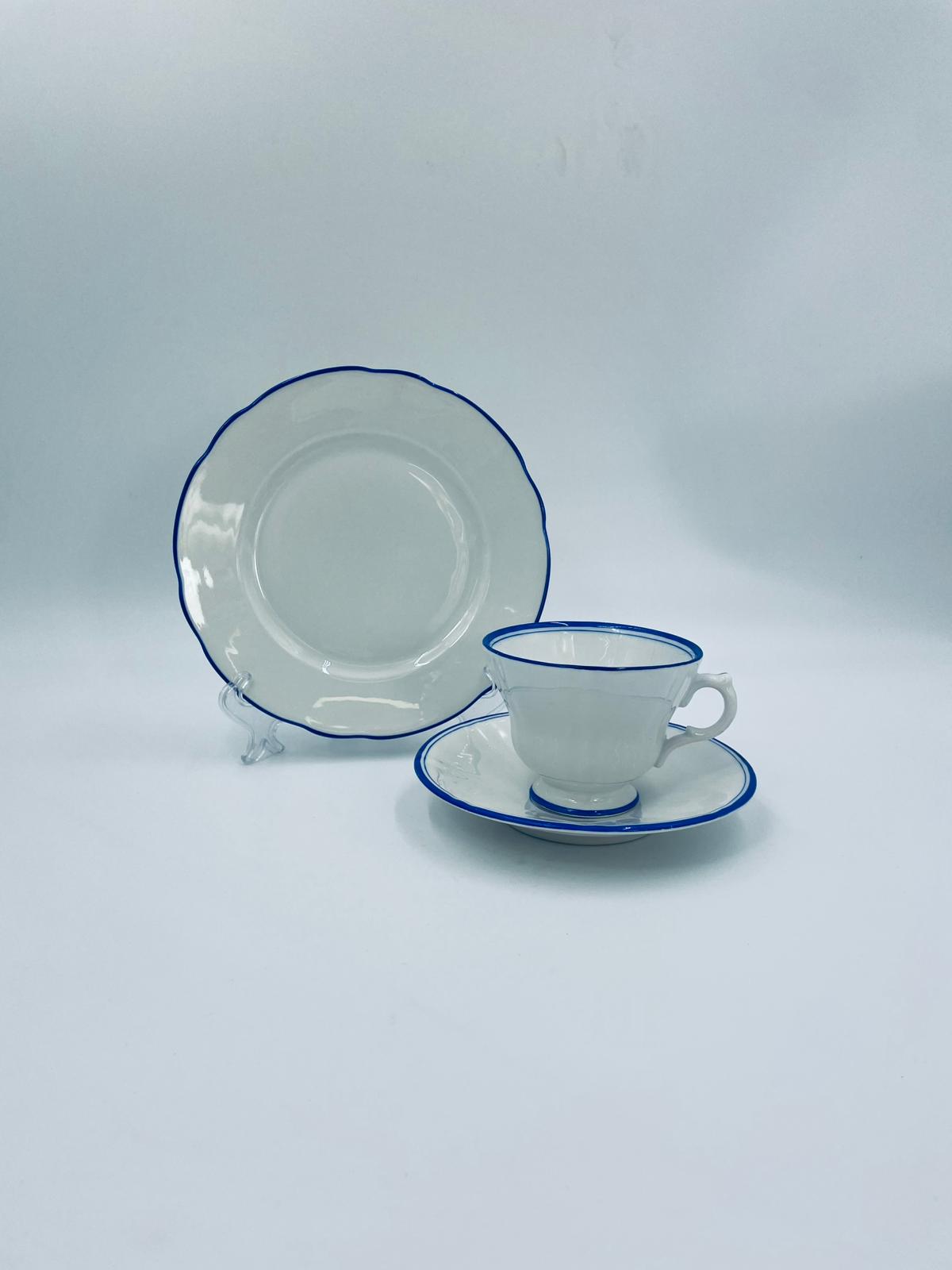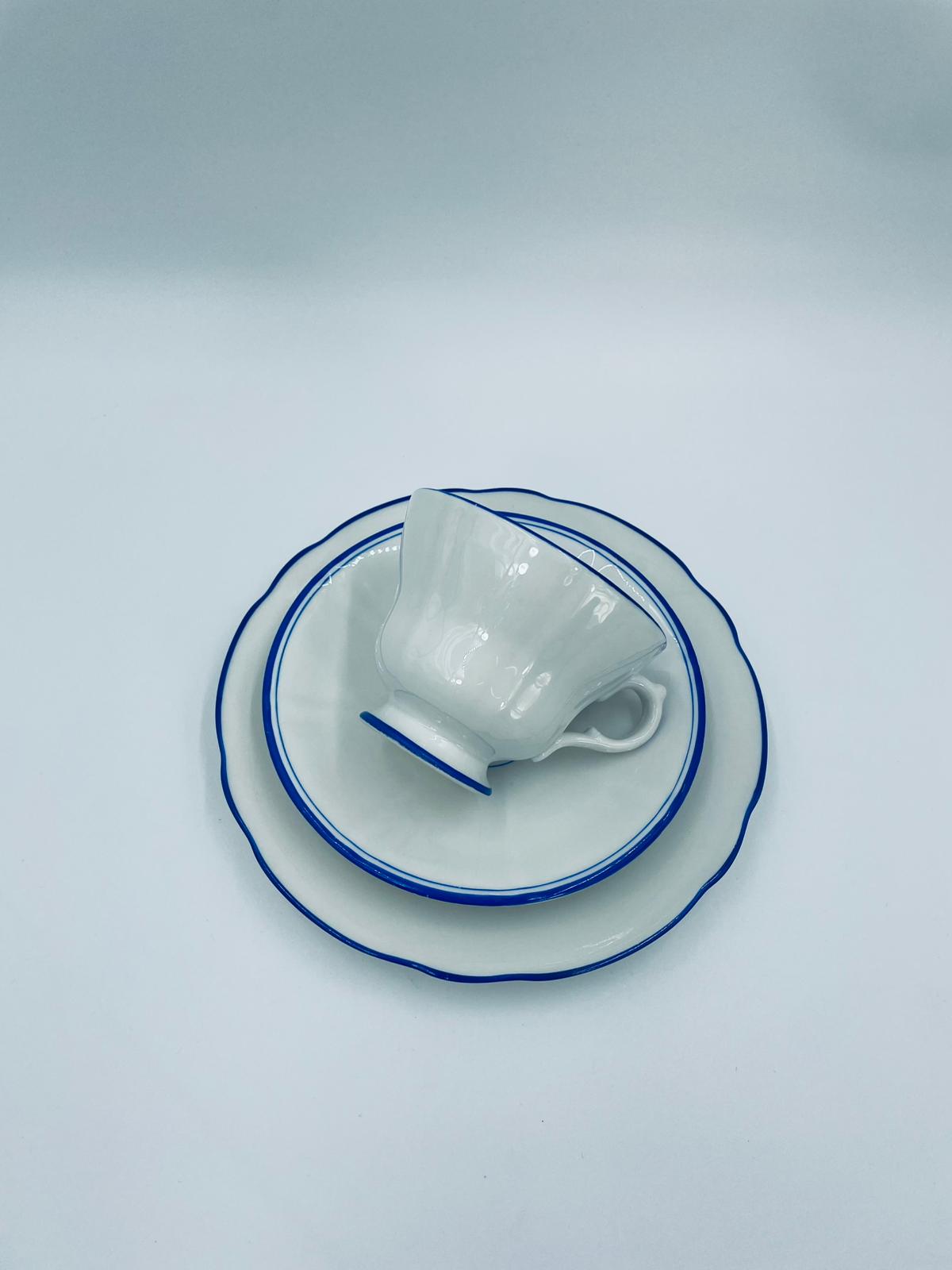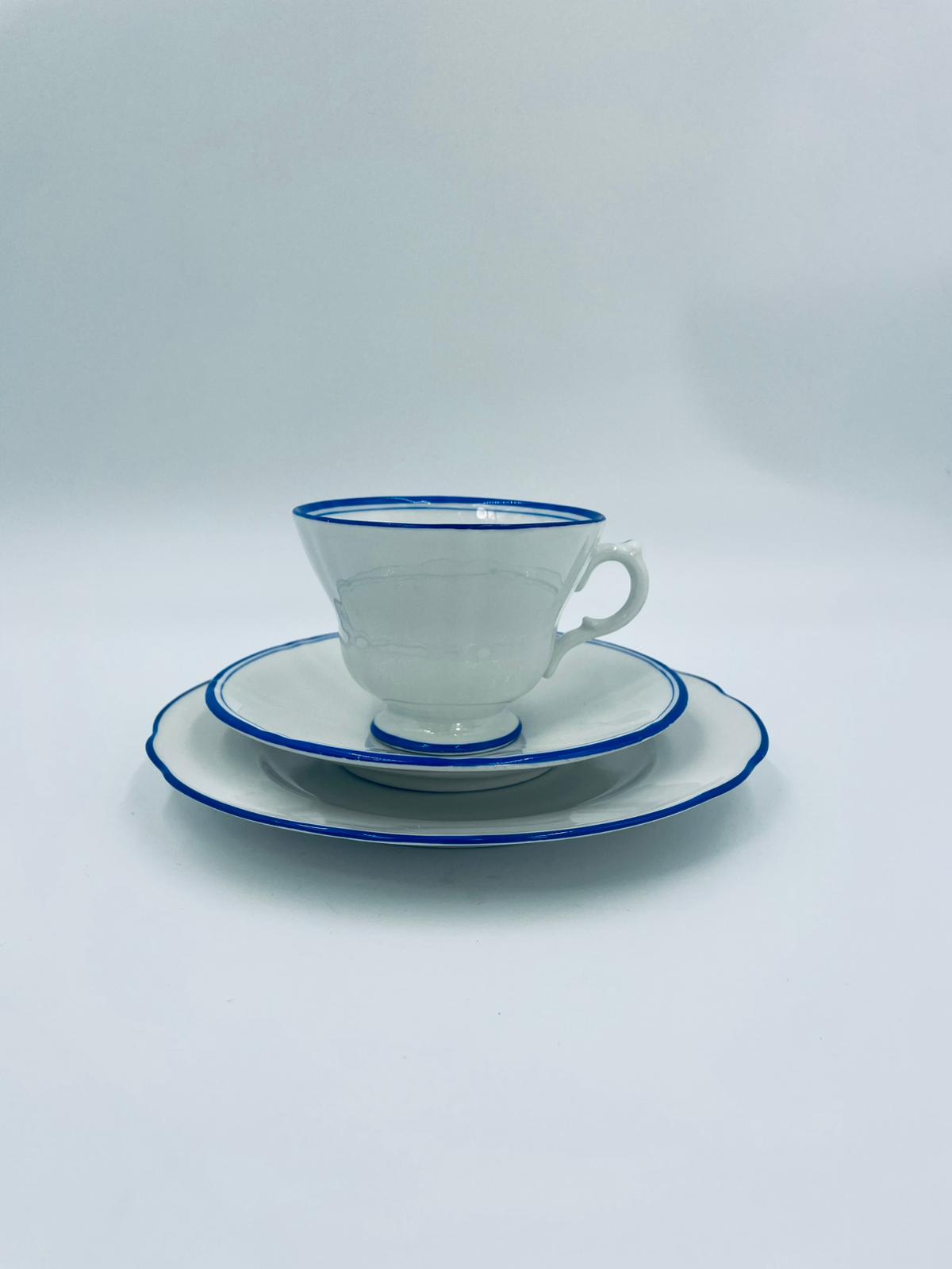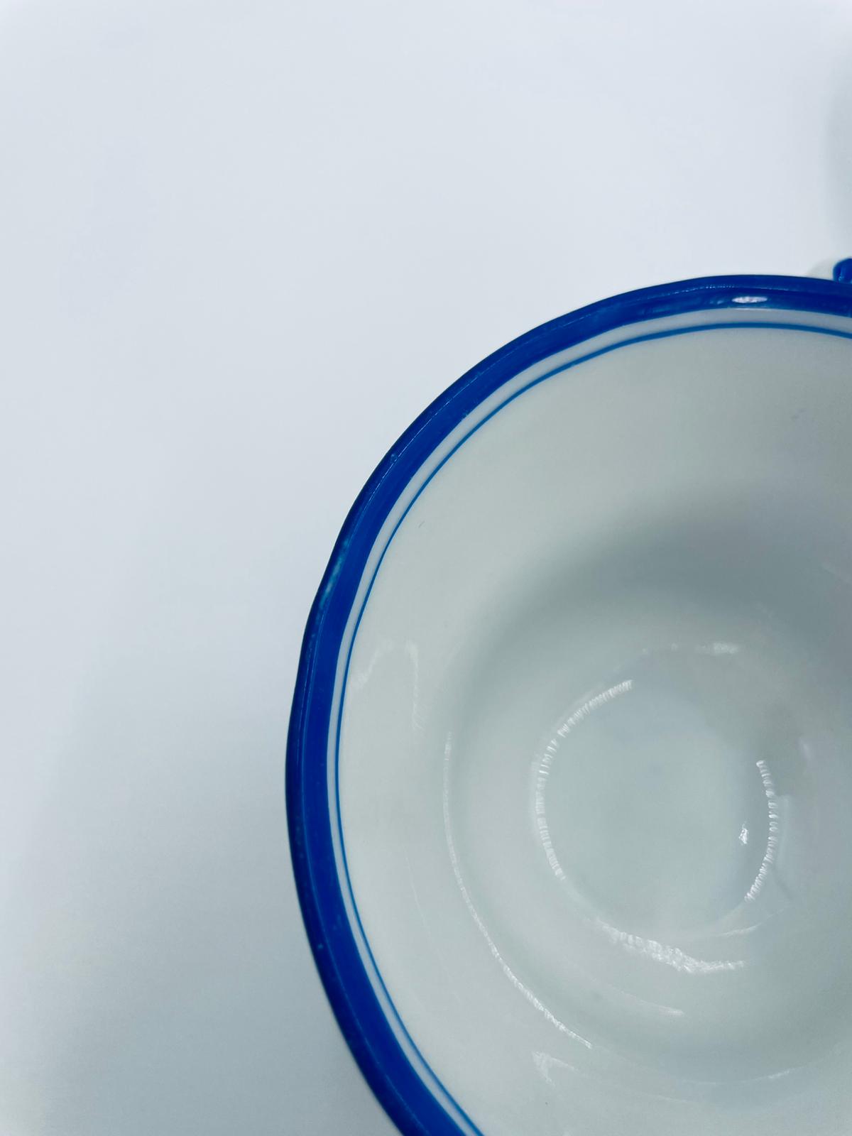 Filiżanka kolekcjonerska w zestawie trio, królewskiej manufaktury KPM Berlin z czasów PRL-u, wykonana z wysokiej jakości białej porcelany. Zestaw elegancki, klasyczny, ozdobiony niebieskim pasem na krawędziach. Zestaw posiada przetarcia oraz małe odpryski.