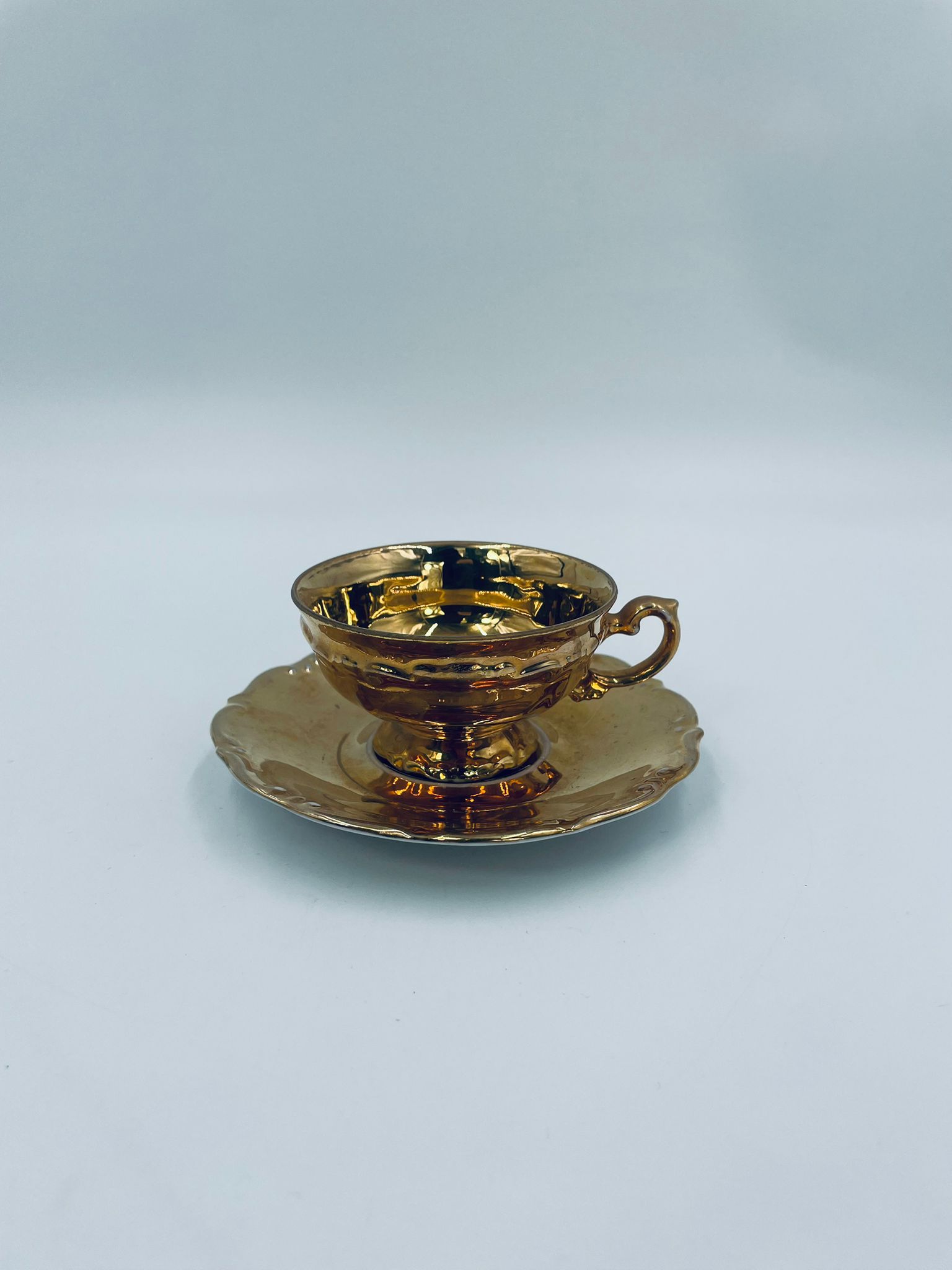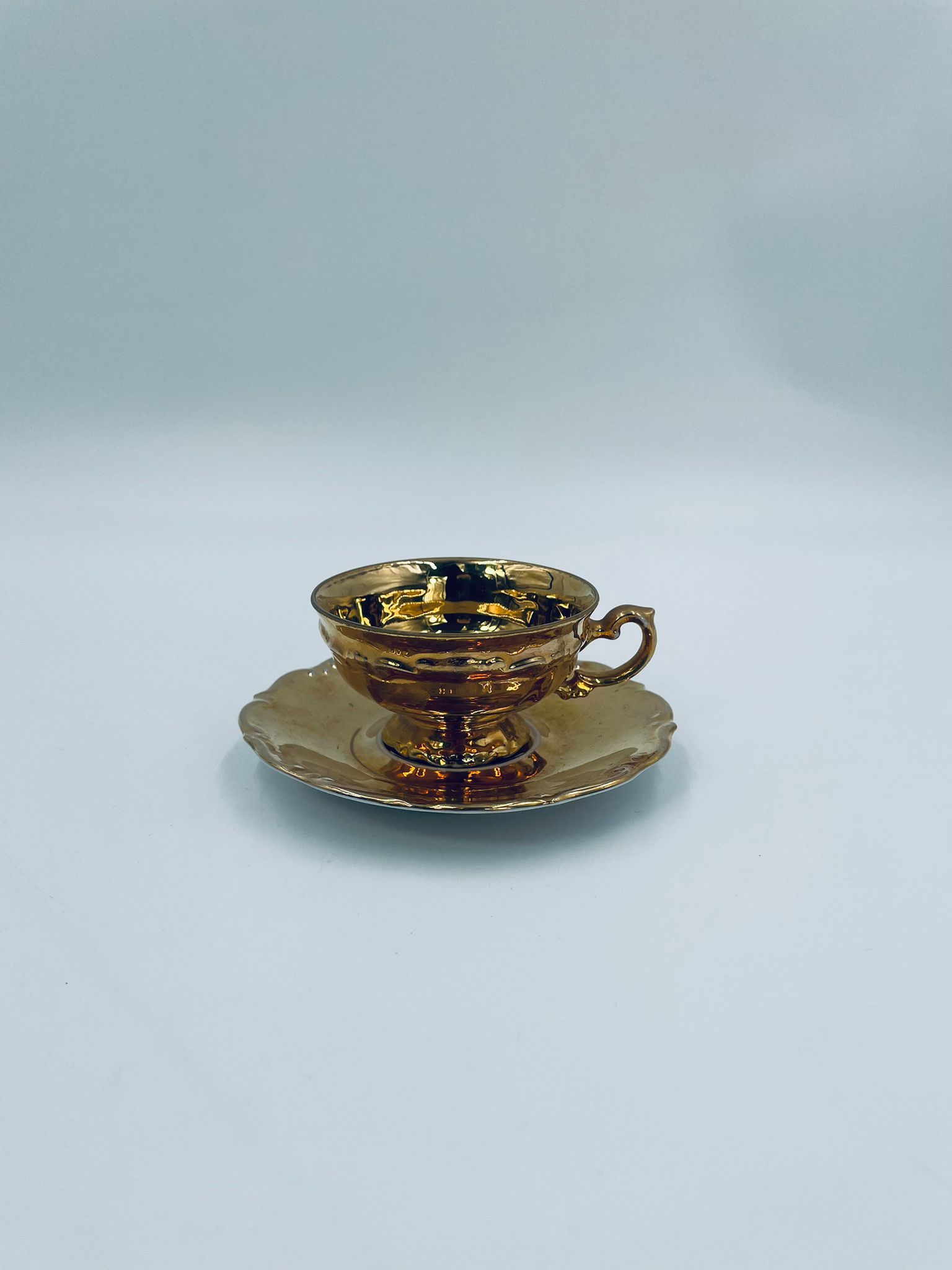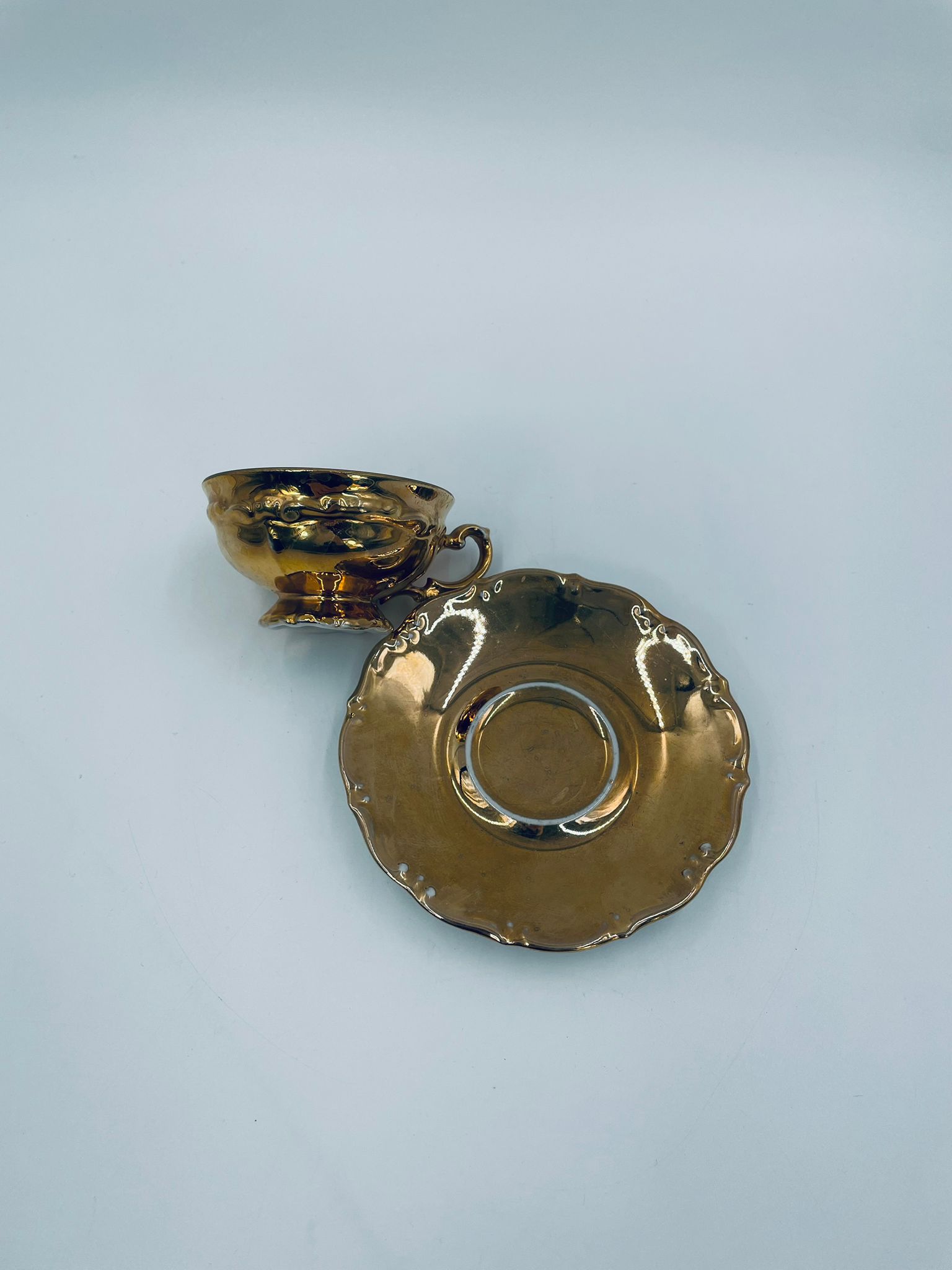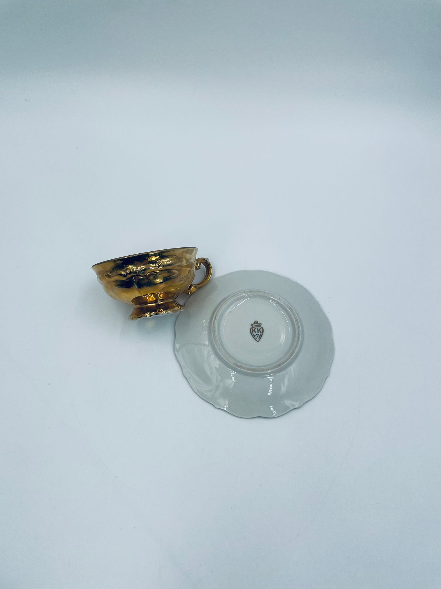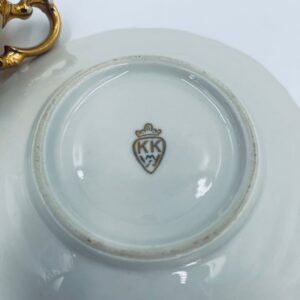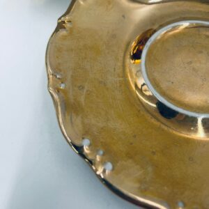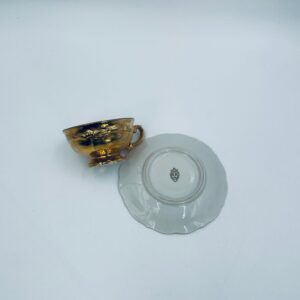 Filiżanka kolekcjonerska w zestawie duo, wytwórni KKW Königliche Porzellanmanufaktur Waldenburg, wykonana z wysokiej jakości porcelany. Zestaw w złotym kolorze, ozdobiony reliefowymi wzorami oraz nieregularnym brzegiem na talerzyku. Filiżanka z ozdobnym uchwytem i podstawa. Zestaw posiada liczne przetarcia na złoceniu.