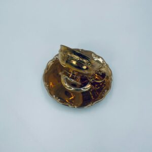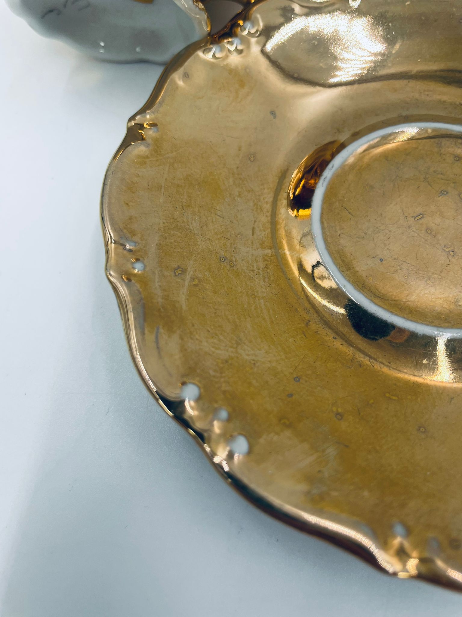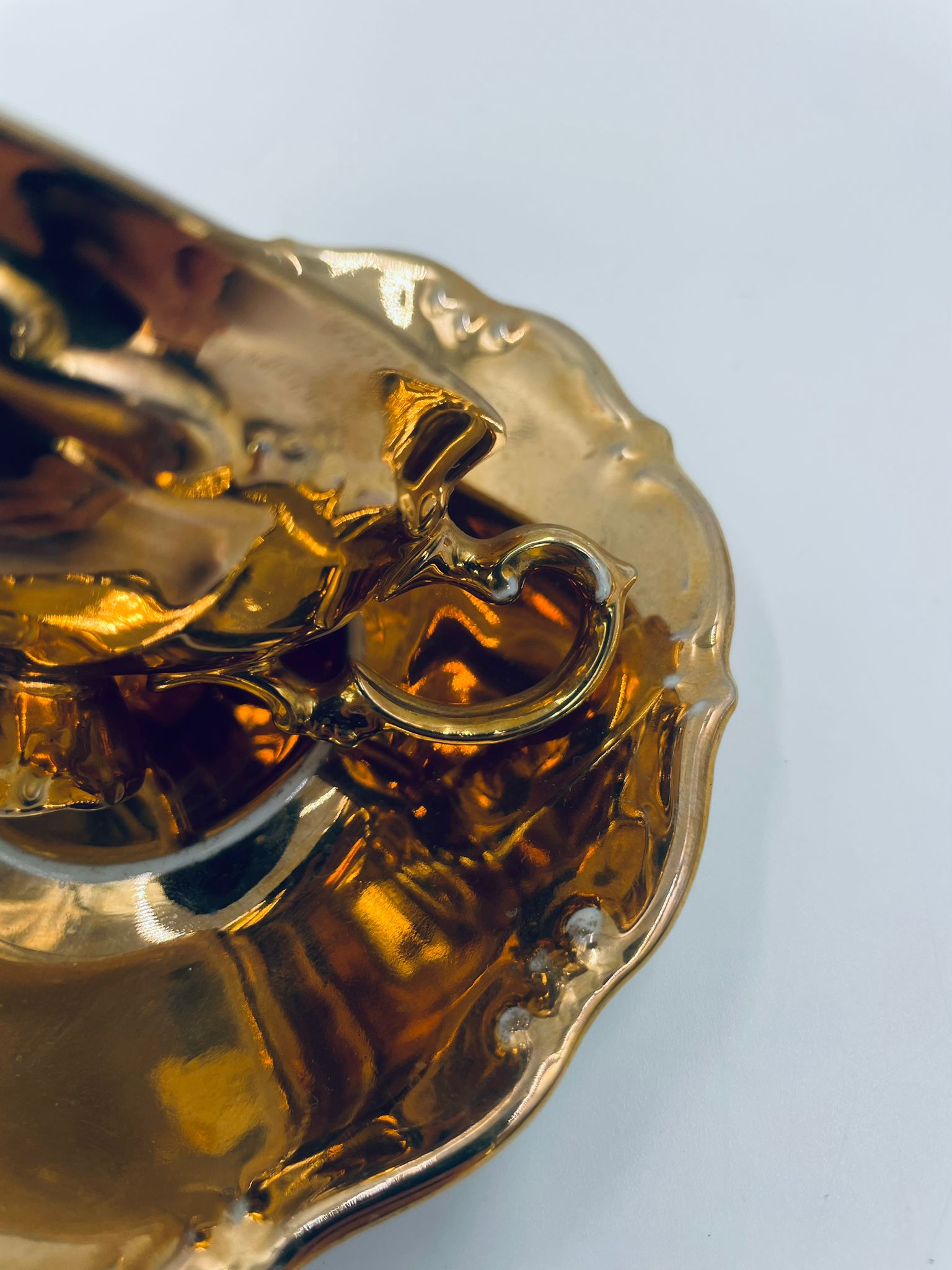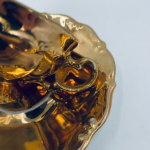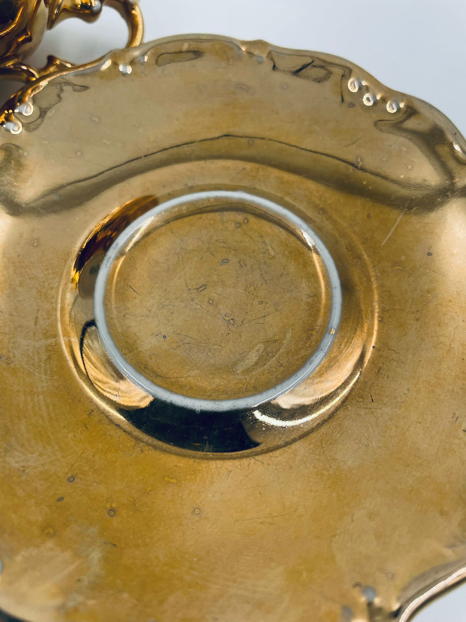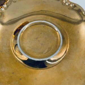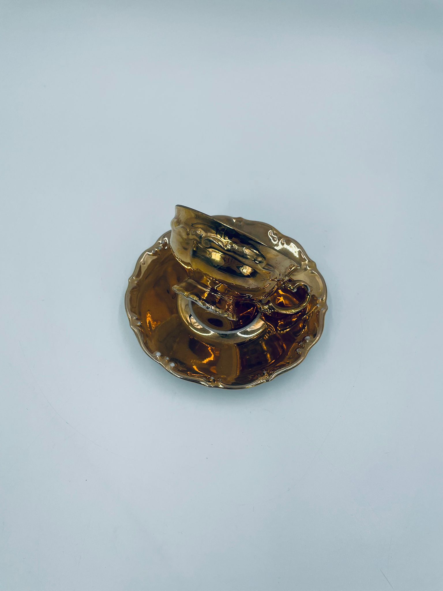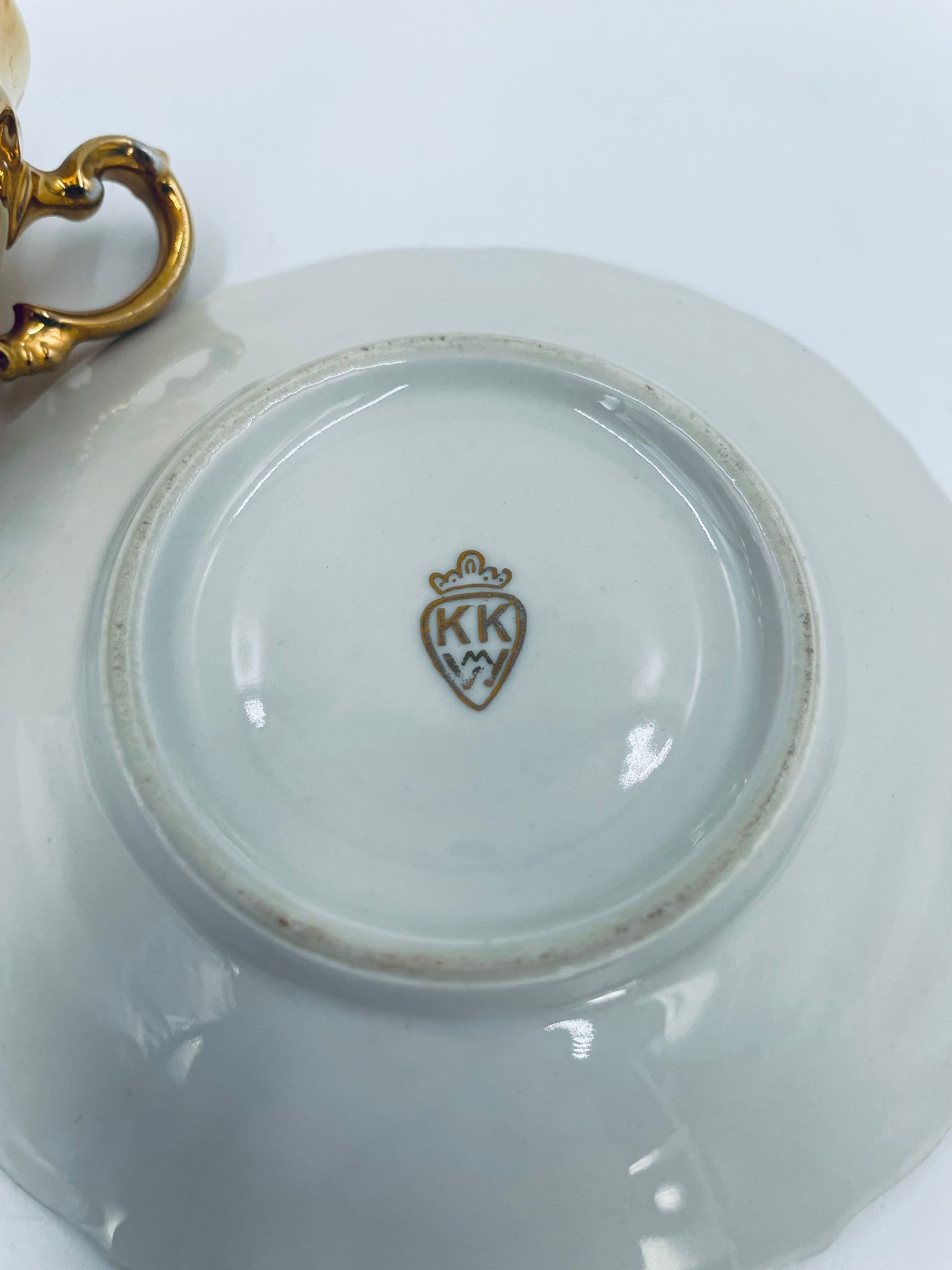 Filiżanka kolekcjonerska w zestawie duo, wytwórni KKW Königliche Porzellanmanufaktur Waldenburg, wykonana z wysokiej jakości porcelany. Zestaw w złotym kolorze, ozdobiony reliefowymi wzorami oraz nieregularnym brzegiem na talerzyku. Filiżanka z ozdobnym uchwytem i podstawa. Zestaw posiada liczne przetarcia na złoceniu.