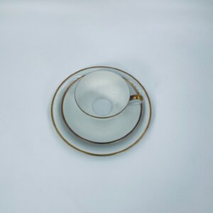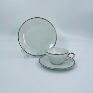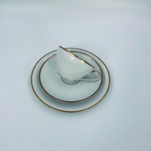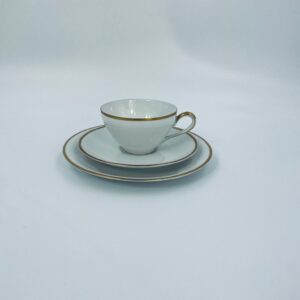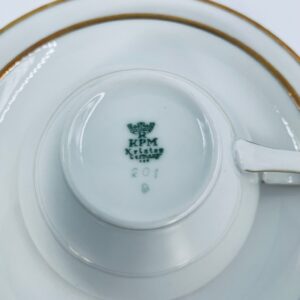 Filiżanka kolekcjonerska w zestawie trio wytwórni KPM Krister, wykonana z wysokiej jakości białej porcelany. Zestaw elegancki, klasyczny, wykończony złoceniem na rancie. Posiada małe przetarcie na złoceniu.