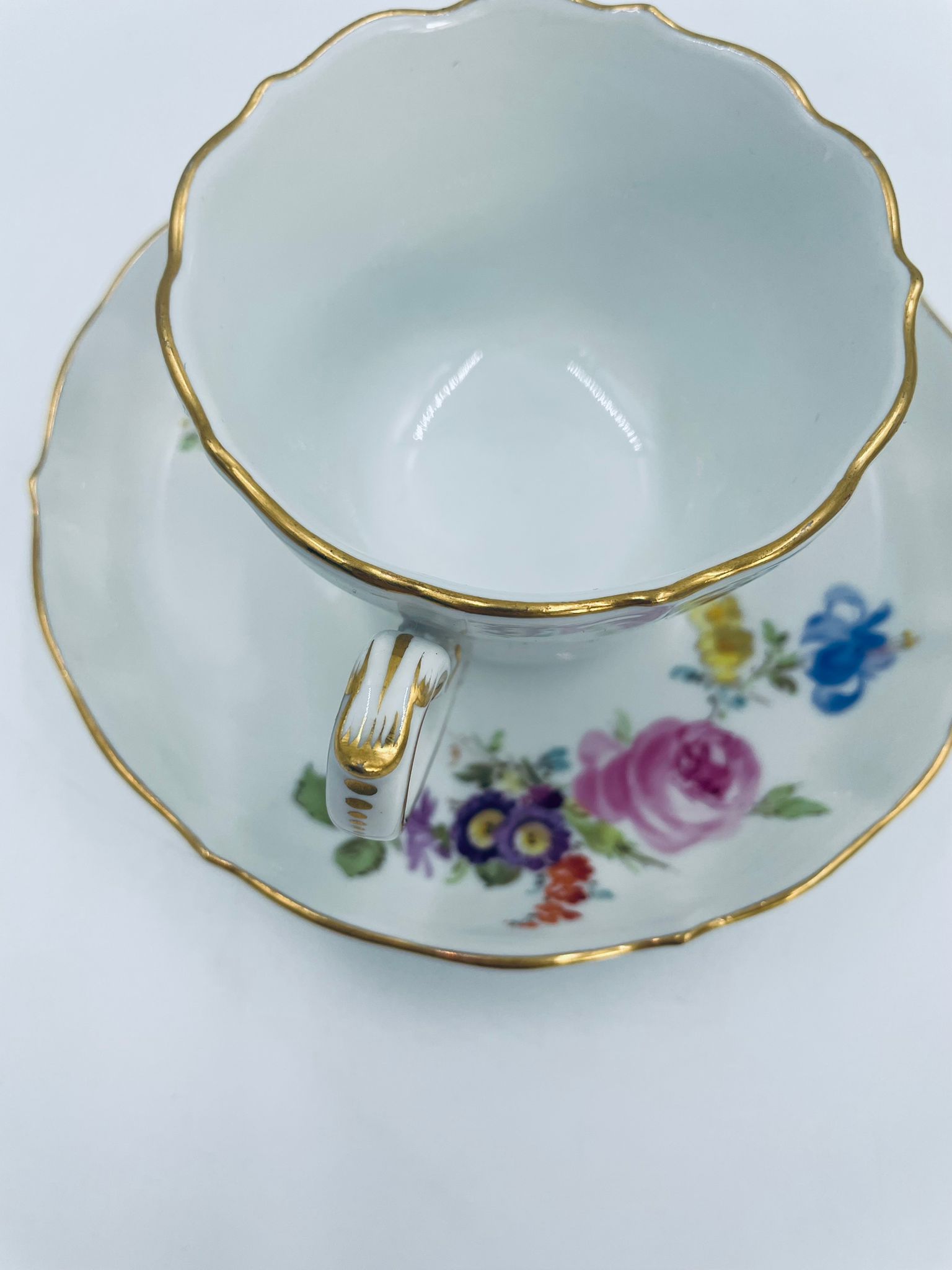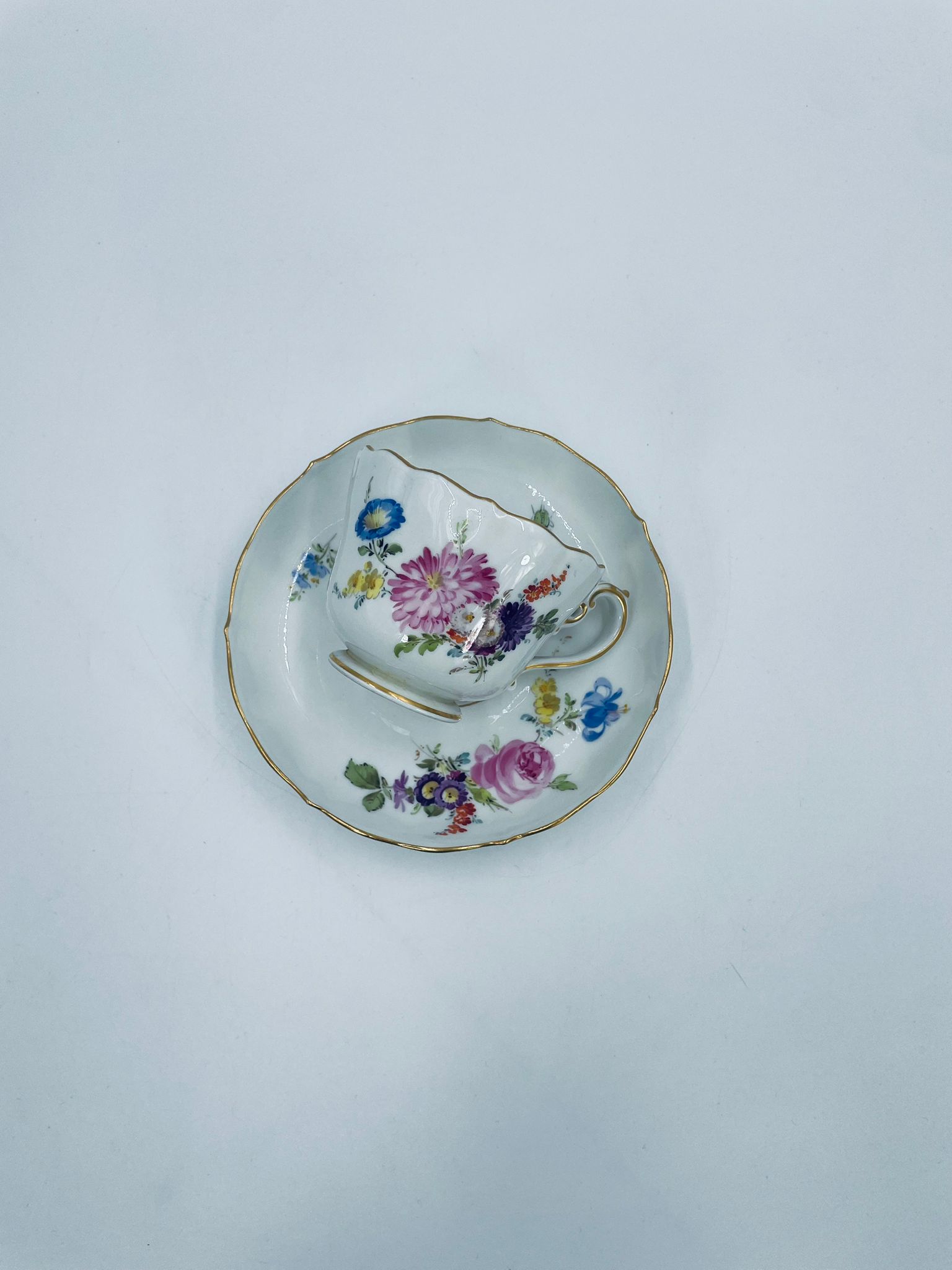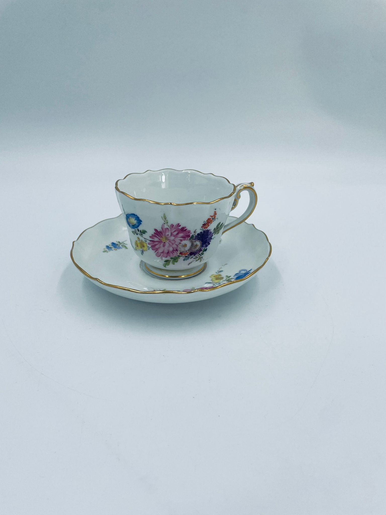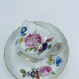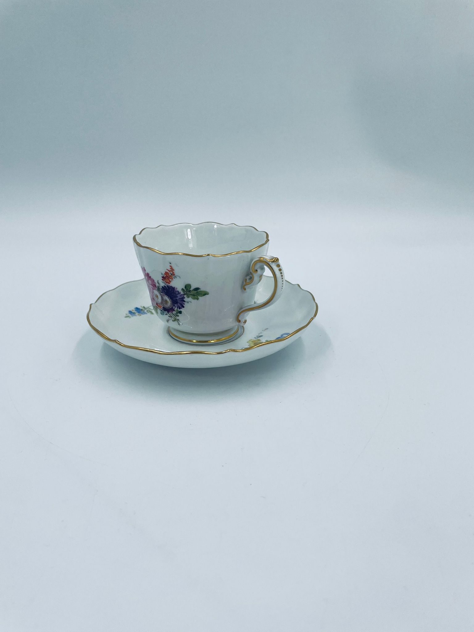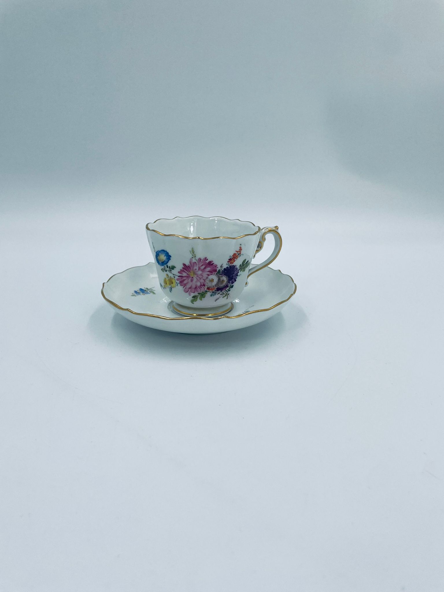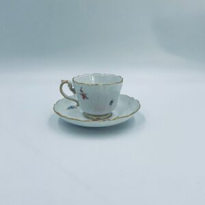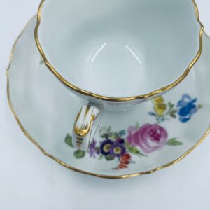 Filiżanka kolekcjonerska w zestawie duo królewskiej manufaktury Miśnieńskiej, wykonana z najwyższej jakości białej porcelany. Zestaw ręcznie malowany w piękny, nasycony dekor kwiatowy, wykończony złoceniem na falistym rancie oraz ozdobnym uchwycie. Posiada małe przetarcie na złoceniu.