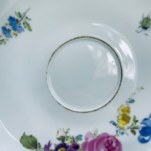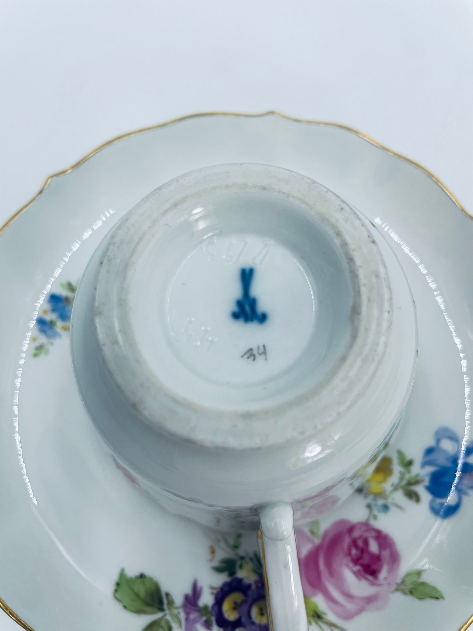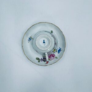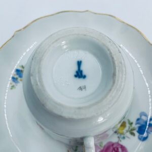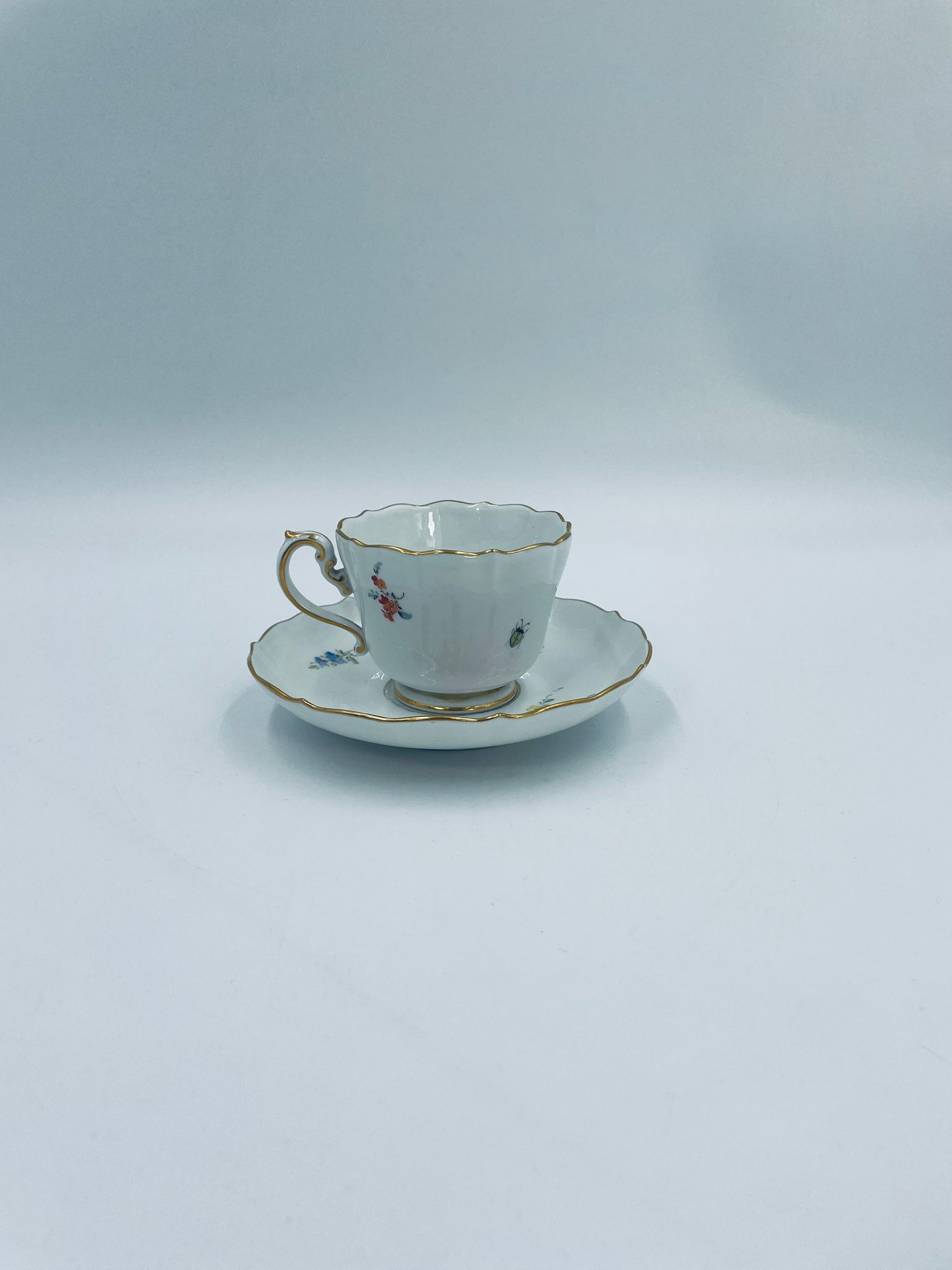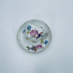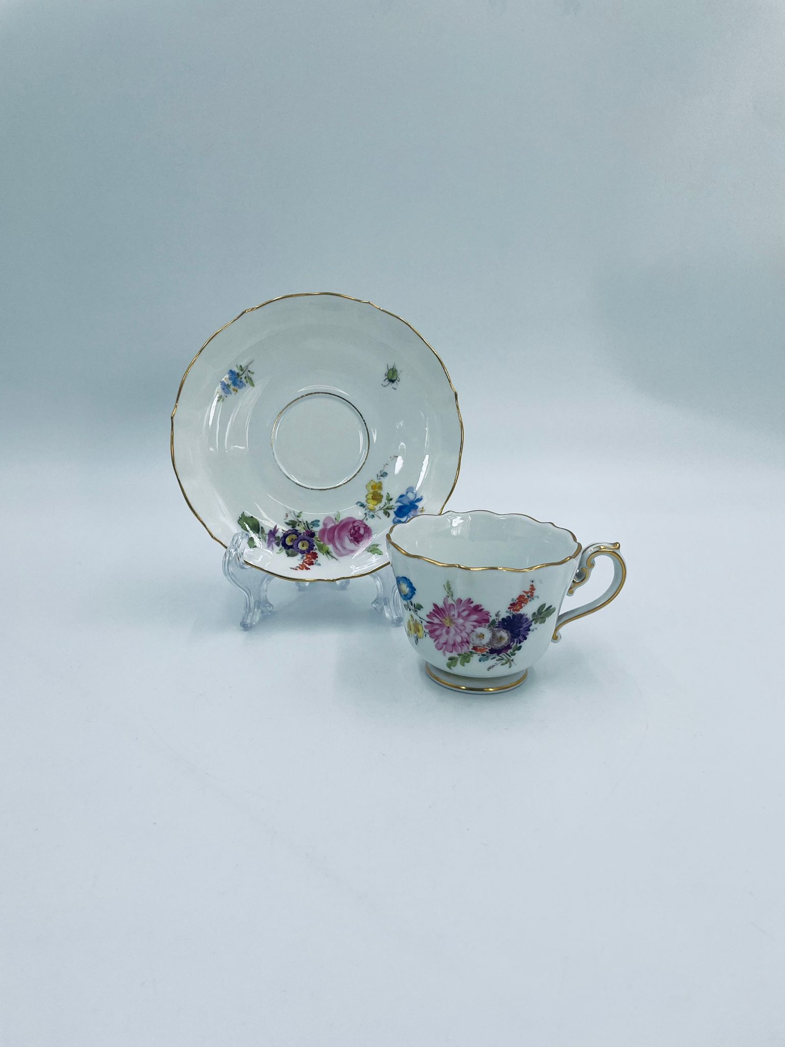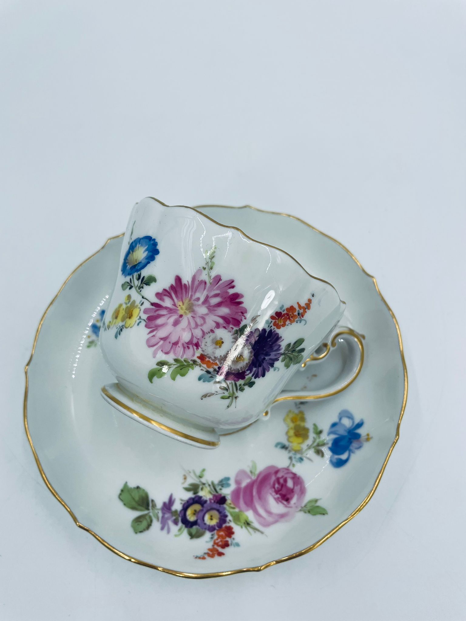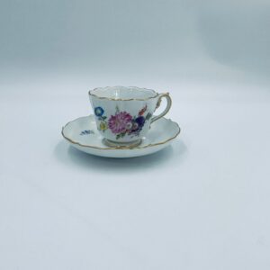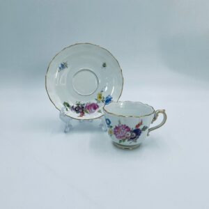 Filiżanka kolekcjonerska w zestawie duo królewskiej manufaktury Miśnieńskiej, wykonana z najwyższej jakości białej porcelany. Zestaw ręcznie malowany w piękny, nasycony dekor kwiatowy, wykończony złoceniem na falistym rancie oraz ozdobnym uchwycie. Posiada małe przetarcie na złoceniu.