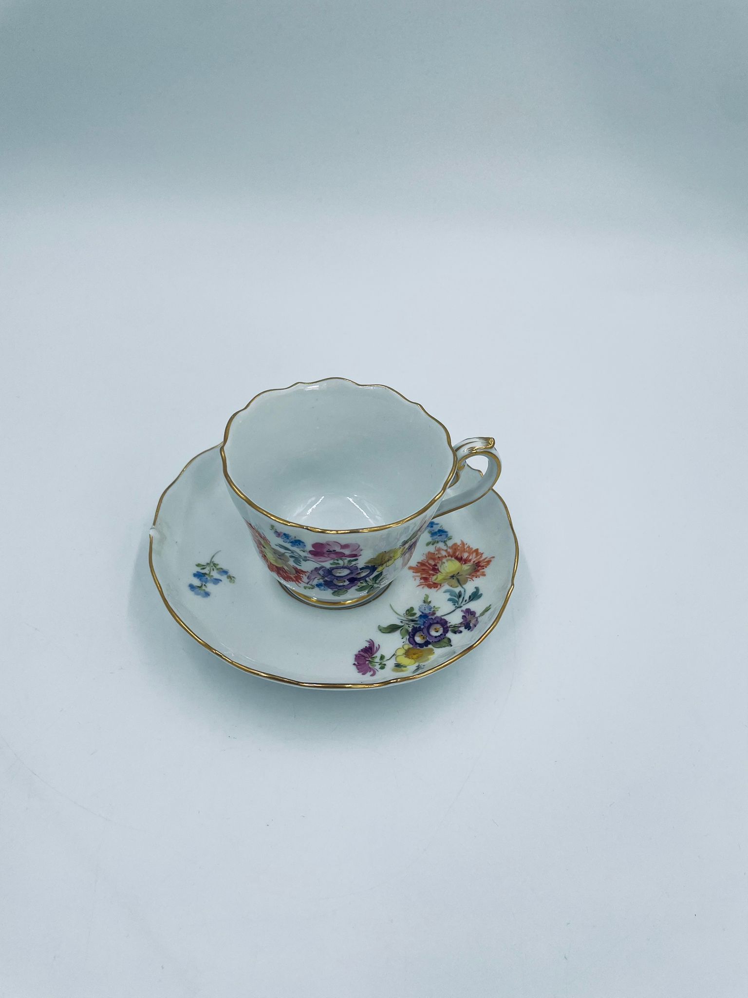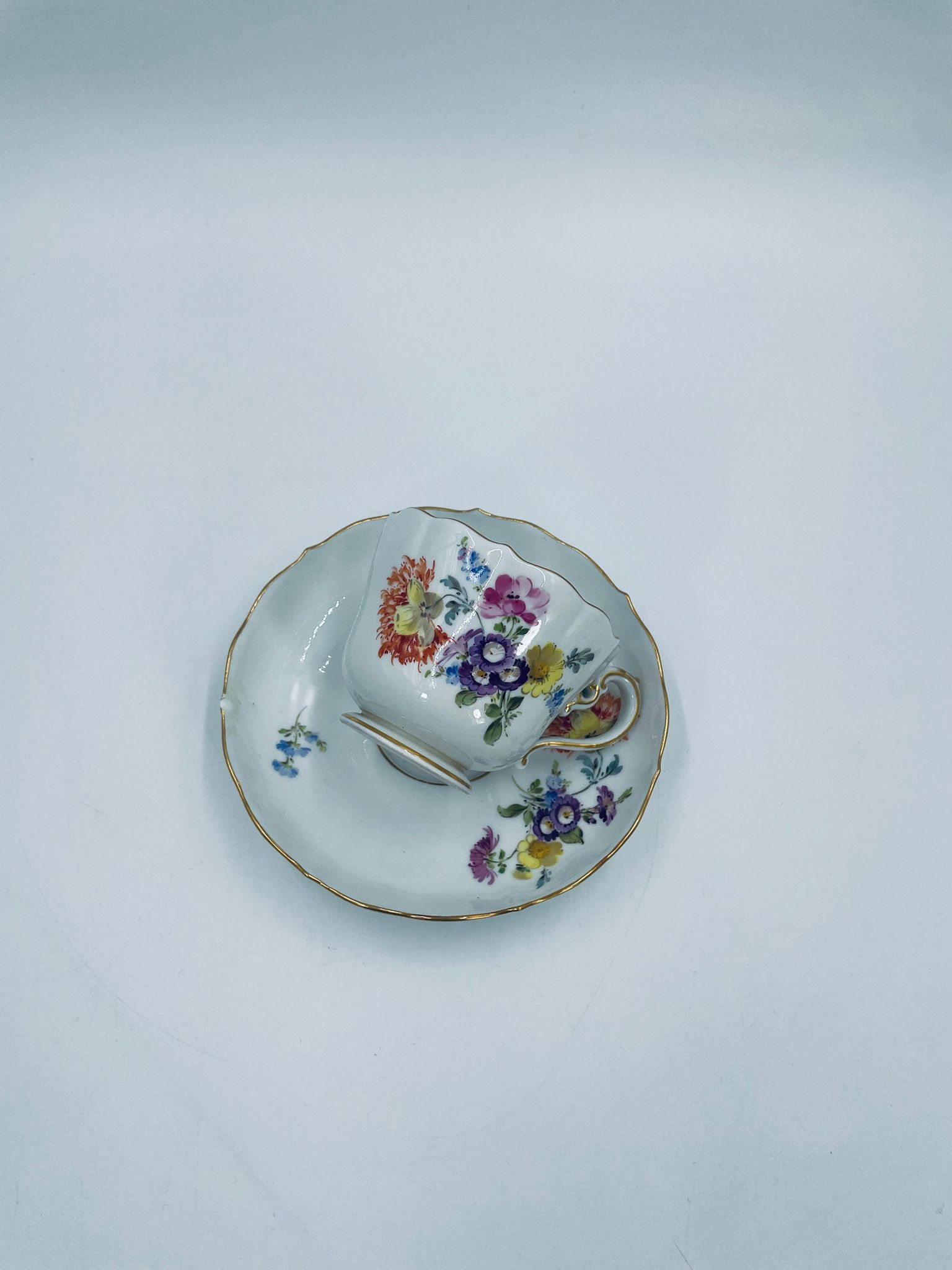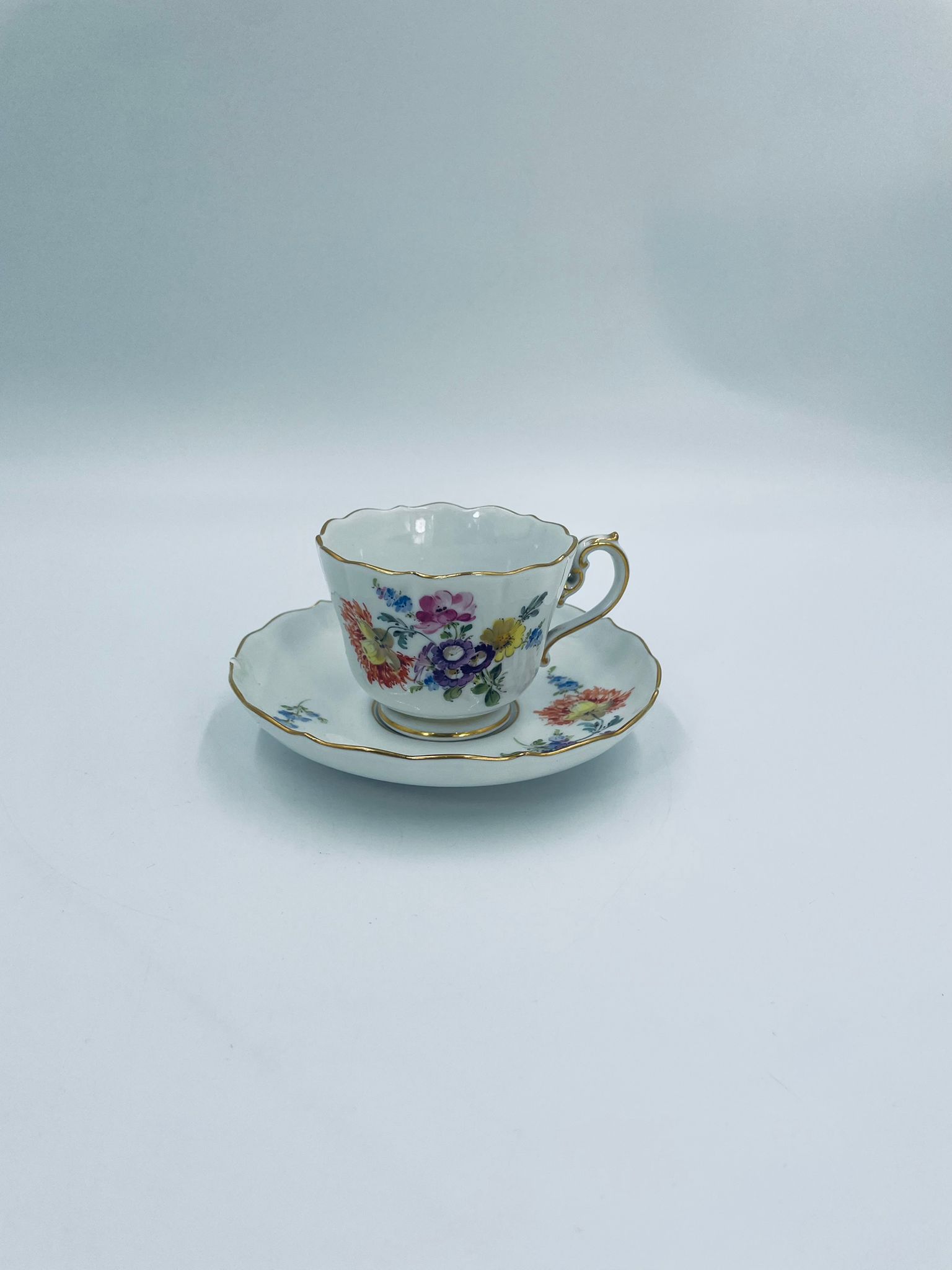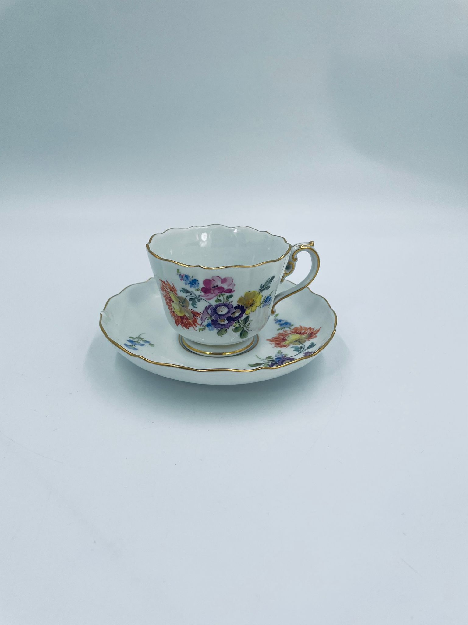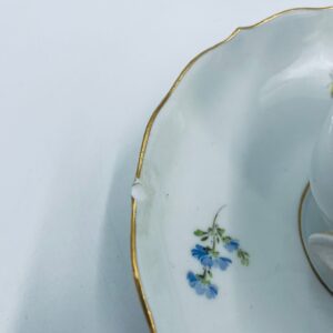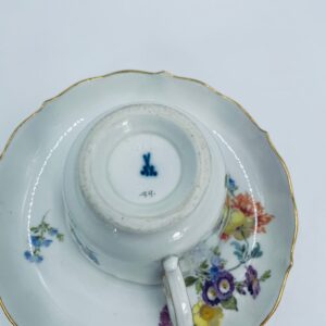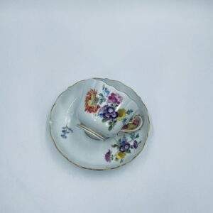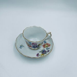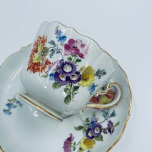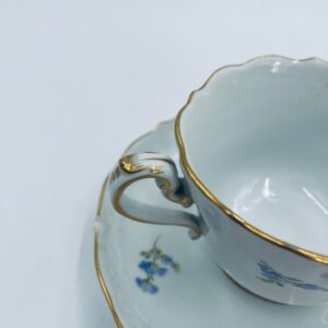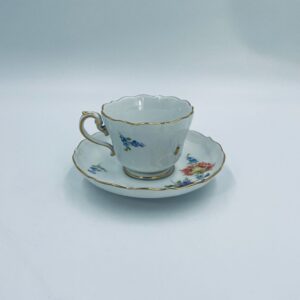 Filiżanka kolekcjonerska w zestawie duo królewskiej manufaktury Miśnieńskiej, wykonana z najwyższej jakości białej porcelany. Zestaw ręcznie malowany w piękny, nasycony dekor kwiatowy, wykończony złoceniem na falistym rancie oraz ozdobnym uchwycie. Posiada małe przetarcie na złoceniu oraz uszczerbek na rancie spodka.
