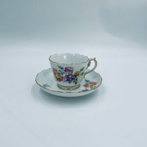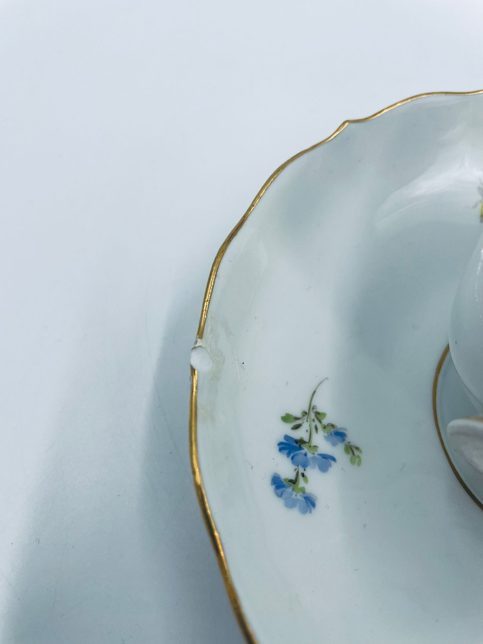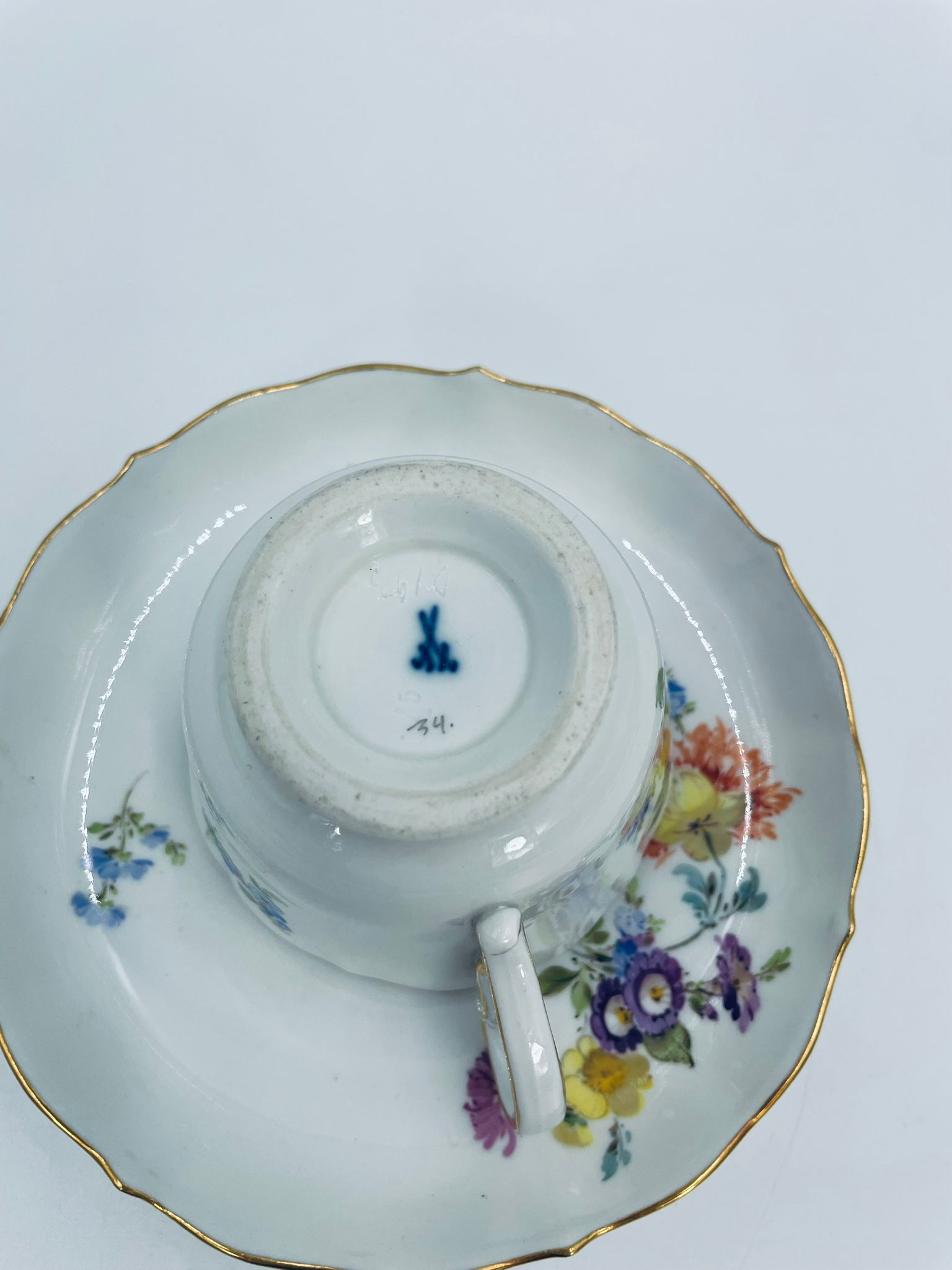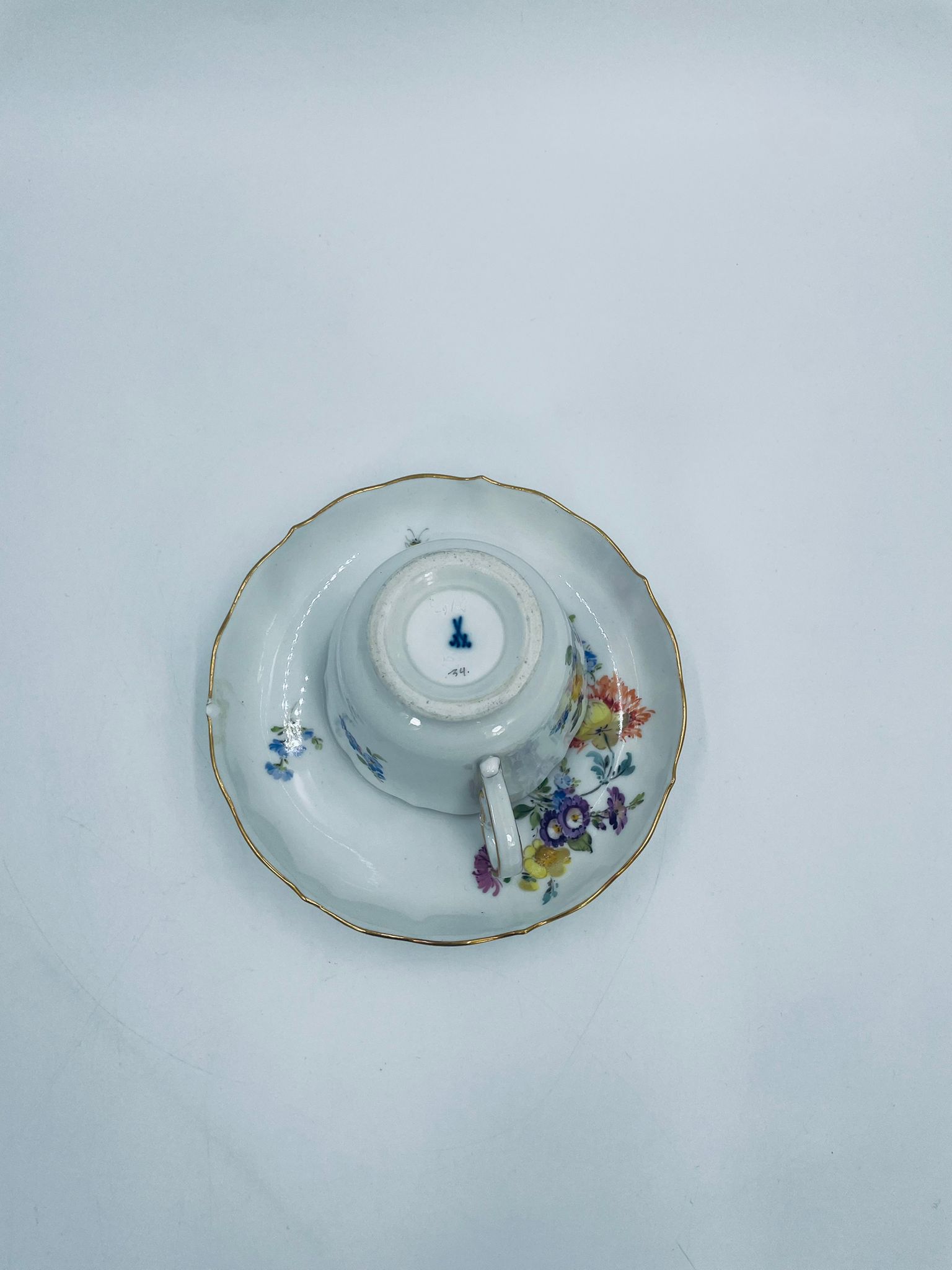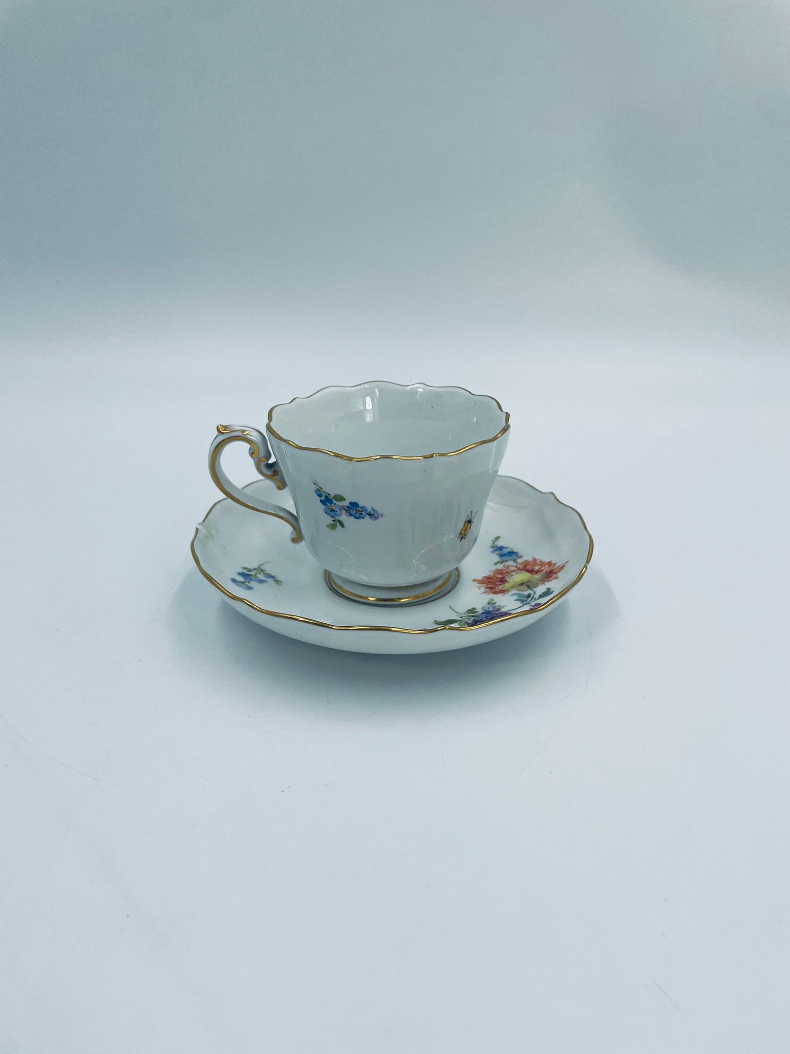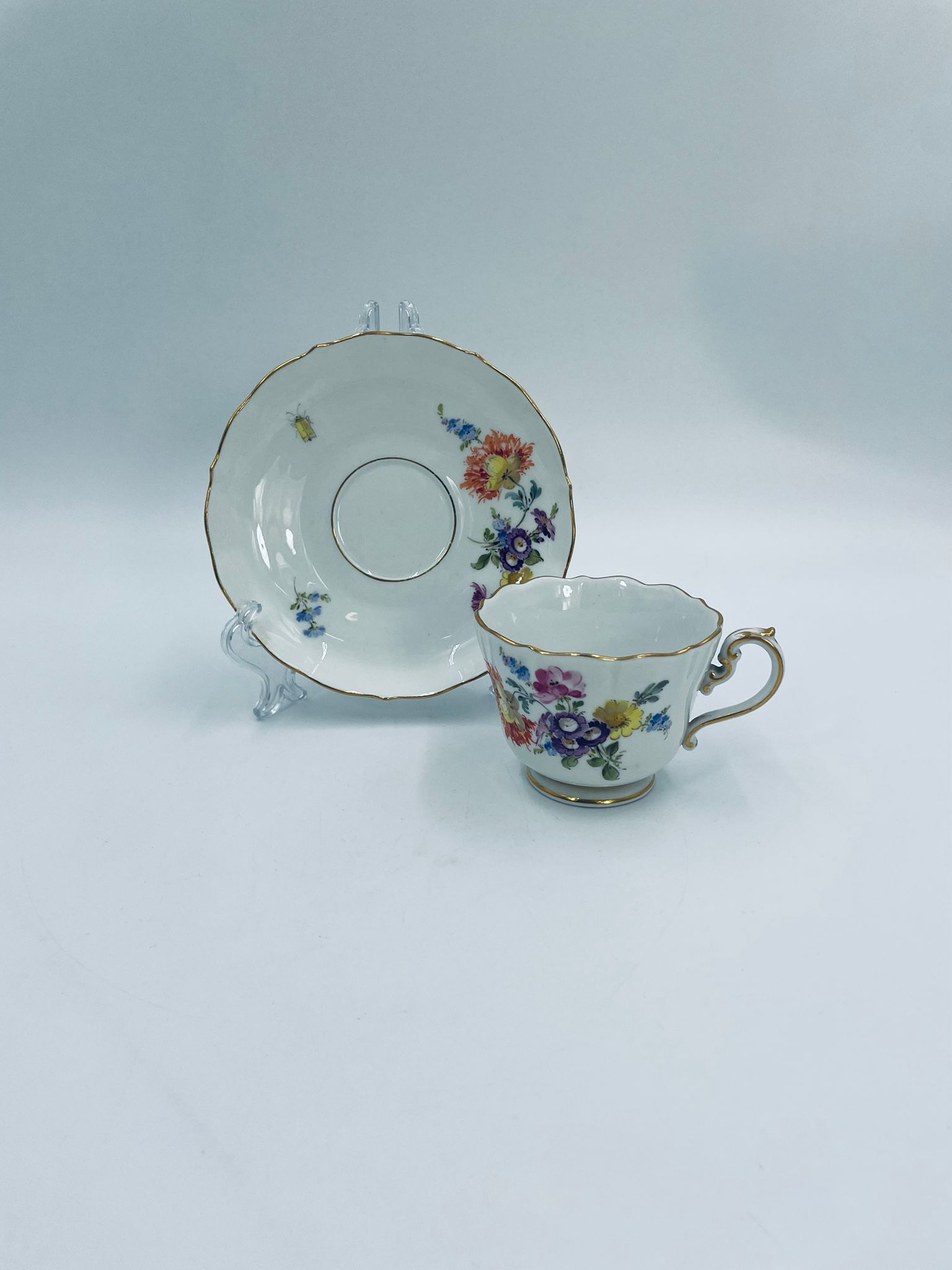 Filiżanka kolekcjonerska w zestawie duo królewskiej manufaktury Miśnieńskiej, wykonana z najwyższej jakości białej porcelany. Zestaw ręcznie malowany w piękny, nasycony dekor kwiatowy, wykończony złoceniem na falistym rancie oraz ozdobnym uchwycie. Posiada małe przetarcie na złoceniu oraz uszczerbek na rancie spodka.