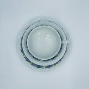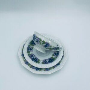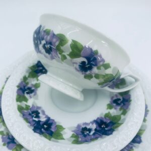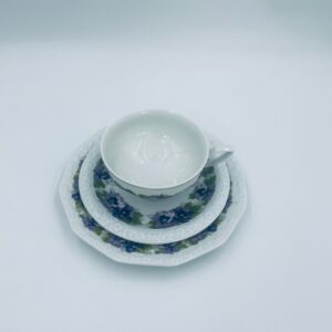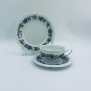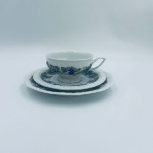 Filiżanka kolekcjonerska w zestawie trio, renomowanej wytwórni Rosenthal z kolekcji Maria, zaprojektowanej przez Philippa Rosenthala w 1916r. Zestaw charakteryzuje się ozdobnym wzorem fioletowych fiołków z zielonymi listkami oraz reliefowym wykończeniem rantów.
