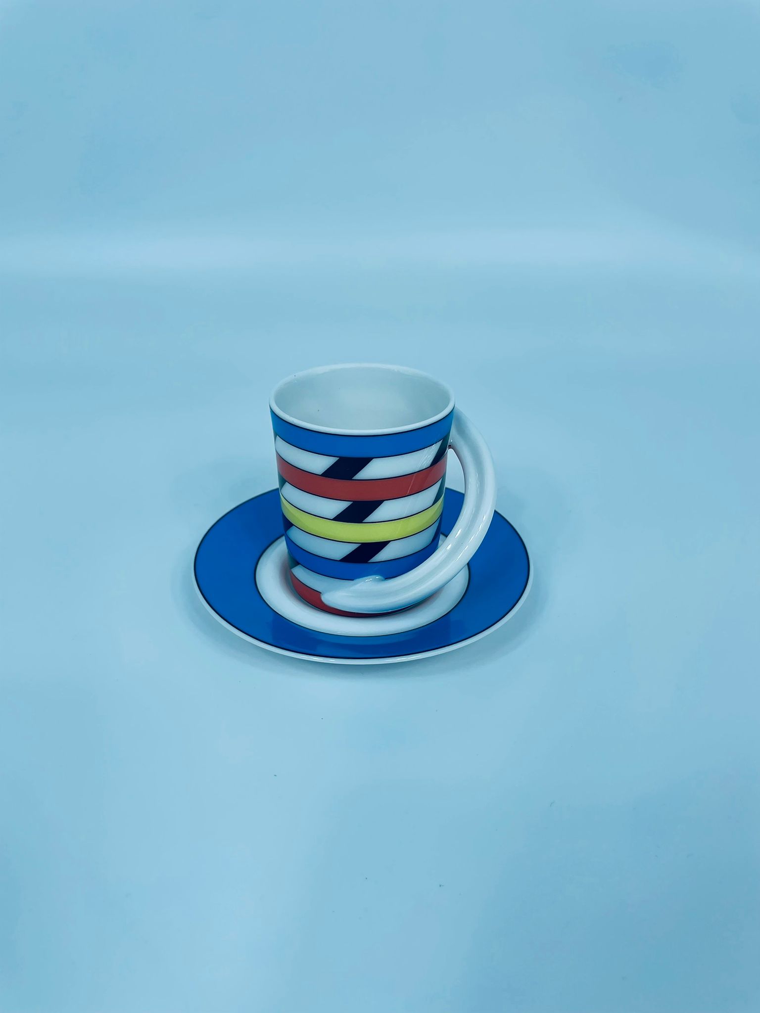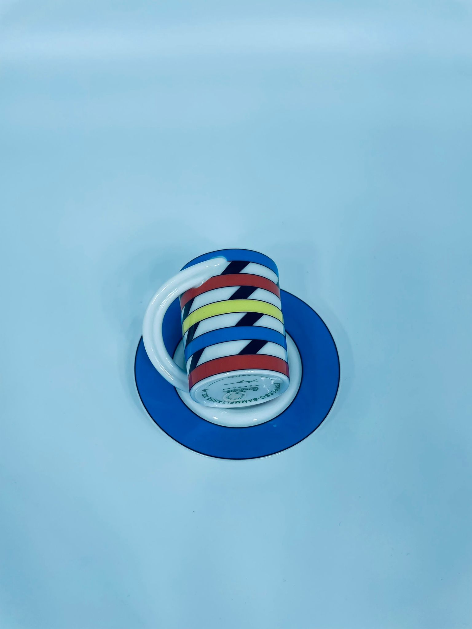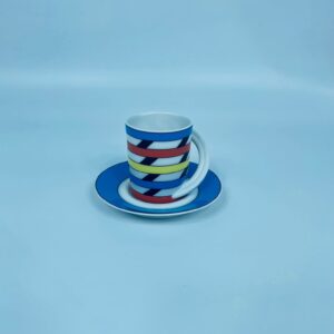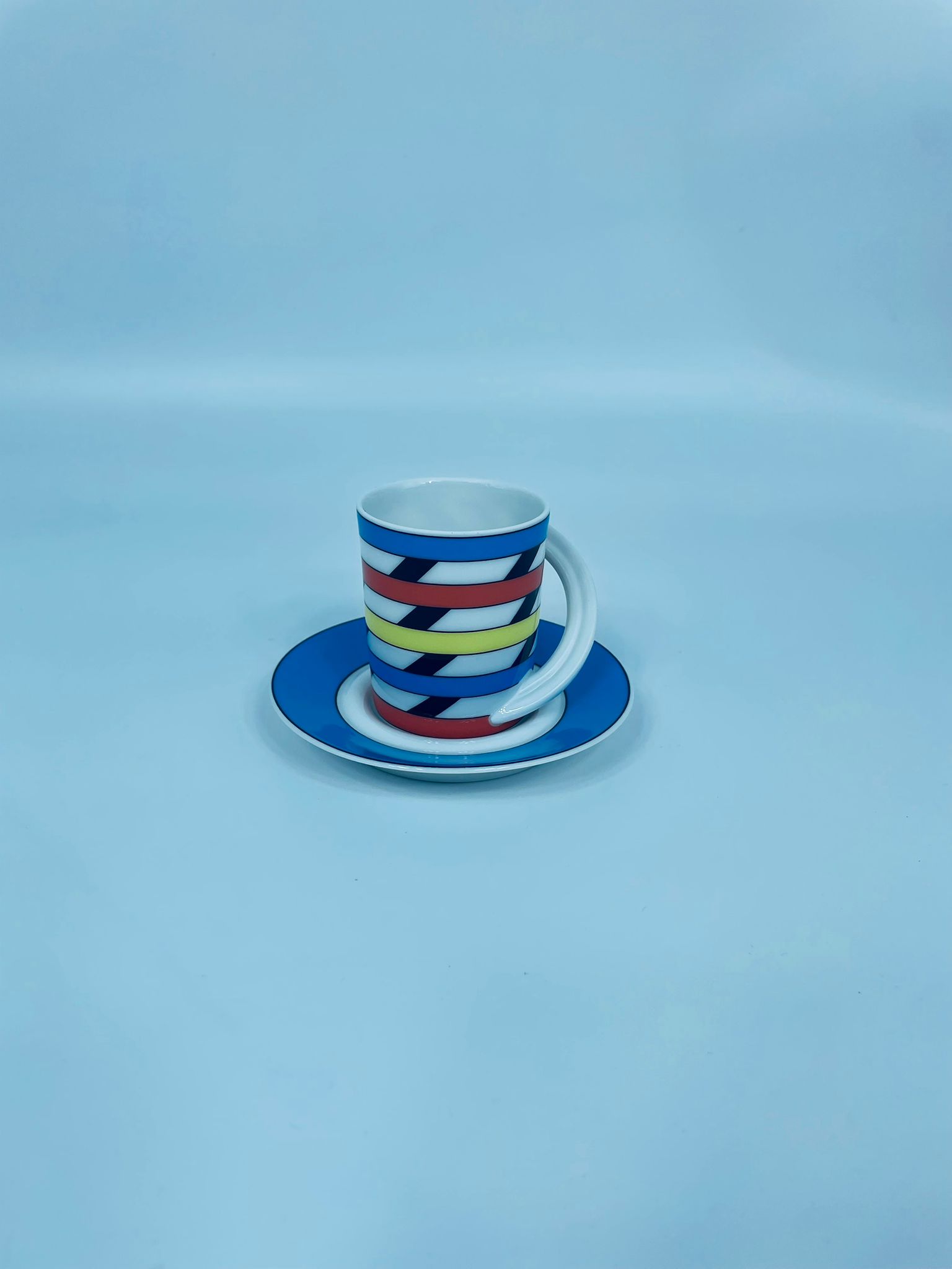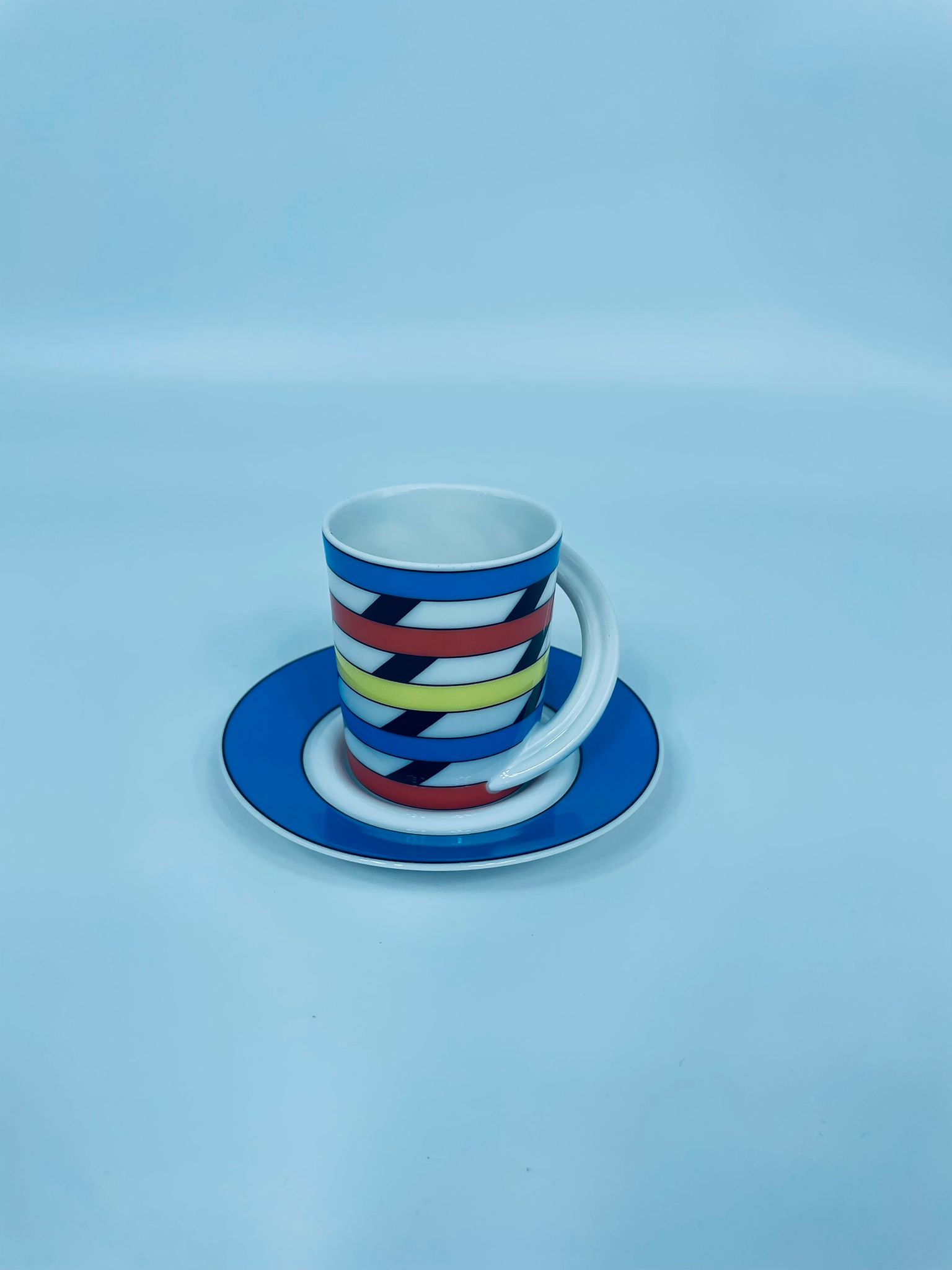 Filiżanka kolekcjonerska w zestawie duo renomowanej wytwórni Rosenthal, z serii Cupola, zaprojektowana przez Mario Belliniego, wykonana z najwyższej jakości białej porcelany. Zestaw we wzorze Yang, charakteryzujący się nowoczesnym designem w kolorowe paski, filiżanka z dekoracyjnym, łukowatym uchwytem.