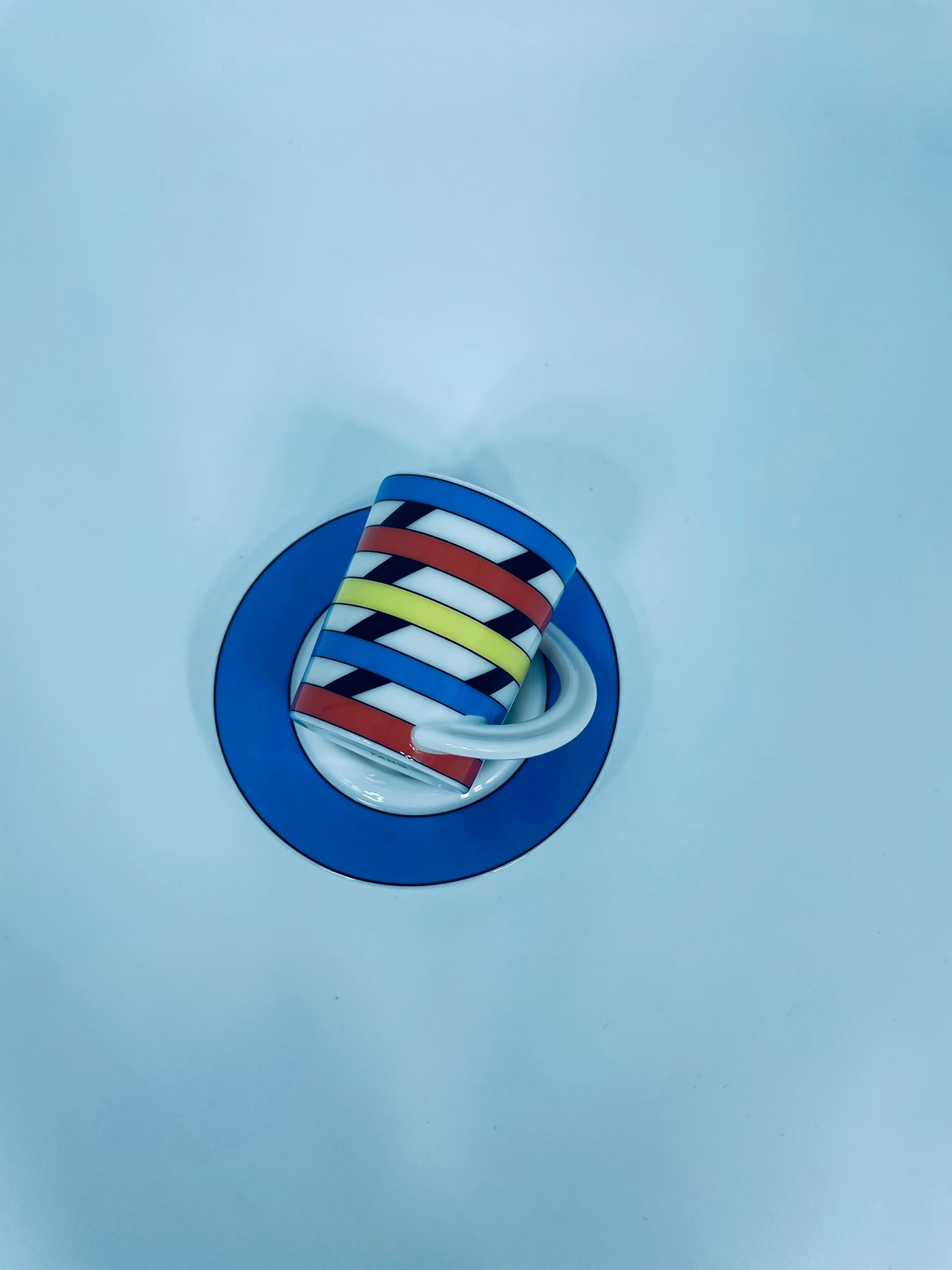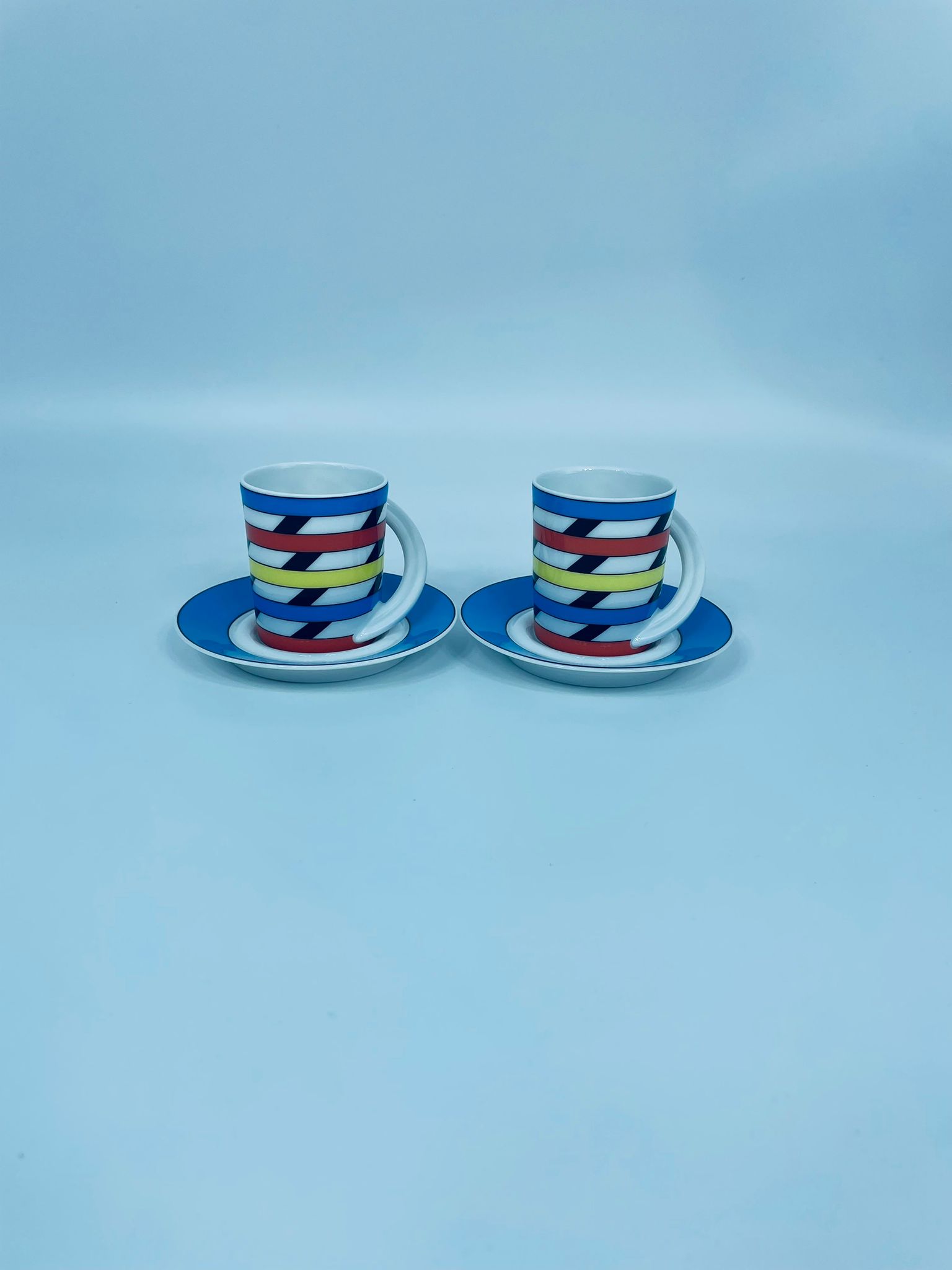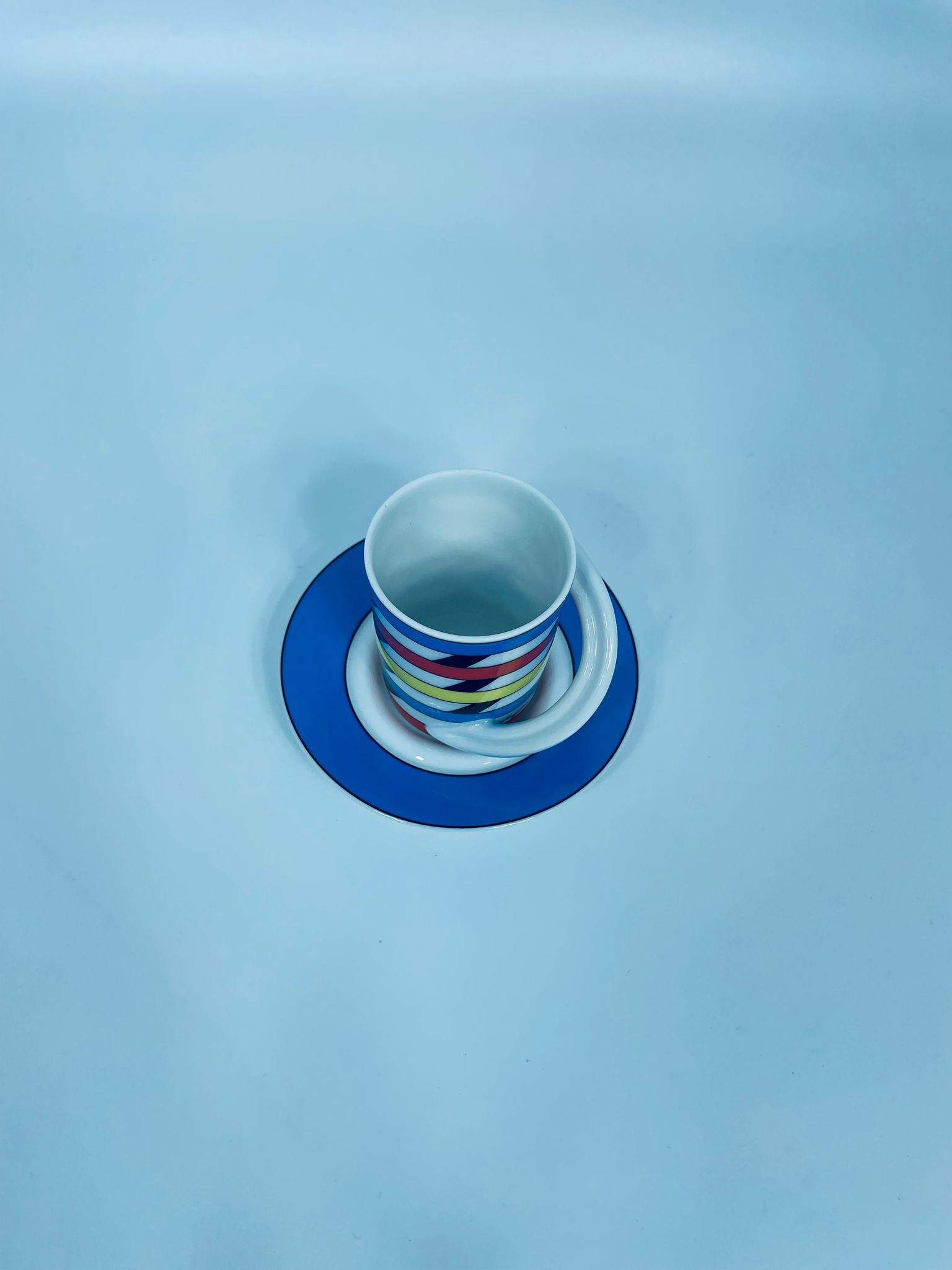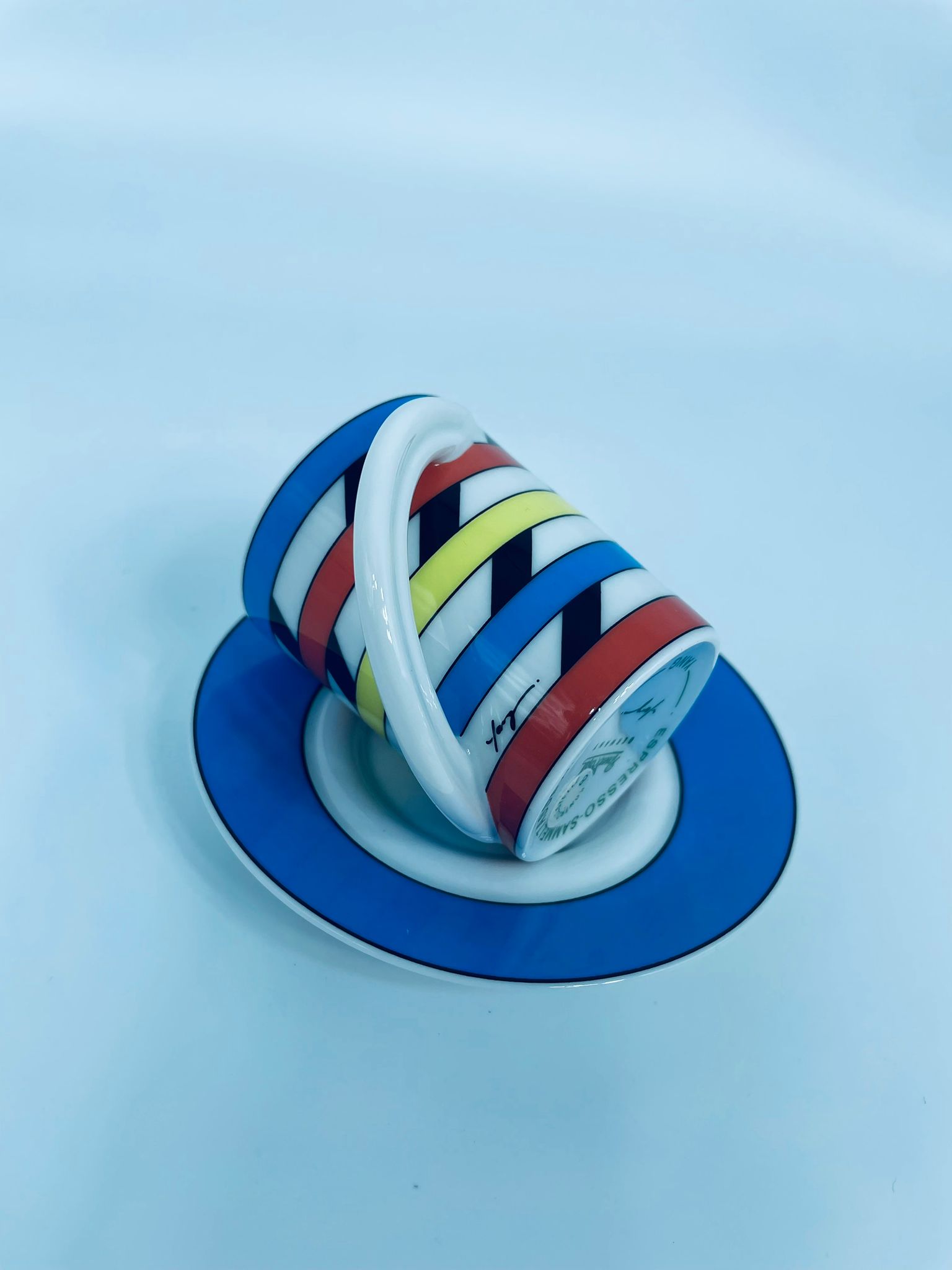 Filiżanka kolekcjonerska w zestawie duo renomowanej wytwórni Rosenthal, z serii Cupola, zaprojektowana przez Mario Belliniego, wykonana z najwyższej jakości białej porcelany. Zestaw we wzorze Yang, charakteryzujący się nowoczesnym designem w kolorowe paski, filiżanka z dekoracyjnym, łukowatym uchwytem.