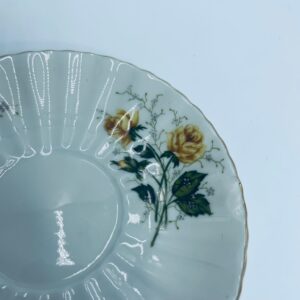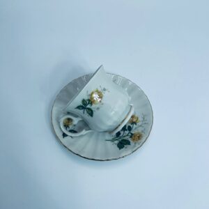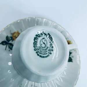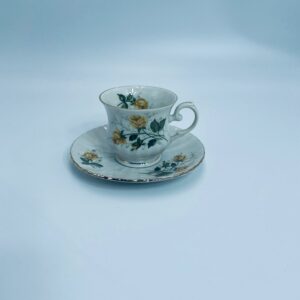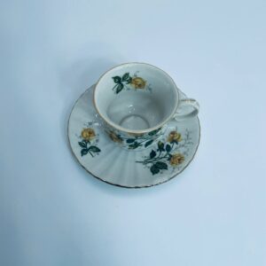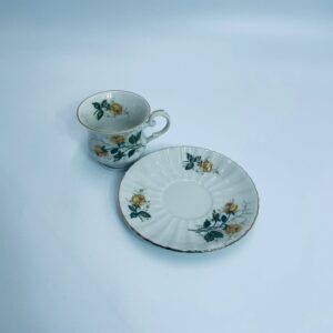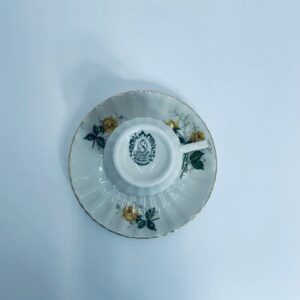 Filiżanka kolekcjonerska w zestawie duo wytwórni Seltmann Weiden Royal China, wykonana z wysokiej jakości białej porcelany. Zestaw ozdobiony wzorem pięknych, żółtych róż z zielonymi listkami oraz ze złotym zdobieniem na krawędziach.