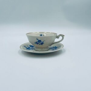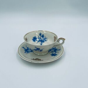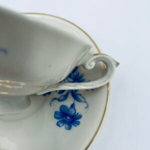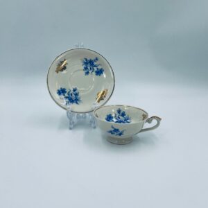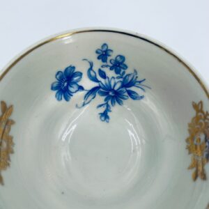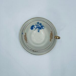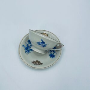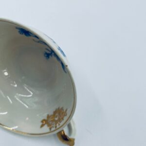Filiżanka kolekcjonerska w zestawie duo w stylu Vintage, wykonana z wysokiej jakości porcelany w kolorze ecru. Zestaw charakteryzuje się ręcznie malowanym, niebieskim wzorem kwiatowym oraz złotym wzorem roślinnym, wykończony złoceniem na rancie. Filiżanka z ozdobnym uchwytem, z reliefowym wzorem i złoceniem, Posiada mały uszczerbek na górnym rancie.