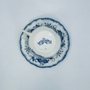 Filiżanka kolekcjonerska w zestawie duo wytwórni Sarreguemines z kolekcji Lancaster, wykonana z ceramiki w kolorze ecru. Zestaw charakteryzuje się wzorem cebulowym z motywem kwiatowym w kolorze kobaltowym, wykończony kolorem niebieskim na falowanych rantach. Zestaw posiada przetarcia, uszczerbek i pęknięcie szkliwa.