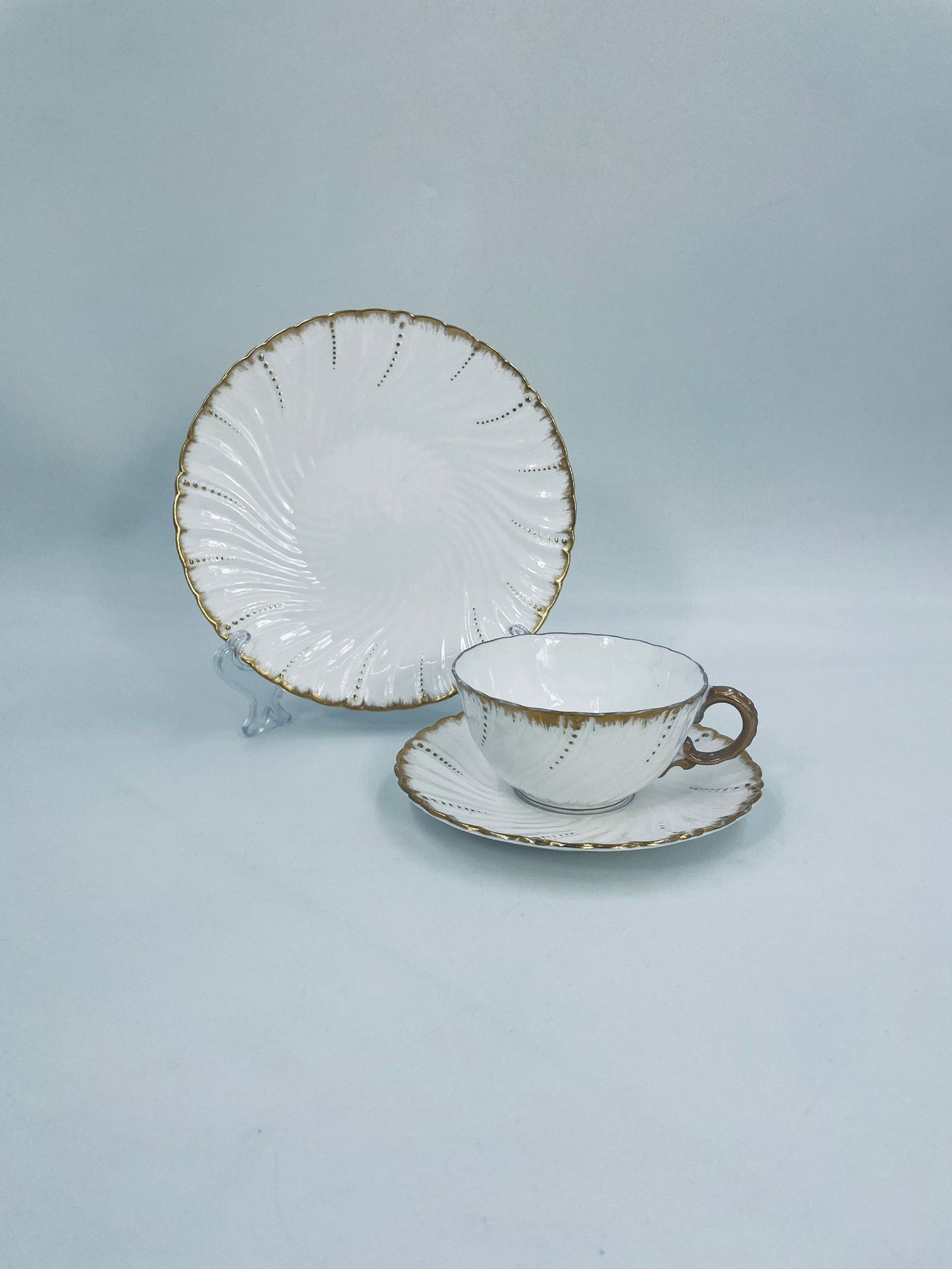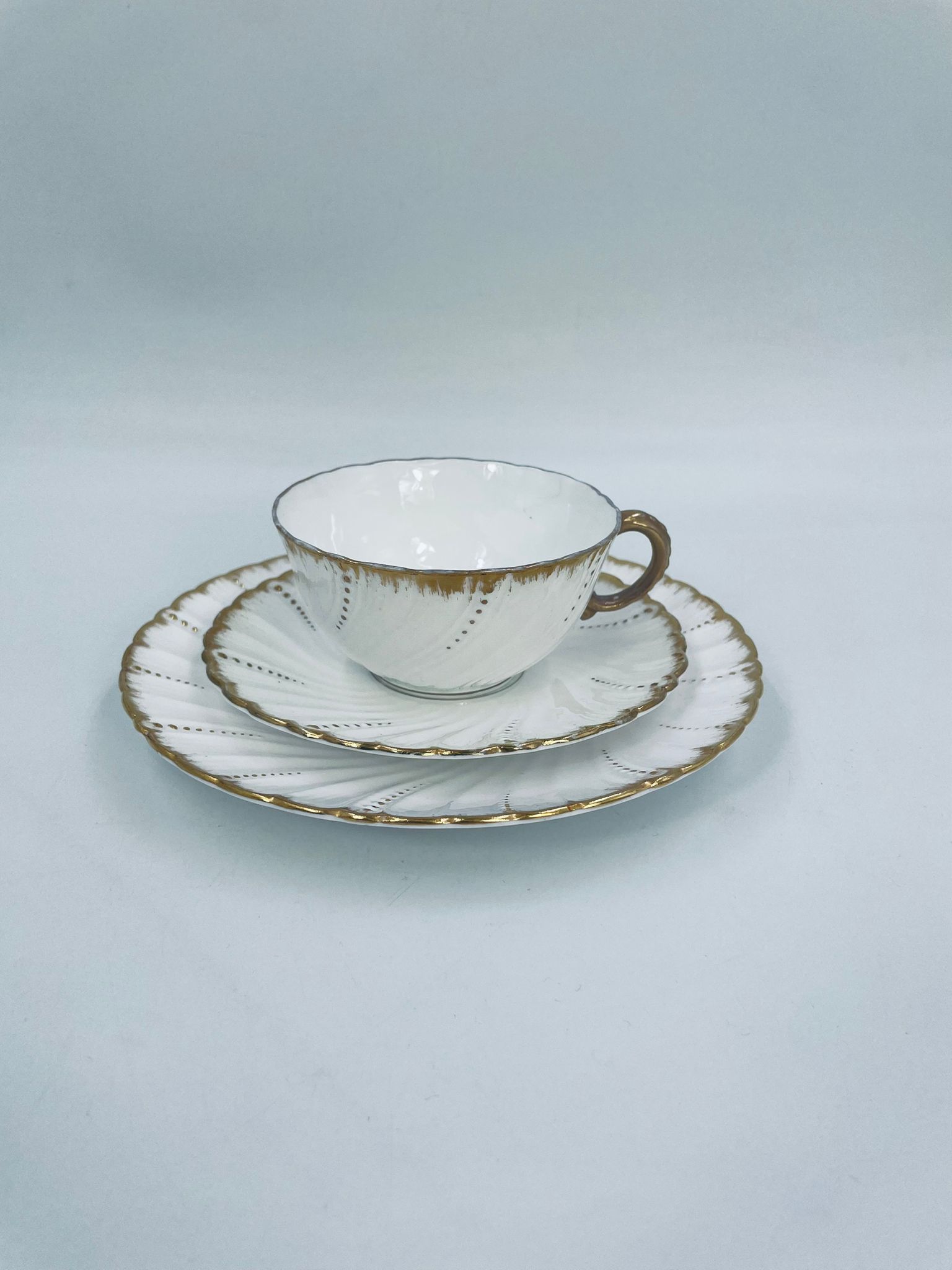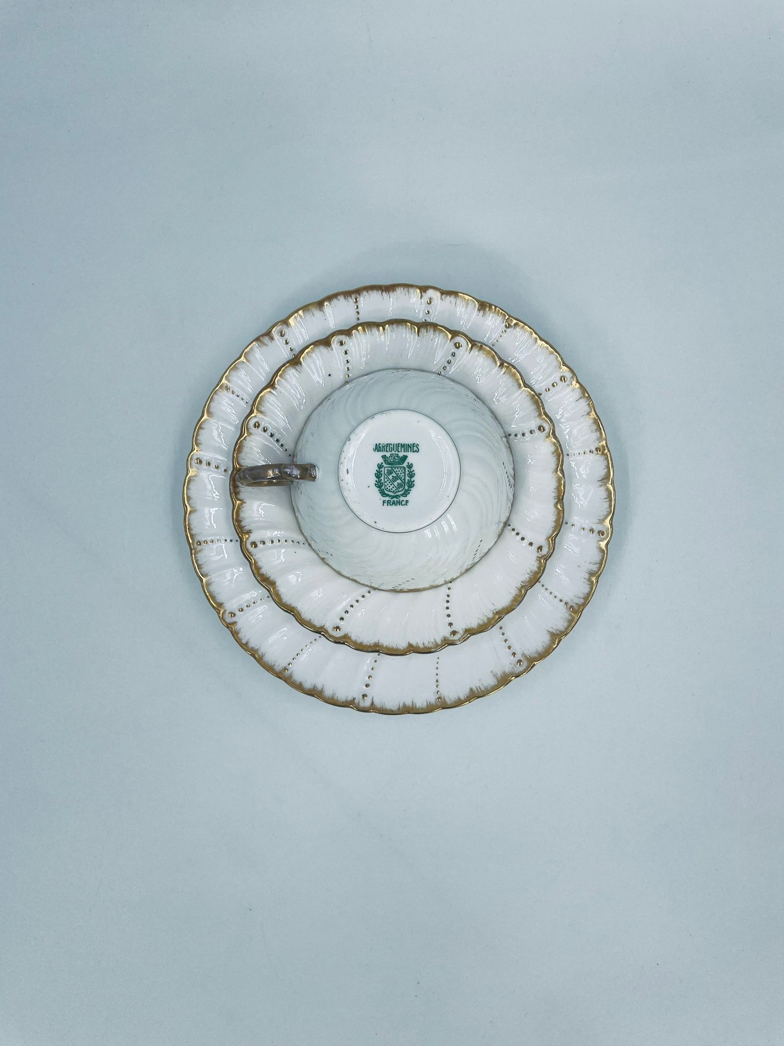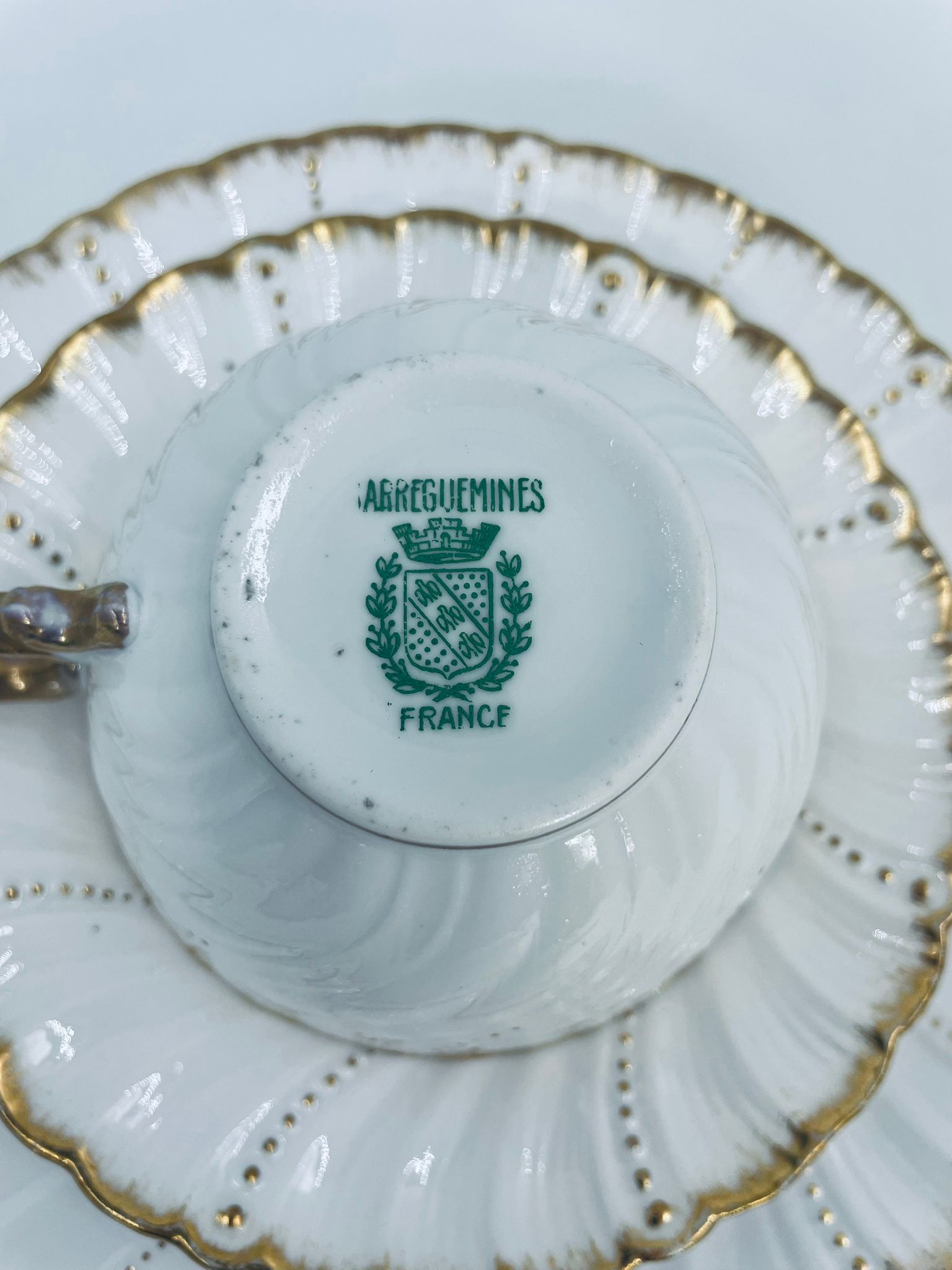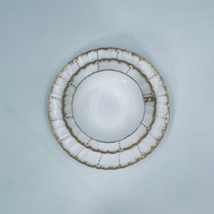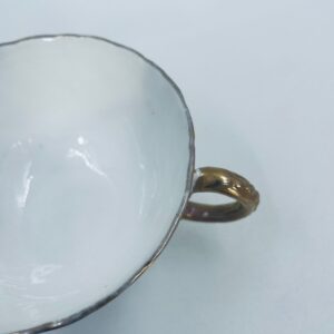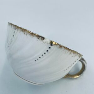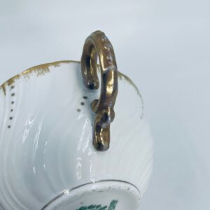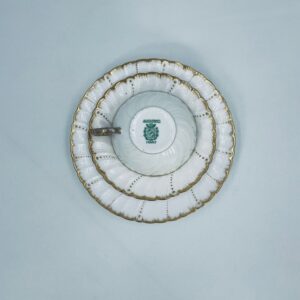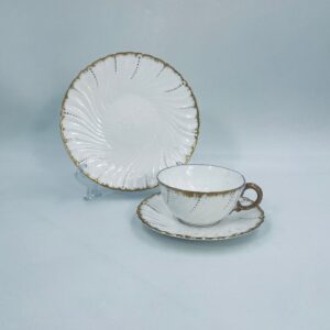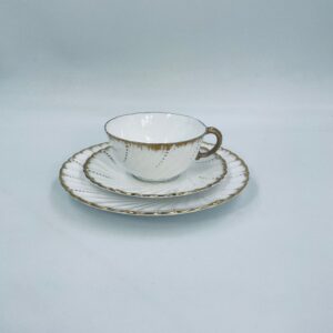 Filiżanka kolekcjonerska w zestawie trio francuskiej wytwórni Sarreguemines, wykonana z wysokiej jakości białej porcelany. Zestaw charakteryzuje się klasyczną formą, ozdobiony jest reliefowym wzorem z ręcznie malowanymi złotymi detalami, wykończony złoceniem na falowanym rancie. Posiada przetarcia na złoceniu.