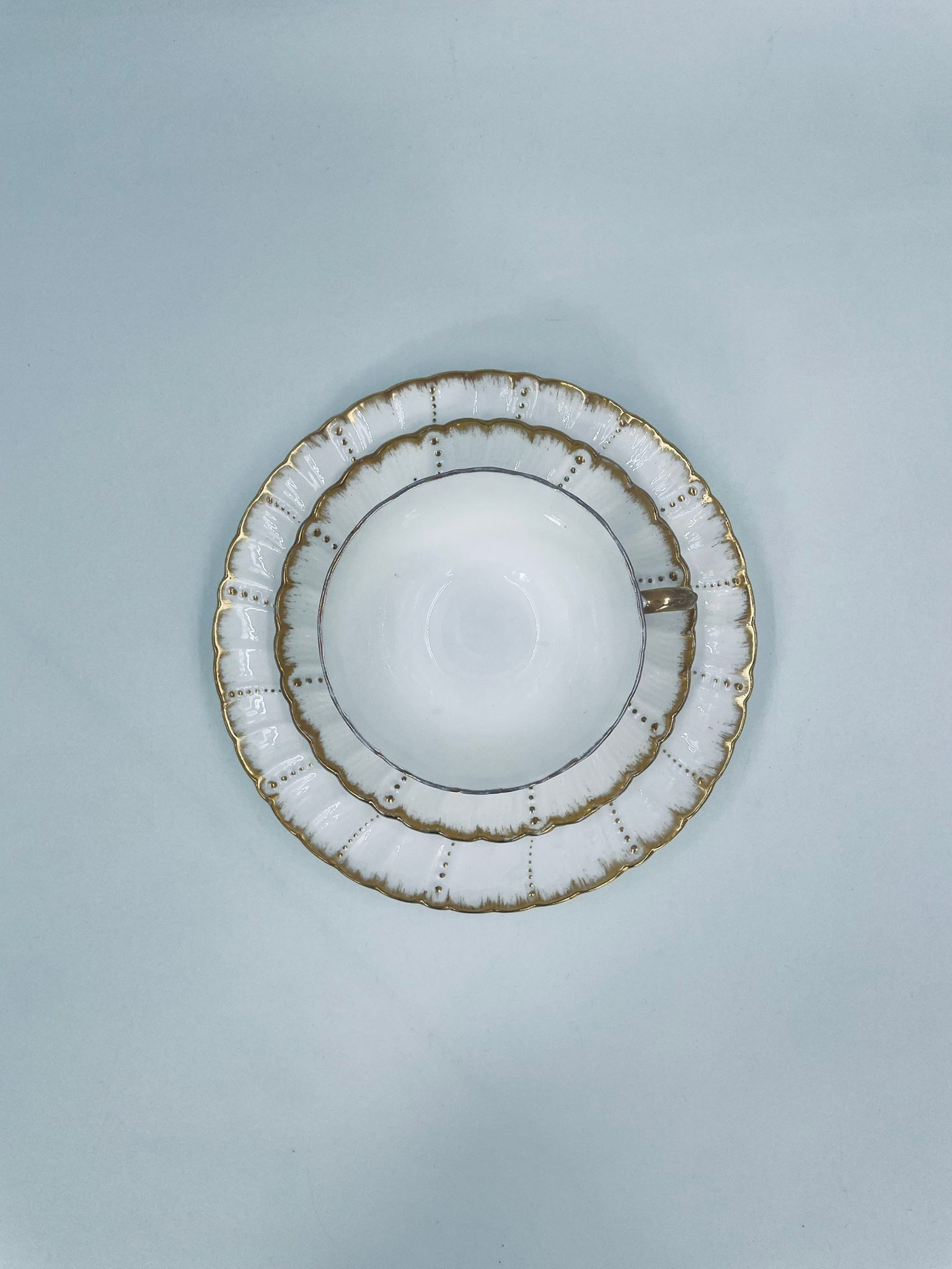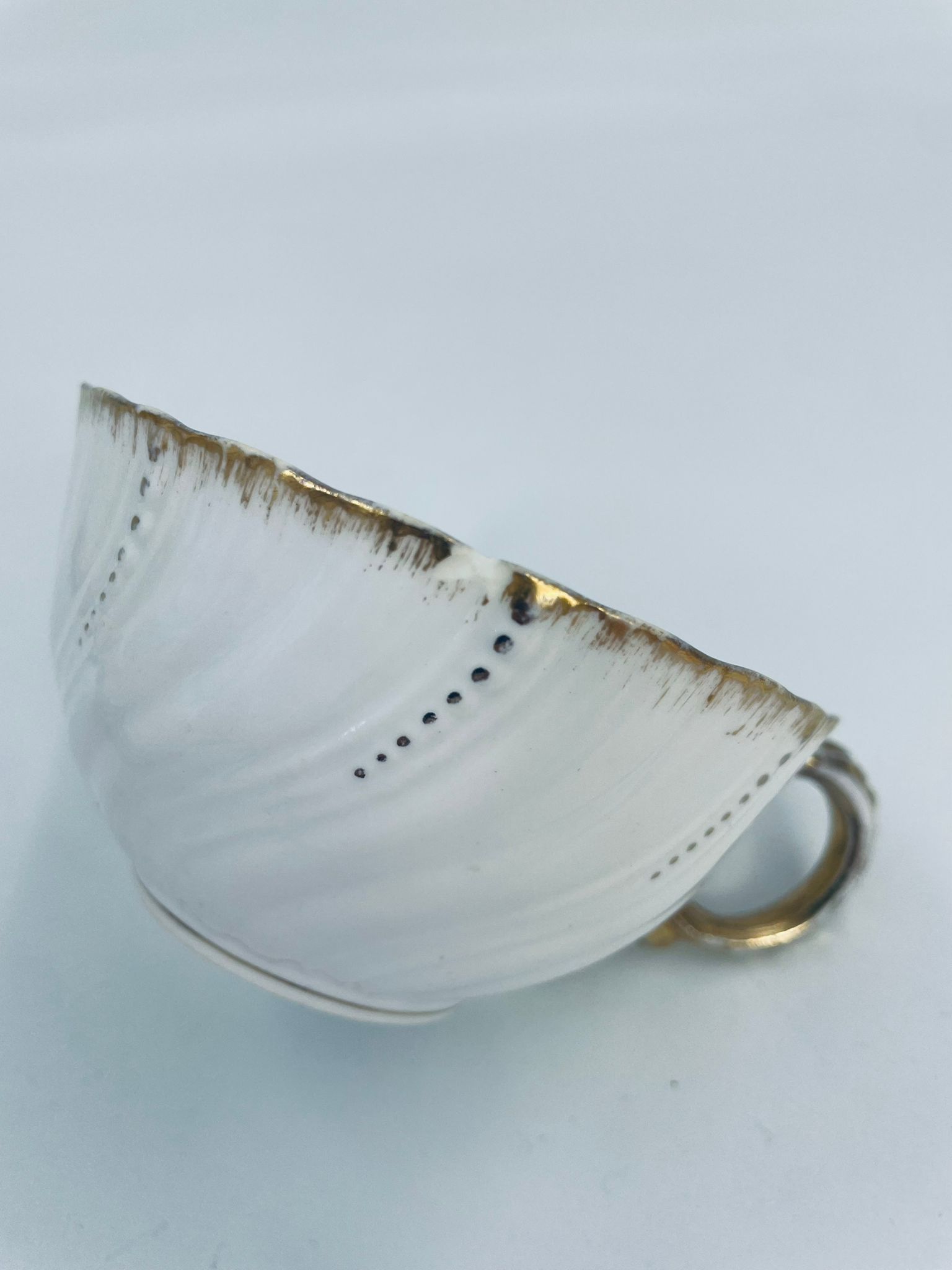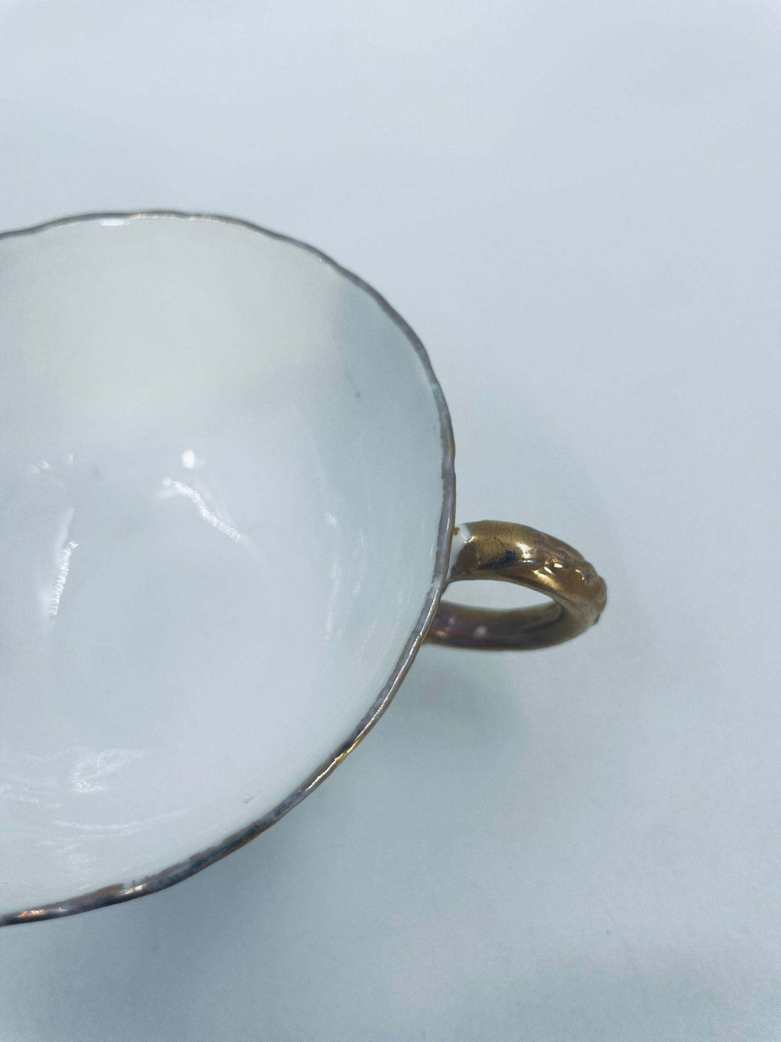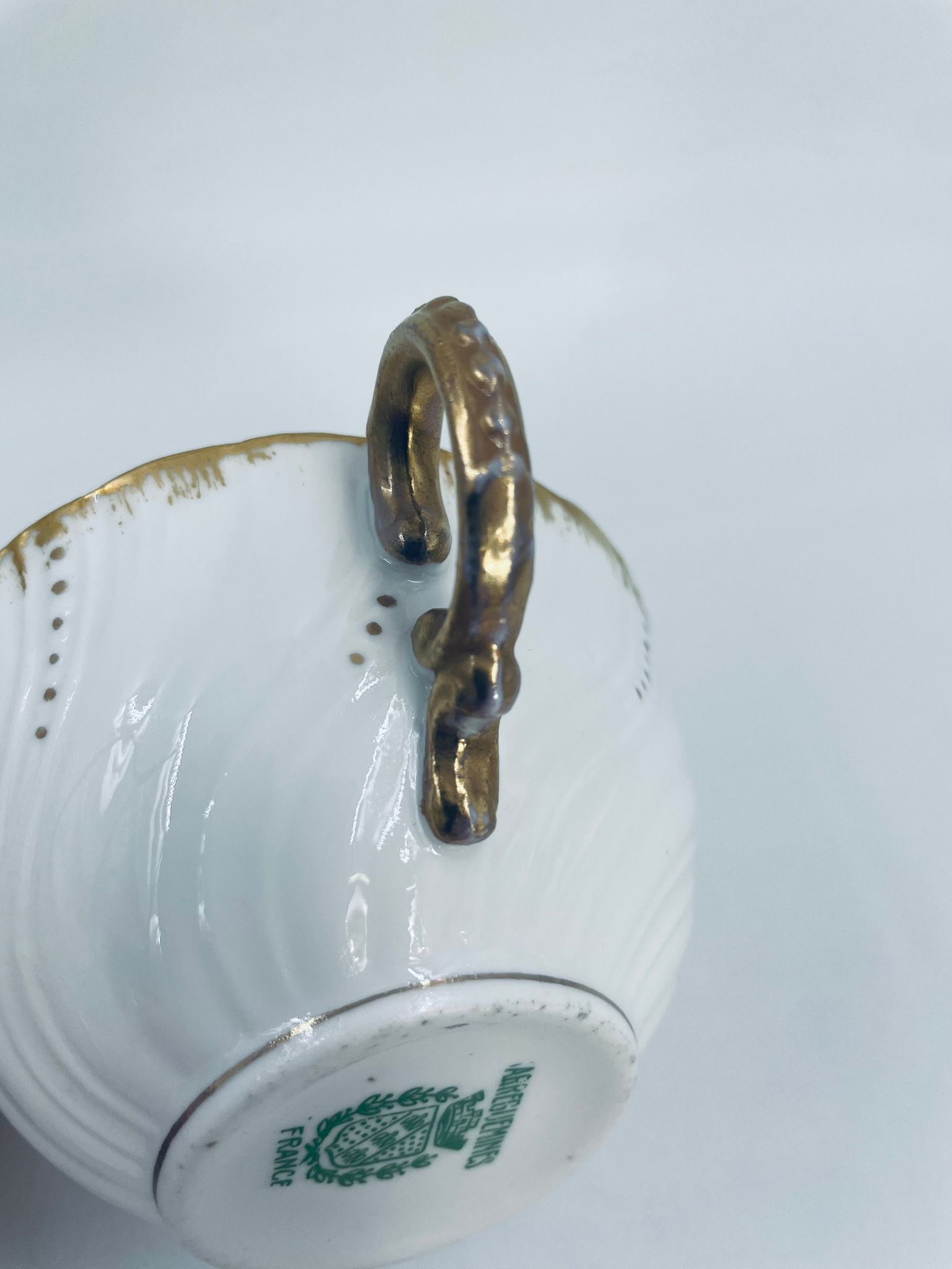 Filiżanka kolekcjonerska w zestawie trio francuskiej wytwórni Sarreguemines, wykonana z wysokiej jakości białej porcelany. Zestaw charakteryzuje się klasyczną formą, ozdobiony jest reliefowym wzorem z ręcznie malowanymi złotymi detalami, wykończony złoceniem na falowanym rancie. Posiada przetarcia na złoceniu.