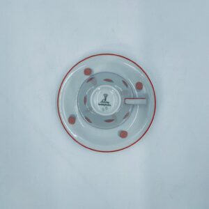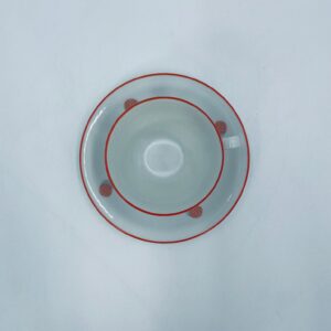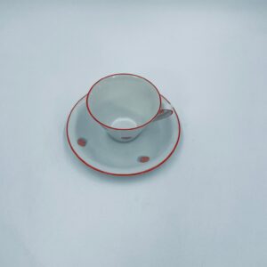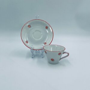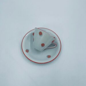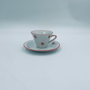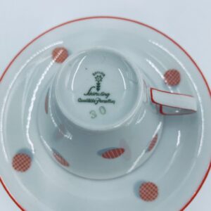 Filiżanka kolekcjonerska w zestawie duo wytwórni Schirnding Qualitats Bavaria z lat 60tych XX wieku, wykonana z wysokiej jakości białej porcelany. Zestaw charakteryzuje się delikatnym zdobieniem małych, pomarańczowych kółek, które tworzą efekt kratki oraz pomarańczowym zdobieniem na rantach.