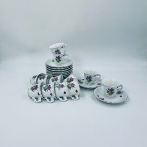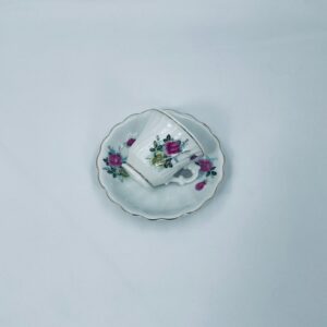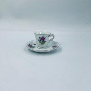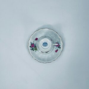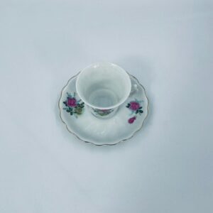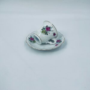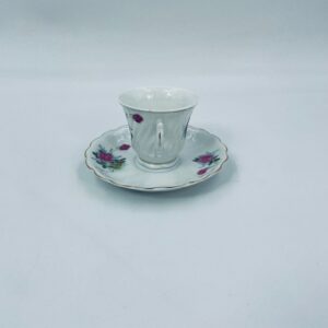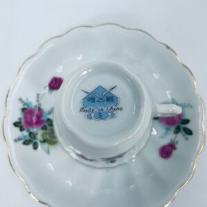Filiżanka kolekcjonerska w zestawie duo wykonana ze starej Chińskiej porcelany w białym kolorze. Zestaw charakteryzuje się kwiatowym motywem różowych i zielonych róż, wykończony złoceniem na krawędziach. Filiżanka z pięknym, dekoracyjnym uchwytem oraz ozdobną złoconą podstawą, spodek z falowanym rantem. Posiada delikatne przetarcia na złoceniu, mało widoczne.