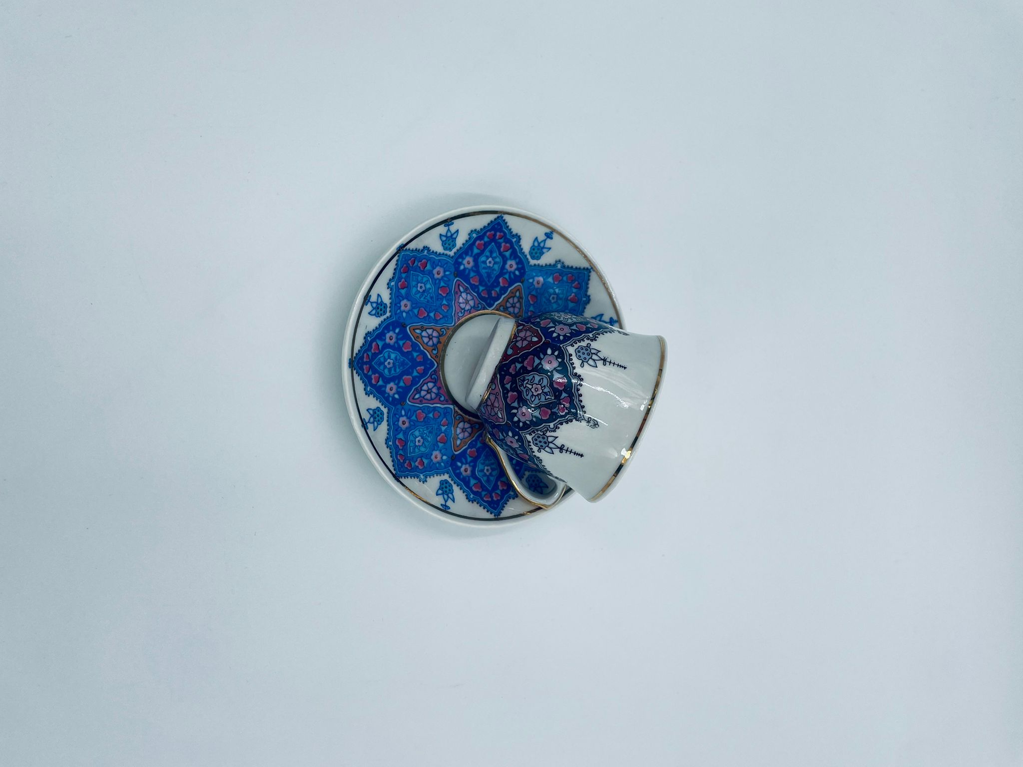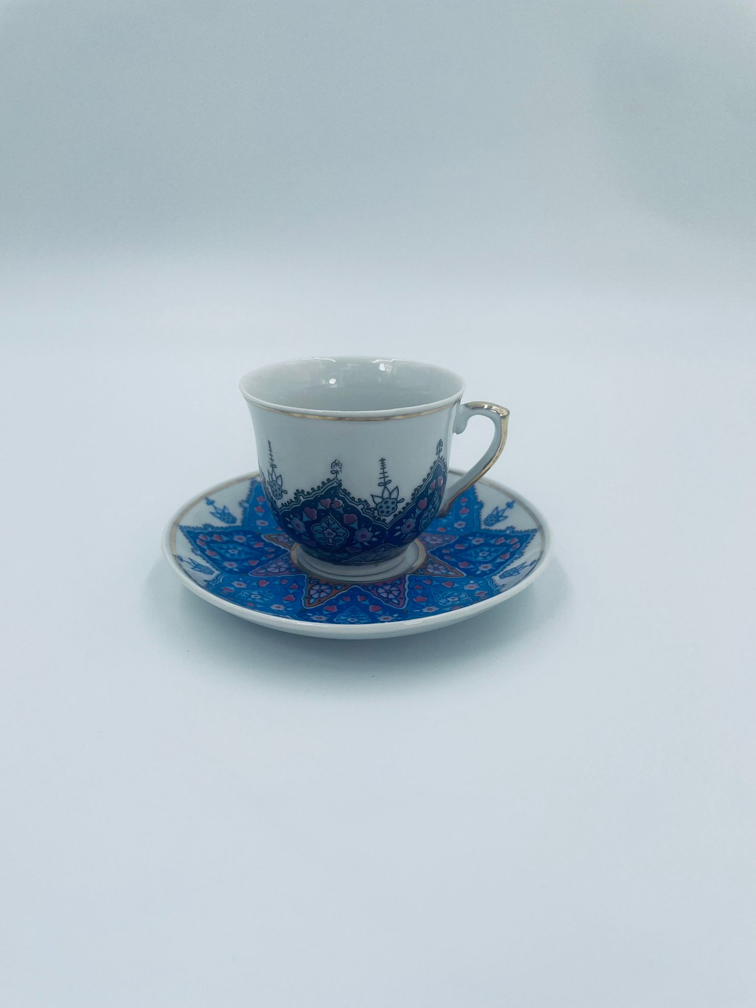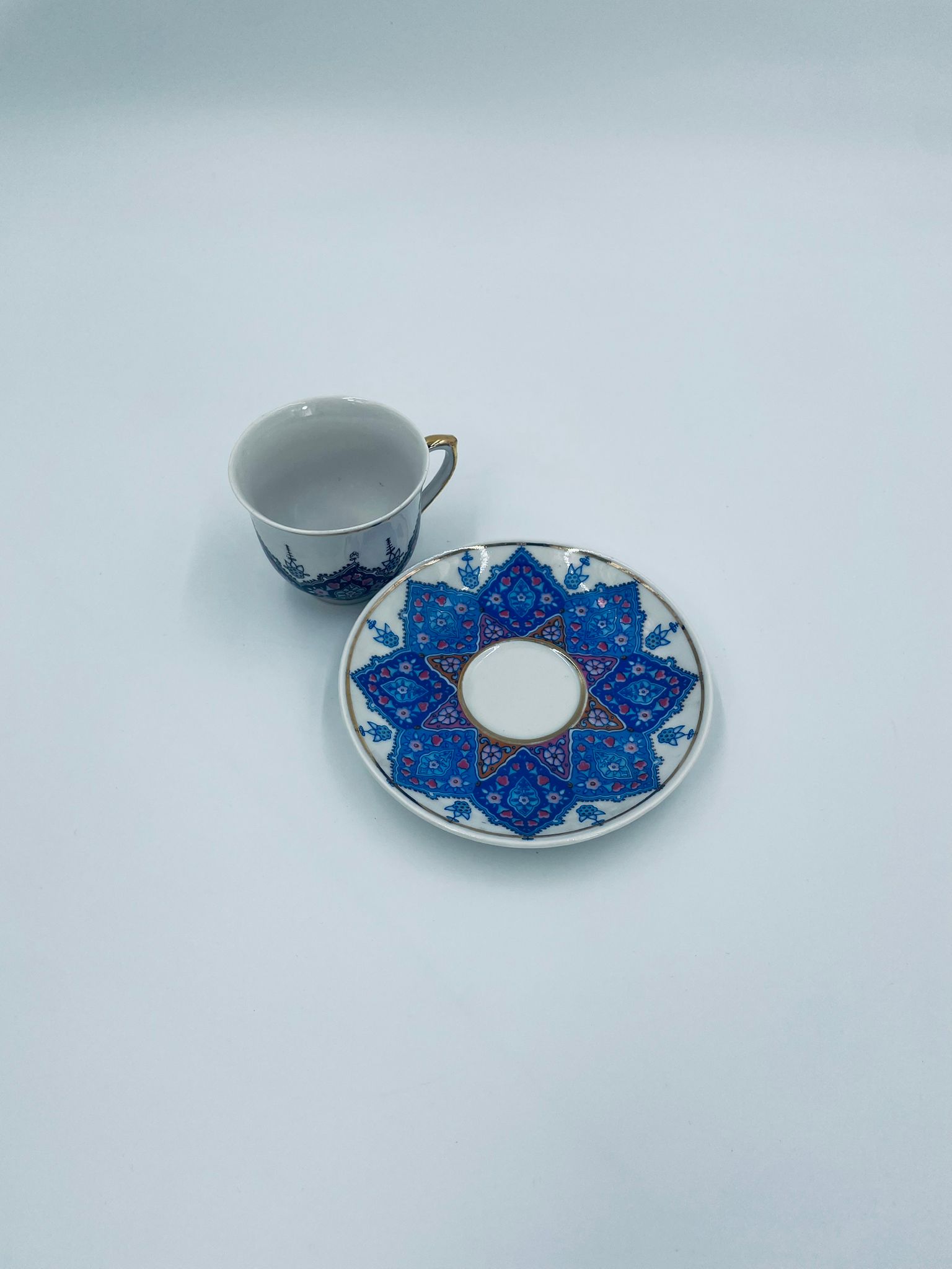 Filiżanka kolekcjonerska turecka w zestawie duo, wytwórni Kutahya Porselen , wykonana z wysokiej jakości białej porcelany. Zestaw charakteryzuje się bogatymi, orientalnymi, niebieskimi wzorami oraz złotymi zdobieniami. Posiada delikatne przetarcie na złoceniu.