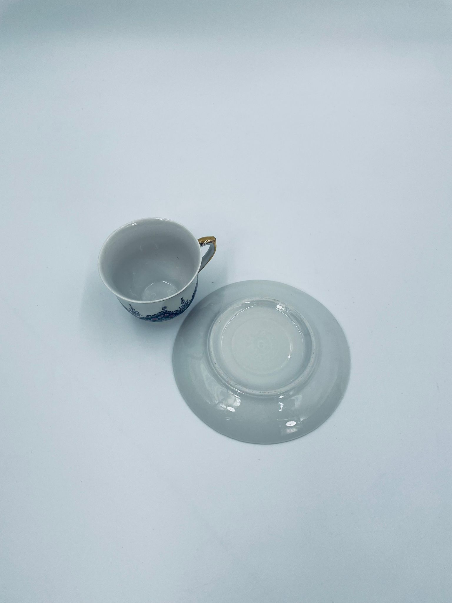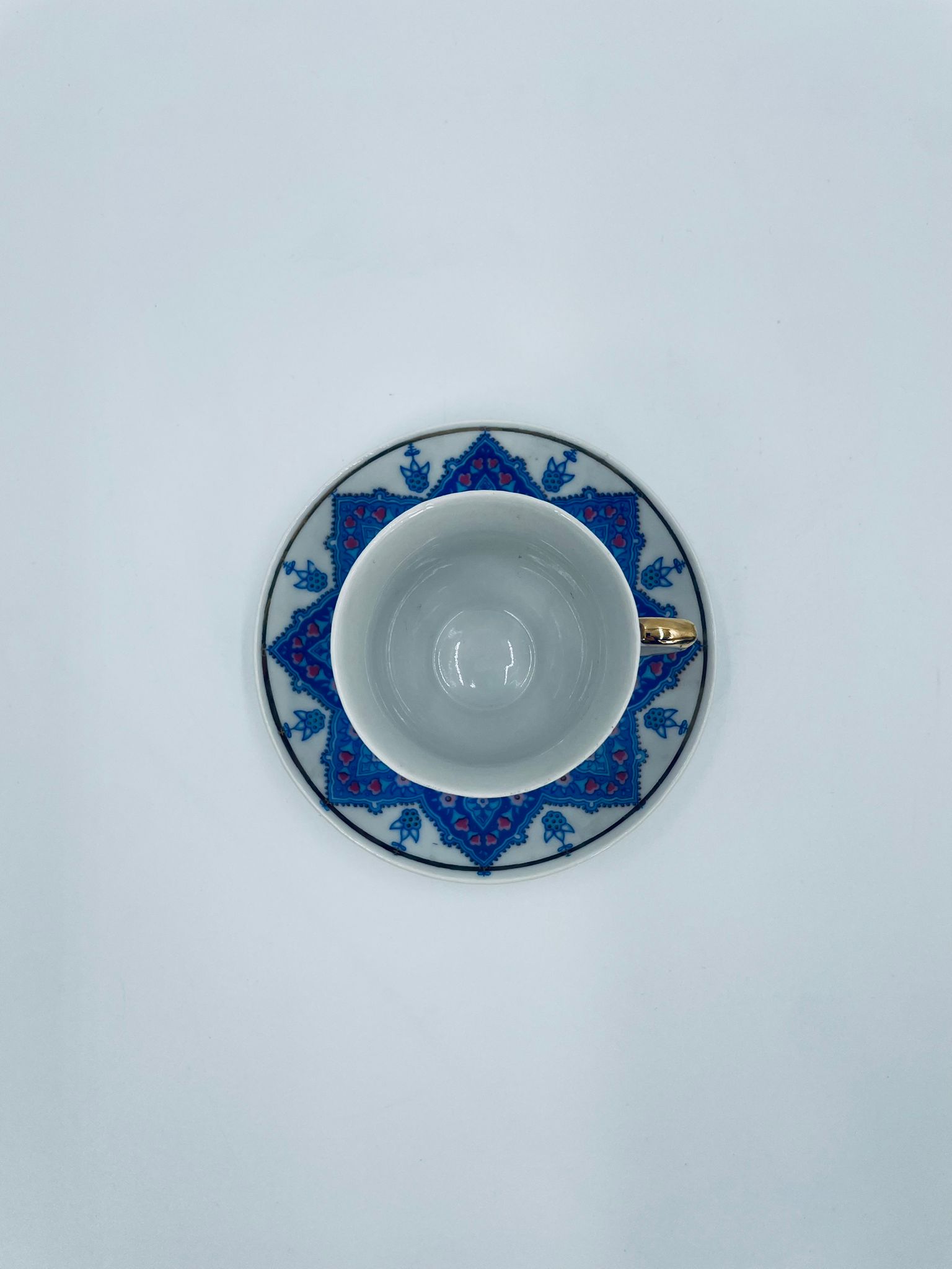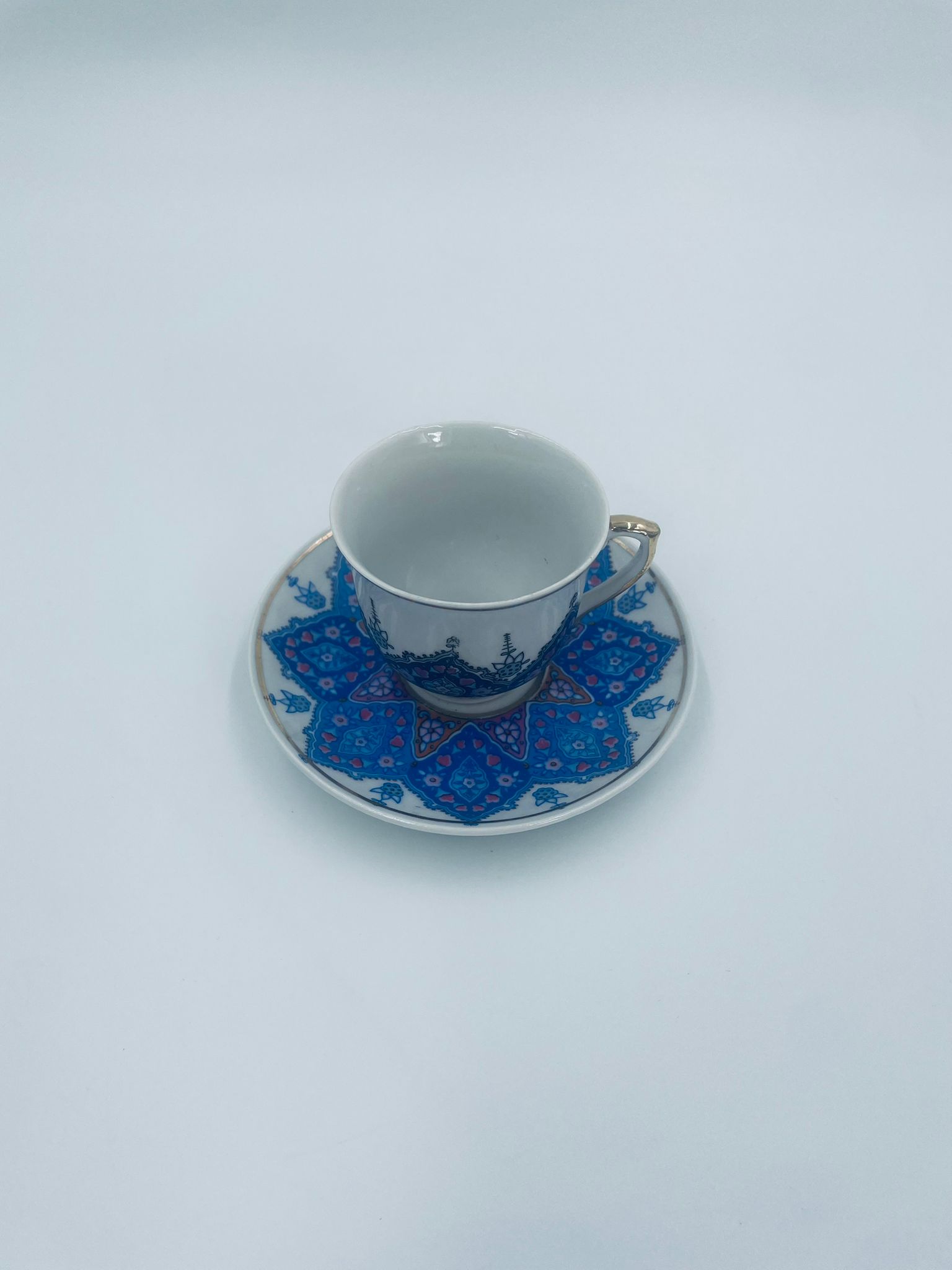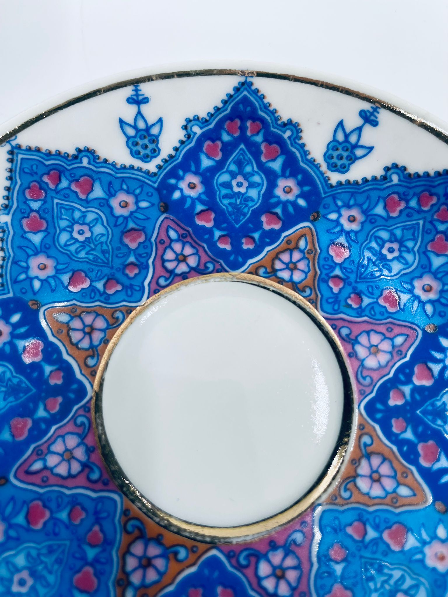 Filiżanka kolekcjonerska turecka w zestawie duo, wytwórni Kutahya Porselen , wykonana z wysokiej jakości białej porcelany. Zestaw charakteryzuje się bogatymi, orientalnymi, niebieskimi wzorami oraz złotymi zdobieniami. Posiada delikatne przetarcie na złoceniu.