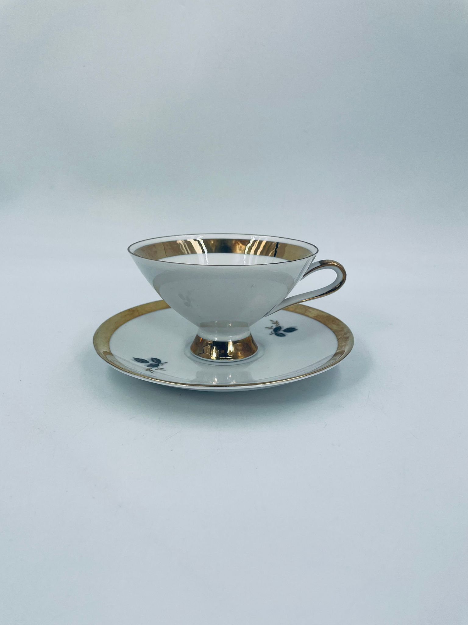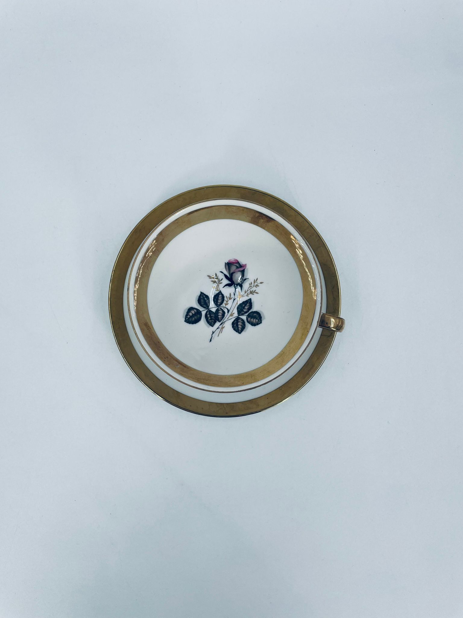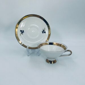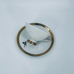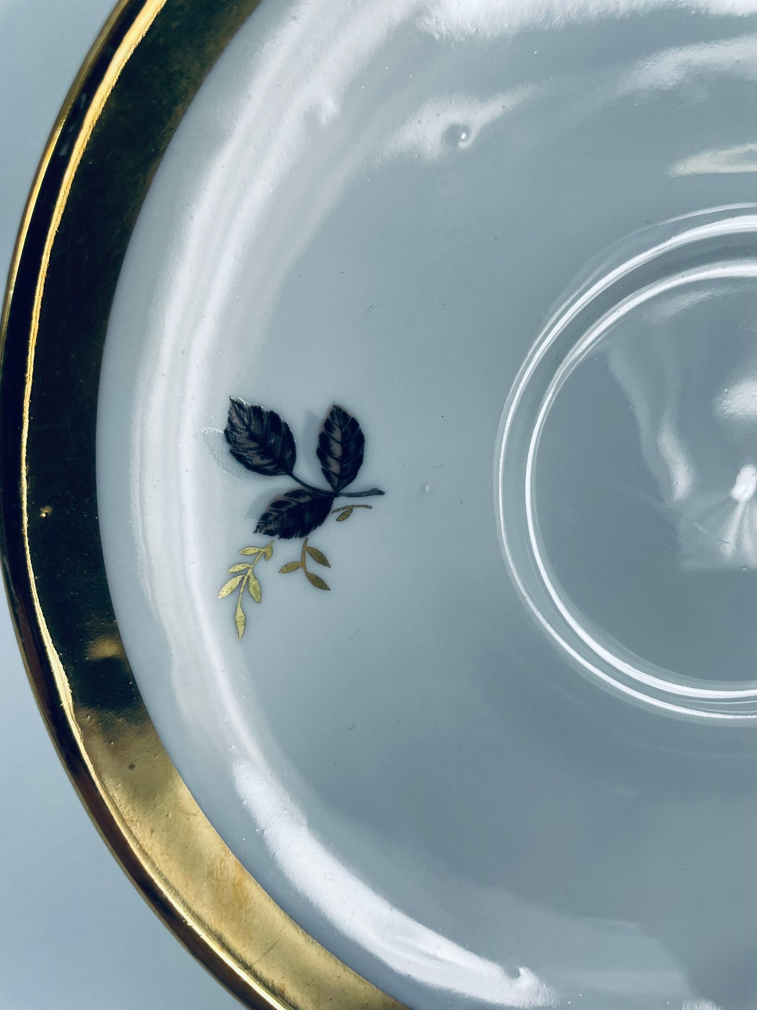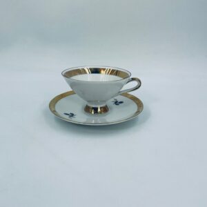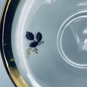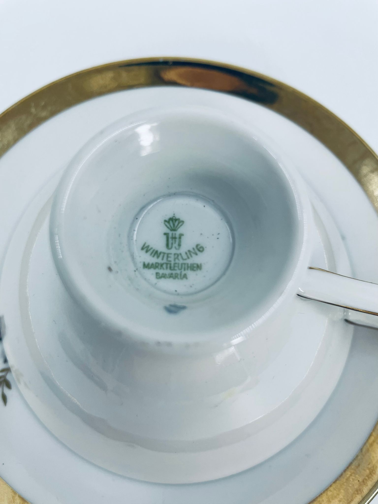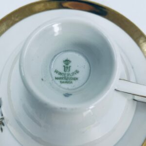 Filiżanka kolekcjonerska w zestawie duo wytwórni Winterling Marktleuthen, wykonana z wysokiej jakości białej porcelany. Zestaw charakteryzuje się bogatymi złoceniami na krawędziach oraz motywem róży w środku filiżanki i listkami na spodku. Posiada małe przetarcie na złoceniu.