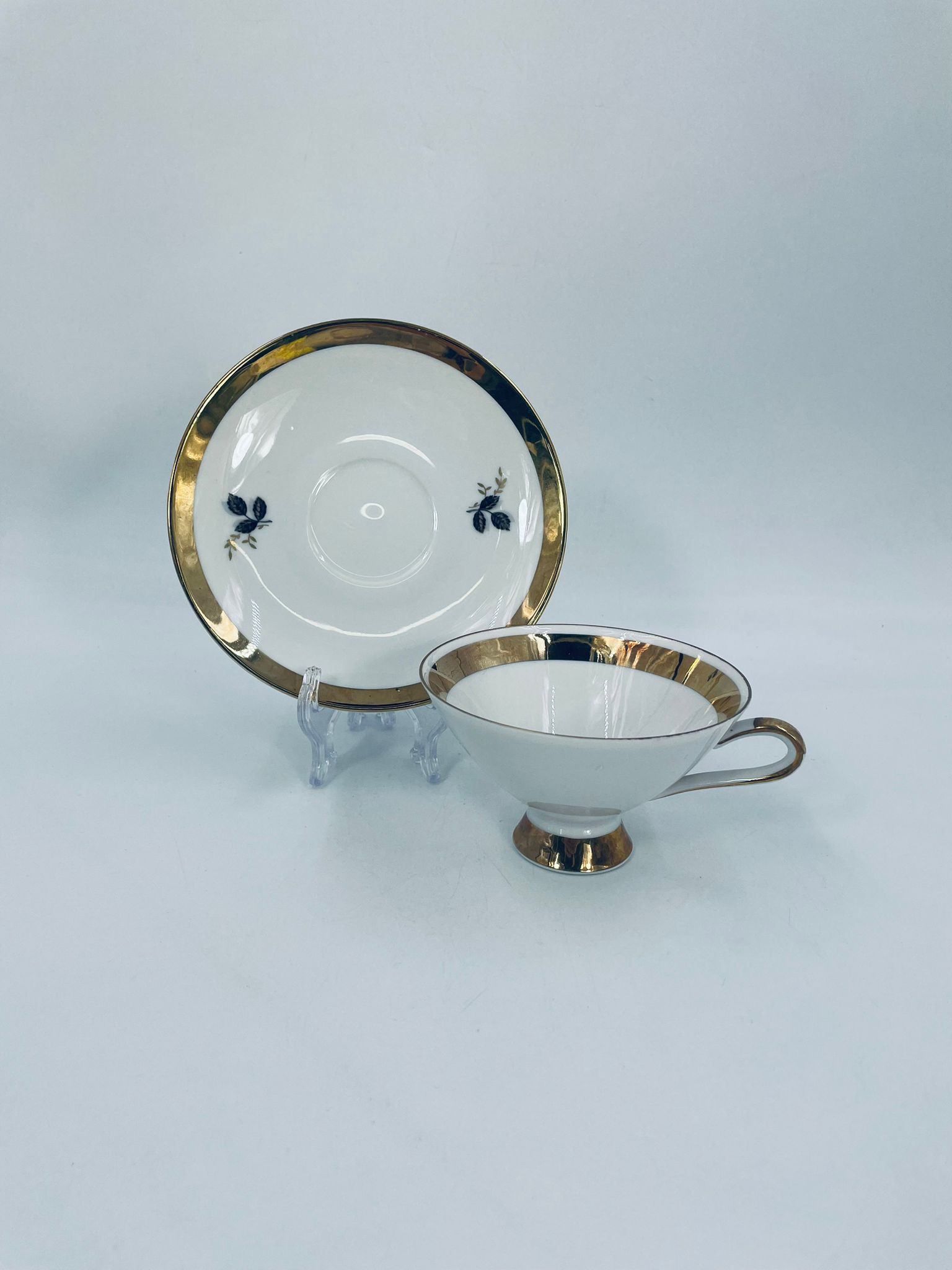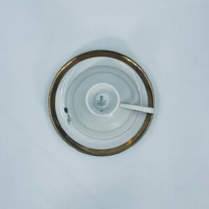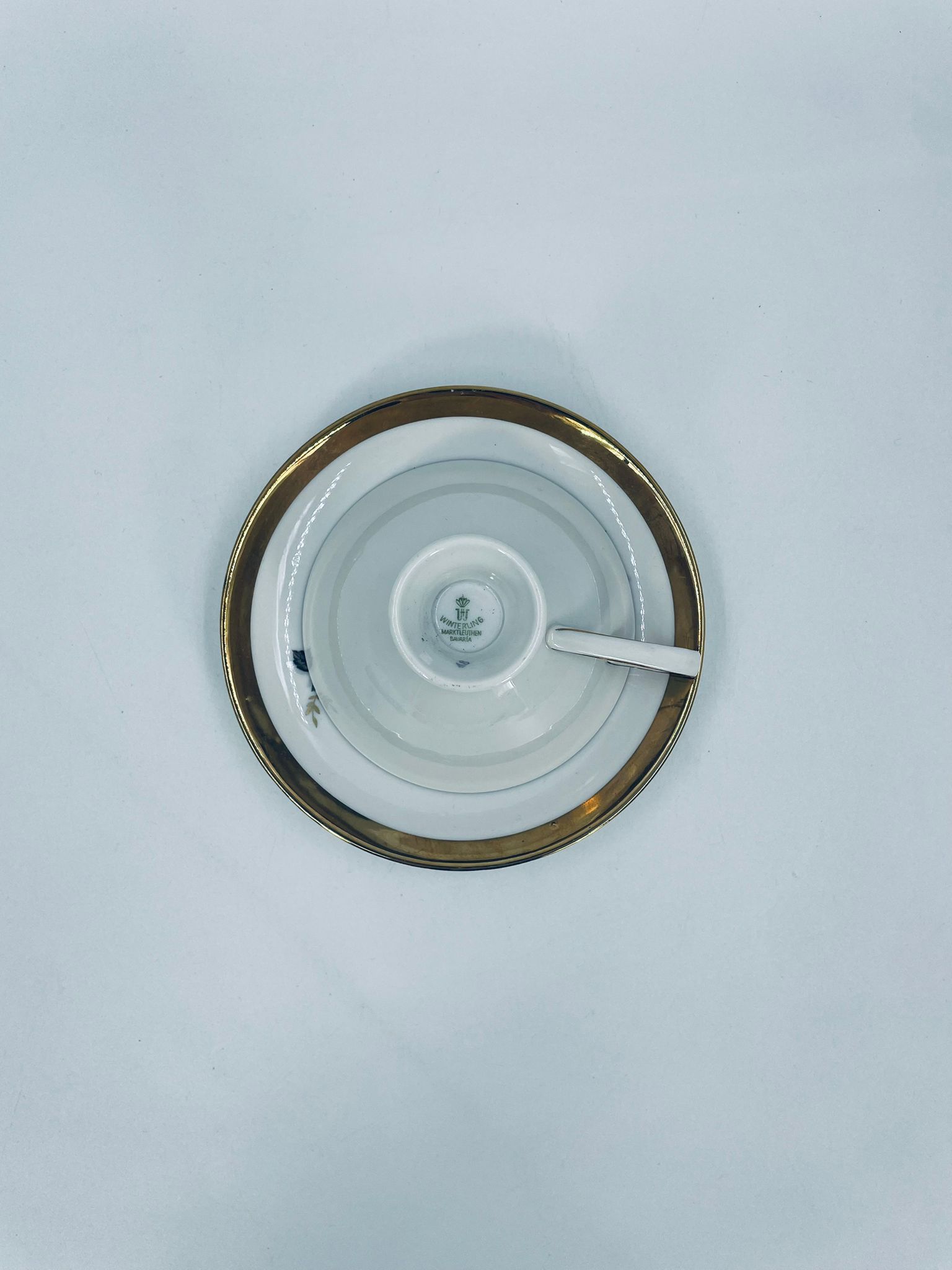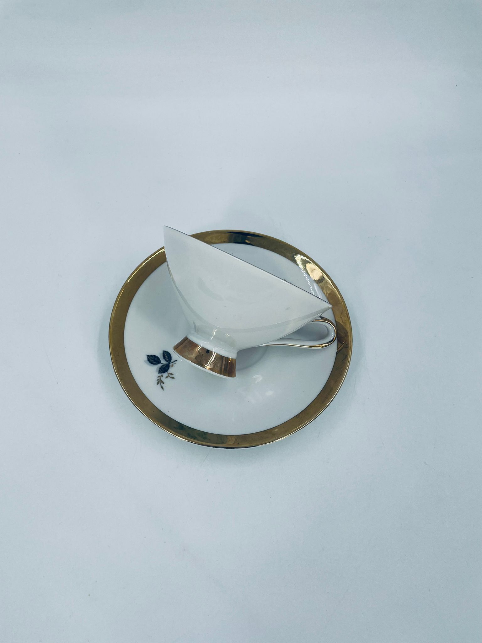 Filiżanka kolekcjonerska w zestawie duo wytwórni Winterling Marktleuthen, wykonana z wysokiej jakości białej porcelany. Zestaw charakteryzuje się bogatymi złoceniami na krawędziach oraz motywem róży w środku filiżanki i listkami na spodku. Posiada małe przetarcie na złoceniu.