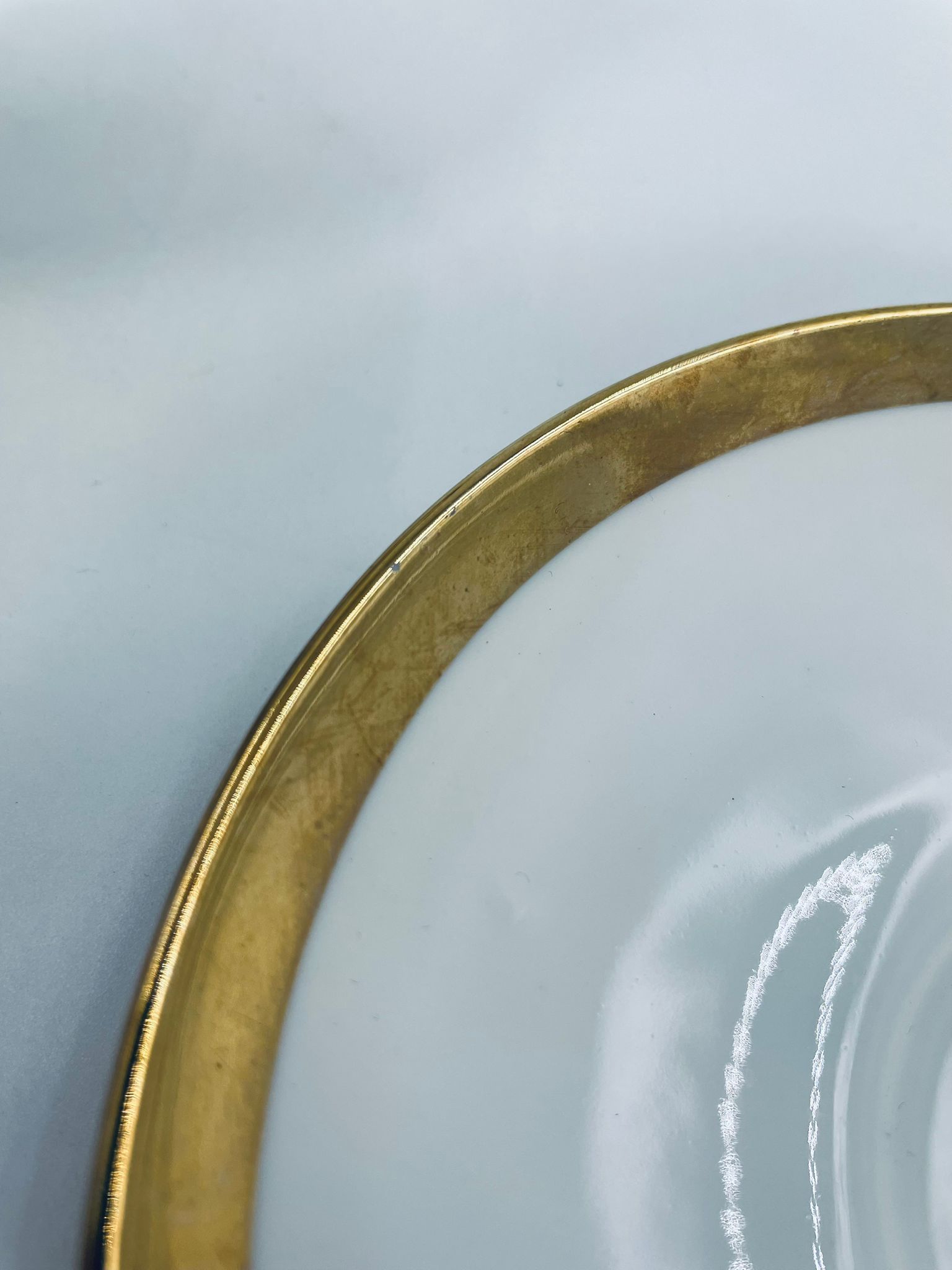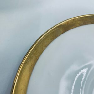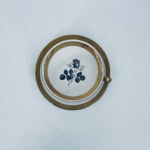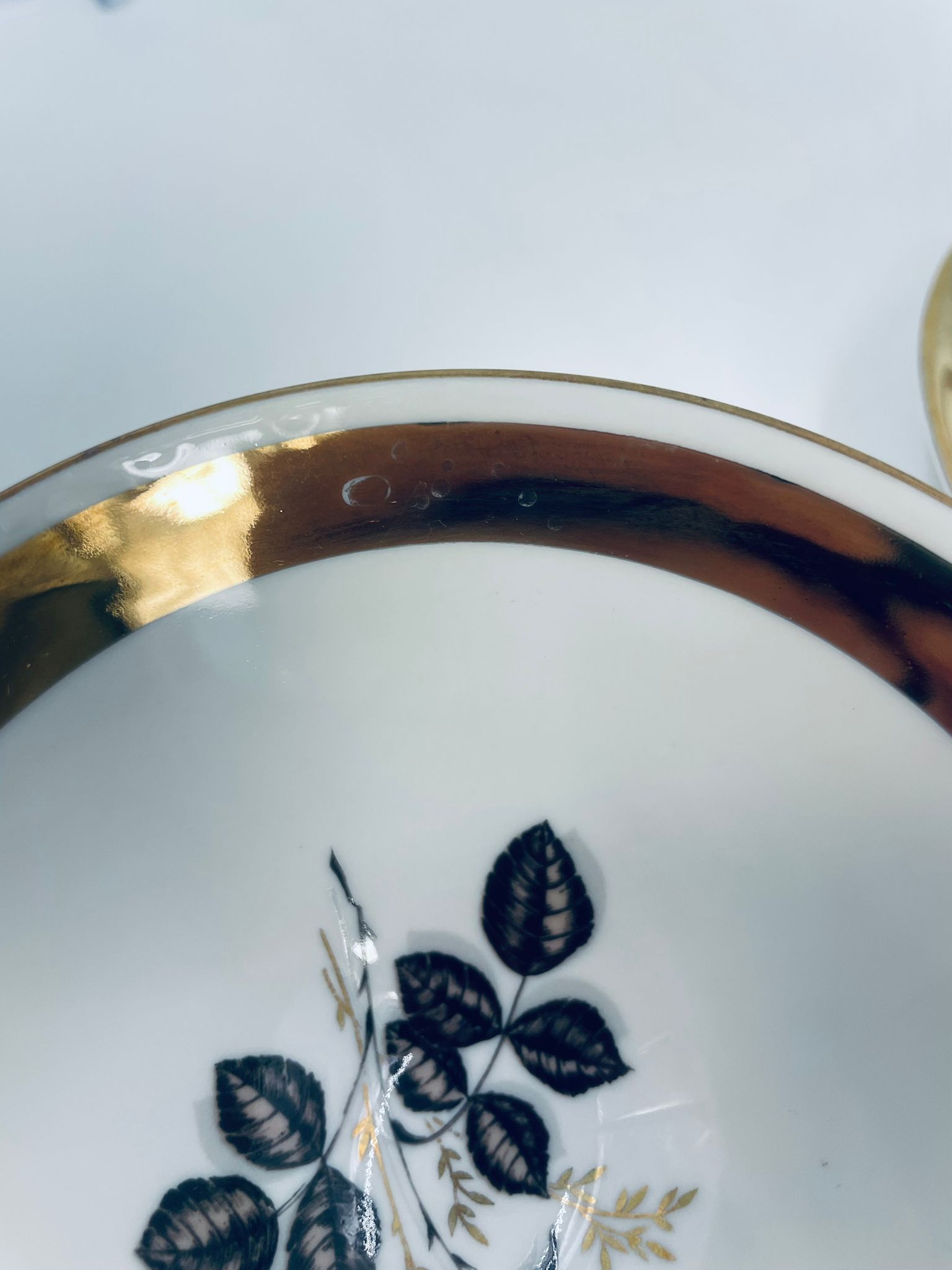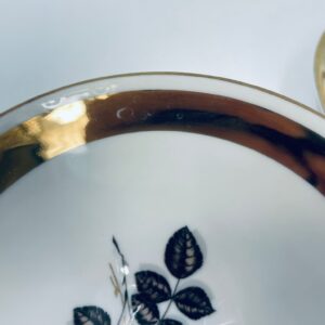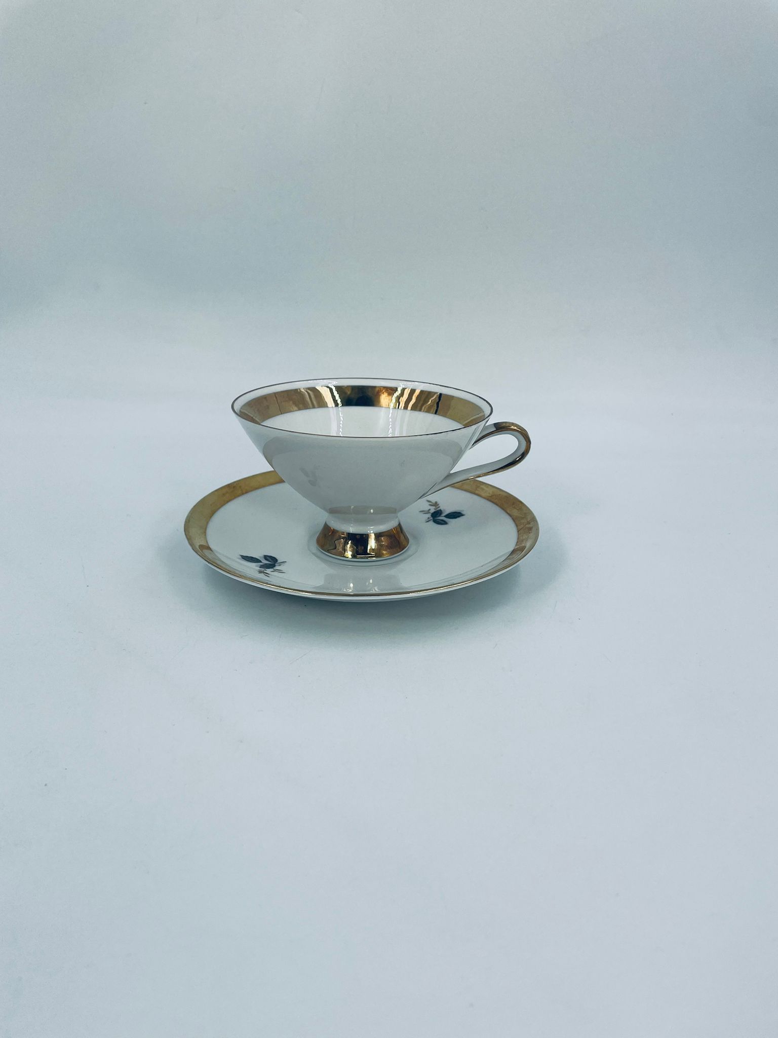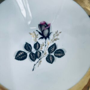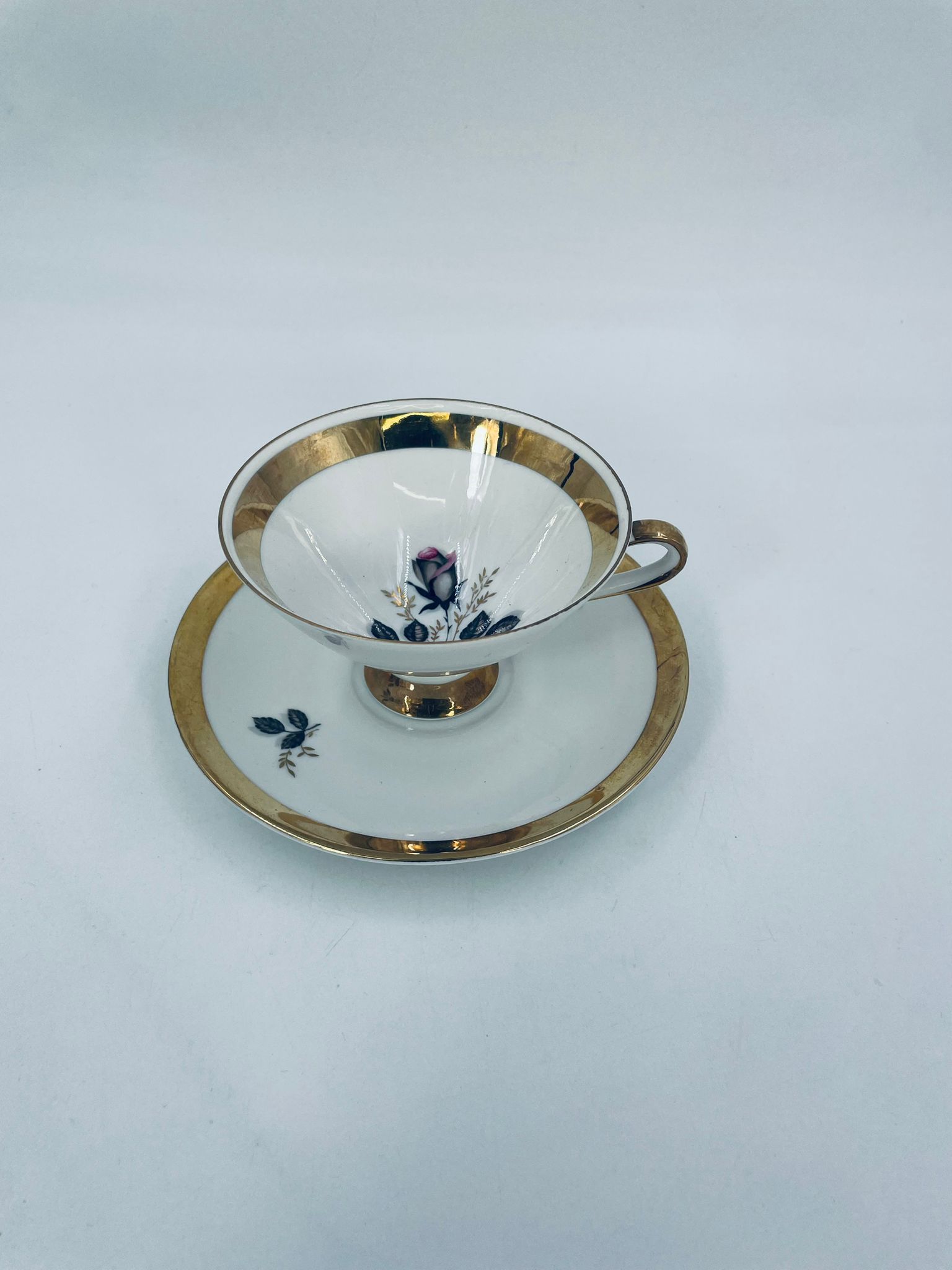 Filiżanka kolekcjonerska w zestawie duo wytwórni Winterling Marktleuthen, wykonana z wysokiej jakości białej porcelany. Zestaw charakteryzuje się bogatymi złoceniami na krawędziach oraz motywem róży w środku filiżanki i listkami na spodku. Posiada małe przetarcie na złoceniu.