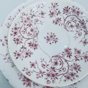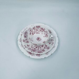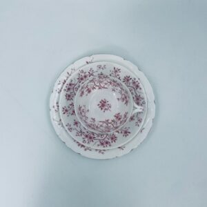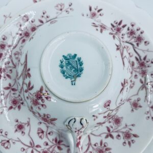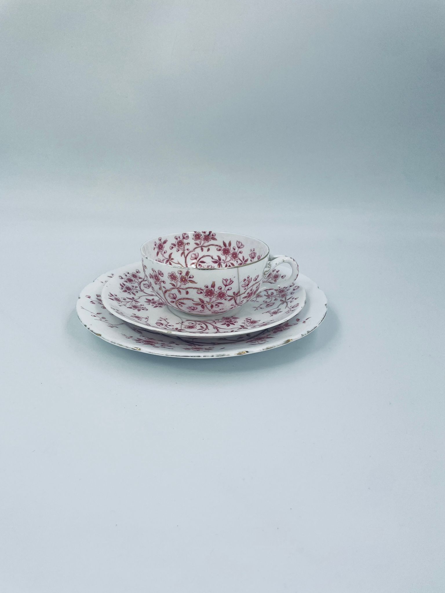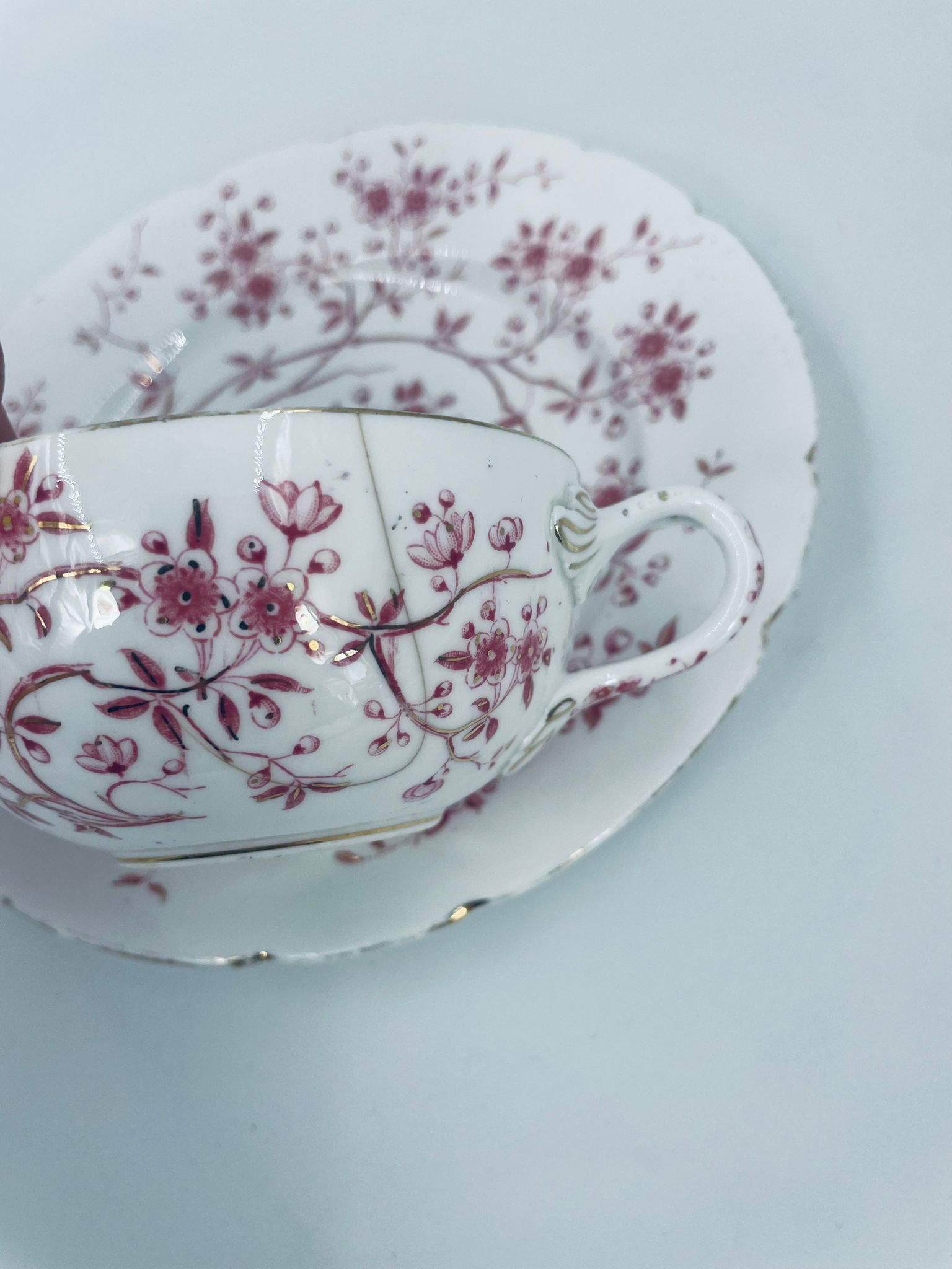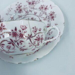 Filiżanka kolekcjonerska zabytkowa w zestawie trio francuskiej manufaktury Sarreguemines, wykonana z wysokiej jakości cienkiej, białej porcelany. Zestaw charakteryzuje się eleganckim kwiatowym wzorem, ozdobnym uchwytem na filiżance oraz złoceniem na rantach. Posiada liczne przetarcia na złoceniu oraz pęknięcia.