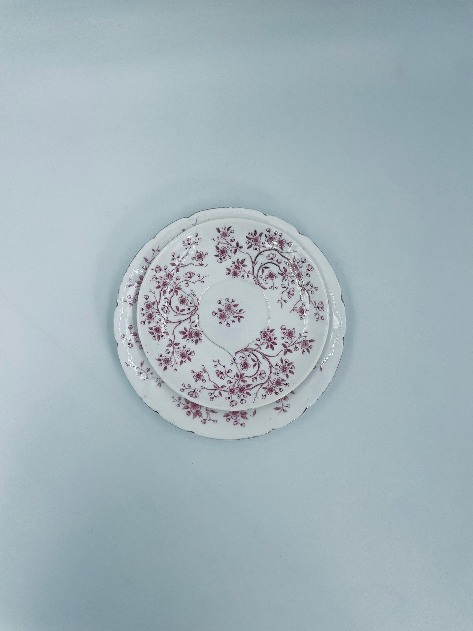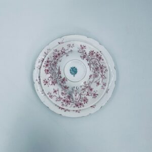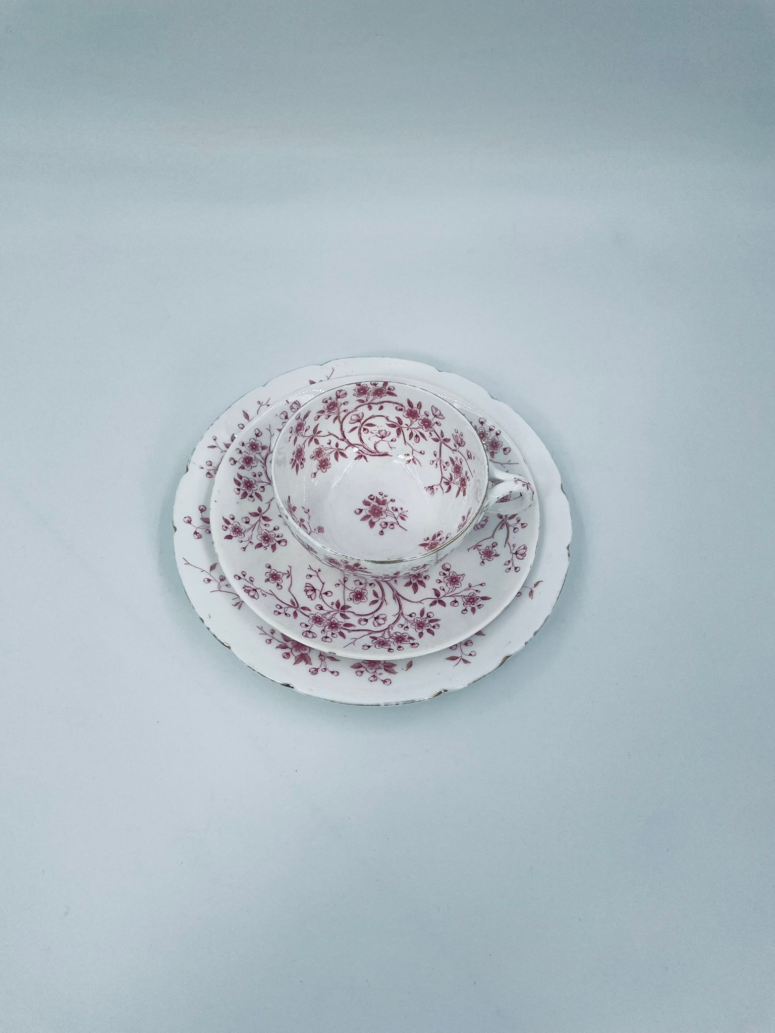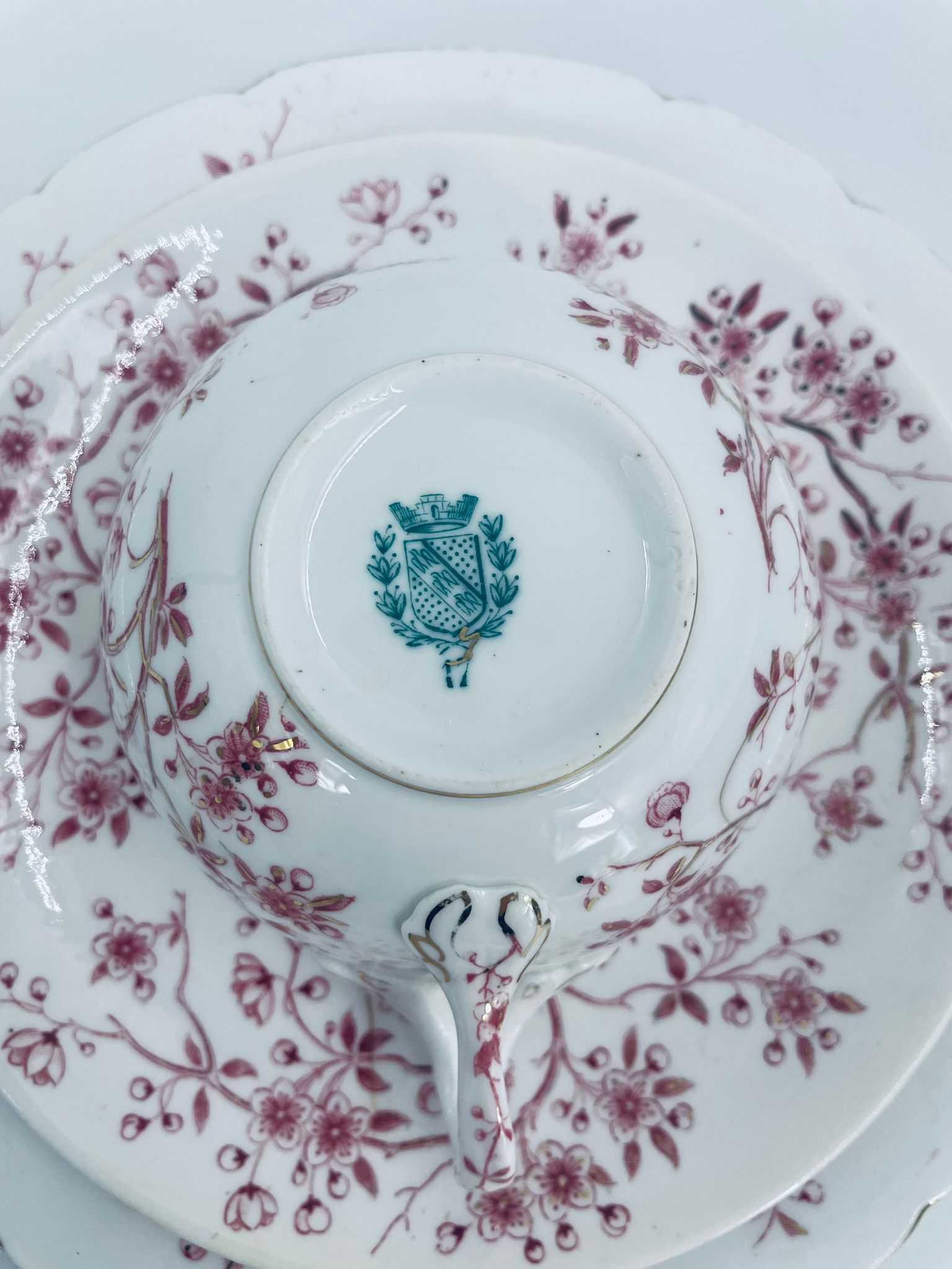 Filiżanka kolekcjonerska zabytkowa w zestawie trio francuskiej manufaktury Sarreguemines, wykonana z wysokiej jakości cienkiej, białej porcelany. Zestaw charakteryzuje się eleganckim kwiatowym wzorem, ozdobnym uchwytem na filiżance oraz złoceniem na rantach. Posiada liczne przetarcia na złoceniu oraz pęknięcia.