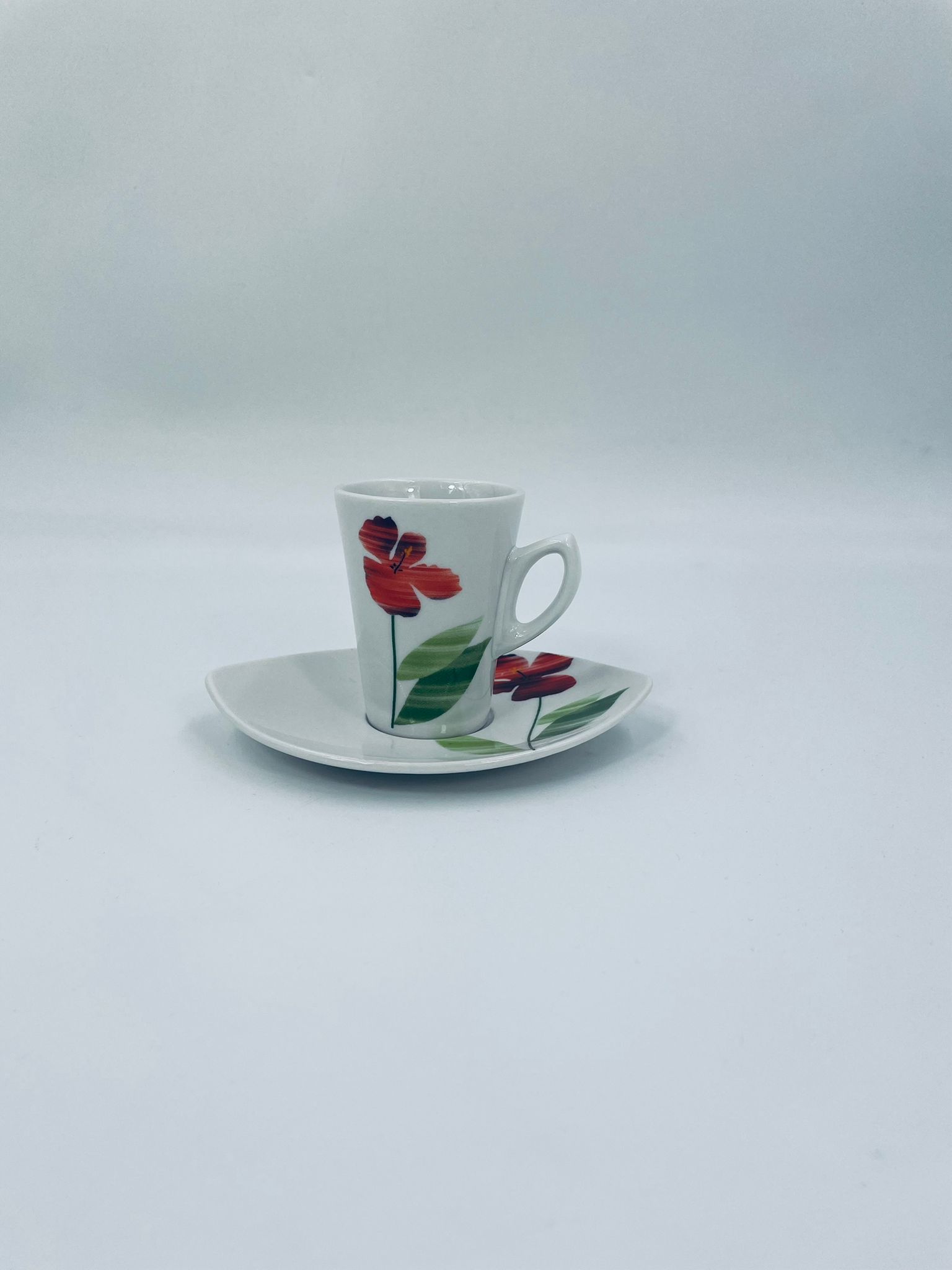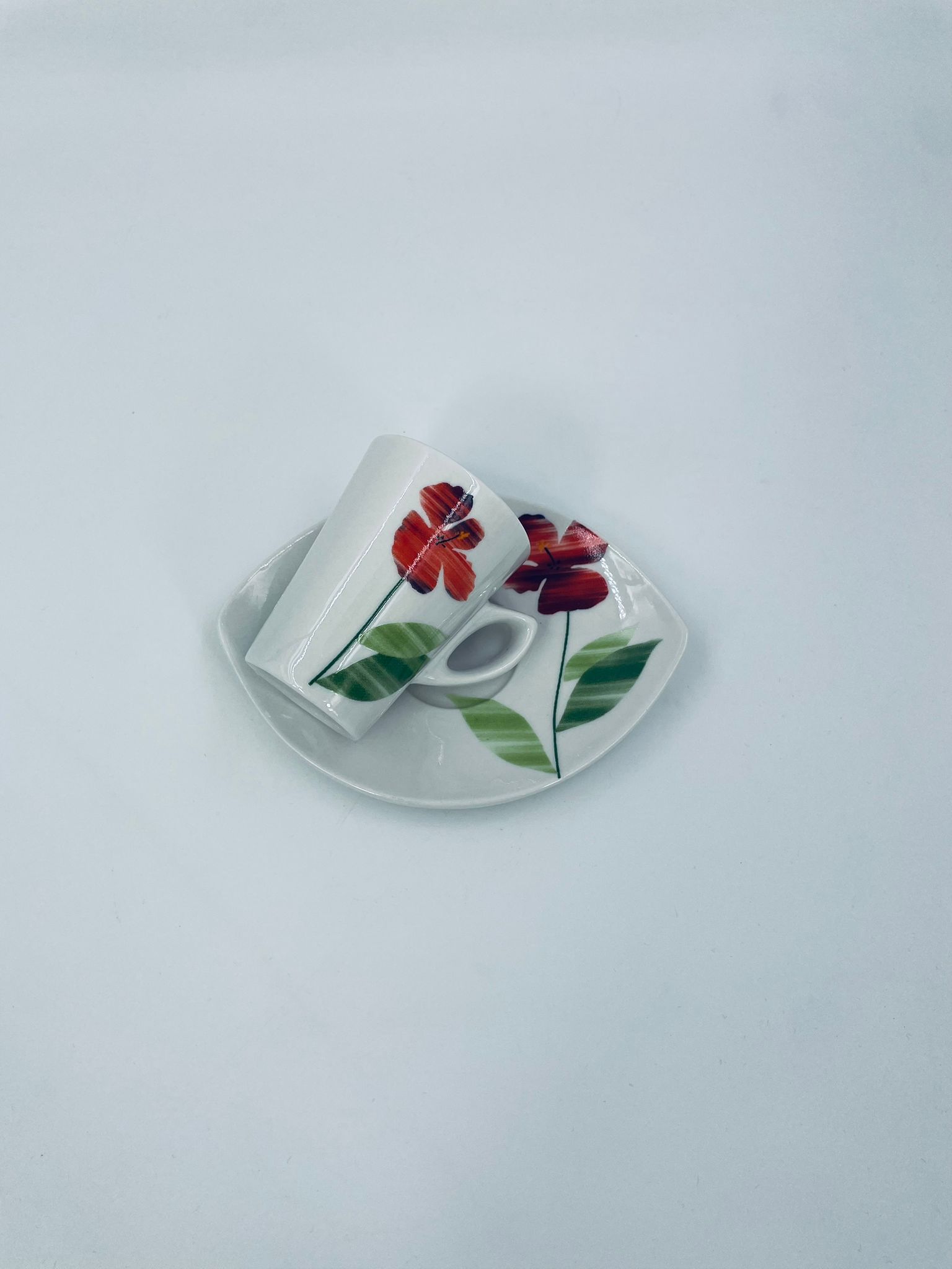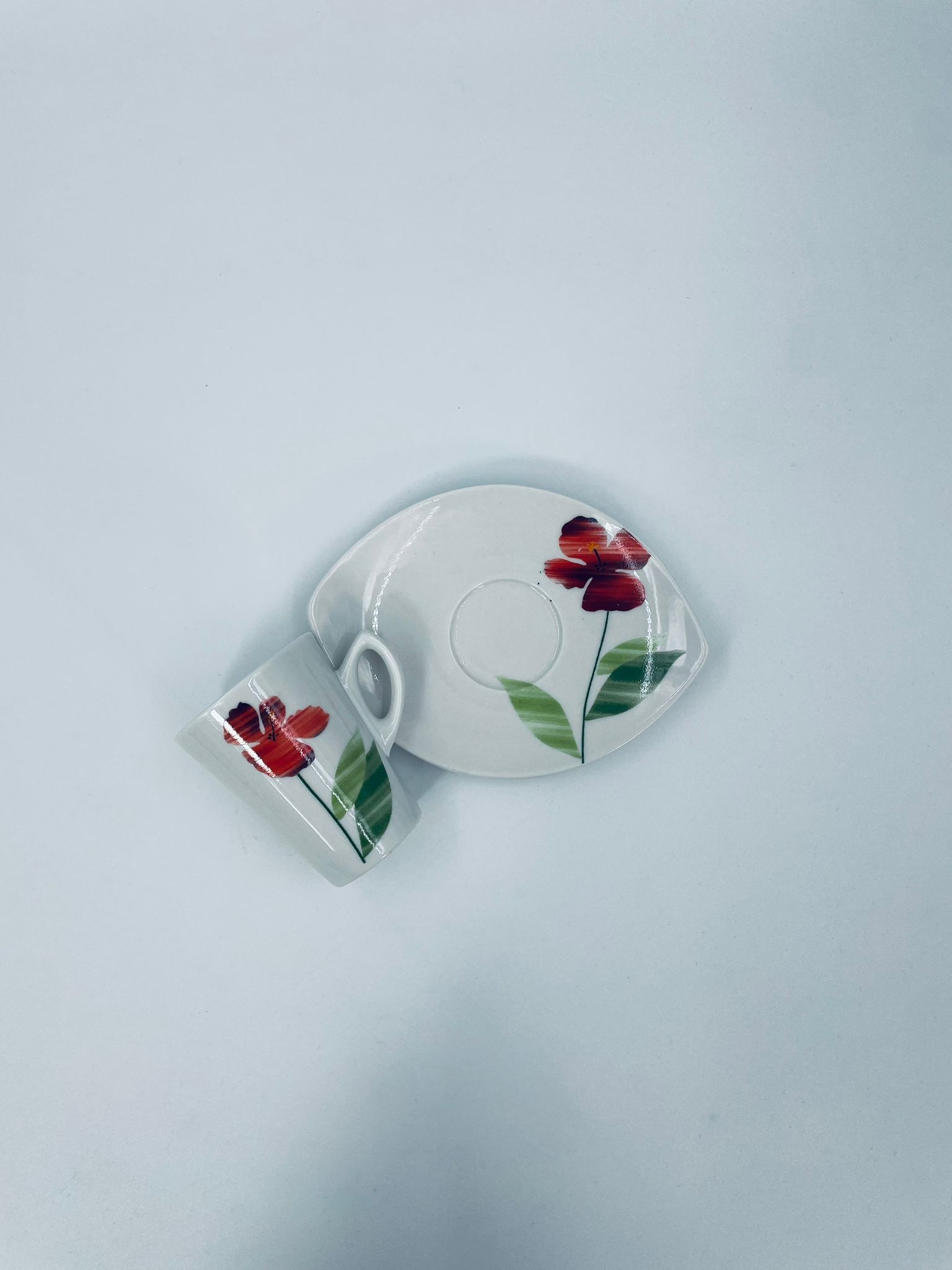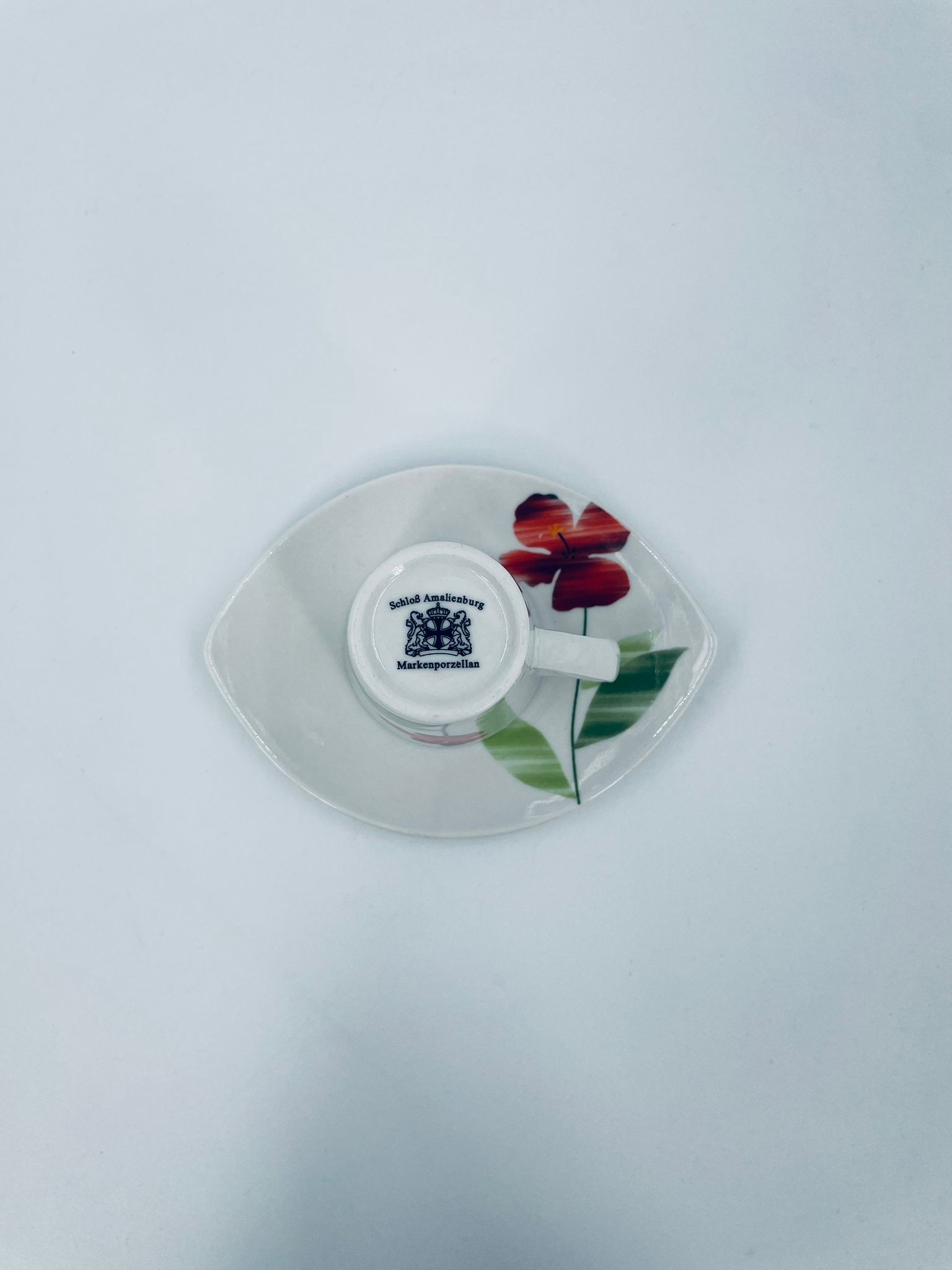 Filiżanka wytwórni Schloss Amelienburg Markenporzellan do espresso, wykonana z białej porcelany z motywem czerwonego kwiata wraz ze spodkiem o nieregularnym kształcie.