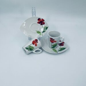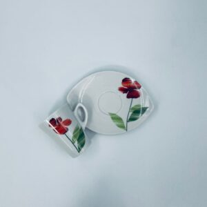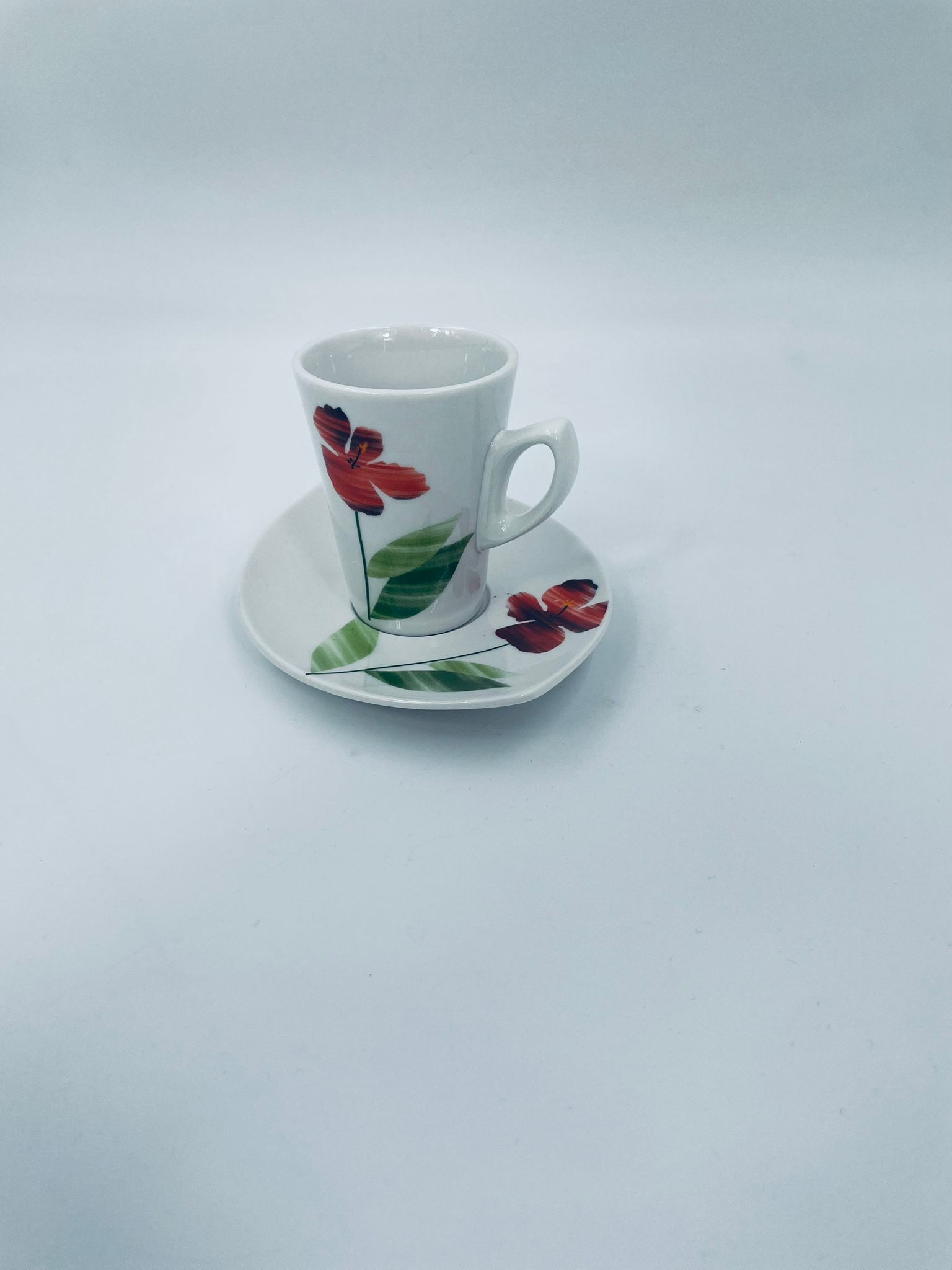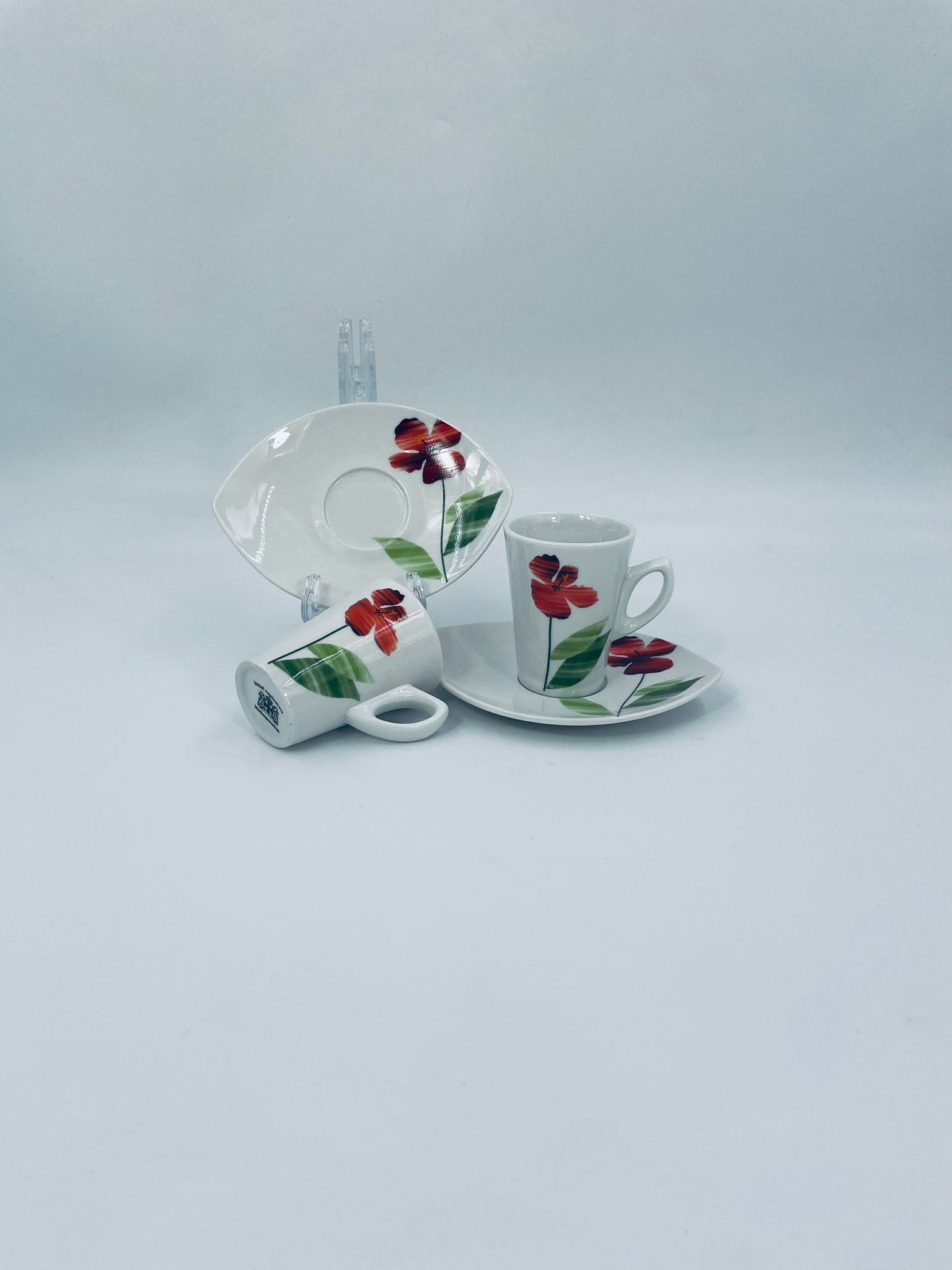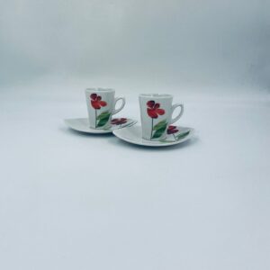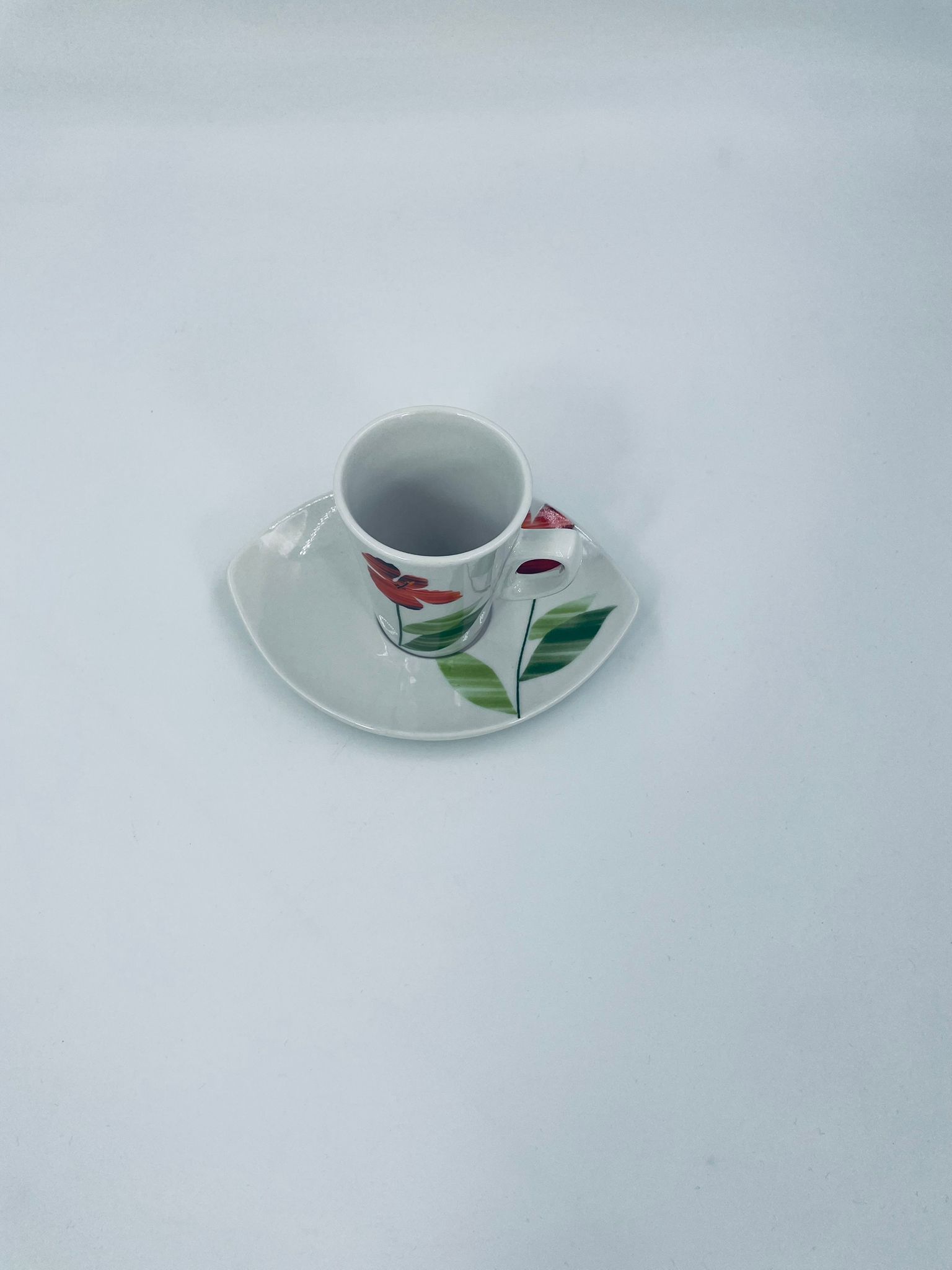 Filiżanka wytwórni Schloss Amelienburg Markenporzellan do espresso, wykonana z białej porcelany z motywem czerwonego kwiata wraz ze spodkiem o nieregularnym kształcie.