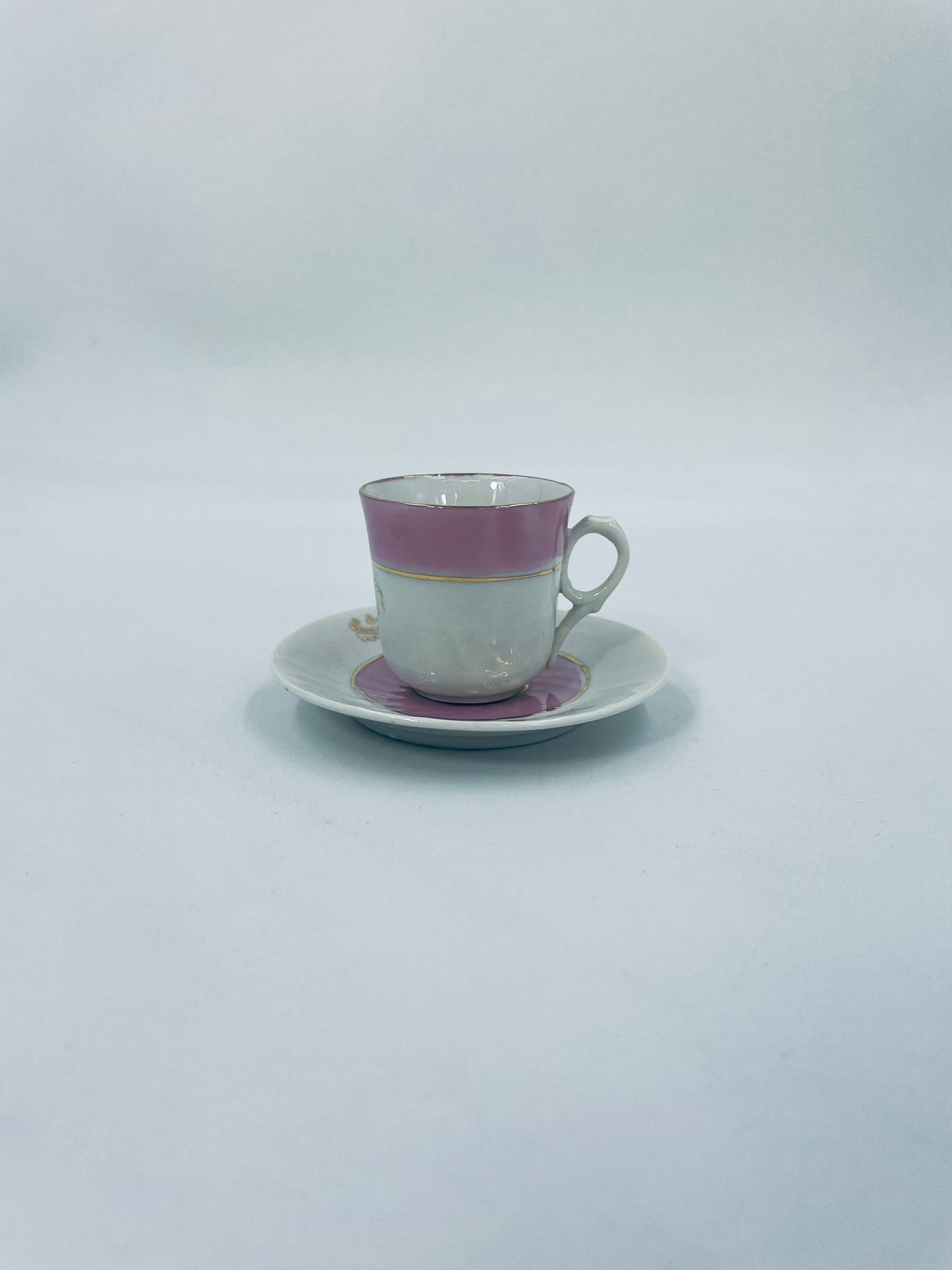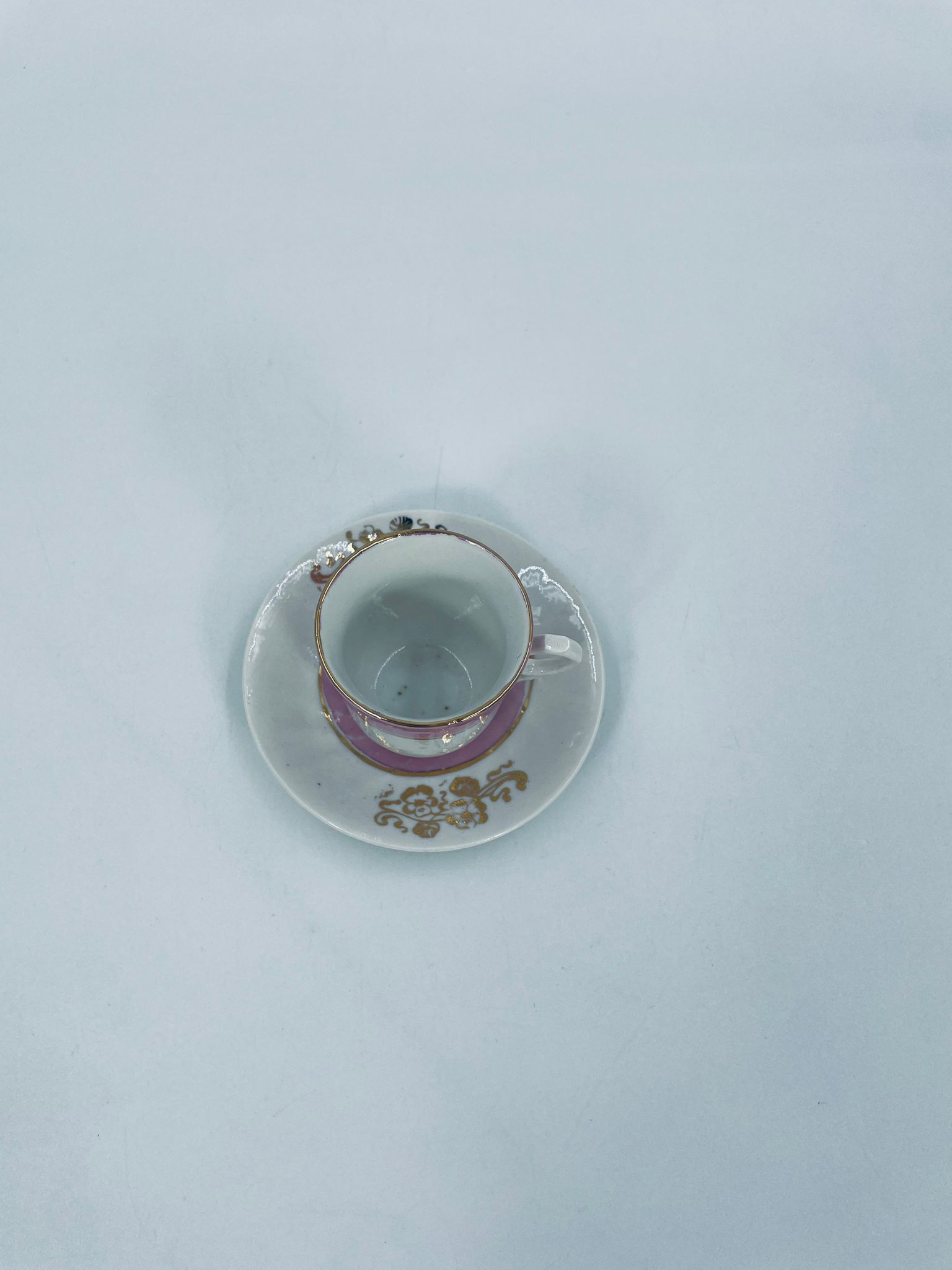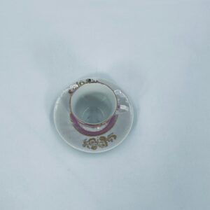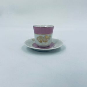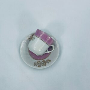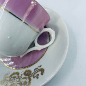 Miniaturowa filiżanka kolekcjonerska w zestwie duo w stylu Vintage, wykonana z wysokiej jakości białej porcelany. Zestaw charakteryzuje się jasnoróżowym pasem, złotymi stylizowanymi zdobieniami kwiatowymi oraz złoceniem na rancie. Posiada przetarcie.