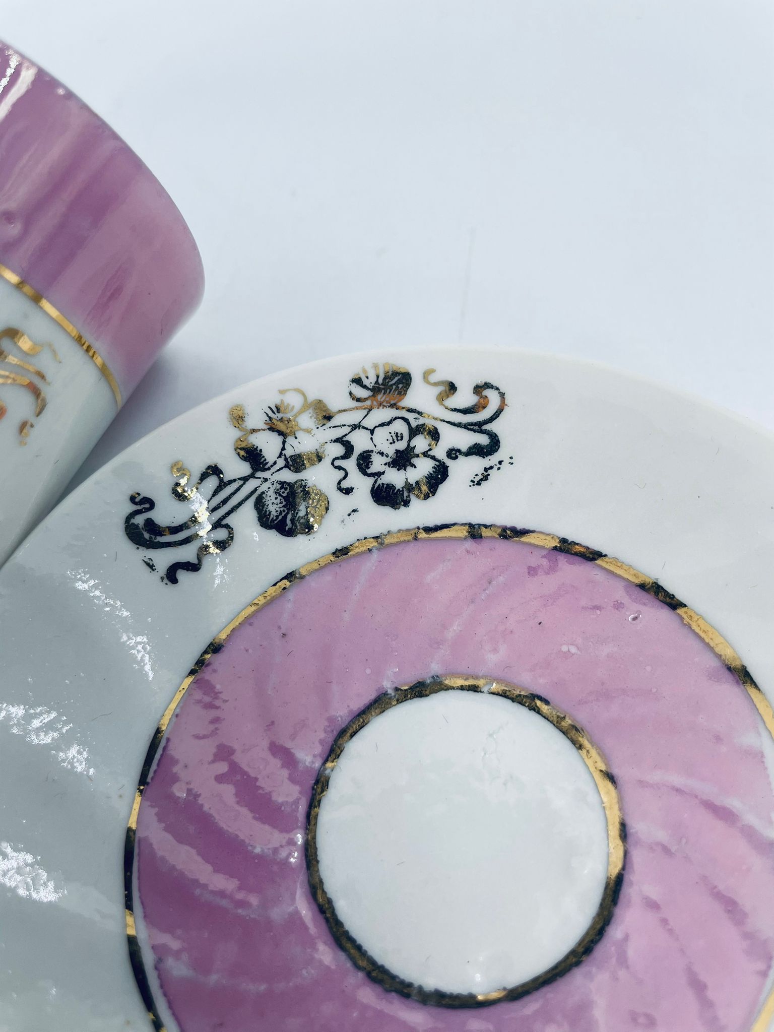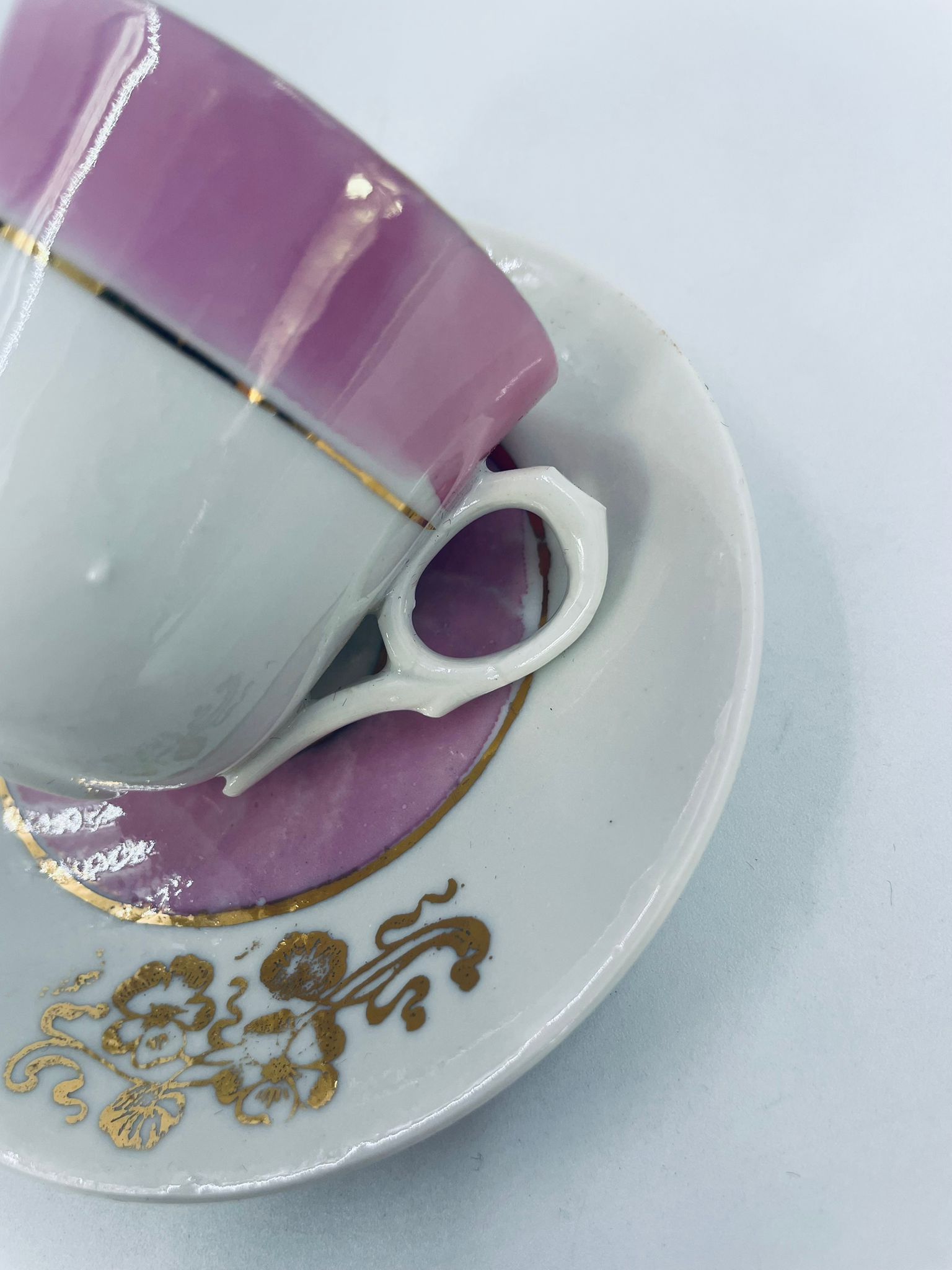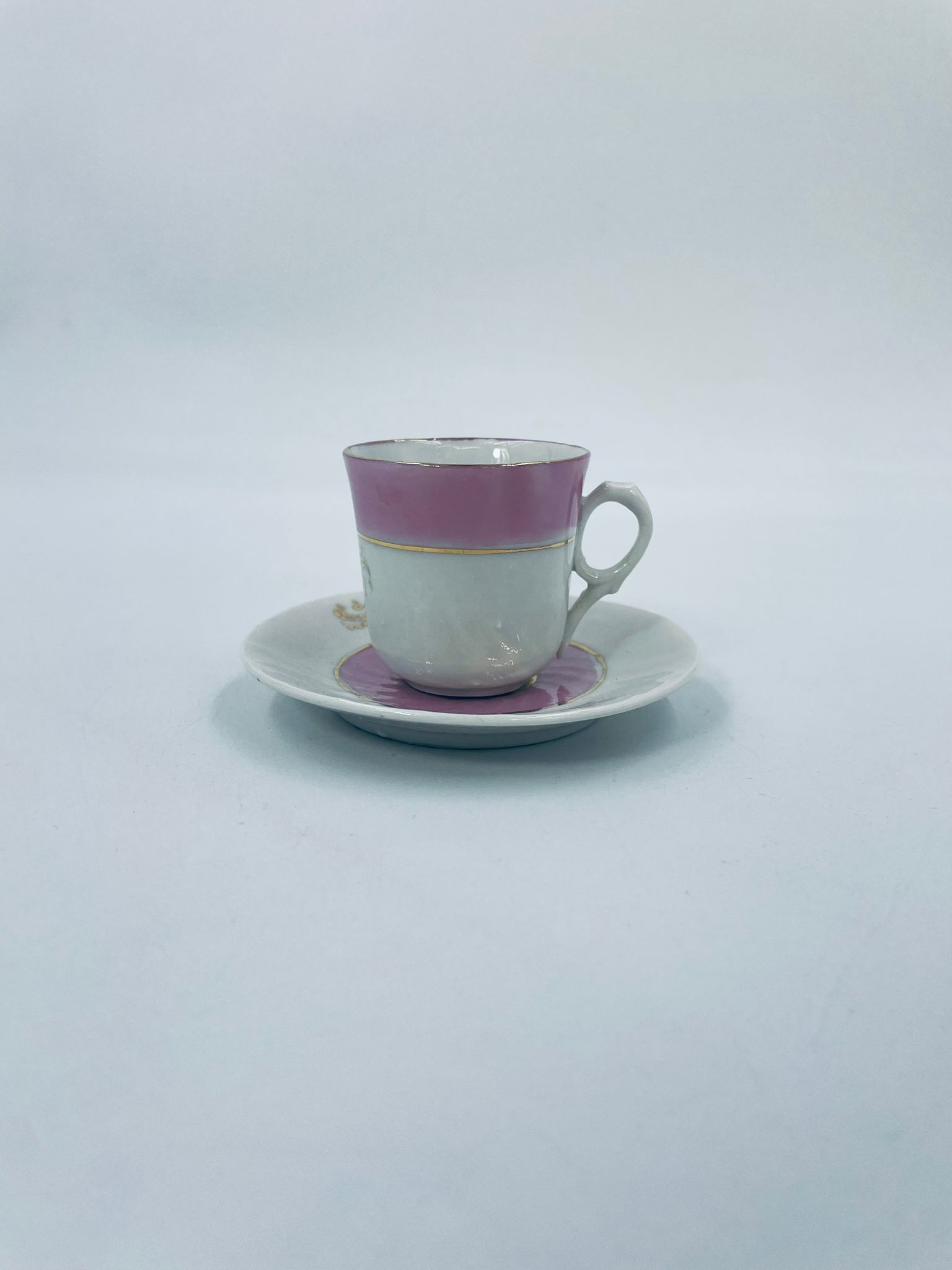 Miniaturowa filiżanka kolekcjonerska w zestwie duo w stylu Vintage, wykonana z wysokiej jakości białej porcelany. Zestaw charakteryzuje się jasnoróżowym pasem, złotymi stylizowanymi zdobieniami kwiatowymi oraz złoceniem na rancie. Posiada przetarcie.