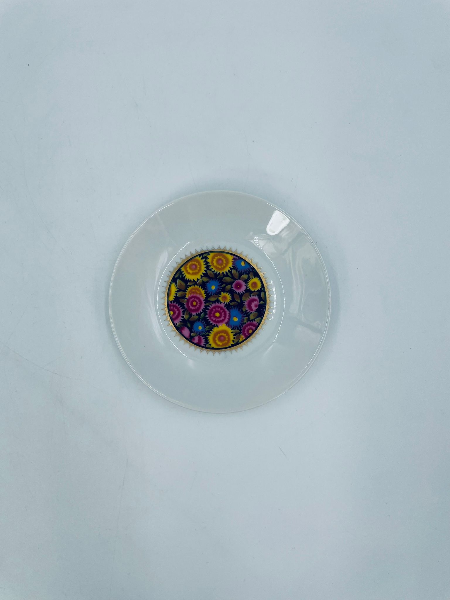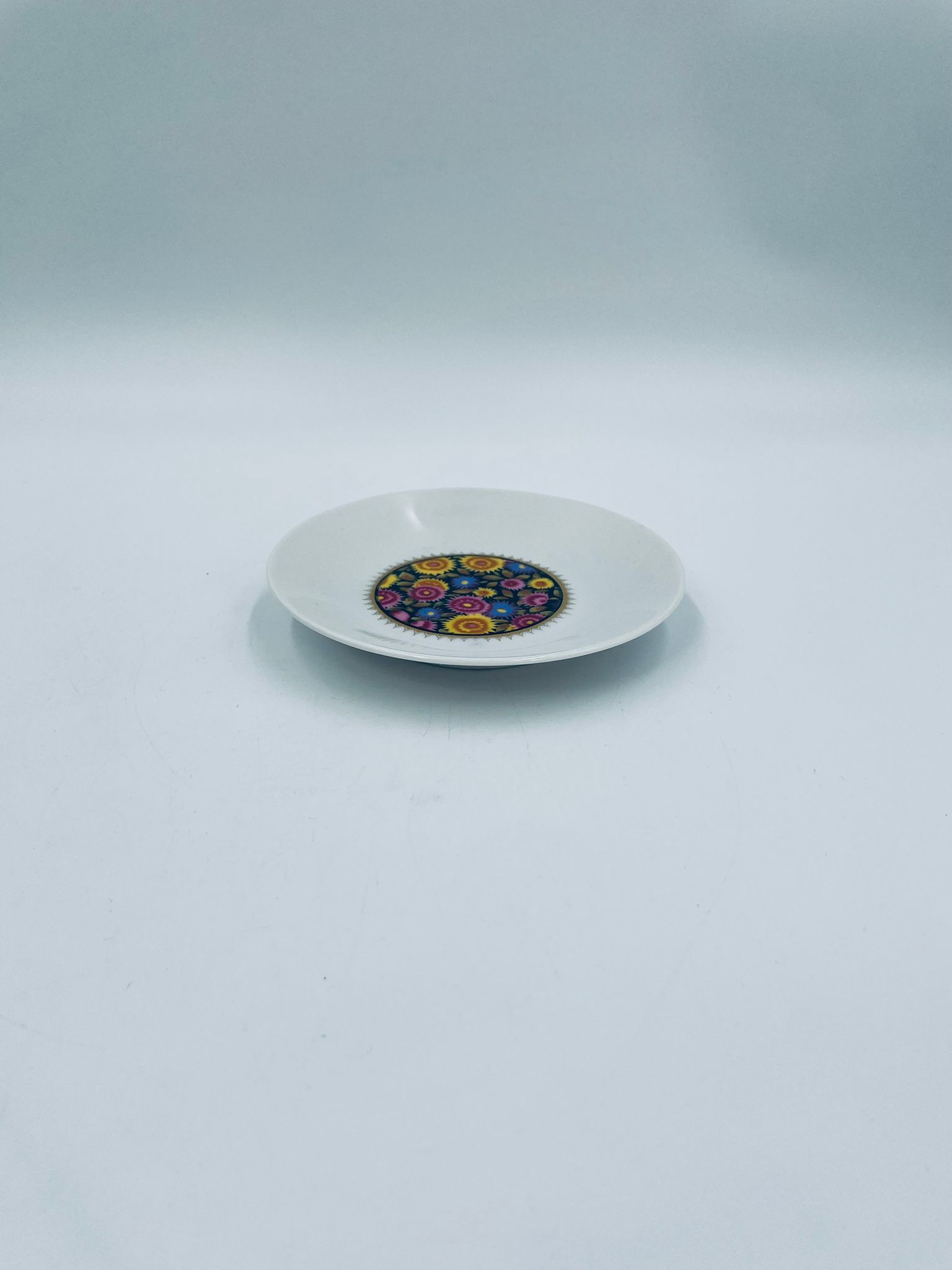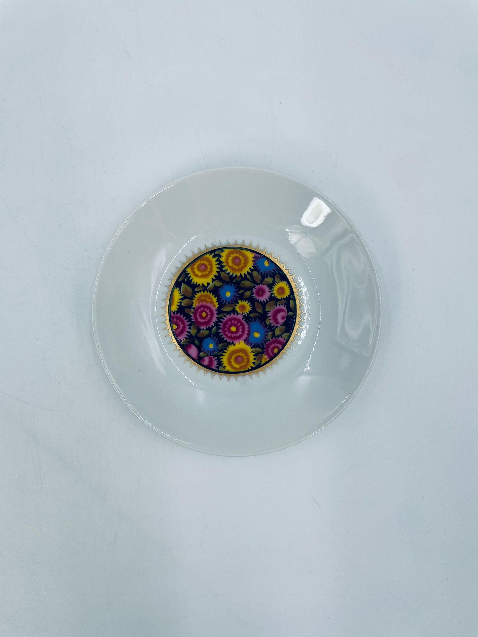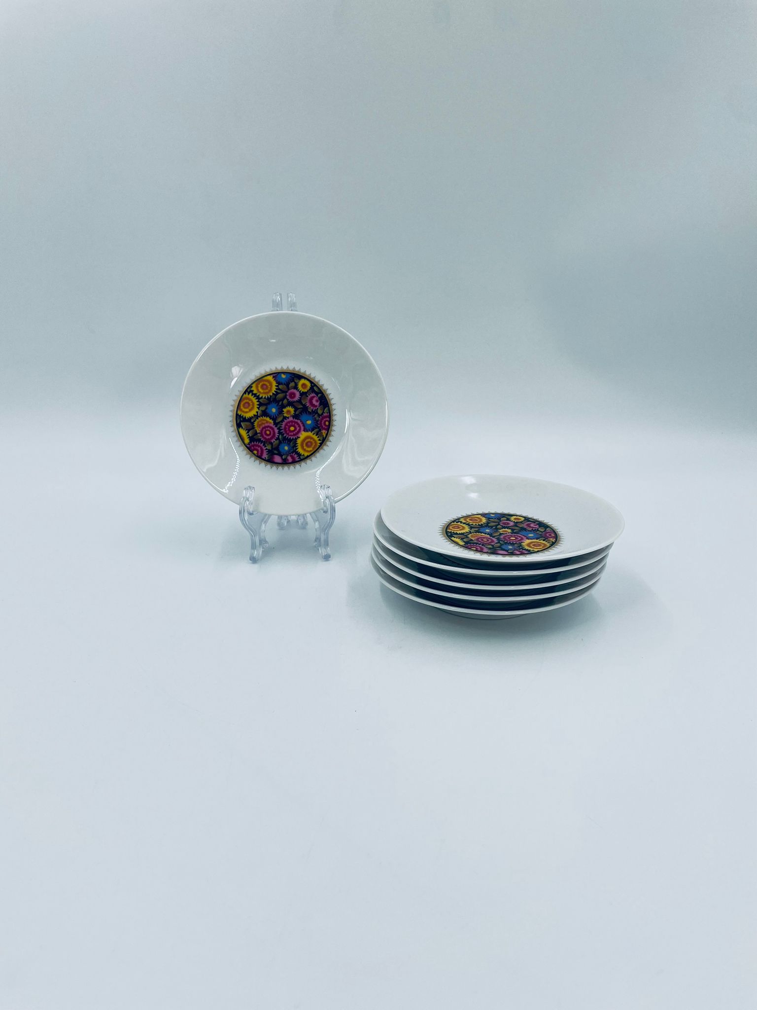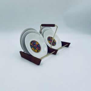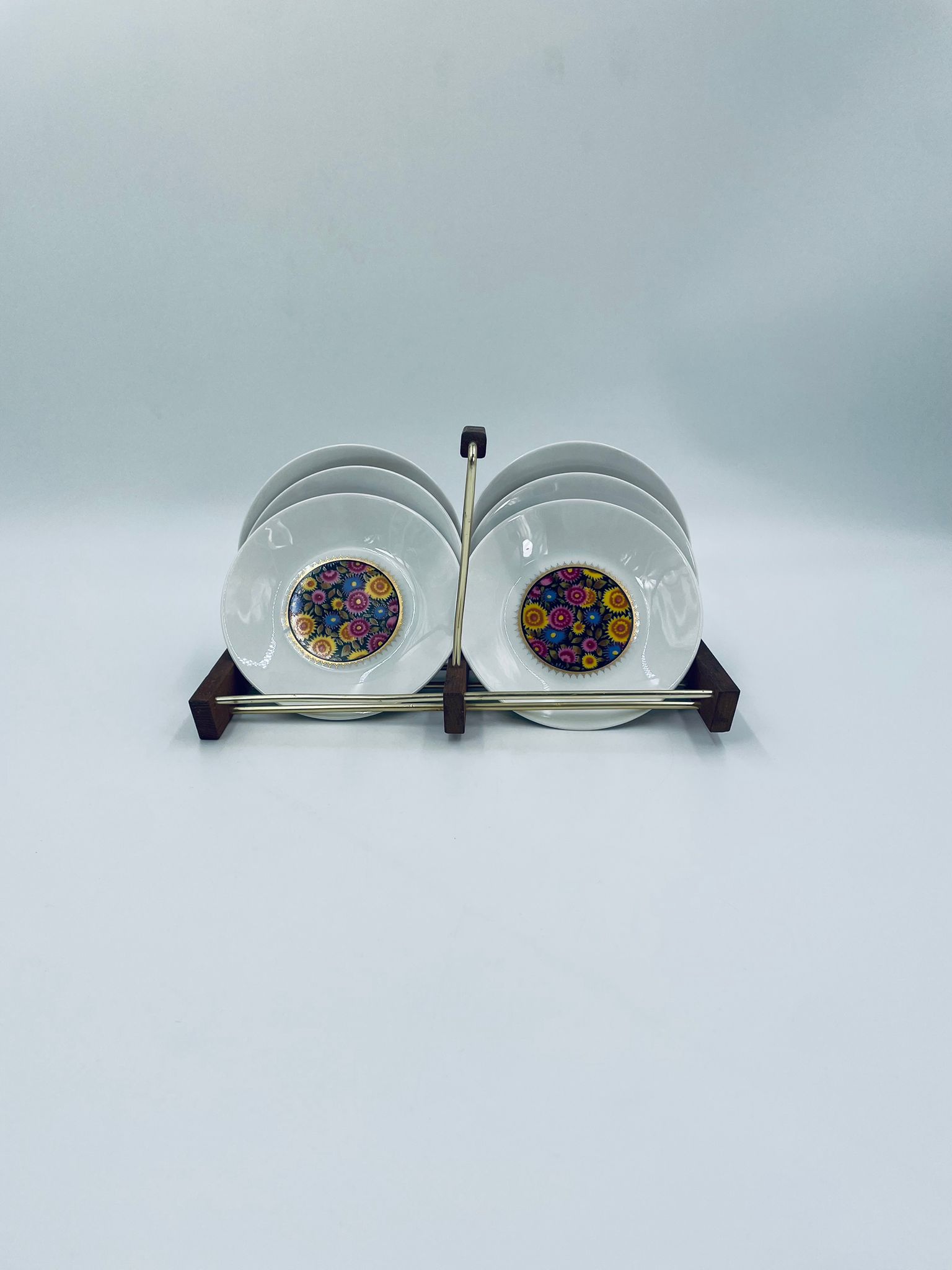 Zestaw talerzyków pod filiżankę wytwórni Winterling z Kirchenlamitz w Bavarii z lat 50tych, wykonanych z wysokiej jakości białe porcelany. Talerzyki klasyczne, ozdobione kolorowym wzorem kwiatowym na czarnym tle ze złotymi akcentami. Stojak drewniany z metalowymi, złotymi prętami. Posiada przetarcie na złoceniu.