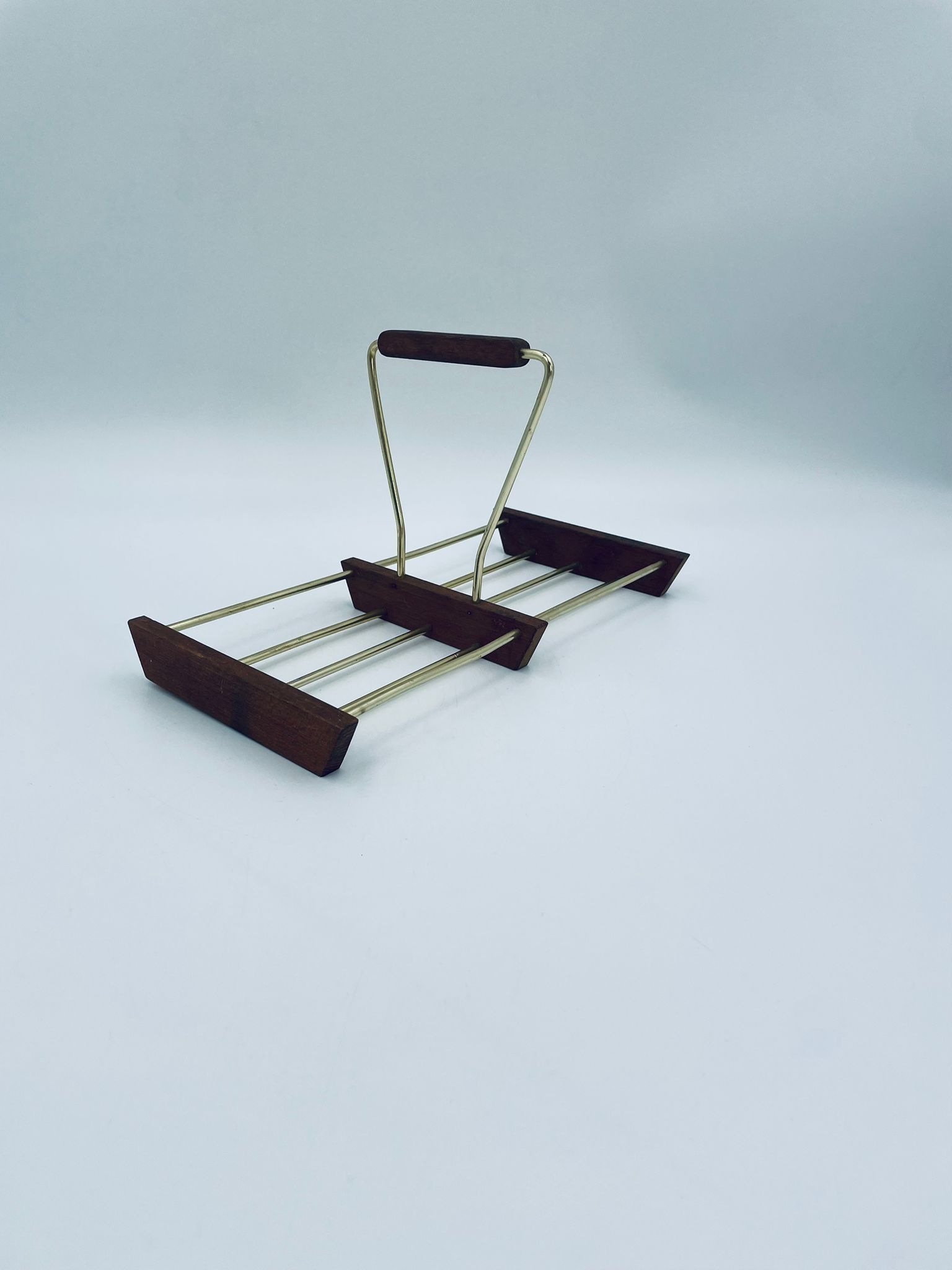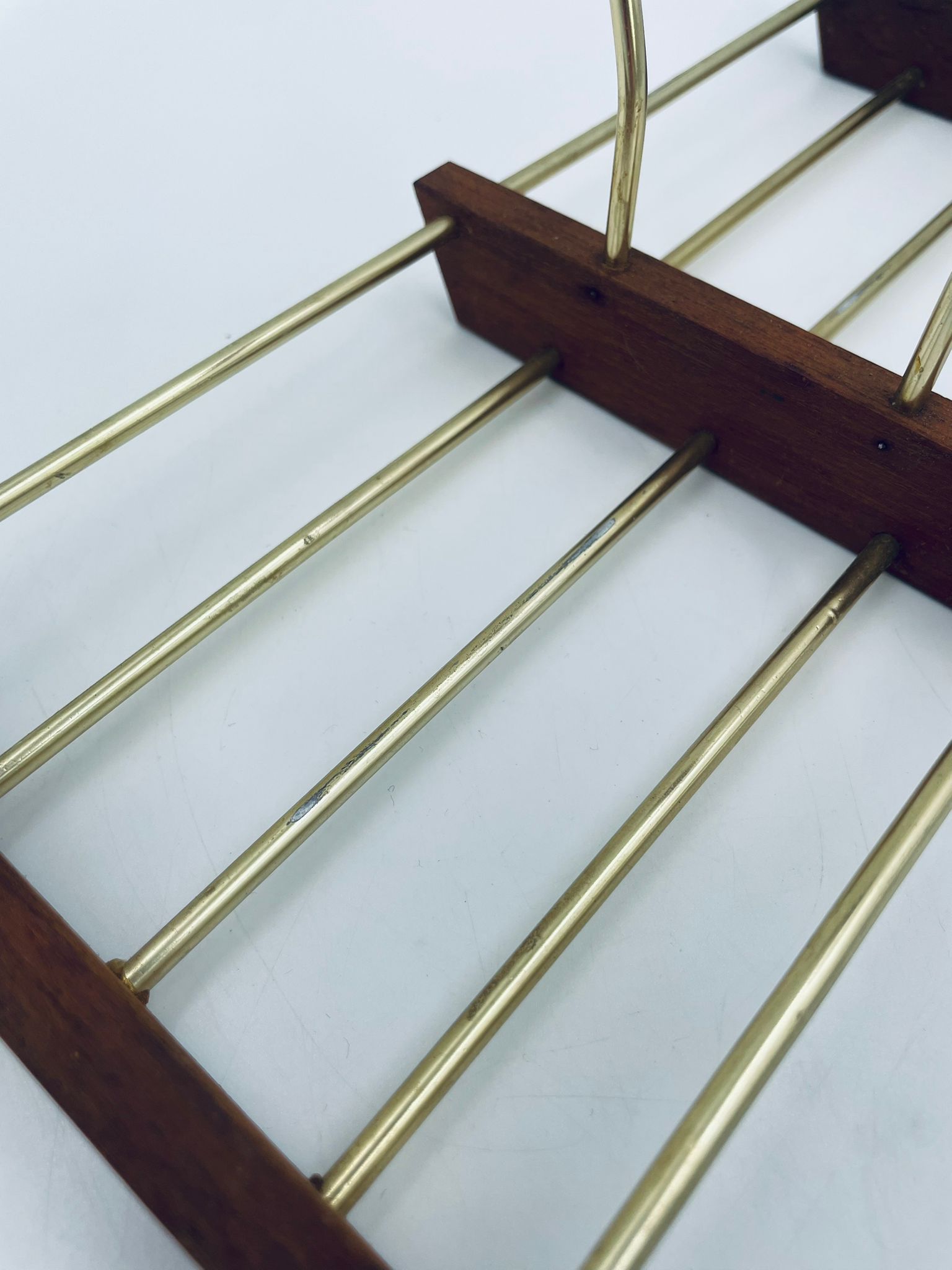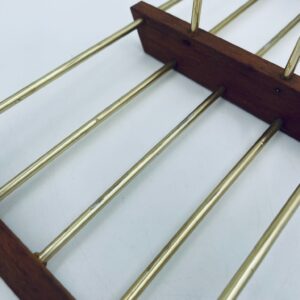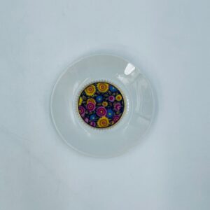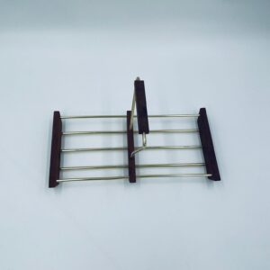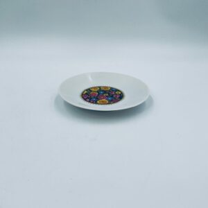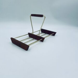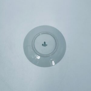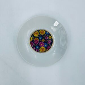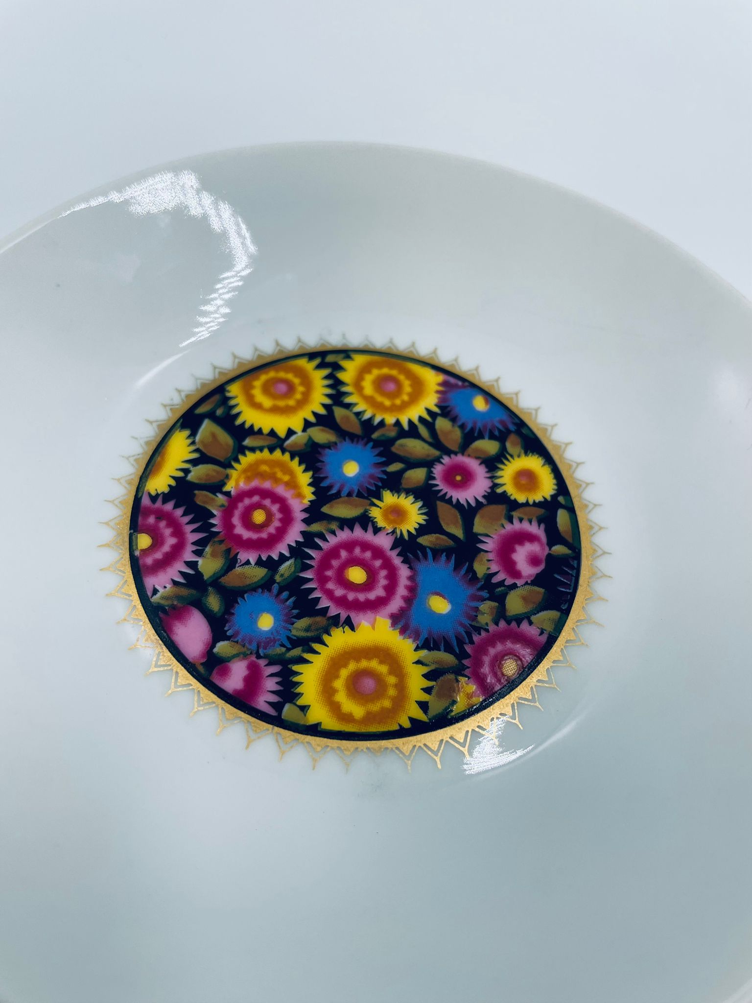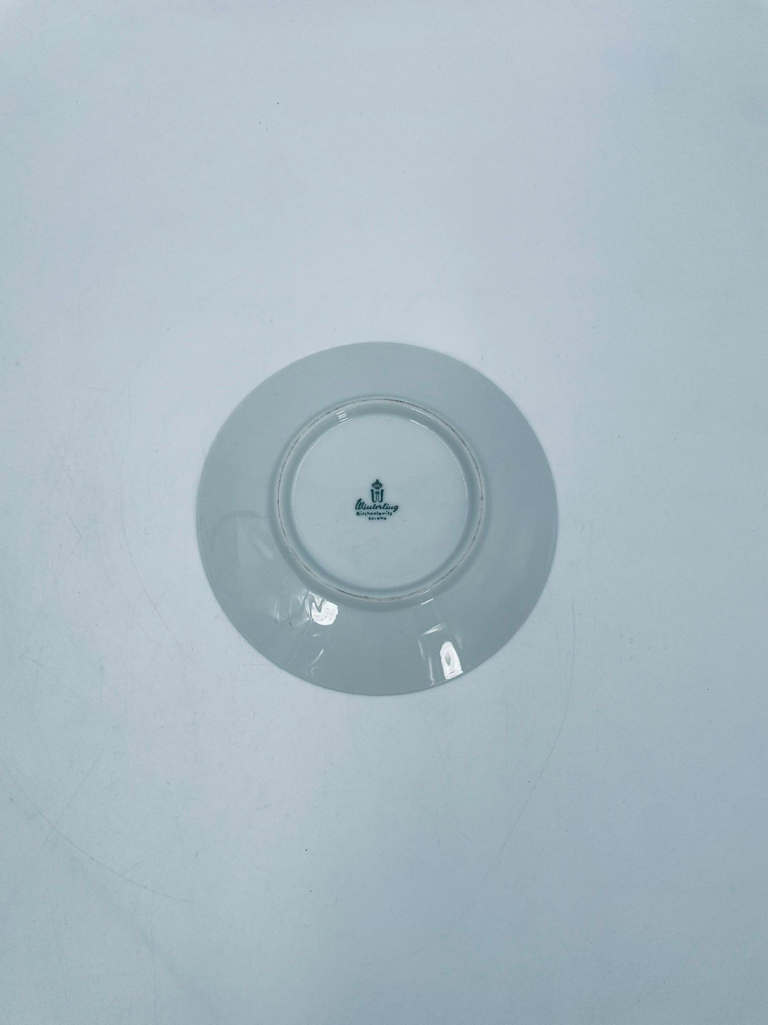 Zestaw talerzyków pod filiżankę wytwórni Winterling z Kirchenlamitz w Bavarii z lat 50tych, wykonanych z wysokiej jakości białe porcelany. Talerzyki klasyczne, ozdobione kolorowym wzorem kwiatowym na czarnym tle ze złotymi akcentami. Stojak drewniany z metalowymi, złotymi prętami. Posiada przetarcie na złoceniu.