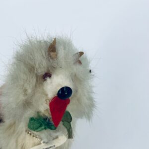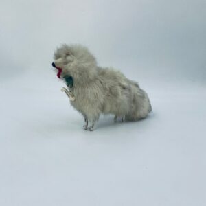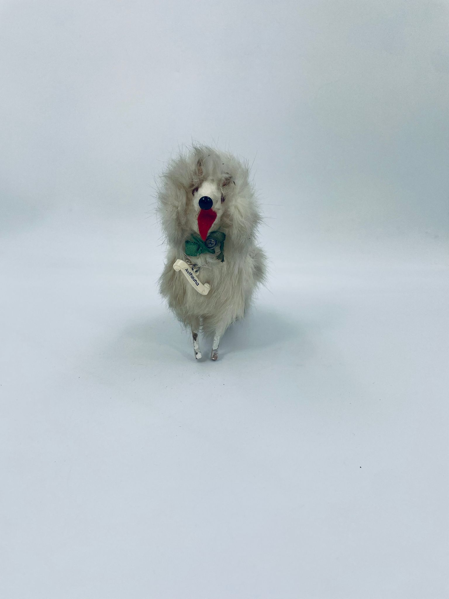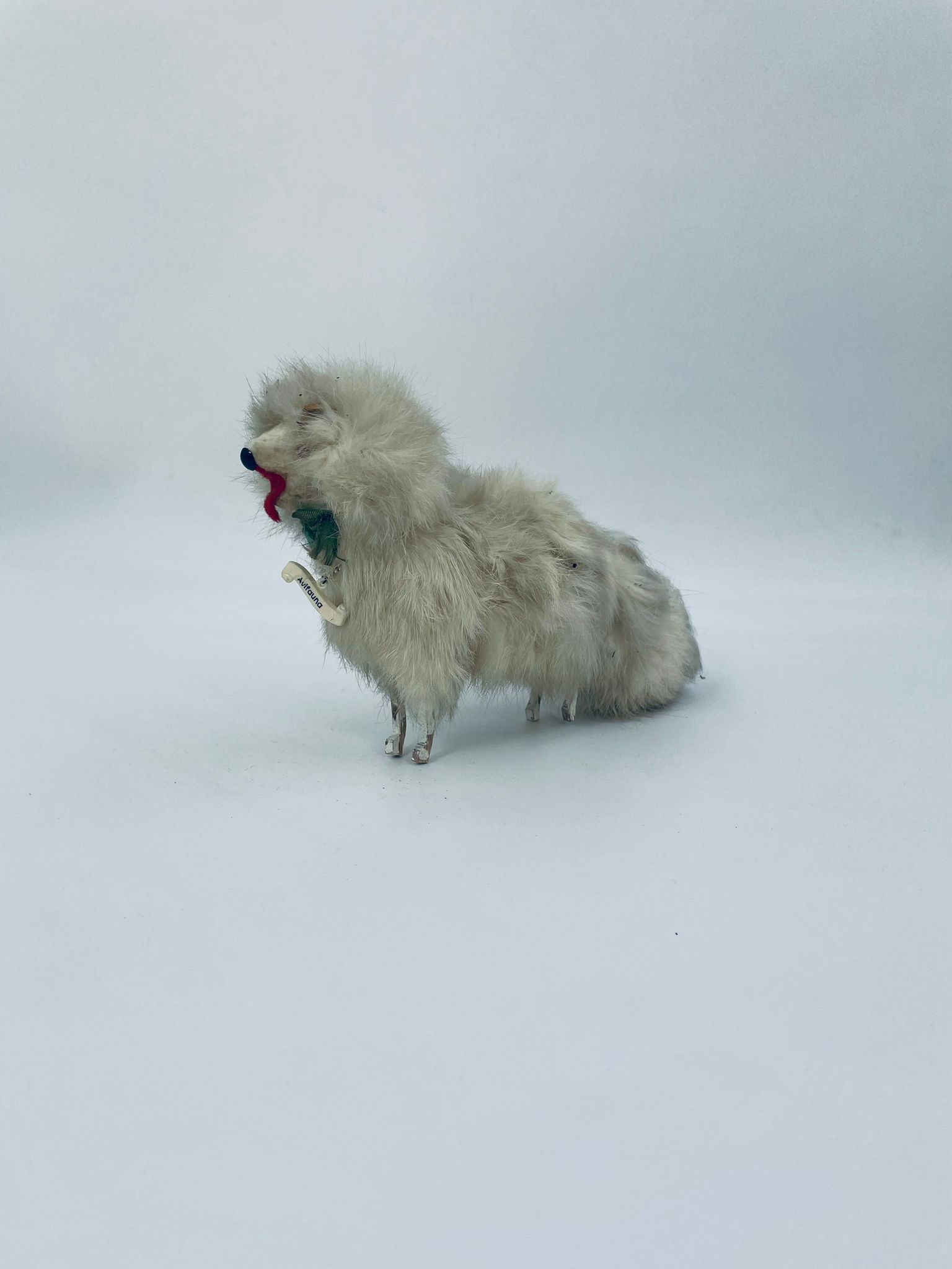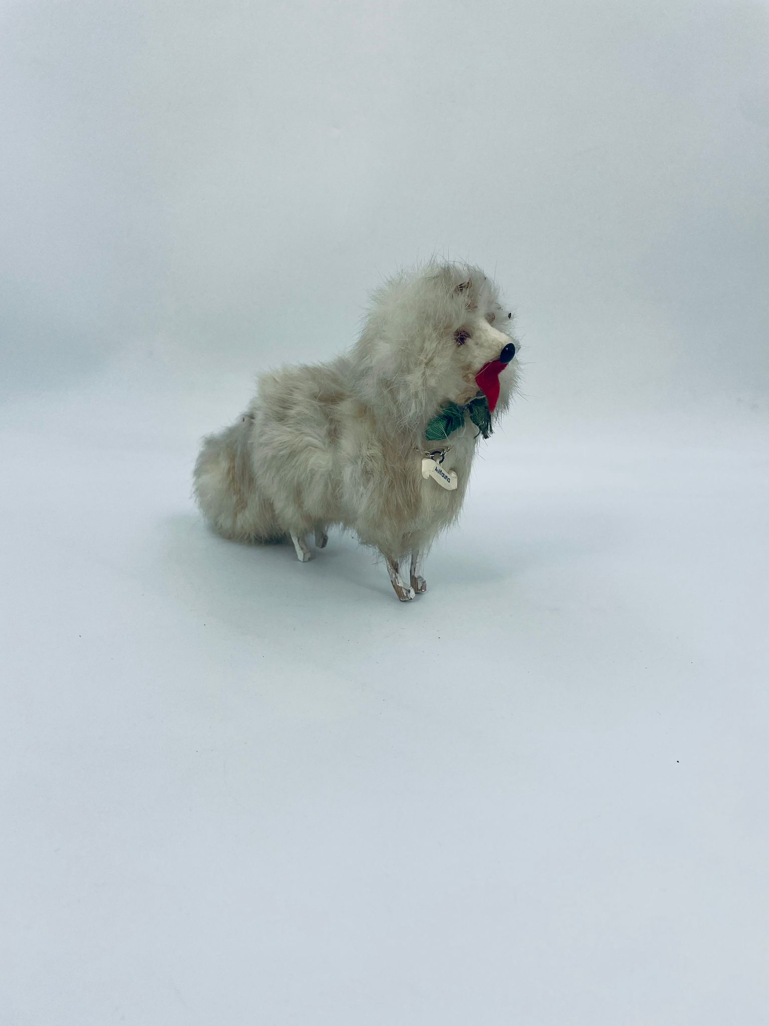 Antyczna figurka kolekcjonerska Pieska rasy Szpic, Samojed. Piesek posiada oryginalne futerko z królika, filcowe uszy i buźkę oraz plastikowe oczy. Łapki drewniane, przetarte.
