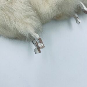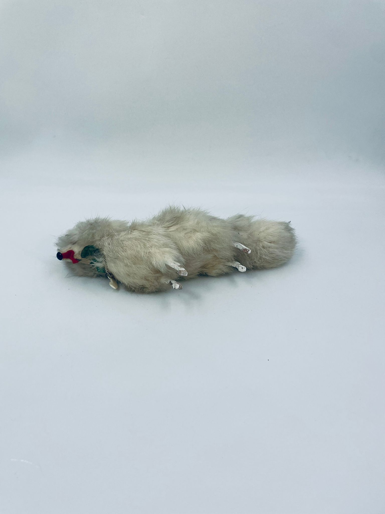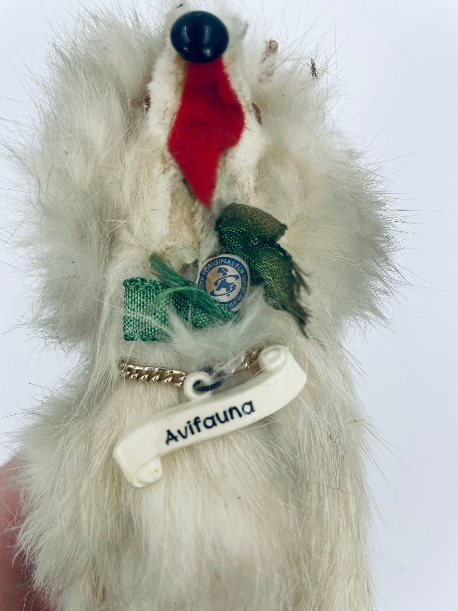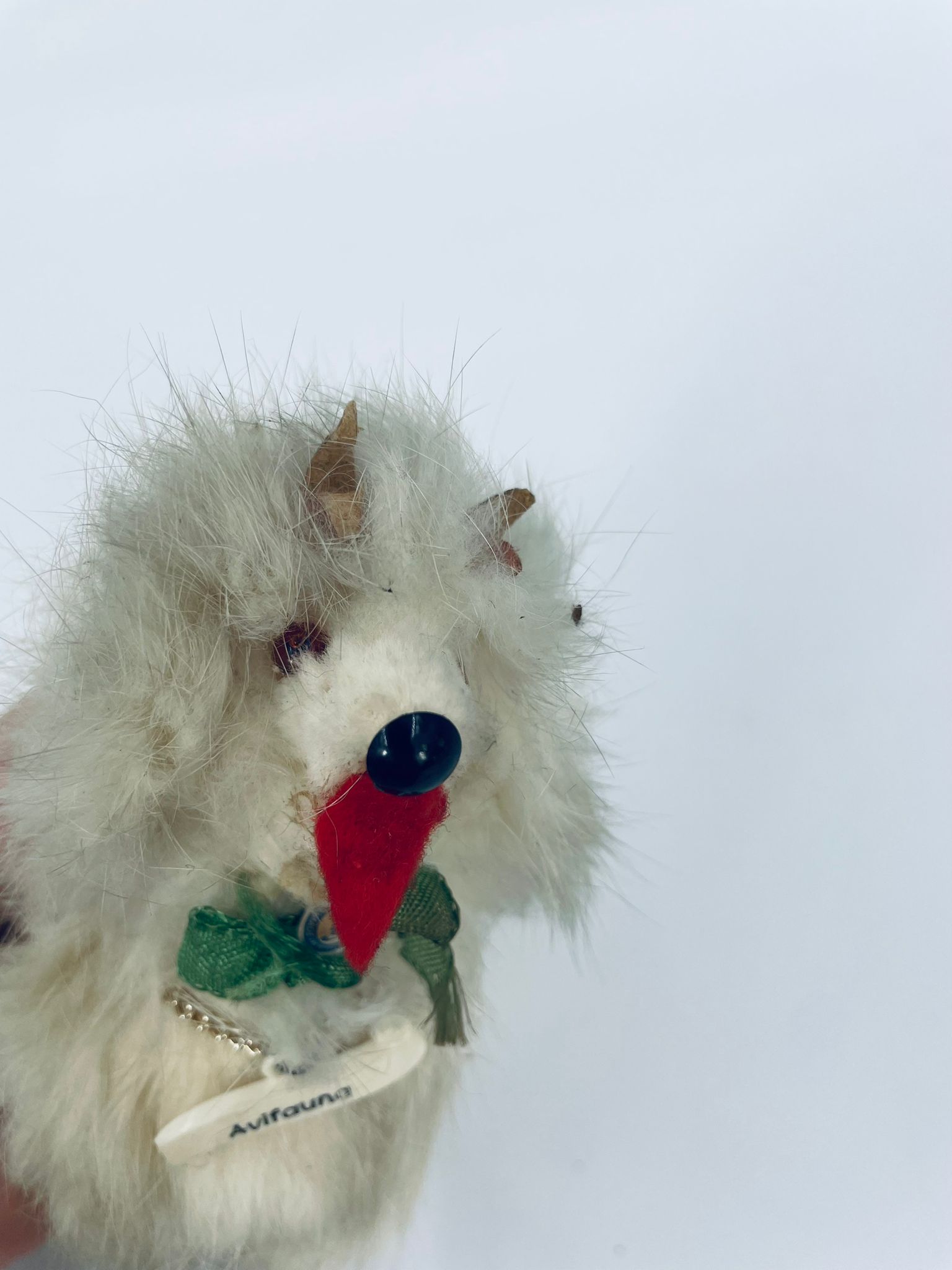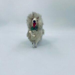 Antyczna figurka kolekcjonerska Pieska rasy Szpic, Samojed. Piesek posiada oryginalne futerko z królika, filcowe uszy i buźkę oraz plastikowe oczy. Łapki drewniane, przetarte.