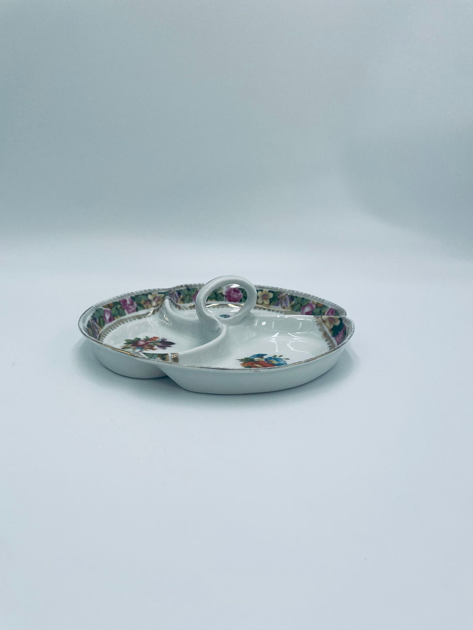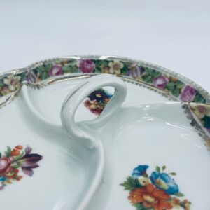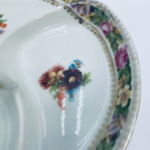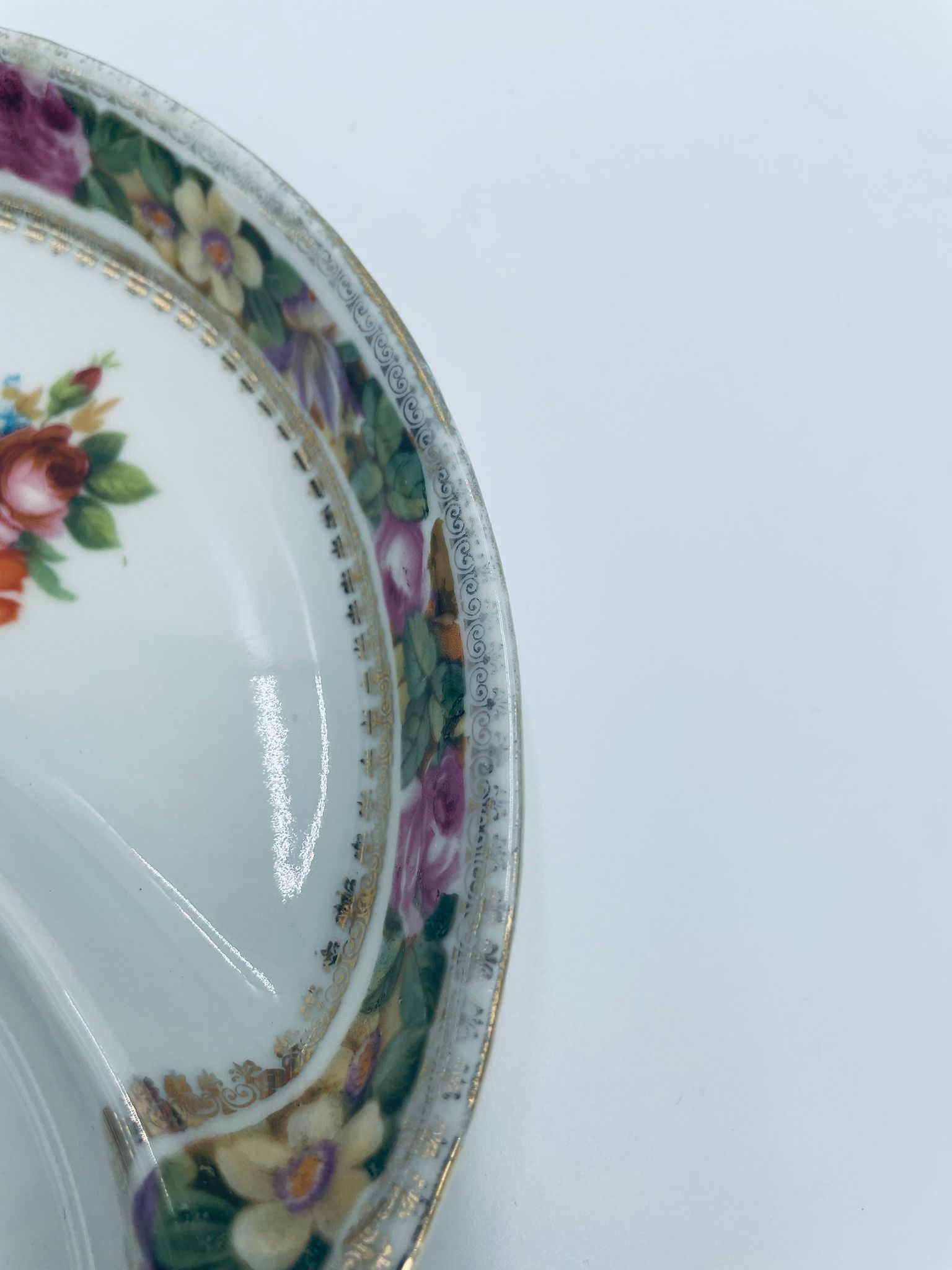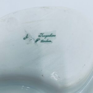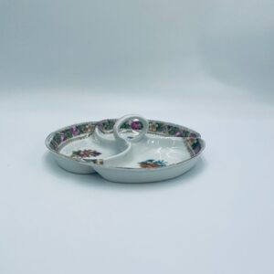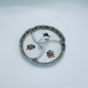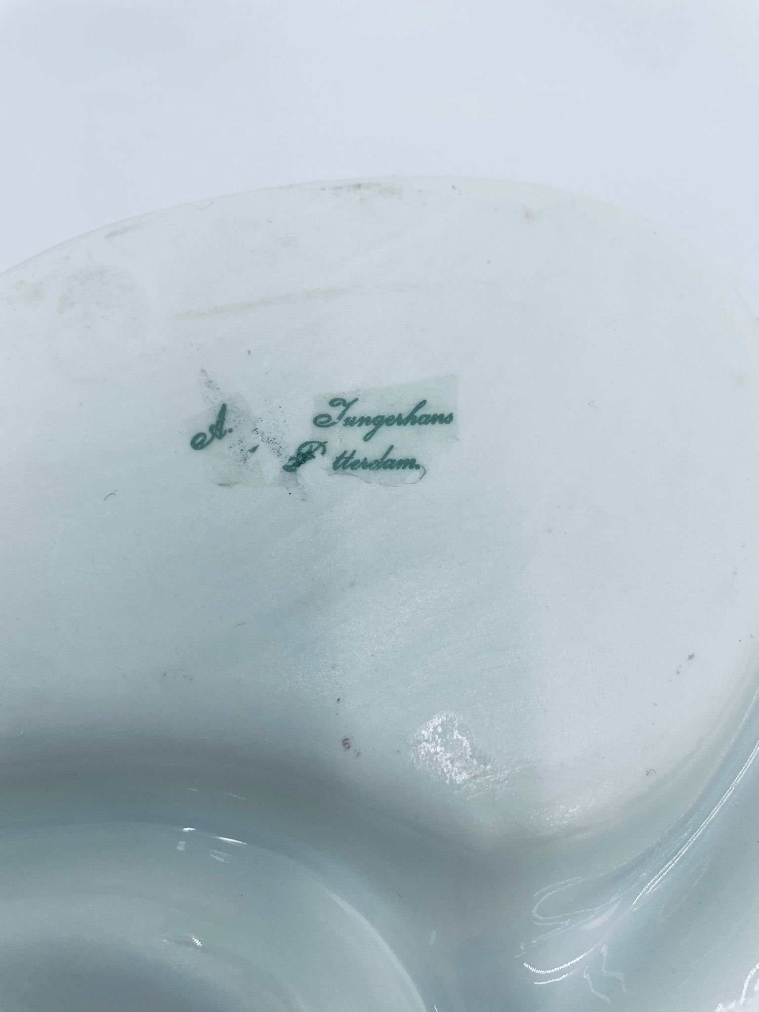Antyczna patera dekoracyjna holenderskiej firmy A. Jungerhans Rotterdam, wykonana z wysokiej jakosci białej ceramiki. Pateraz z uchwytem, dzielona, ozdobiona motywem kwiatowym oraz złotymi akcentami i rantami. Posiada przetarcia na złoceniu.