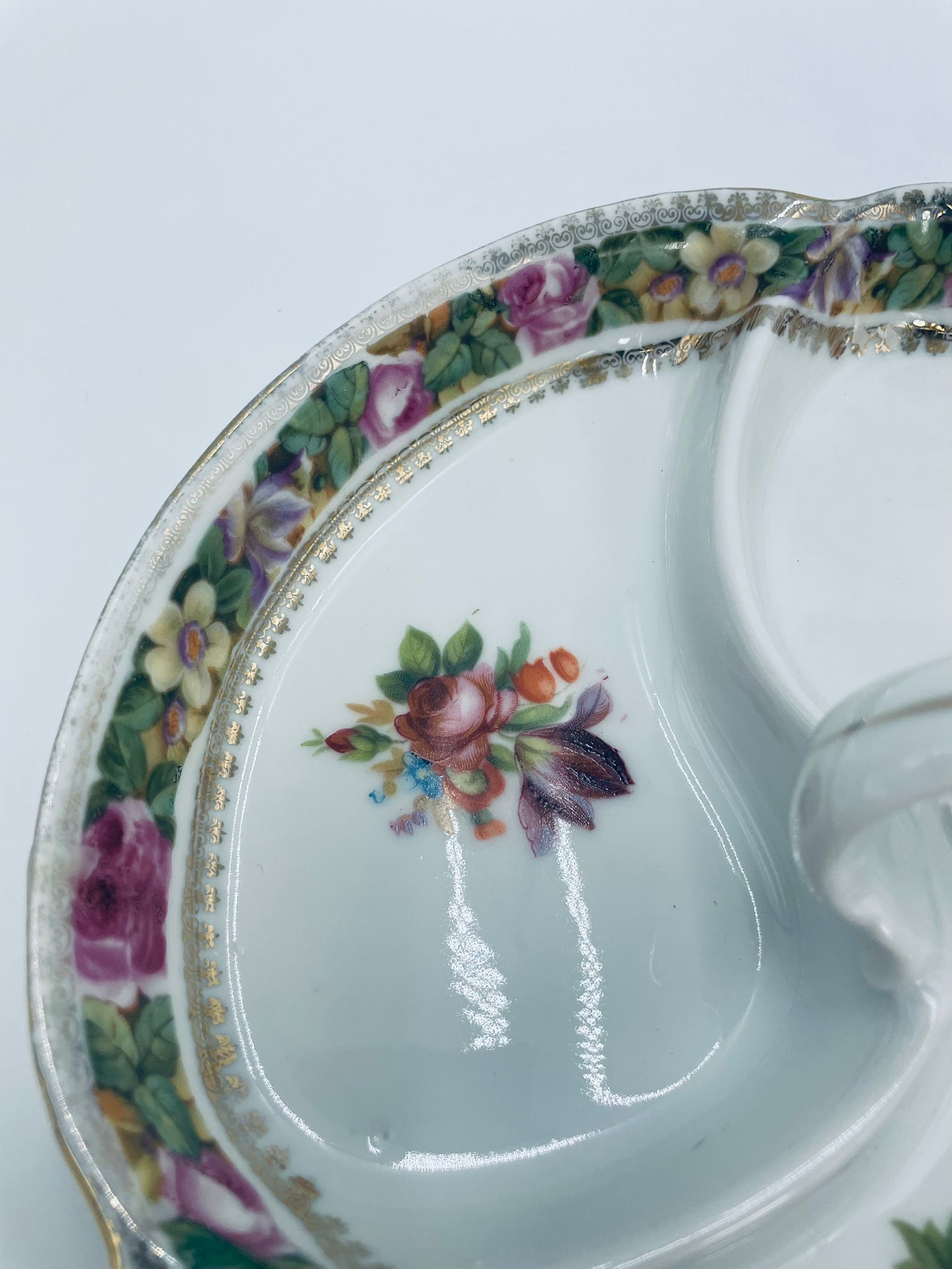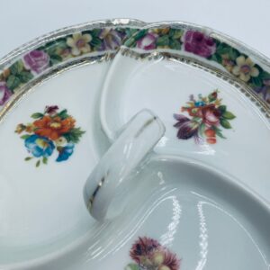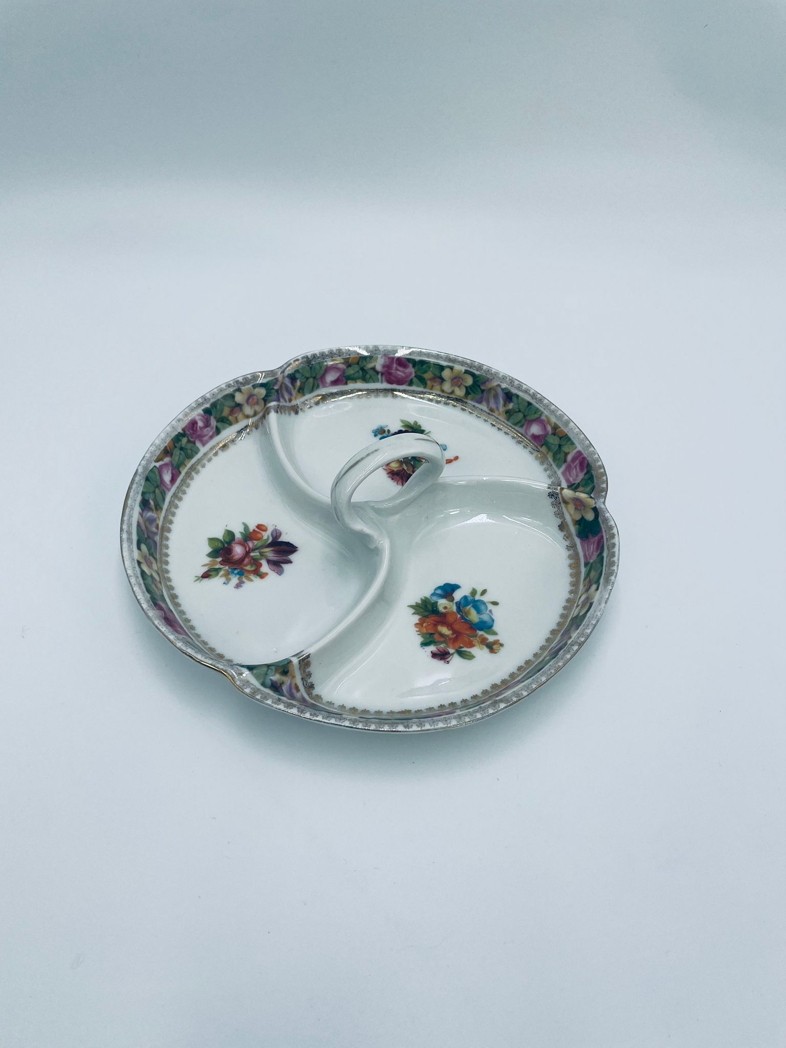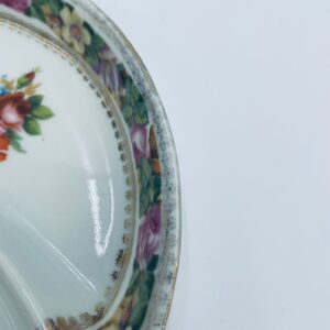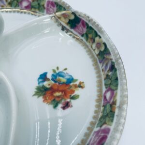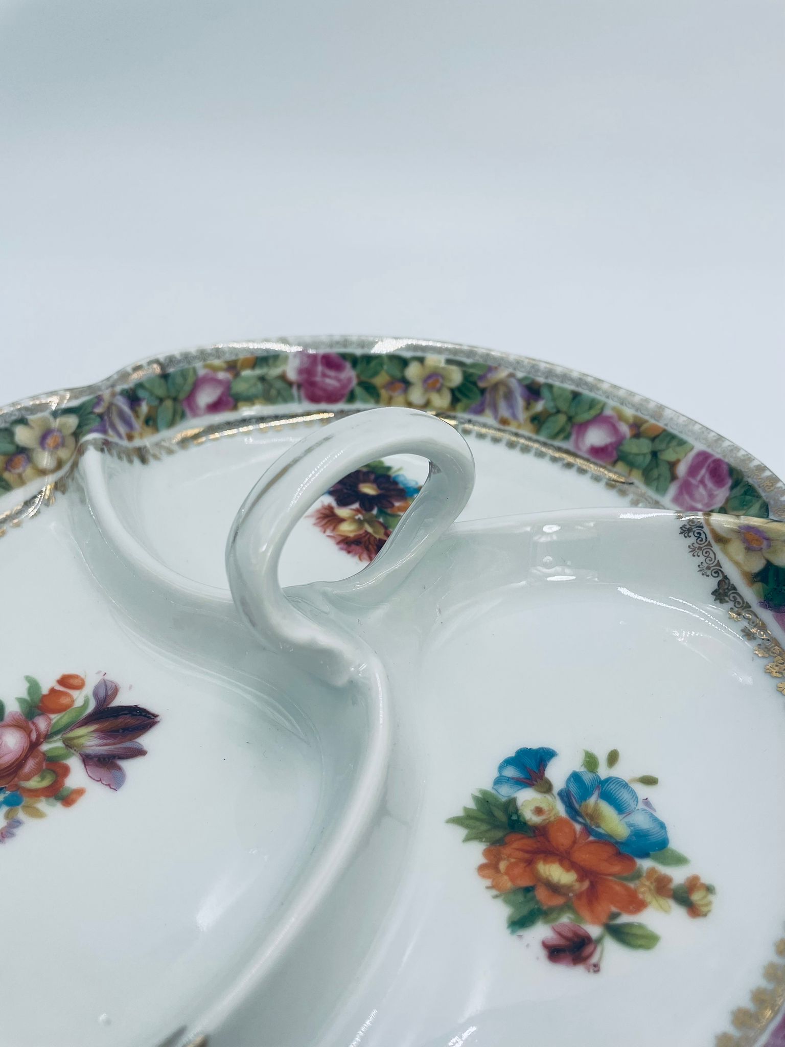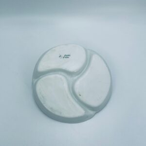 Antyczna patera dekoracyjna holenderskiej firmy A. Jungerhans Rotterdam, wykonana z wysokiej jakosci białej ceramiki. Pateraz z uchwytem, dzielona, ozdobiona motywem kwiatowym oraz złotymi akcentami i rantami. Posiada przetarcia na złoceniu.
