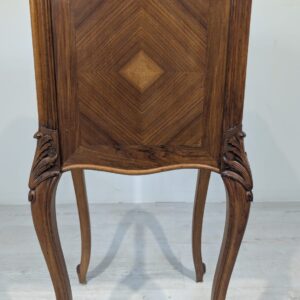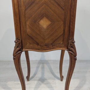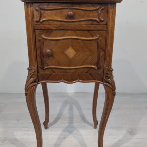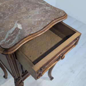 Stylowy, marmurowy stolik nocny w stylu Louis Philippe. Wykonany z wysokiej jakości materiałów, posiada solidną konstrukcję i elegancki wygląd. Idealnie sprawdzi się jako dodatek do sypialni lub salonu, nadając wnętrzu wyjątkowy charakter
