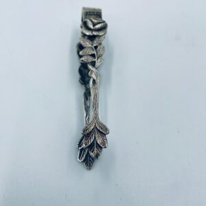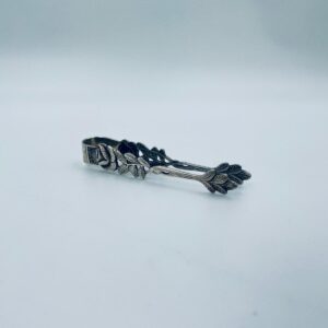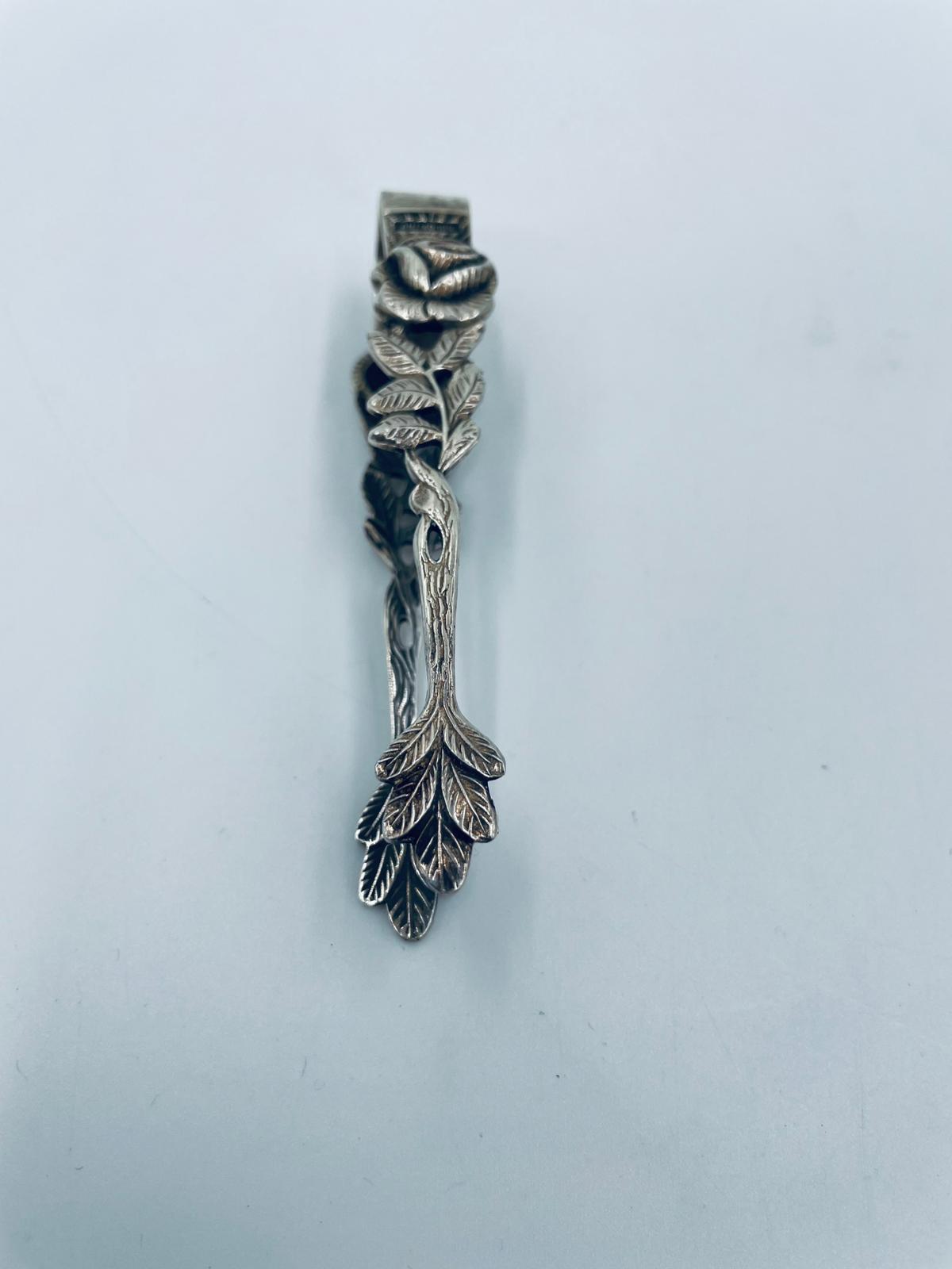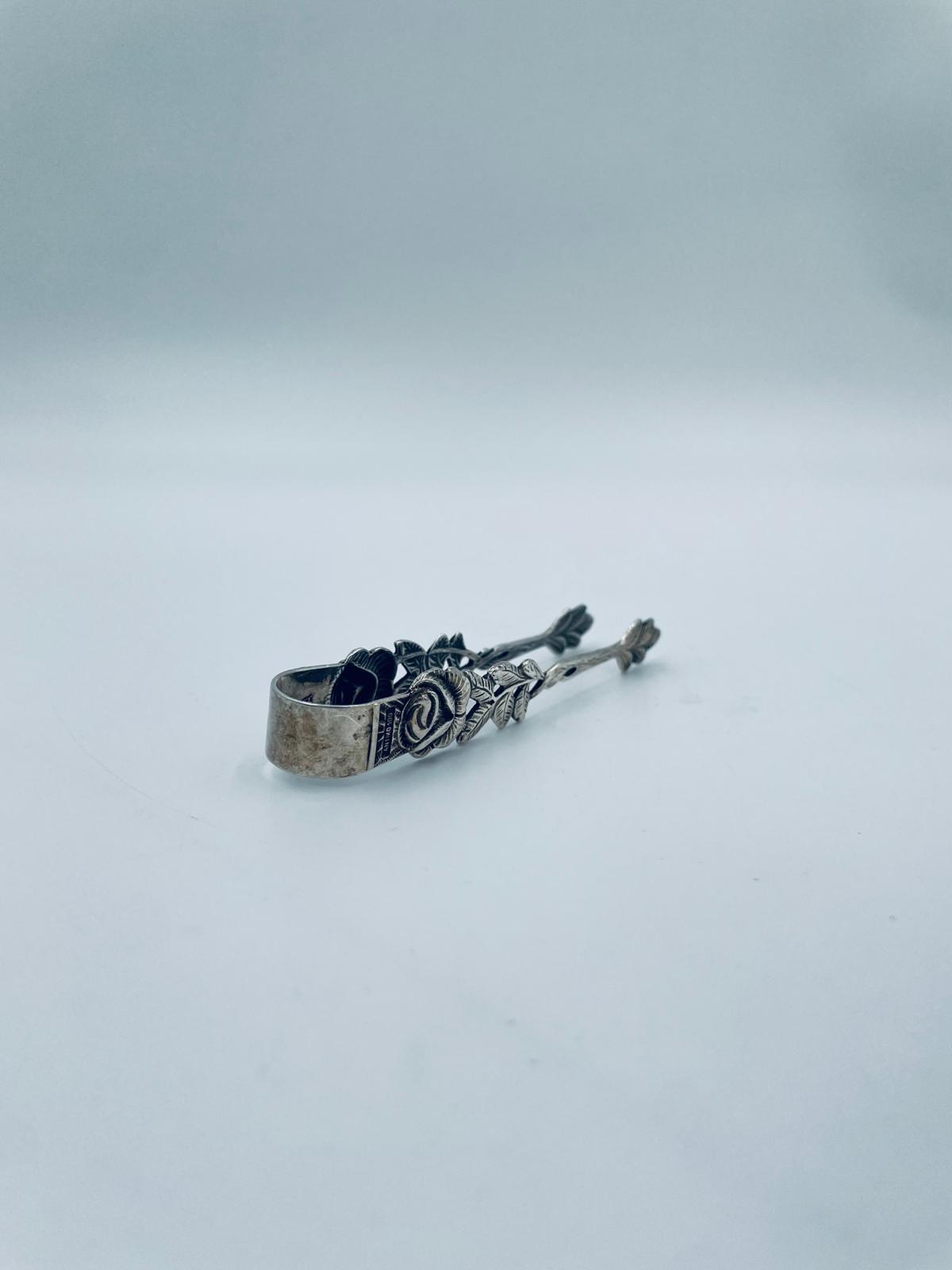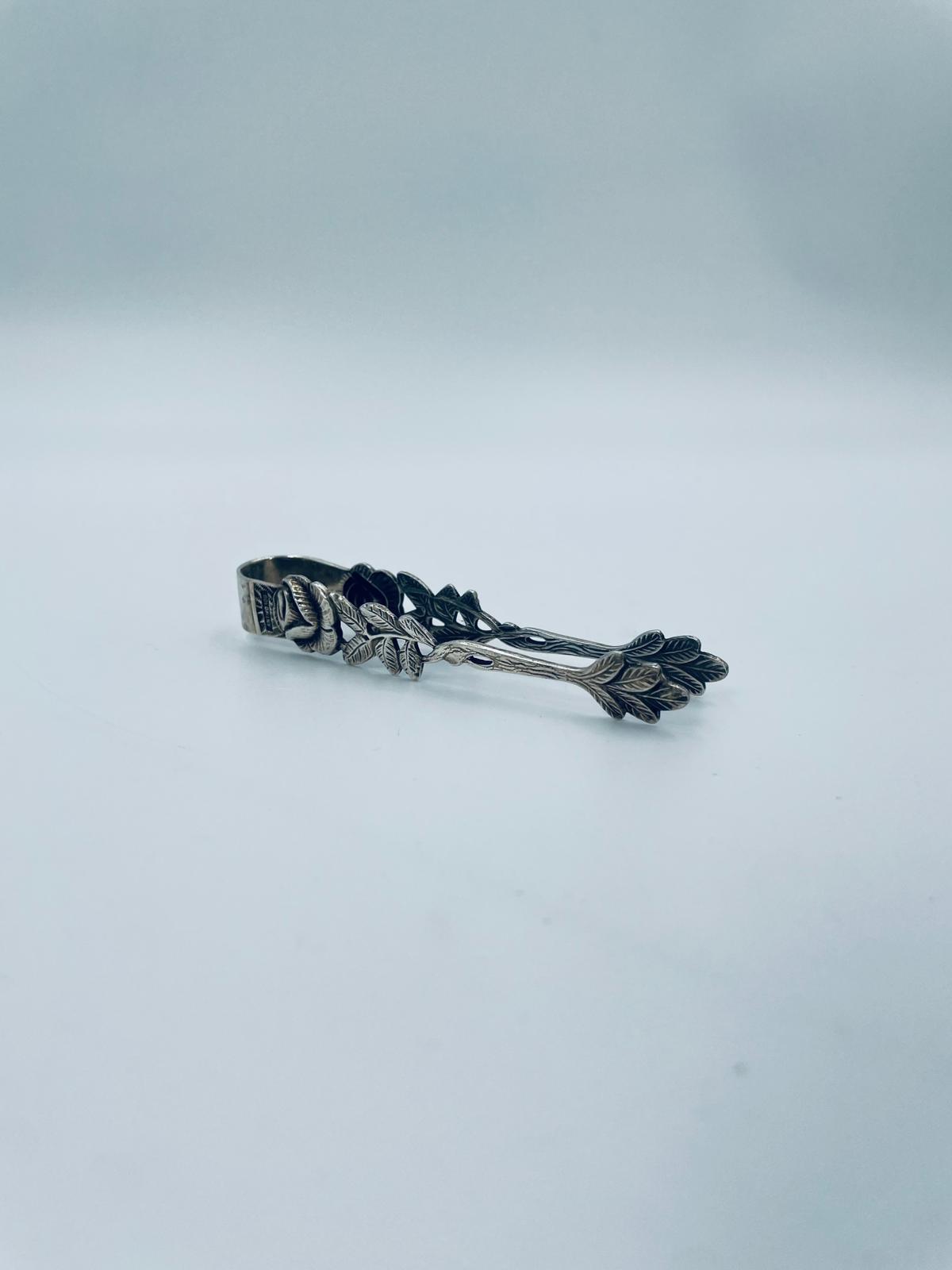 Antyczne szczypce do cukru wykonane przez niemiecka firmę Antiko, posrebrzane o próbie 100. Szczypce z motywem Róży z Hildenshein. Charakterystycznym elementem jest trzonek w formie gałązki z liśćmi, zakończony misternie wykonanym pąkiem róży.