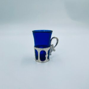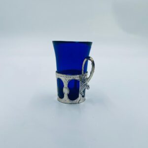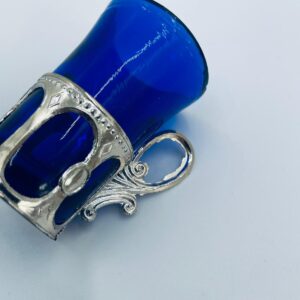 Antyczny kieliszek do wódki w stylu Vintage, popularny w latach 60 i 70tych XXwieku, wykonany z wysokiej jakości szkła. Kieliszek w kobaltowym kolorze, umieszczony w metalowym koszyczku z ozdobnym uchwytem. Posiada mały uszczerbek na górnym rancie oraz przetarcie na koszyczku.