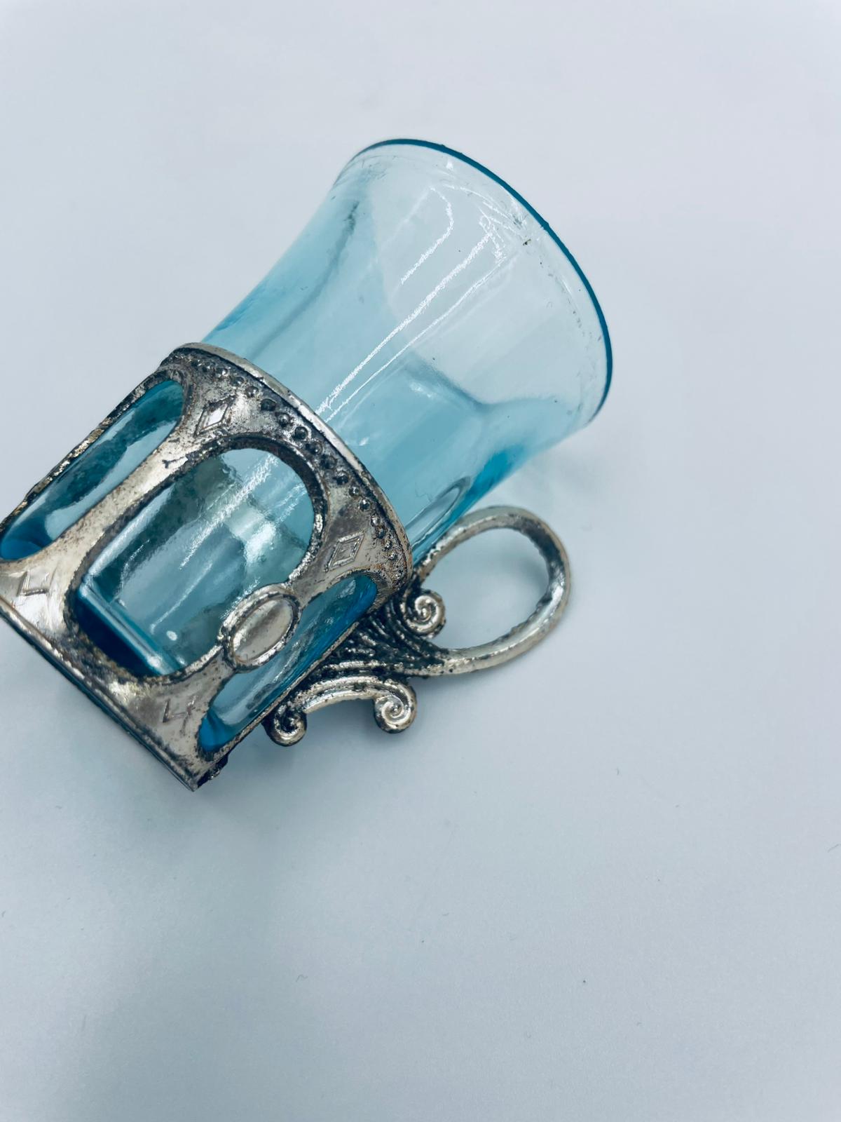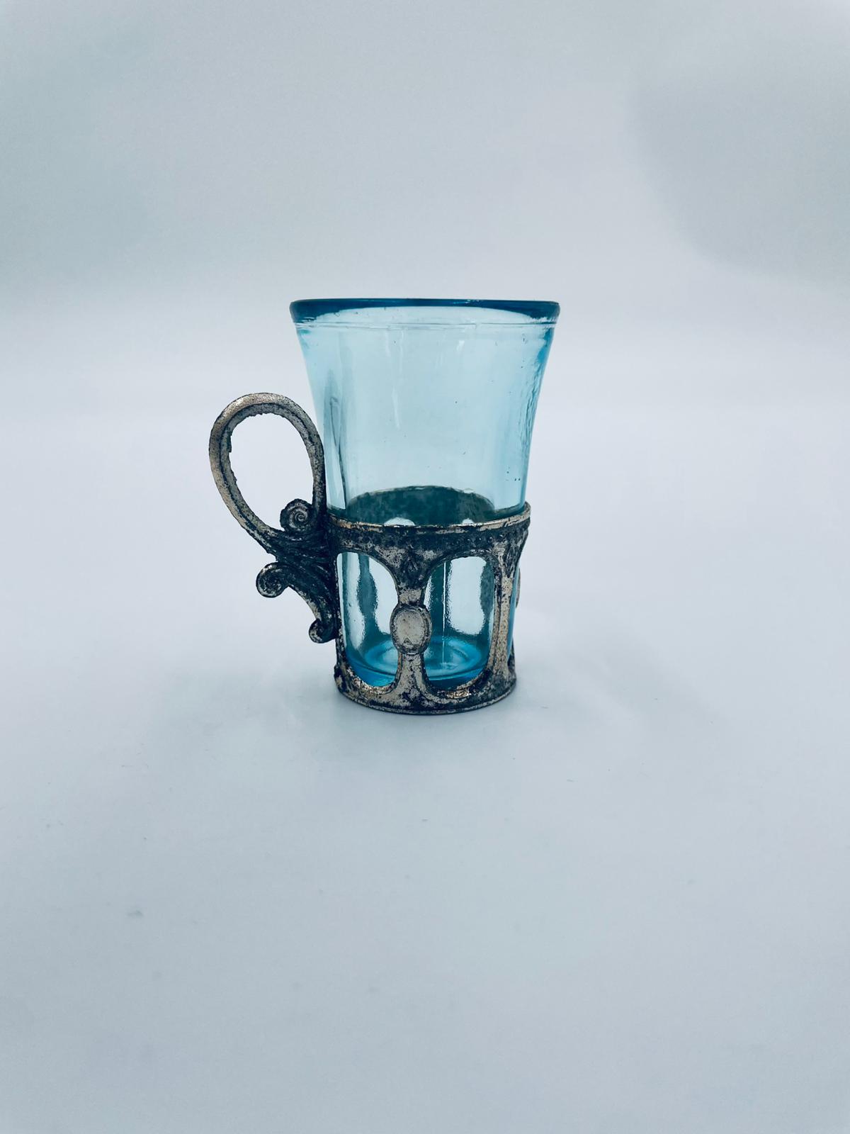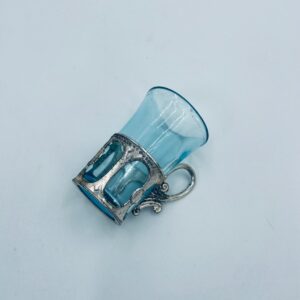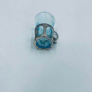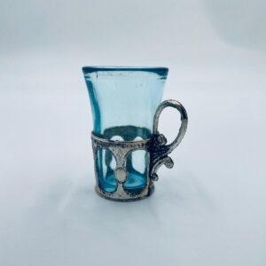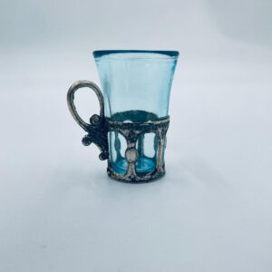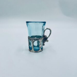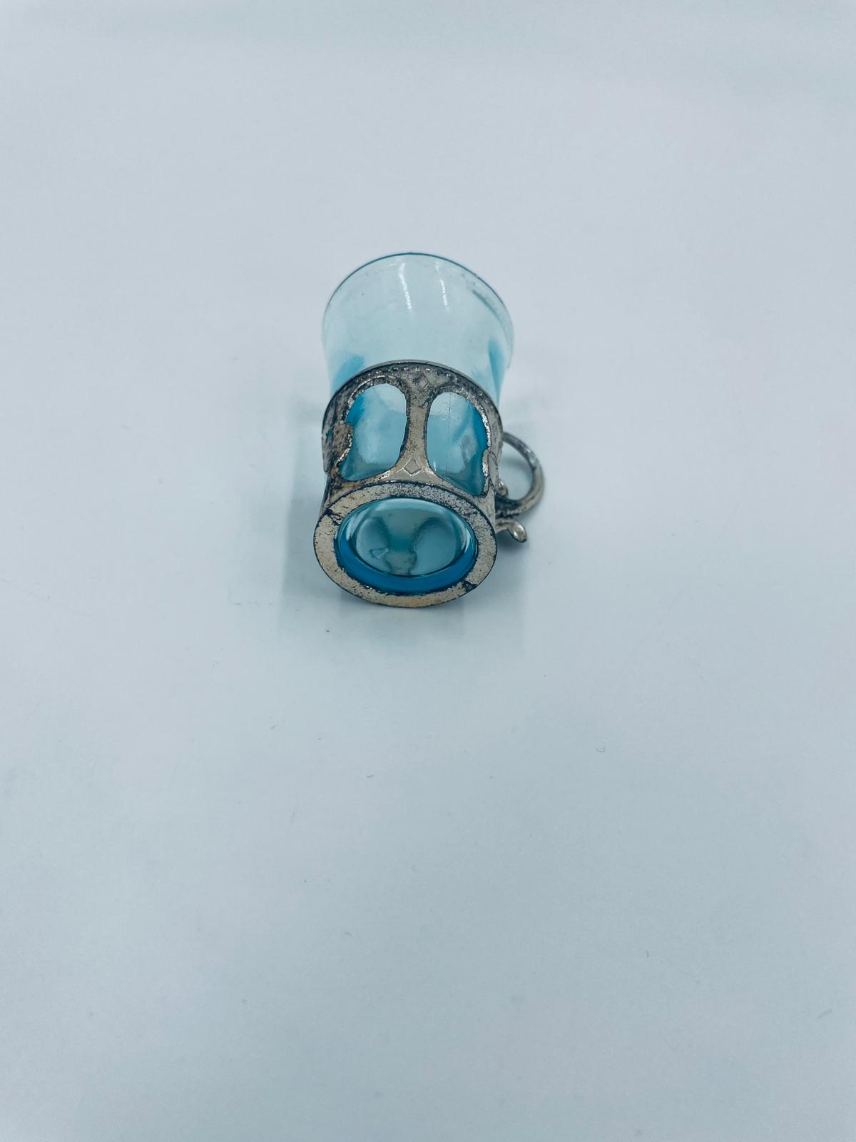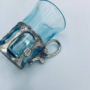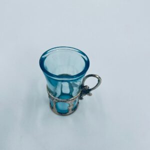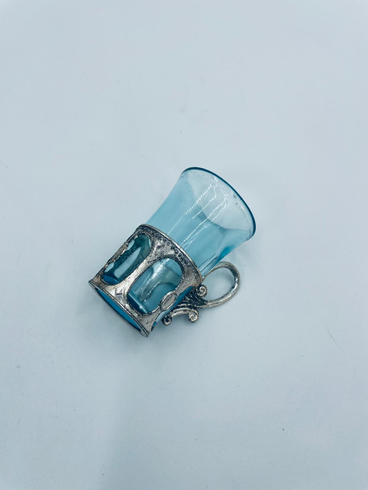 Antyczny kieliszek do wódki w stylu Vintage, popularny w latach 60 i 70tych XXwieku, wykonany z wysokiej jakości szkła. Kieliszek w jasnoniebieskim kolorze, umieszczony w metalowym koszyczku z ozdobnym uchwytem. Posiada przetarcie na koszyczku.