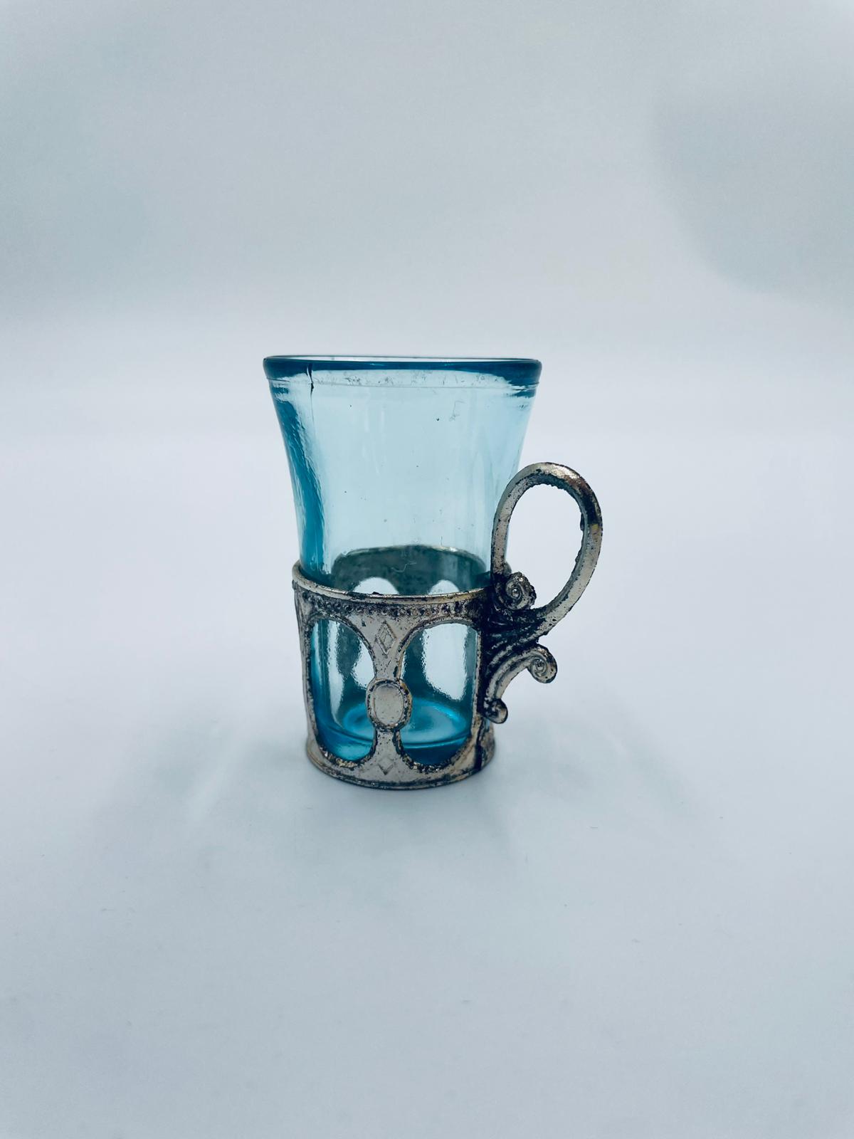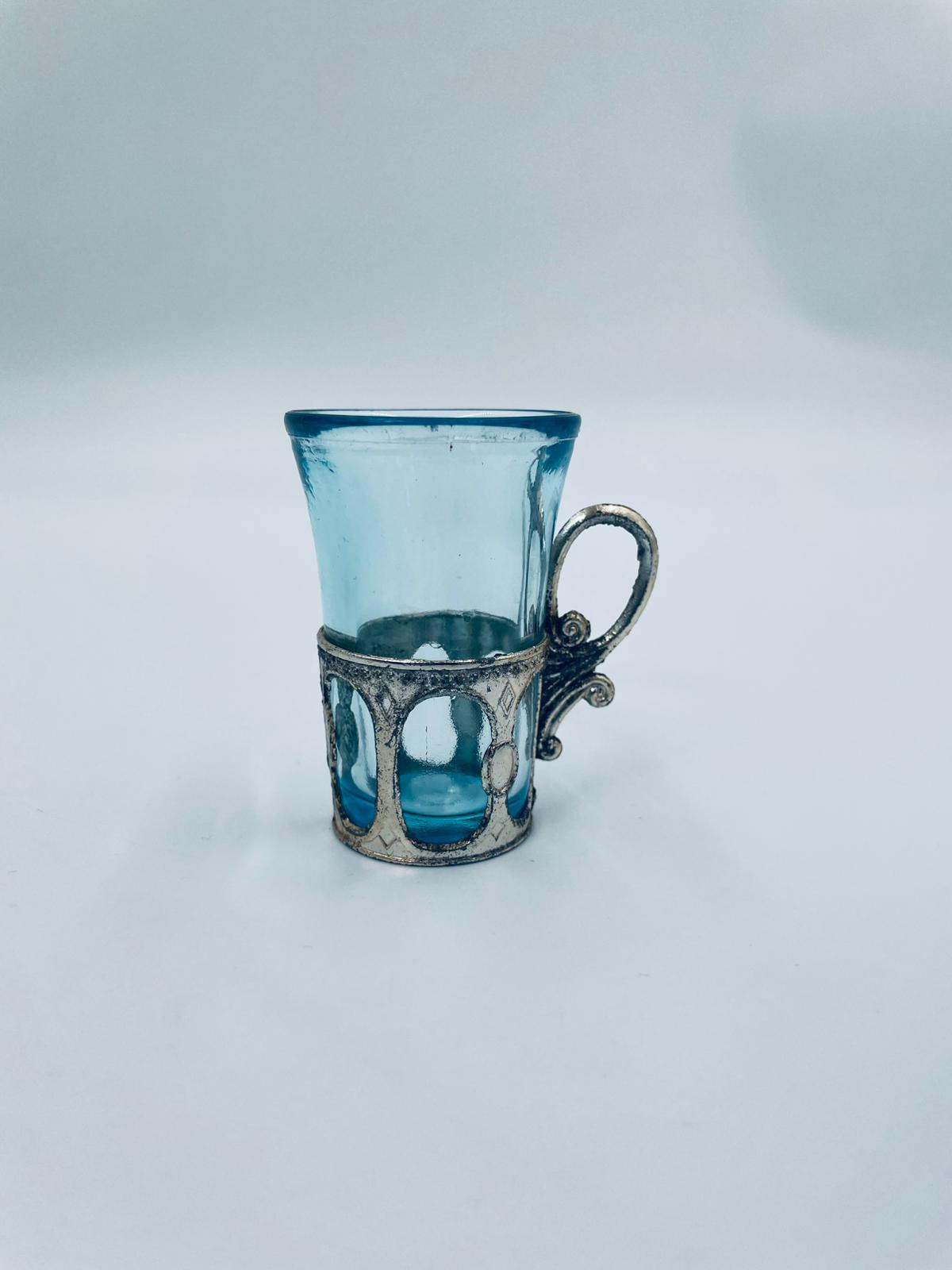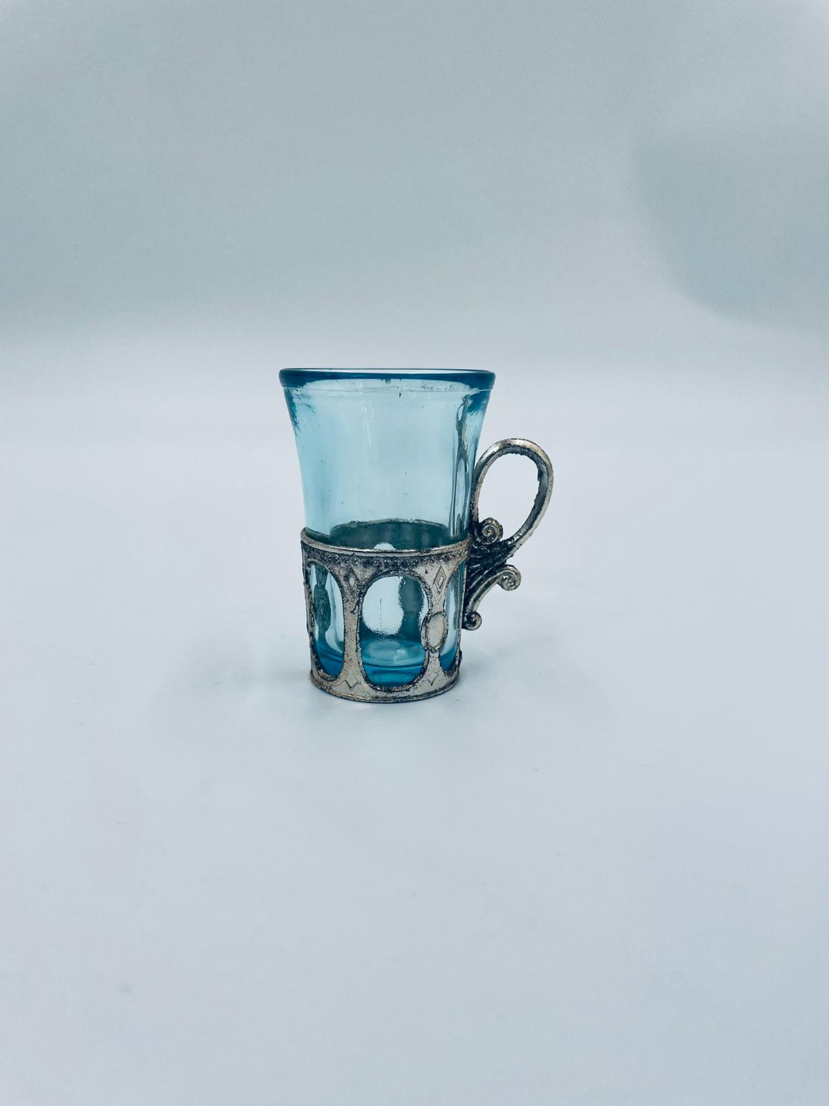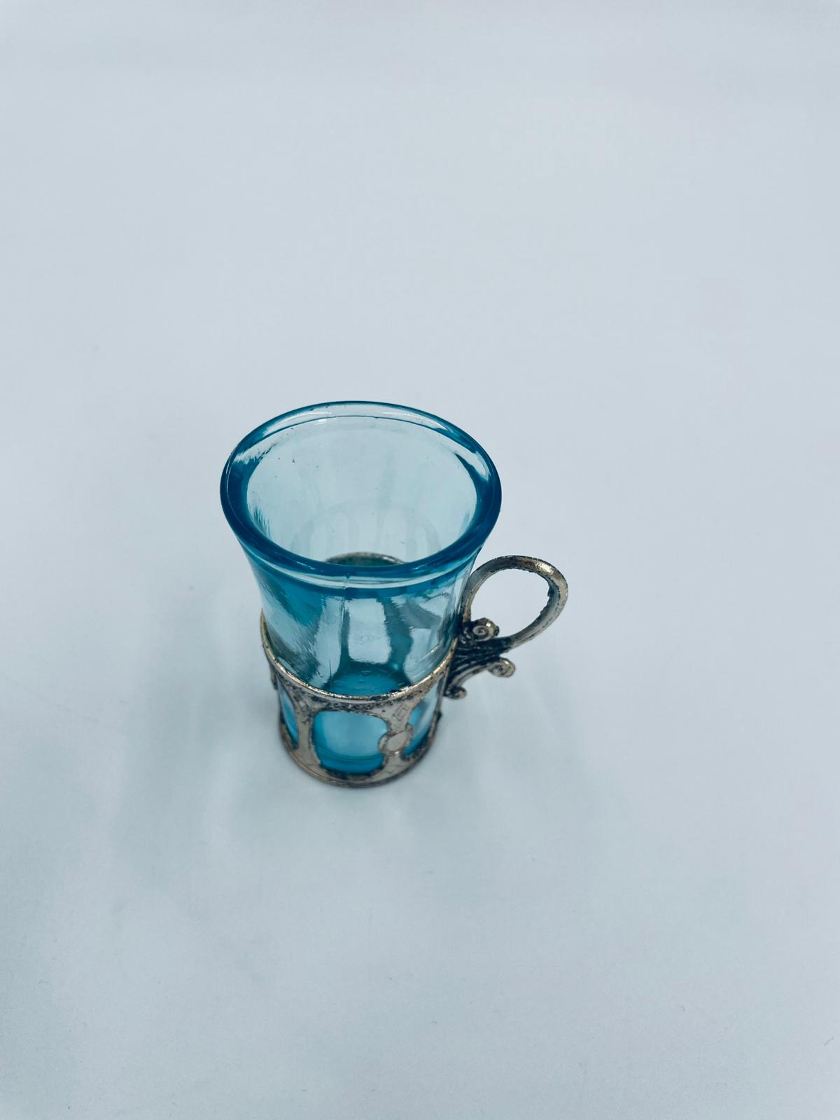 Antyczny kieliszek do wódki w stylu Vintage, popularny w latach 60 i 70tych XXwieku, wykonany z wysokiej jakości szkła. Kieliszek w jasnoniebieskim kolorze, umieszczony w metalowym koszyczku z ozdobnym uchwytem. Posiada przetarcie na koszyczku.