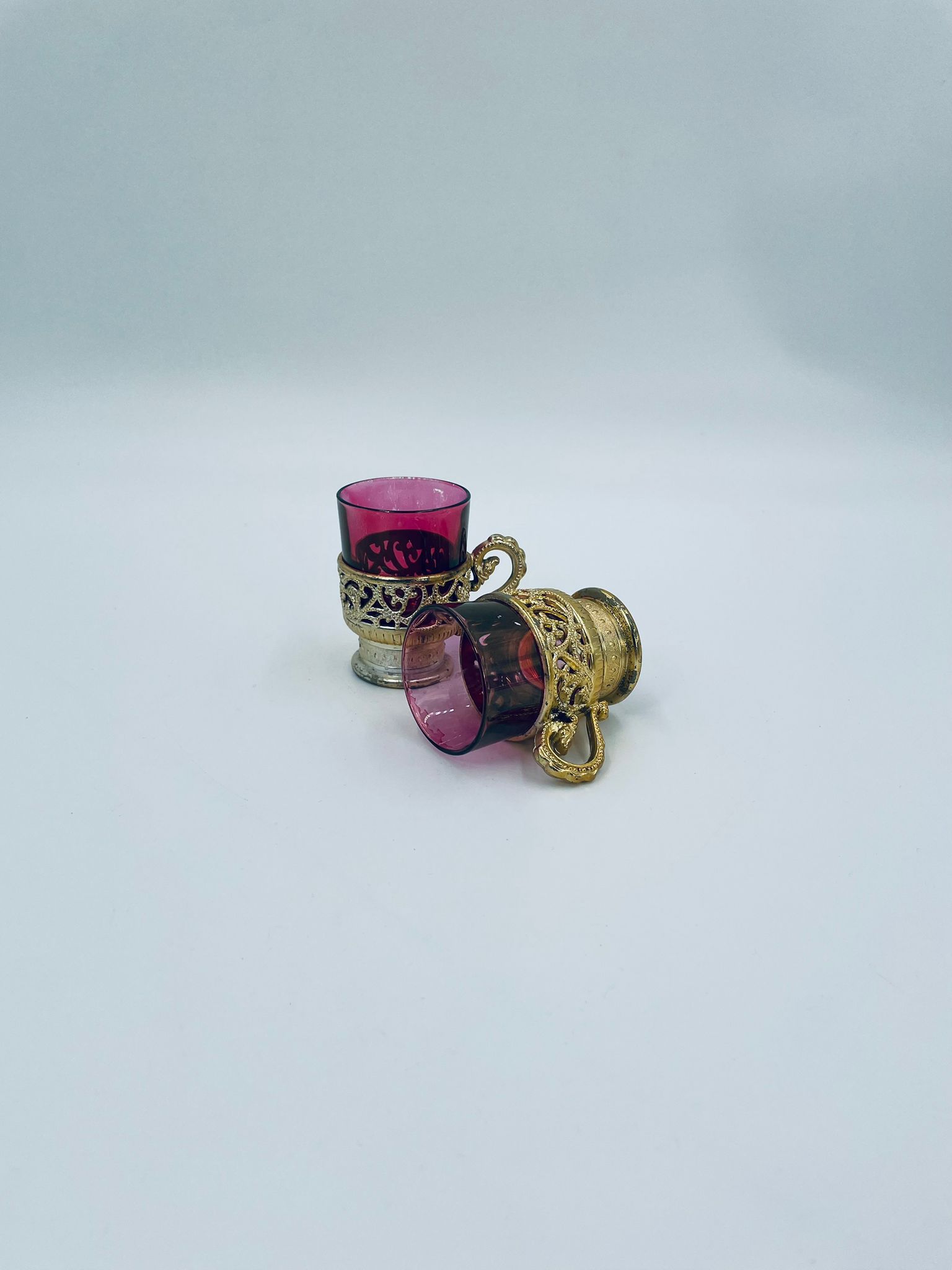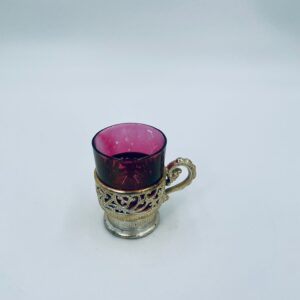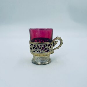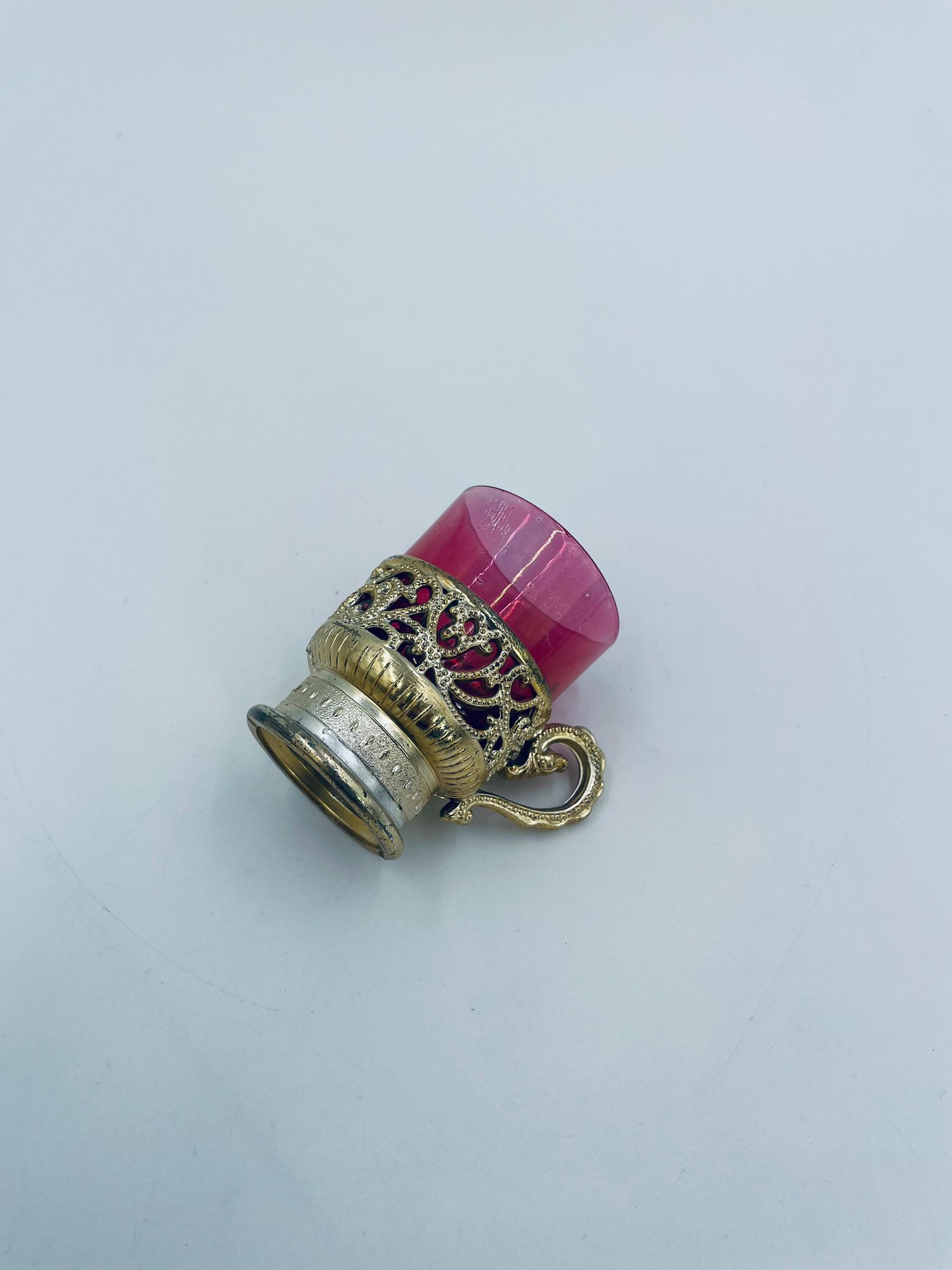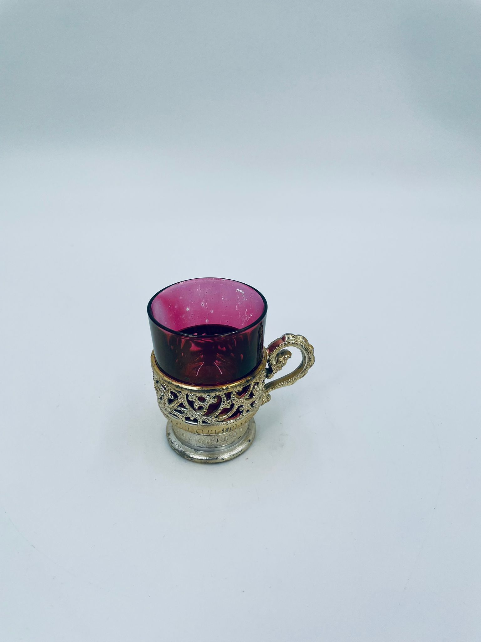 Antyczny kieliszek do wódki w stylu Vintage, popularny w latach 60 i 70tych XXwieku, wykonany z wysokiej jakości szkła. Kieliszek w żurawinowym kolorze, umieszczony w ozdobnym, plastikowym, złotym koszyczku z ozdobnym uchwytem. Posiada przetarcie na koszyczku i kieliszku.