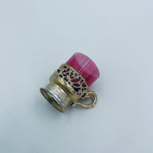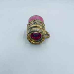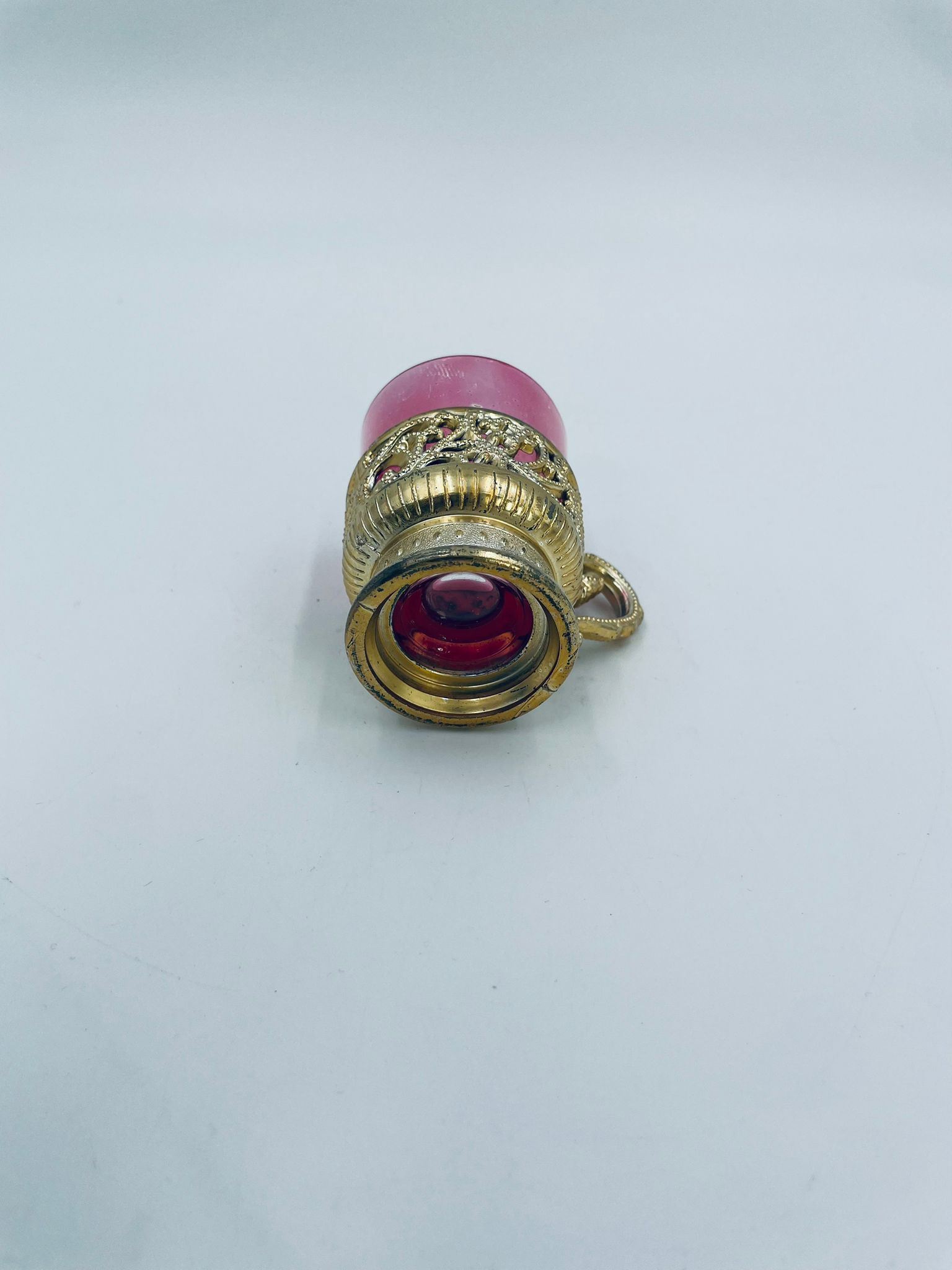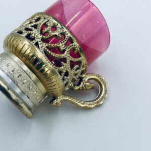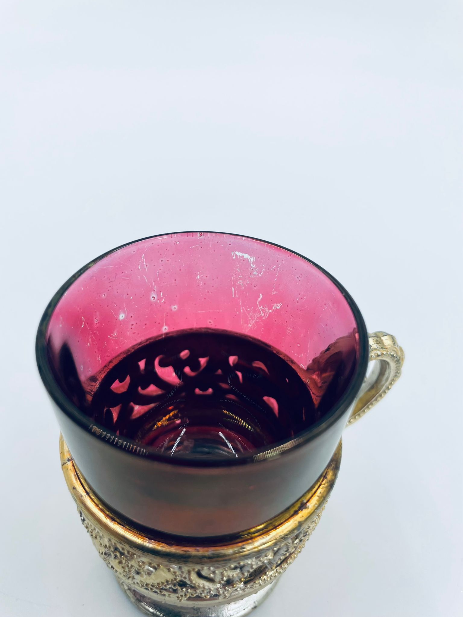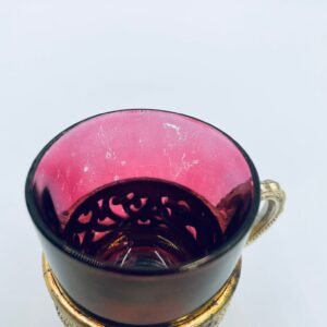 Antyczny kieliszek do wódki w stylu Vintage, popularny w latach 60 i 70tych XXwieku, wykonany z wysokiej jakości szkła. Kieliszek w żurawinowym kolorze, umieszczony w ozdobnym, plastikowym, złotym koszyczku z ozdobnym uchwytem. Posiada przetarcie na koszyczku i kieliszku.