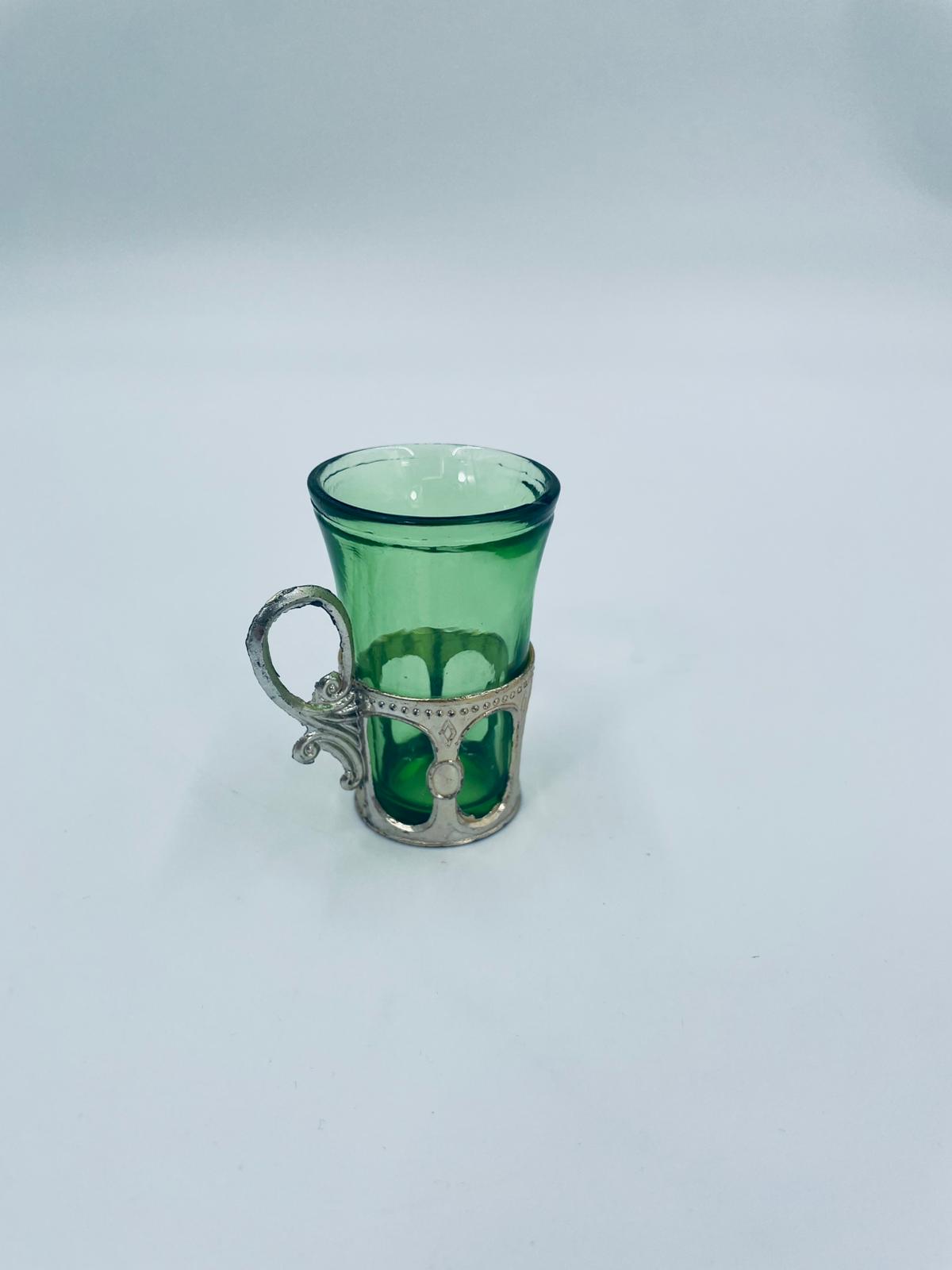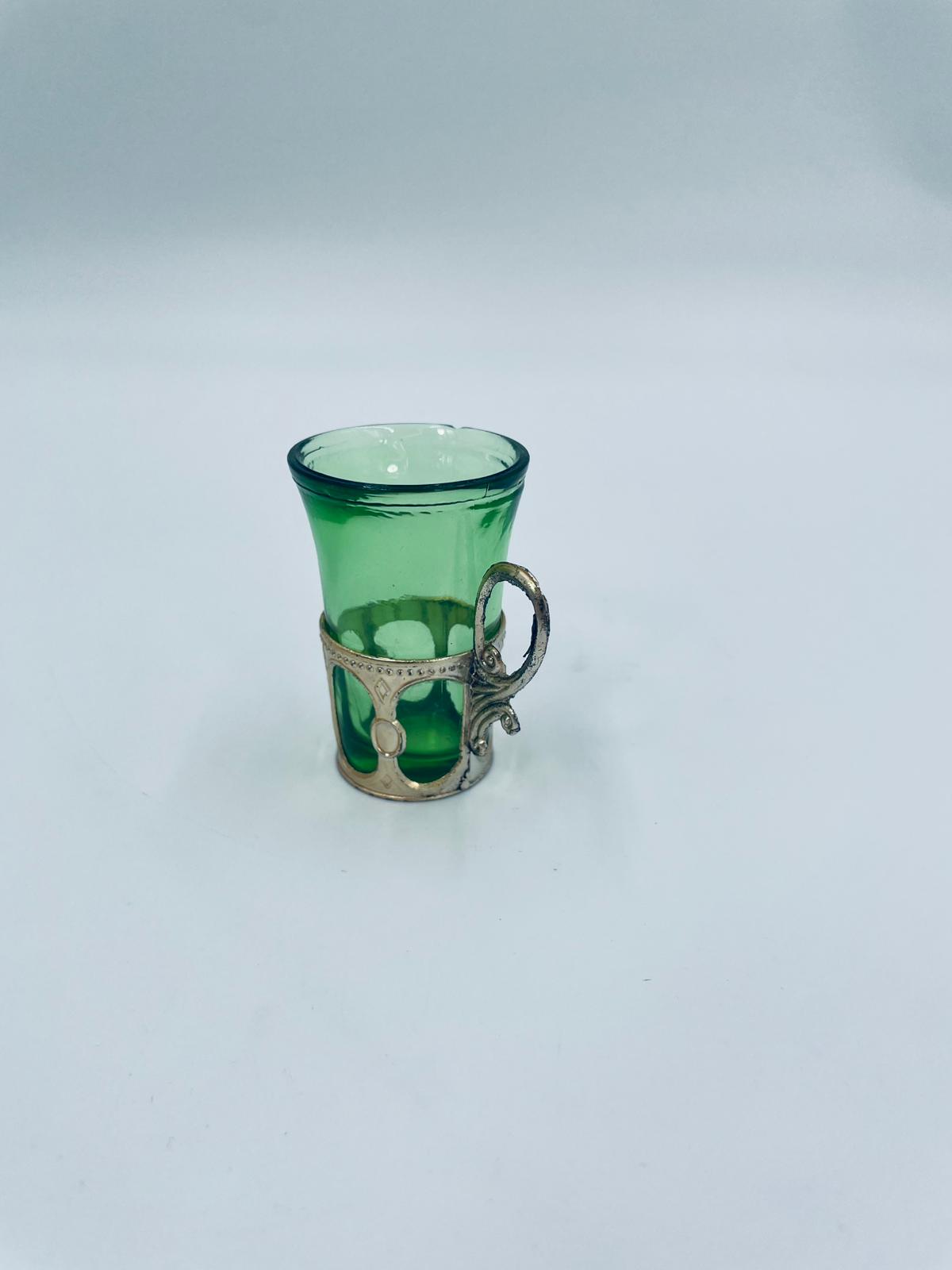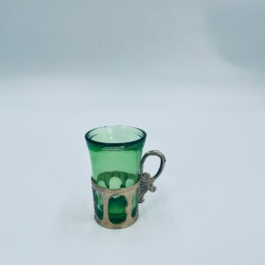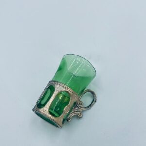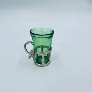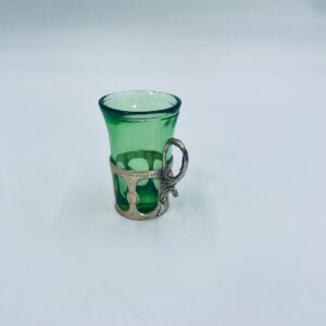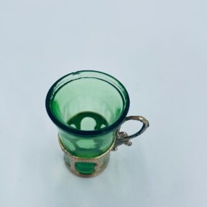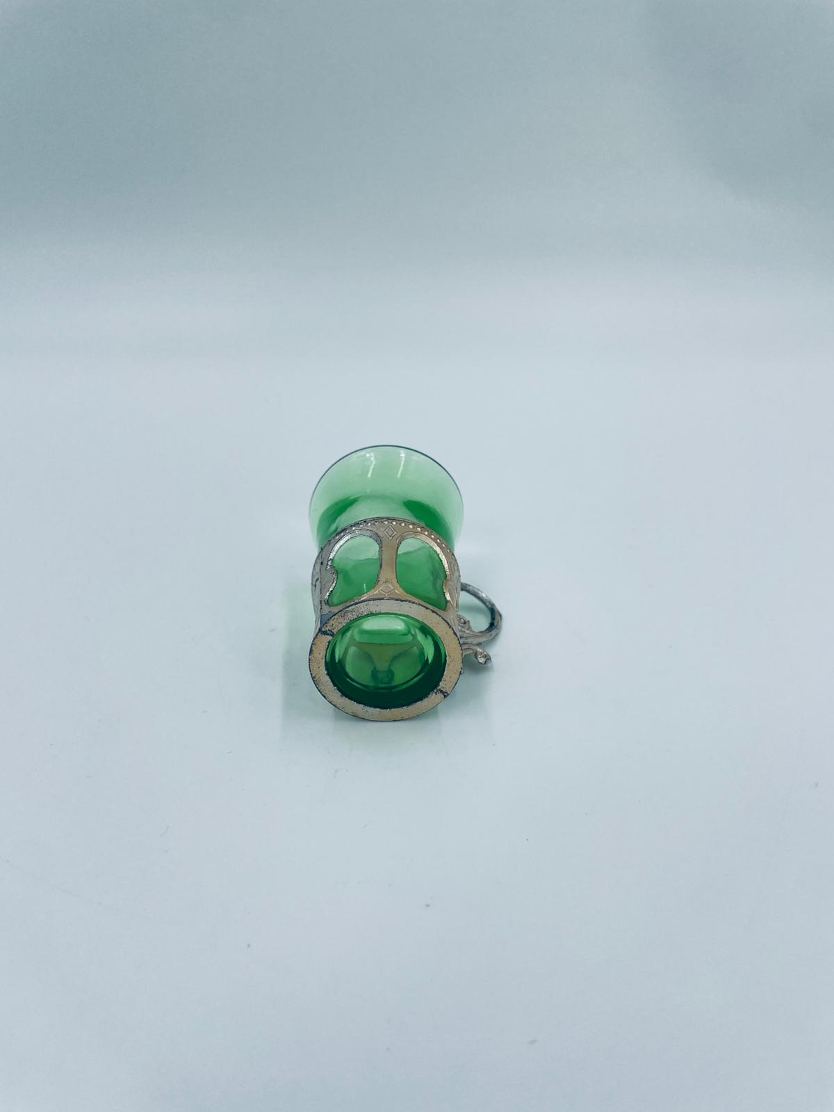 Antyczny kieliszek do wódki w stylu Vintage, popularny w latach 60 i 70tych XXwieku, wykonany z wysokiej jakości szkła. Kieliszek w zielonym kolorze, umieszczony w metalowym koszyczku z ozdobnym uchwytem. Posiada mały uszczerbek na górnym rancie oraz przetarcie na koszyczku.