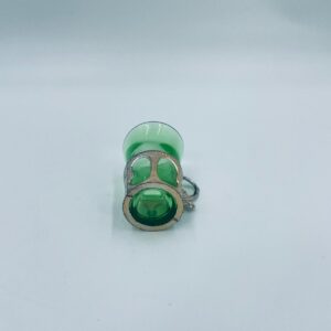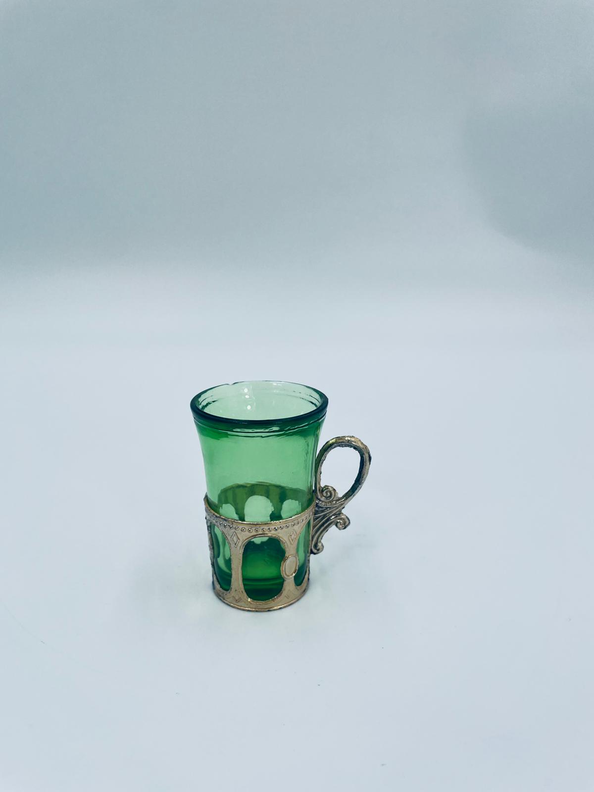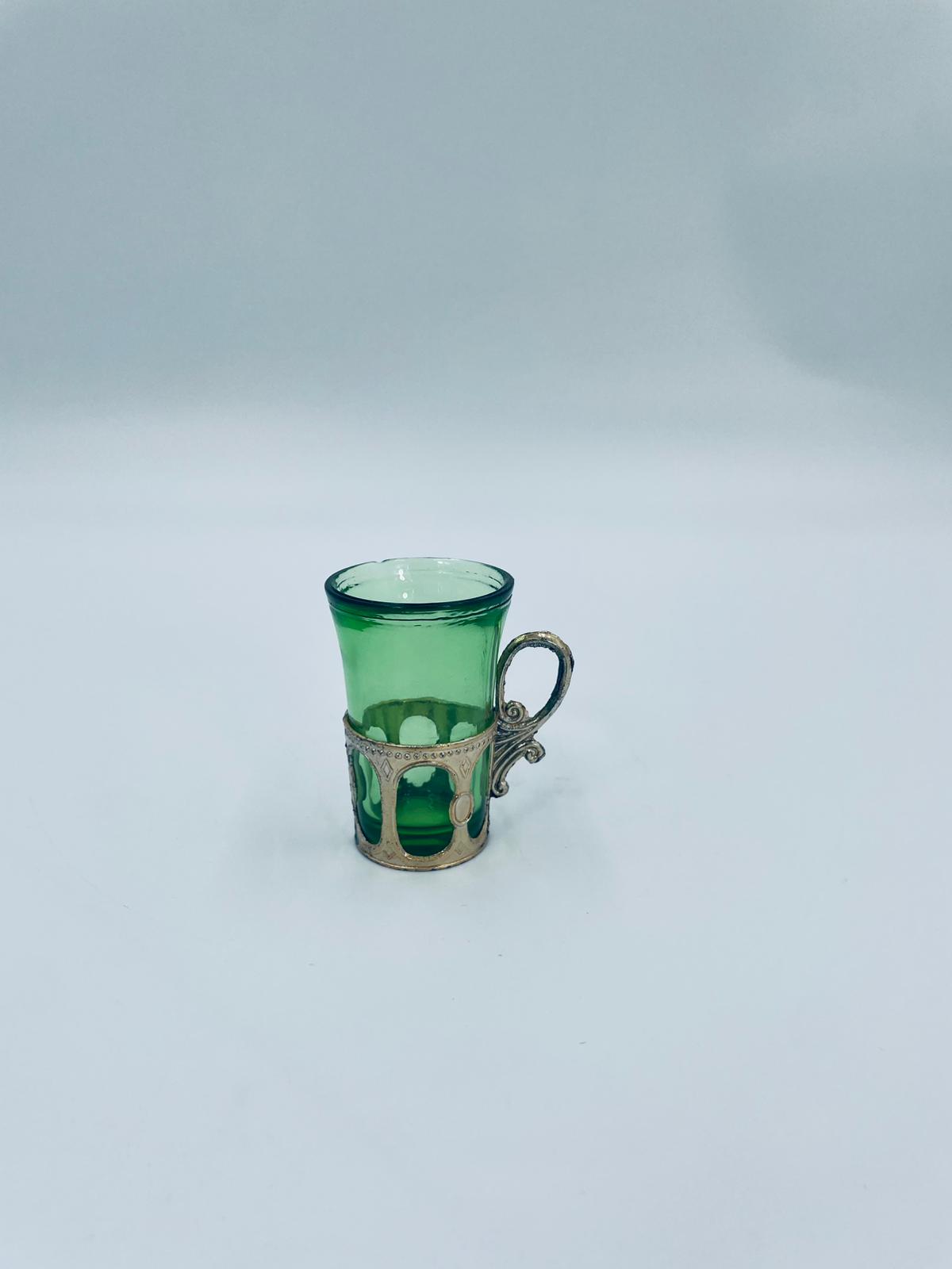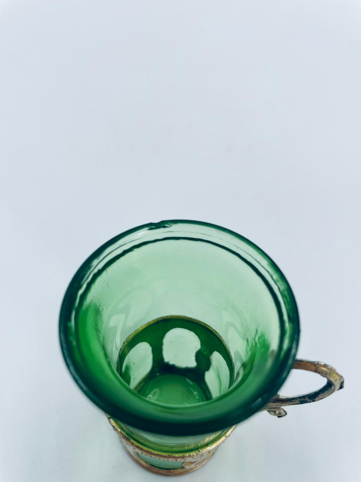 Antyczny kieliszek do wódki w stylu Vintage, popularny w latach 60 i 70tych XXwieku, wykonany z wysokiej jakości szkła. Kieliszek w zielonym kolorze, umieszczony w metalowym koszyczku z ozdobnym uchwytem. Posiada mały uszczerbek na górnym rancie oraz przetarcie na koszyczku.