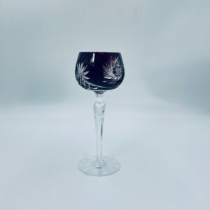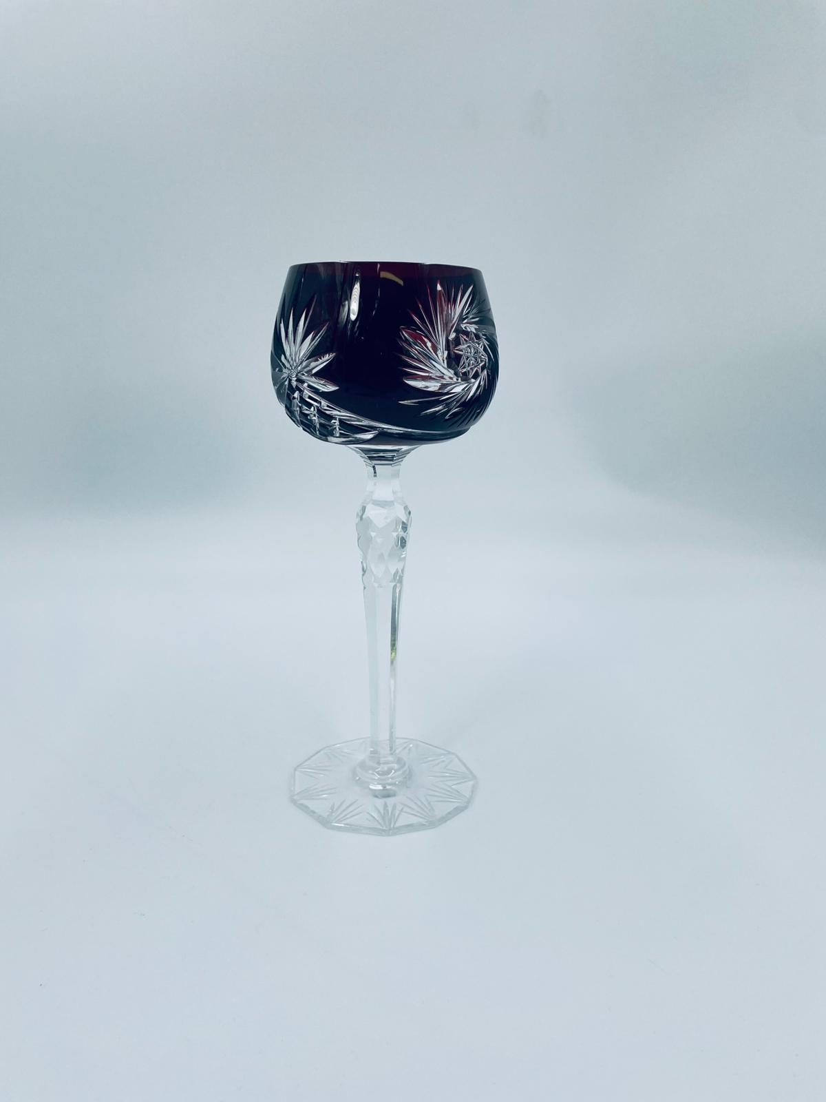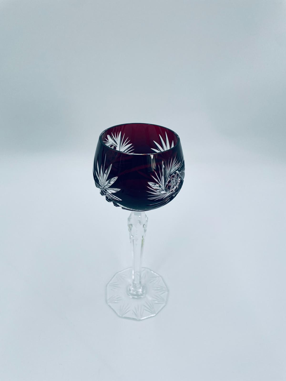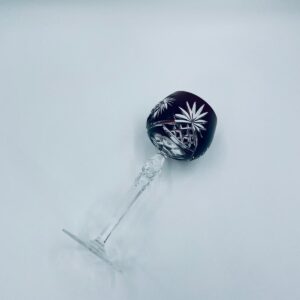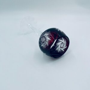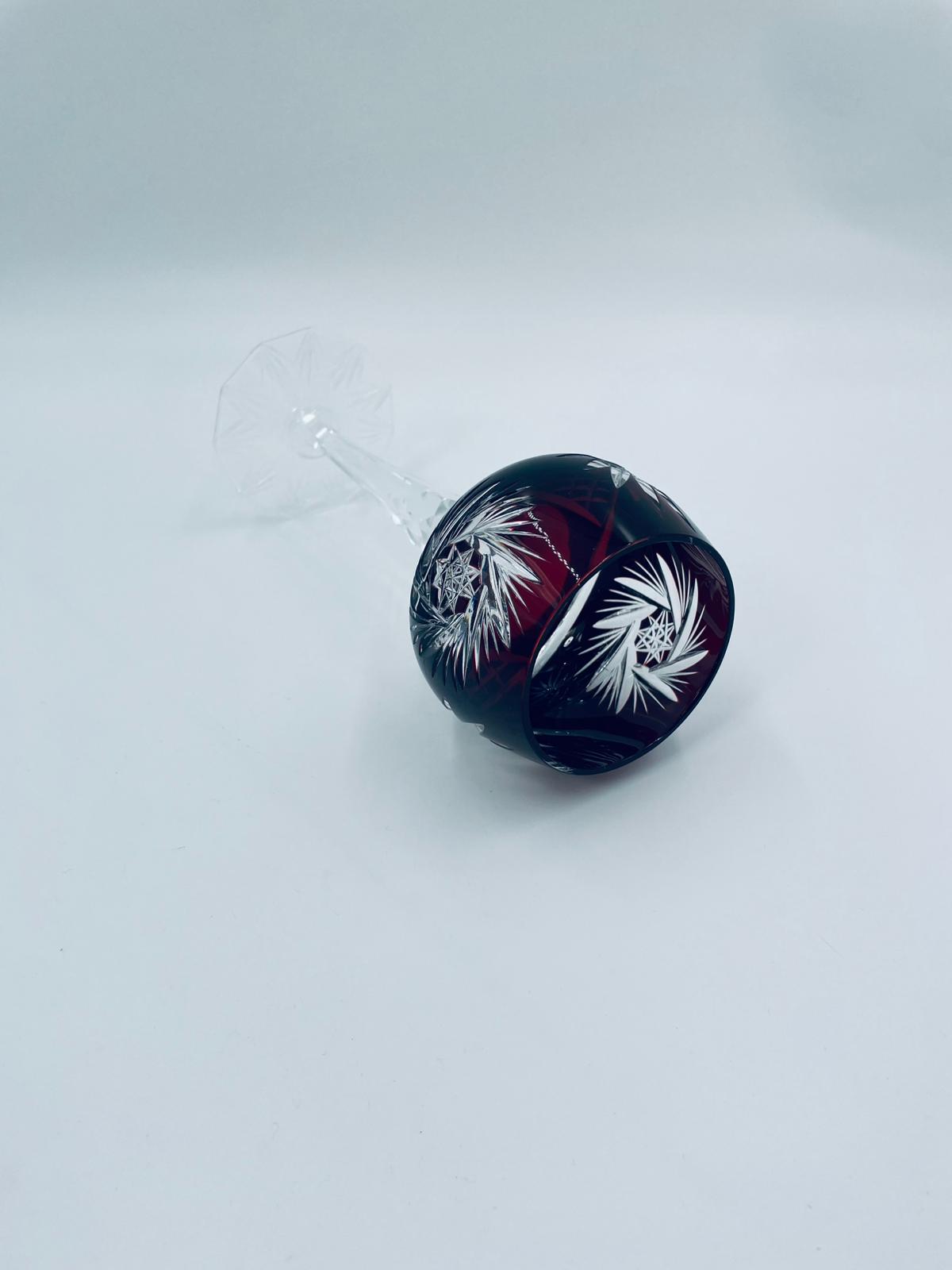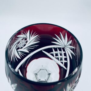 Antyczny kieliszek do wina typu Römer, potencjalnie pochodzący z Graflich Schaffgotsch’sche Josephinenhutte, datowane na lata 20 i 30te XX wieku, wykonane z wysokiej jakości szkła kryształowego. Kieliszek posiada rubinową, dwuwarstwową czarę z ręcznie szlifowanym, ozdobnym wzorem gwiazd i liści, smukłą i fasetowana nóżkę oraz wielokątna podstawę z precyzyjnym szlifem.