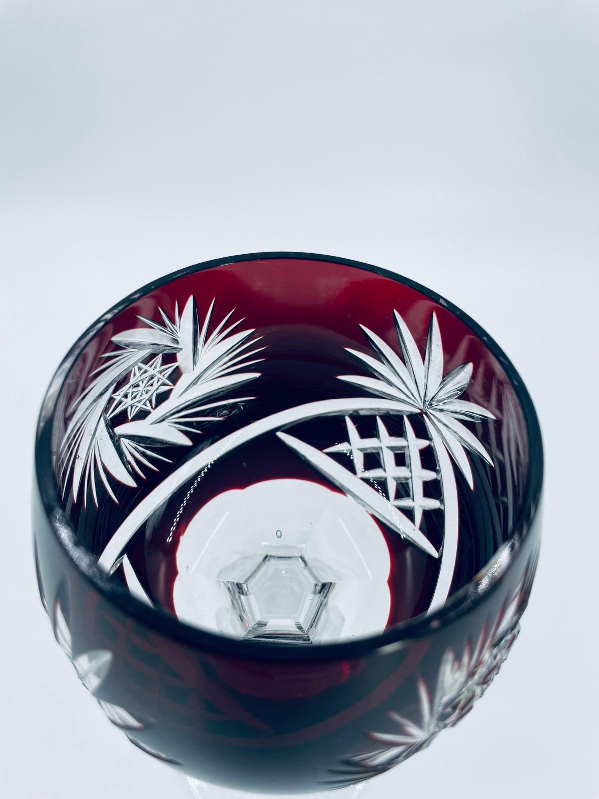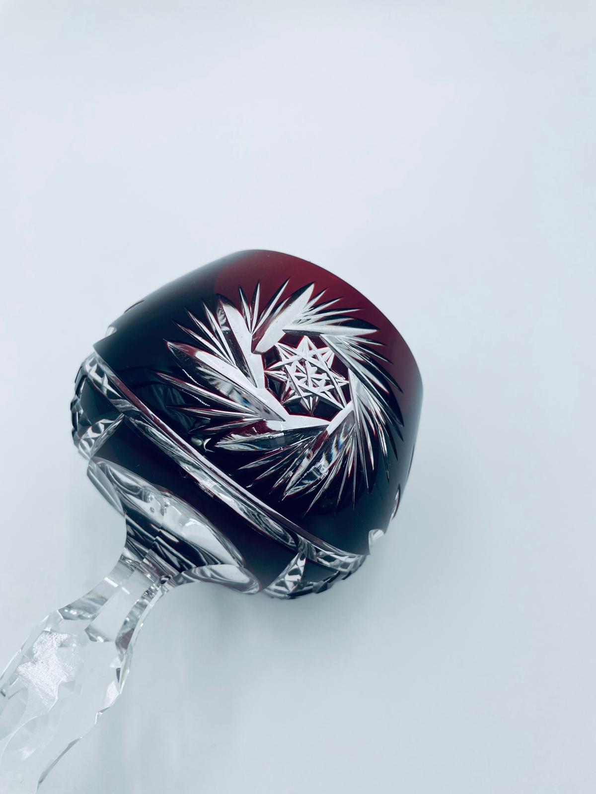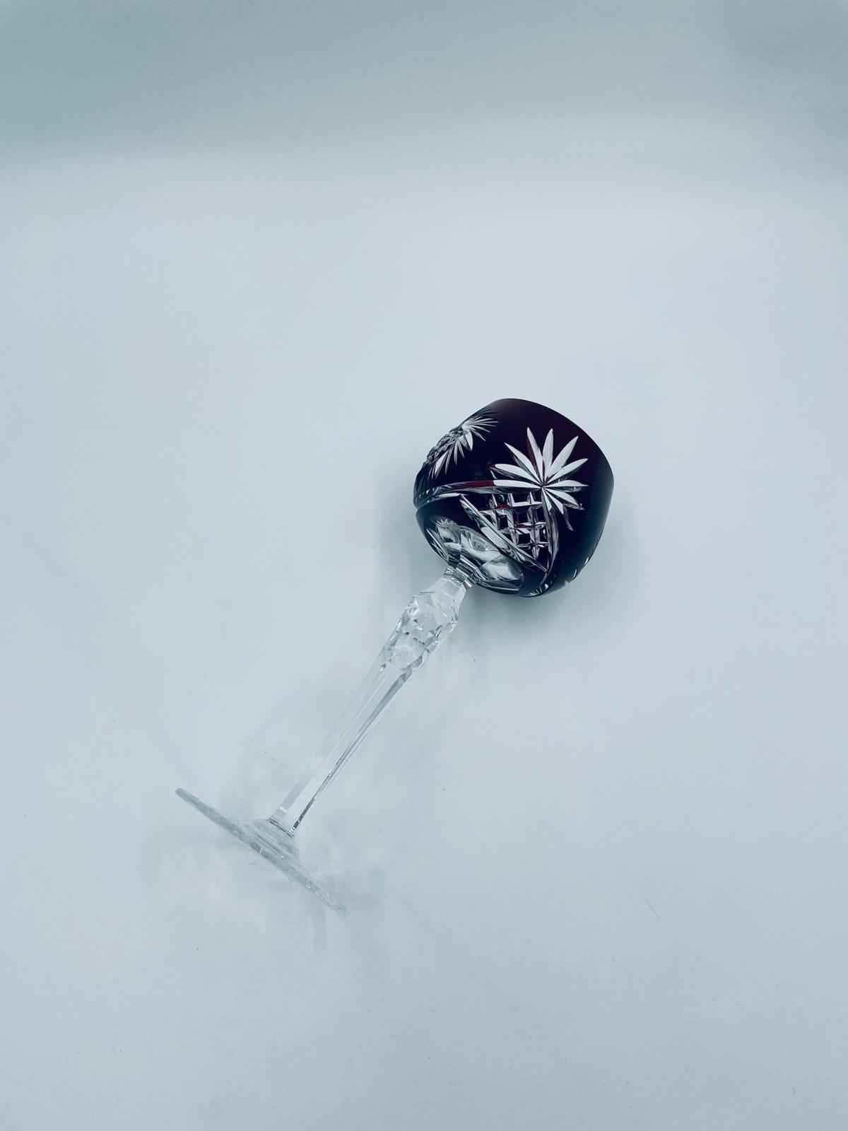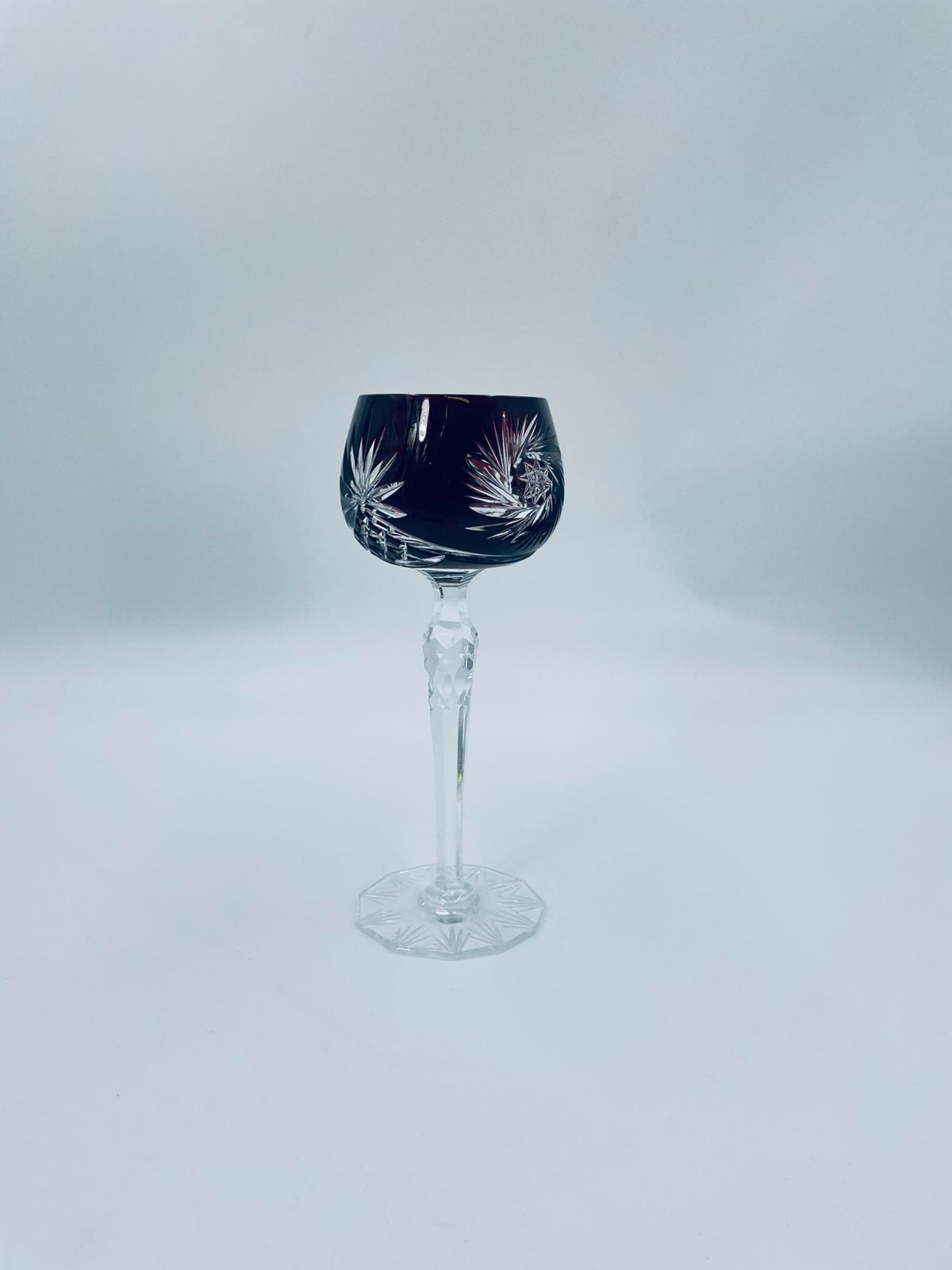 Antyczny kieliszek do wina typu Römer, potencjalnie pochodzący z Graflich Schaffgotsch’sche Josephinenhutte, datowane na lata 20 i 30te XX wieku, wykonane z wysokiej jakości szkła kryształowego. Kieliszek posiada rubinową, dwuwarstwową czarę z ręcznie szlifowanym, ozdobnym wzorem gwiazd i liści, smukłą i fasetowana nóżkę oraz wielokątna podstawę z precyzyjnym szlifem.