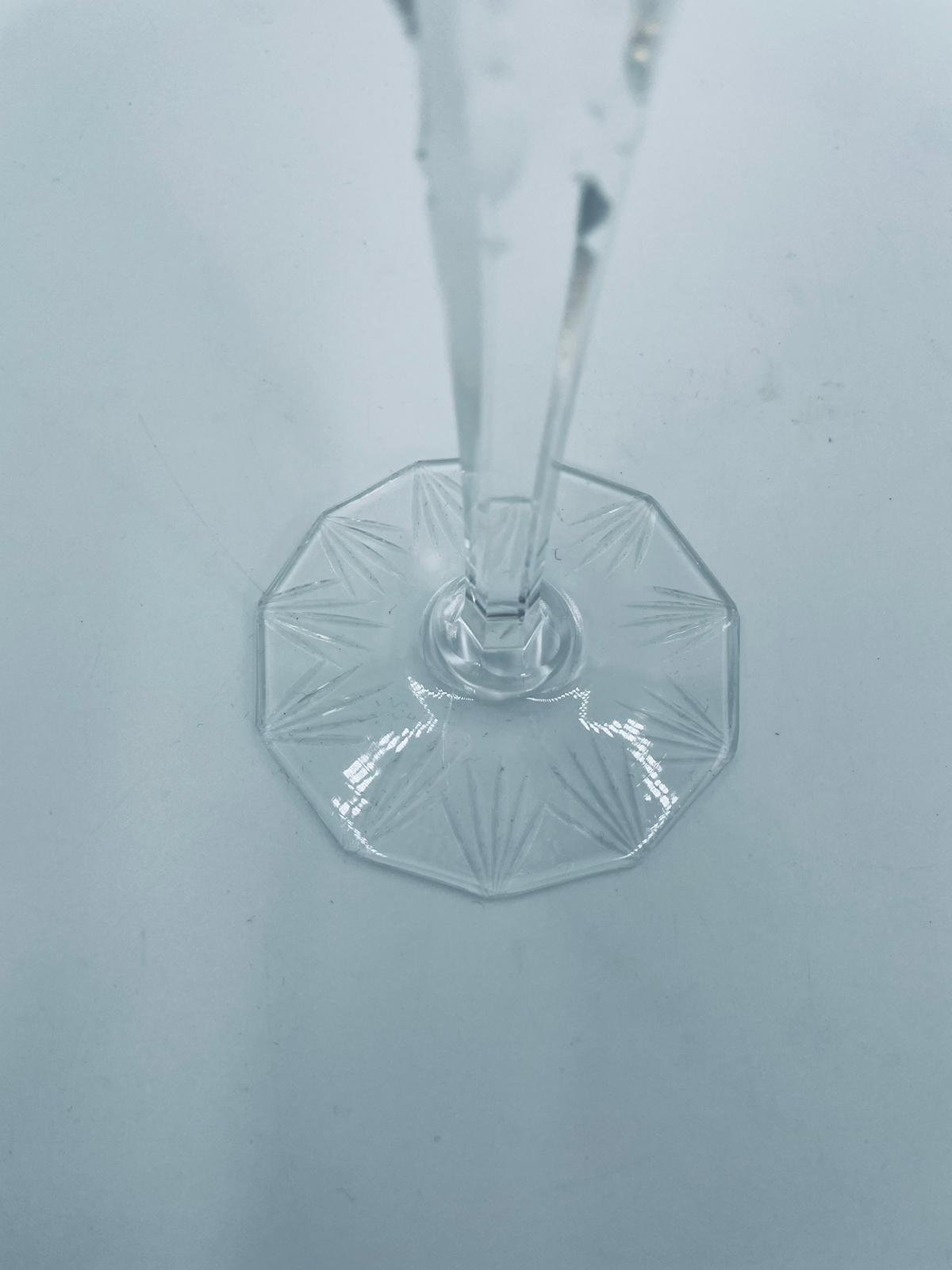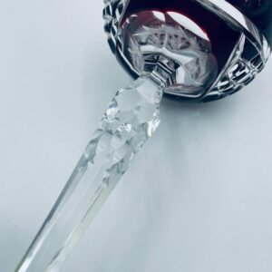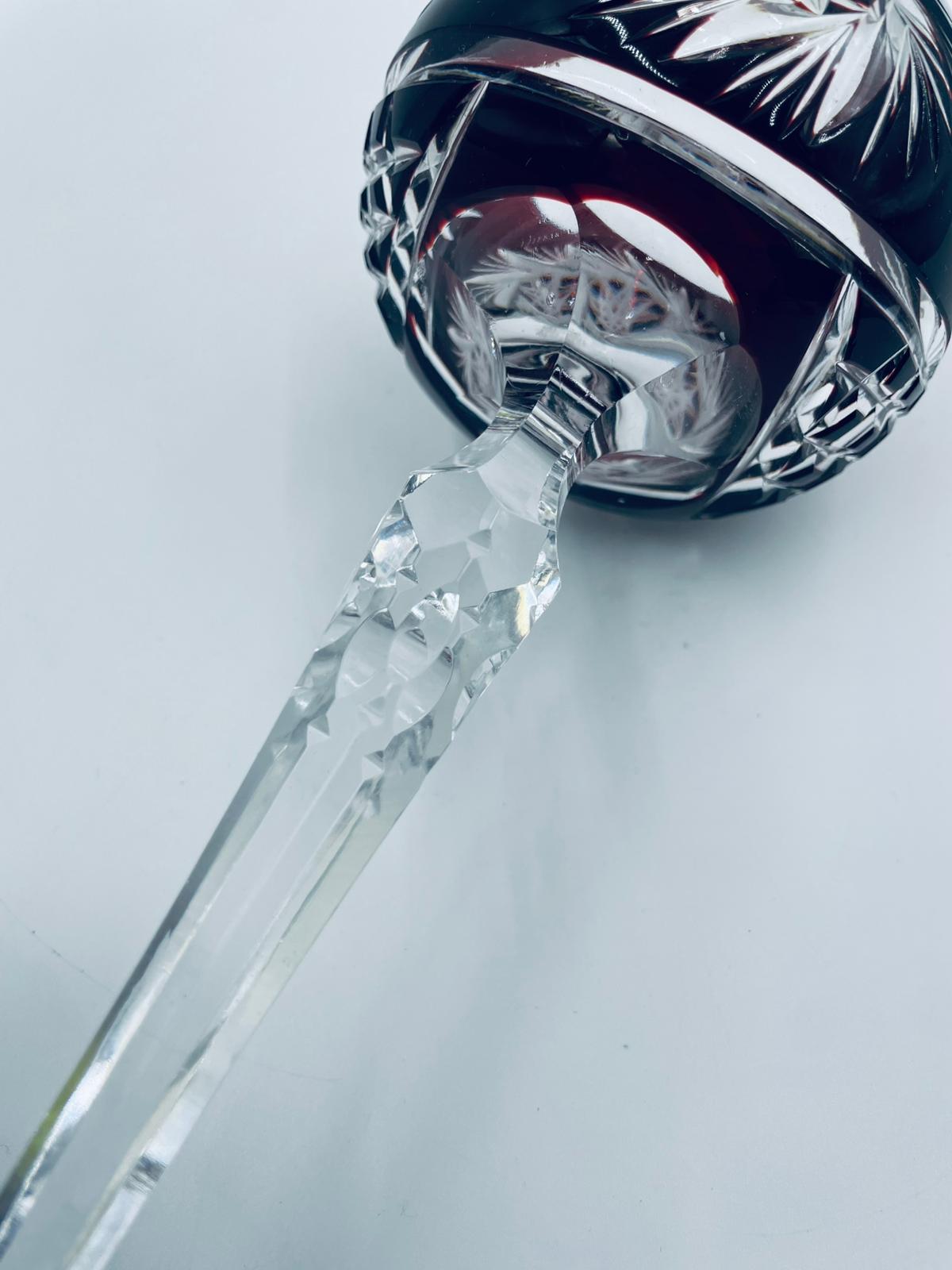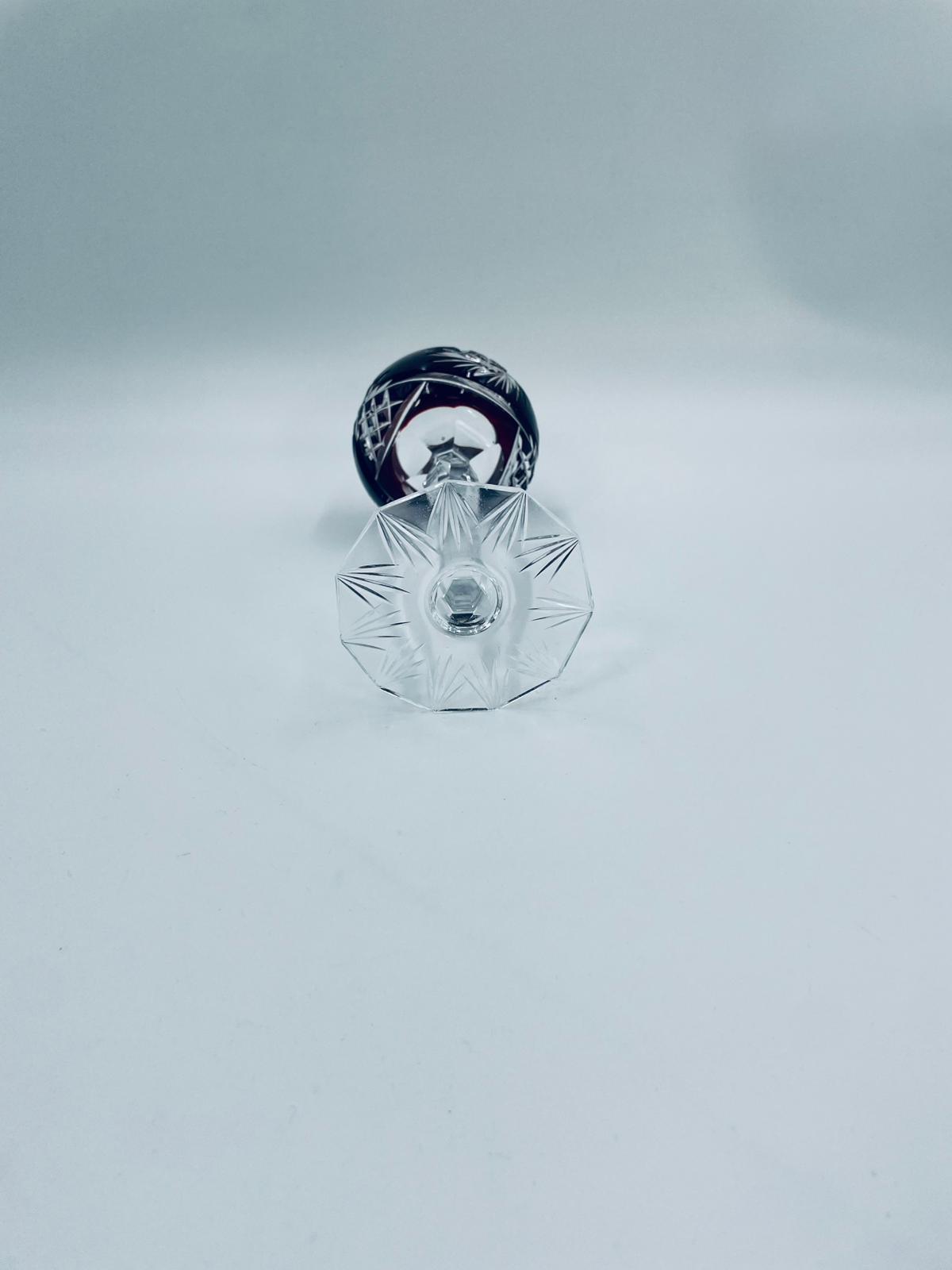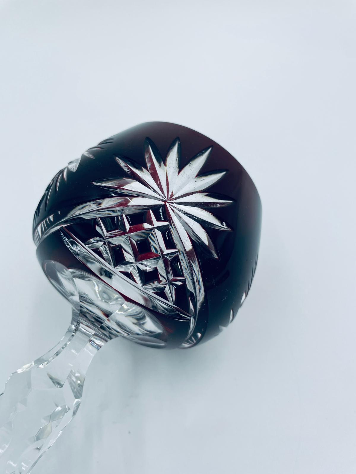 Antyczny kieliszek do wina typu Römer, potencjalnie pochodzący z Graflich Schaffgotsch’sche Josephinenhutte, datowane na lata 20 i 30te XX wieku, wykonane z wysokiej jakości szkła kryształowego. Kieliszek posiada rubinową, dwuwarstwową czarę z ręcznie szlifowanym, ozdobnym wzorem gwiazd i liści, smukłą i fasetowana nóżkę oraz wielokątna podstawę z precyzyjnym szlifem.