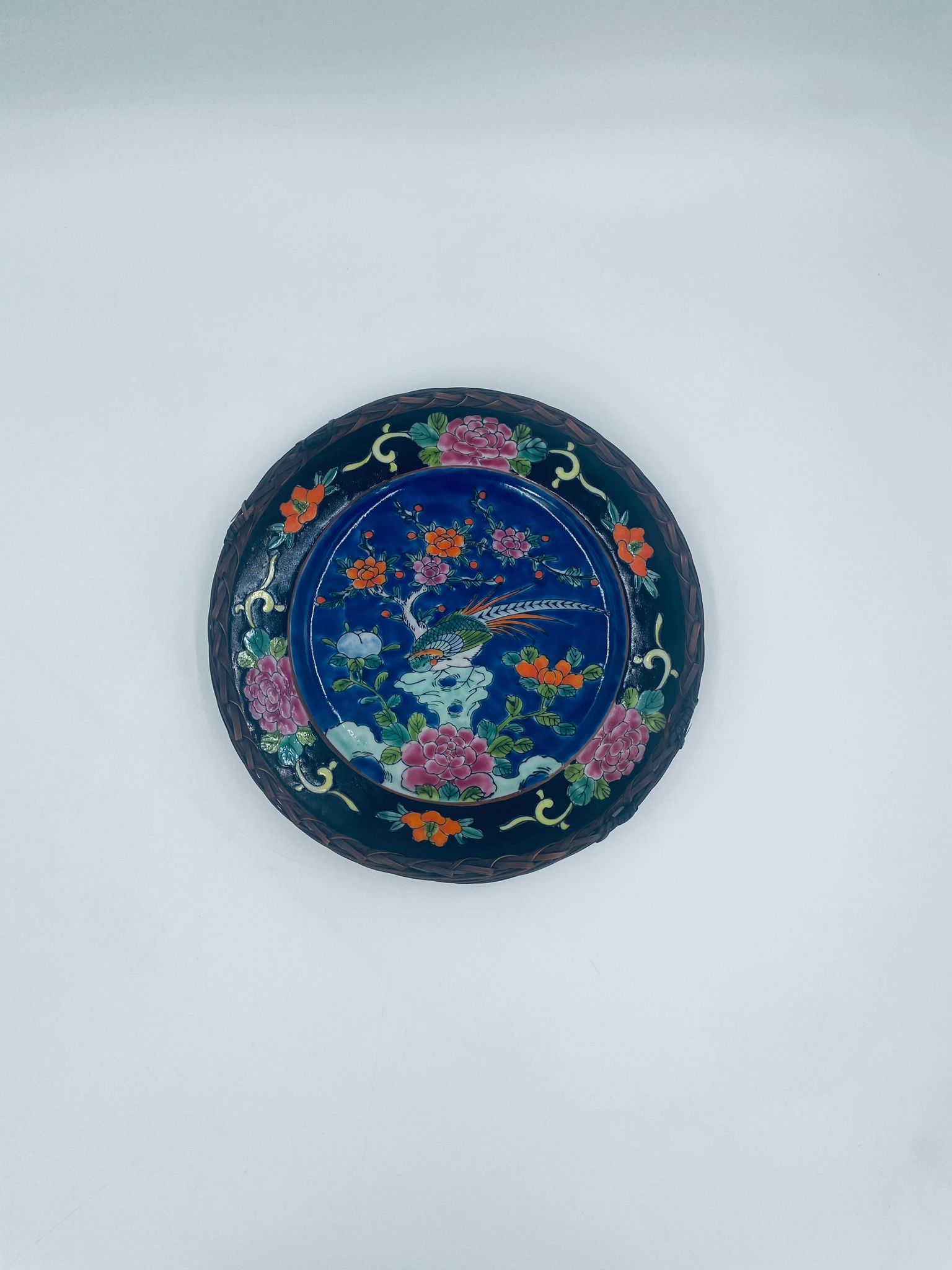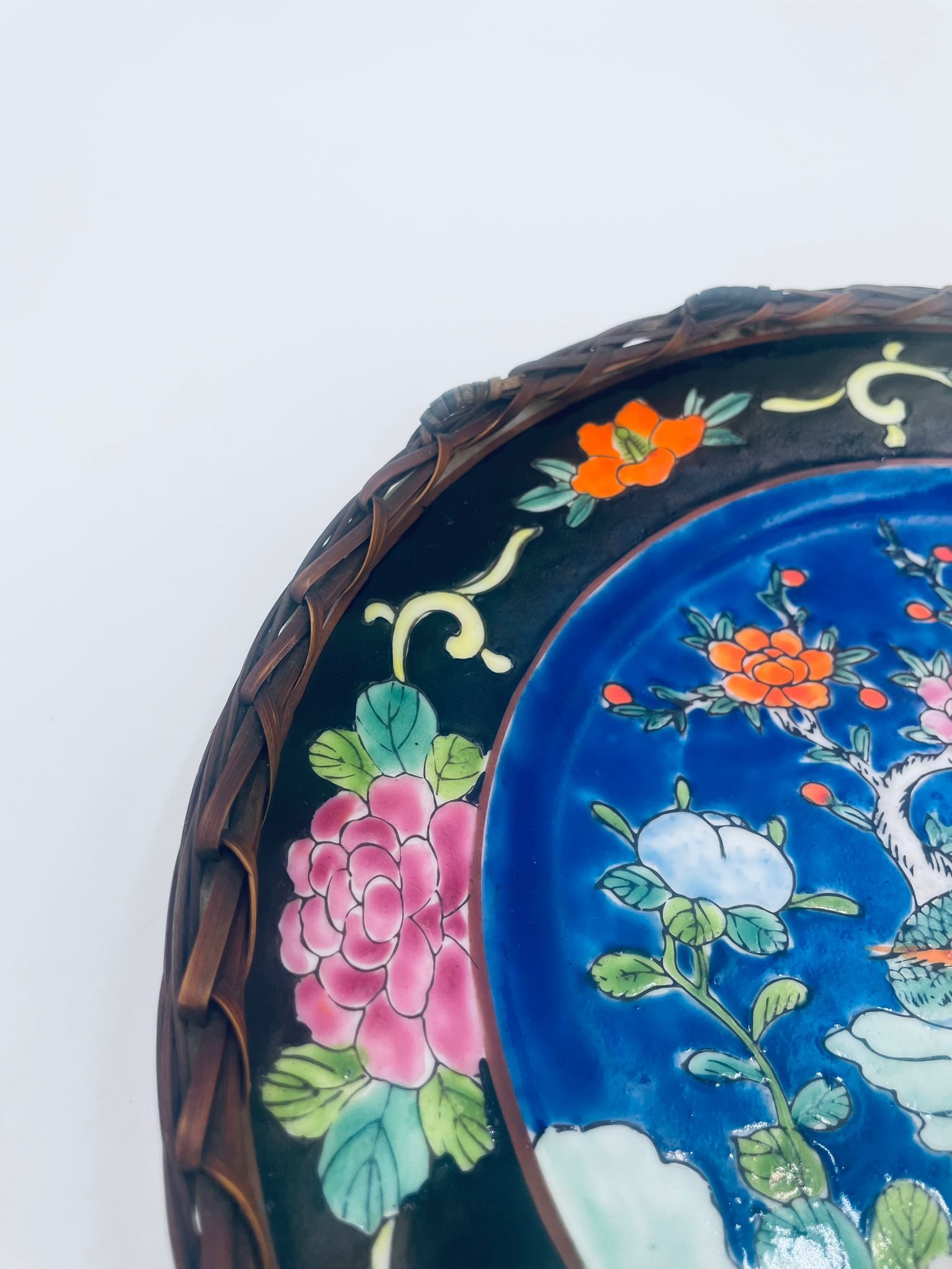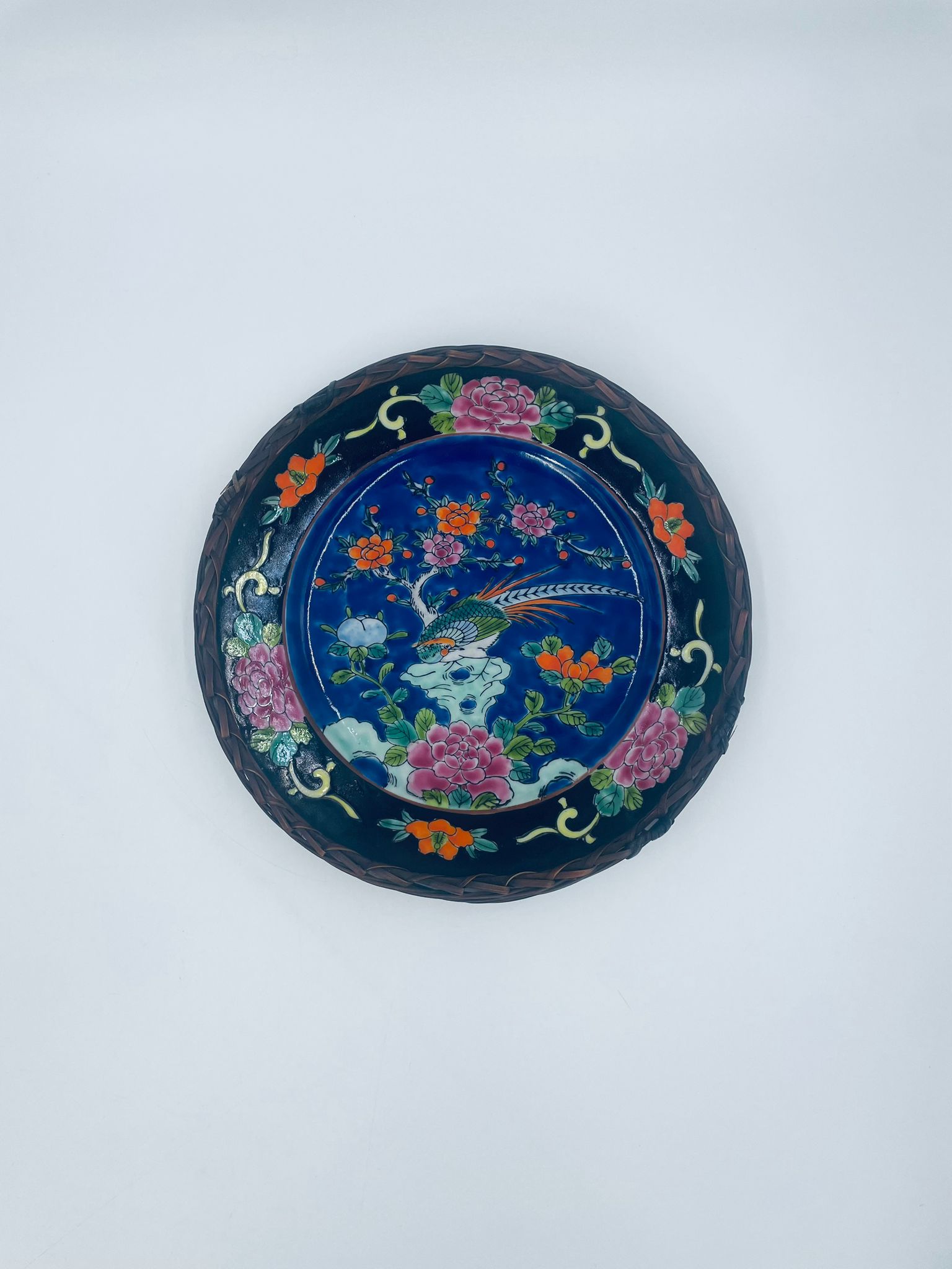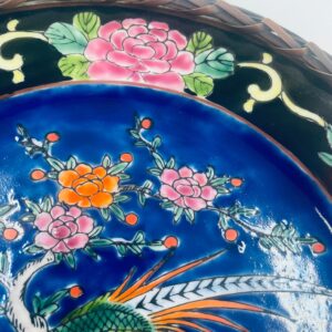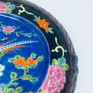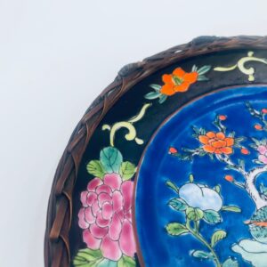 Antyczny talerz dekoracyjny Japoński z lat 50tych, wykonany z wysokiej jakości porcelany. Talerz ręcznie malowany we wzór przedstawiający rajskiego ptaka siedzącego na skale pod kwitnącym drzewem, ozdobiony czarna obwódką z motywem kwiatowym, wykończony ozdobnym, rattanowym oplotem na brzegu.